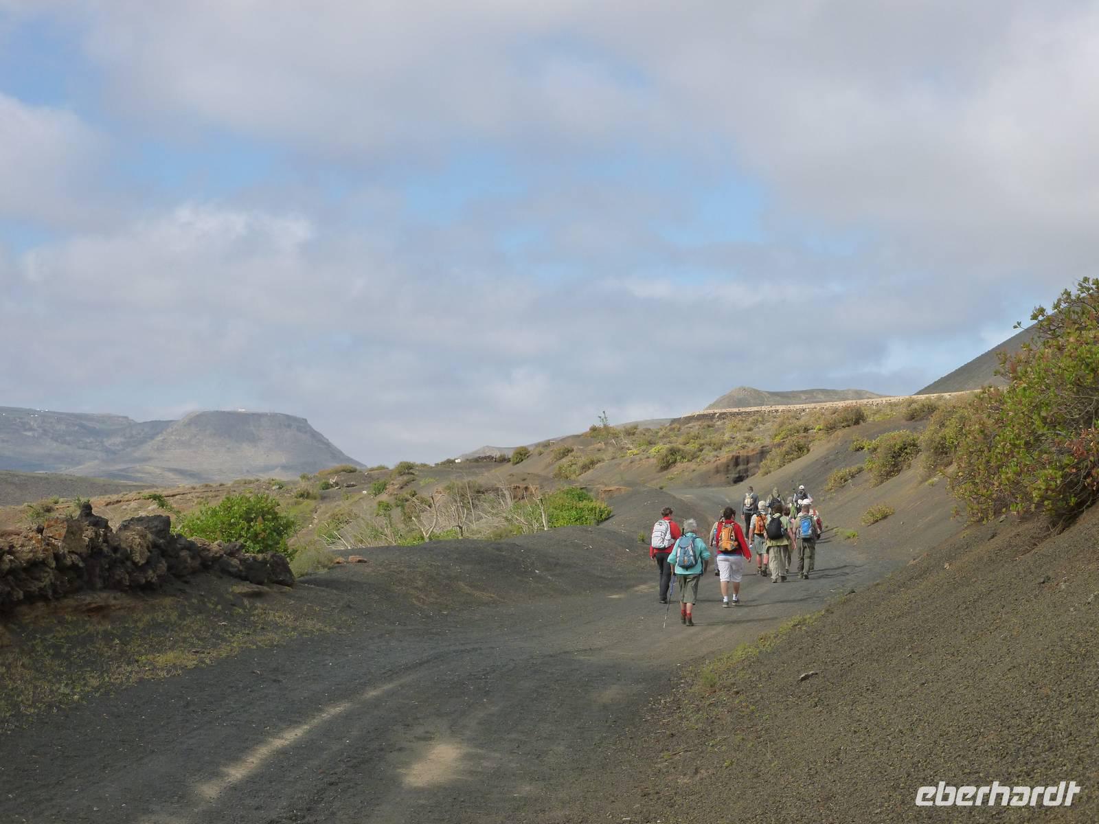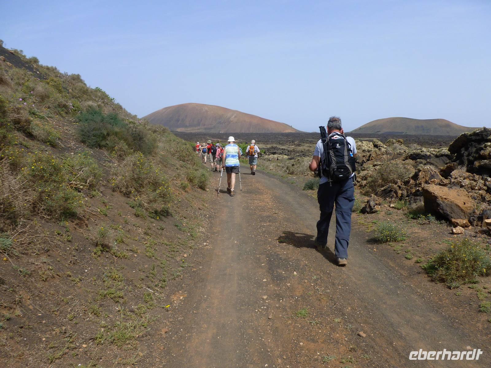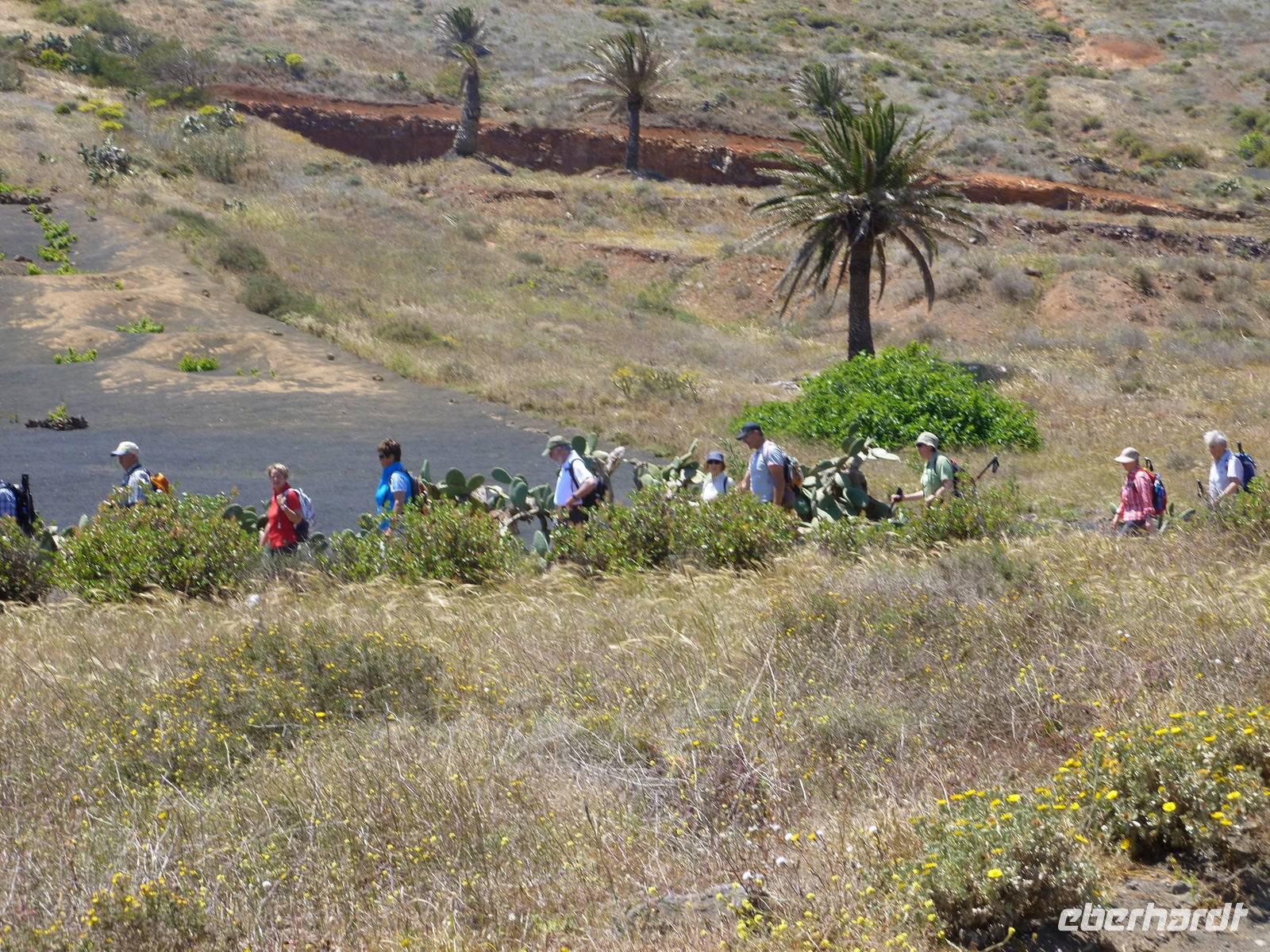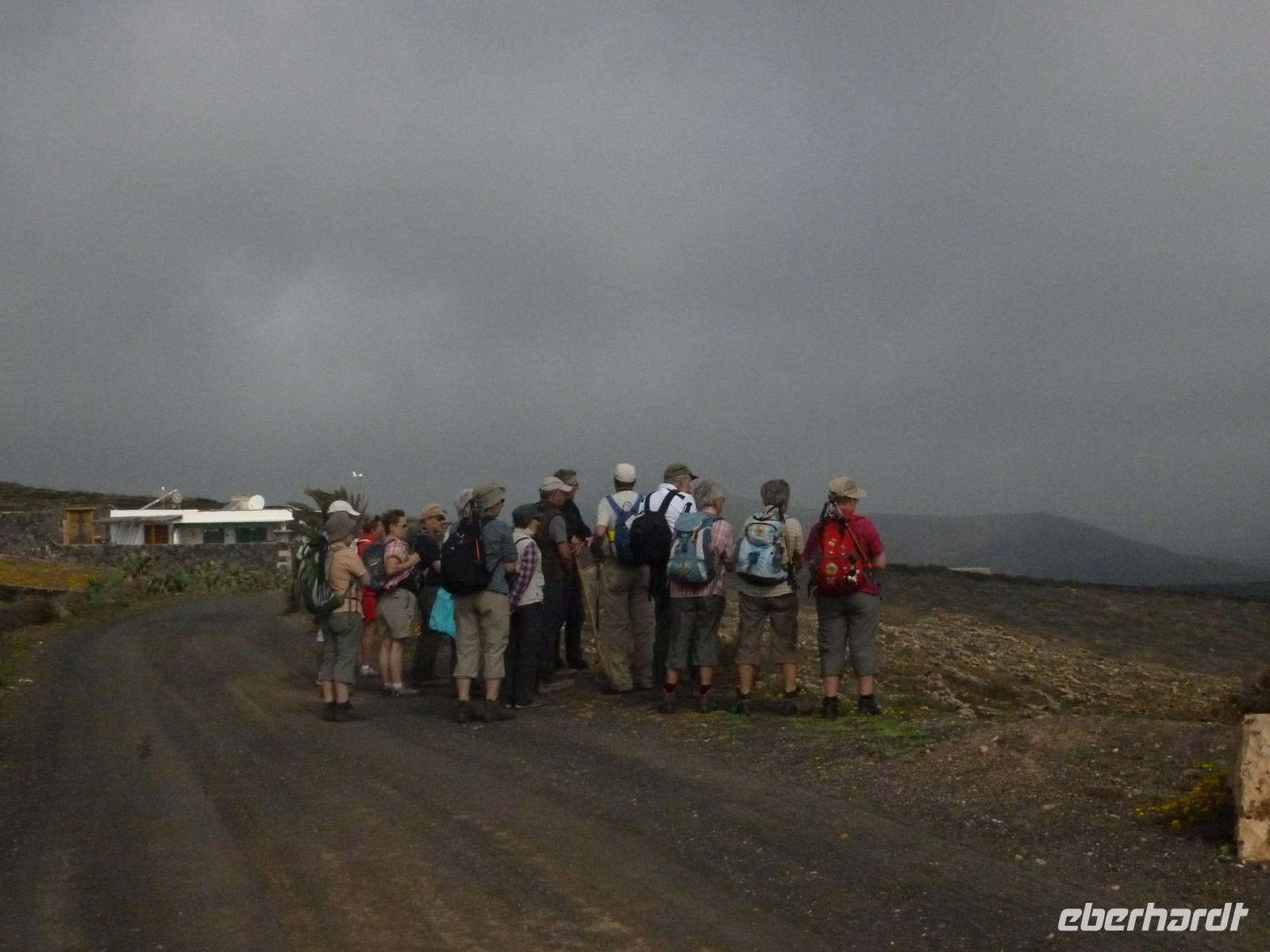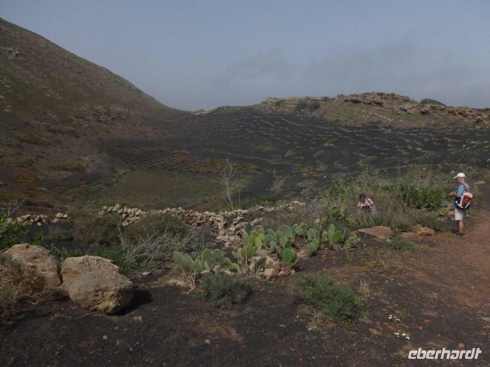 Heute konnten wir das ausgiebige Frühstück noch länger genießen, da uns Roland erst gegen 10 Uhr vom Hotel abgeholt hatte. Unser heutiger Anfangspunkt lag nur ca. 20 Minuten entfernt, oberhalb von La Asomada. Der erste Teil ging leicht bergan, immer in Richtung „Guardilama". Die Sicht war leider etwas diesig, aber dafür zeigte sich die Sonne heute wieder von ihrer besten Seite. Auch die Temperaturen waren deutlich gestiegen. Links und rechts konnten wir immer wieder die mühsam angelegten Weinfelder begutachten, die sehr akribisch von den Landsleuten gepflegt wurden. Auch Rolands Haus konnten wir von Weitem sichten. Weiter ging es nun bergauf in Richtung des Vulkanes „Guardilamas". Dort sind wir am Kraterrand oberhalb in Richtung des Vulkanes „Montana Tinasoria" gelaufen. Der Abstieg war dann stückchenweise sehr steil durch weiche, schwarze Kiesfelder in denen immer wieder bunte Blumen aufblitzten. Anschließend stiegen wir zum Tinasoria auf und machten an der Ruine Rast, um uns bei etwas Obst und einem Müsliriegel zu stärken. Zwischendurch erklärte uns Roland allerlei Wissenswertes aus dem Leben der Lanzarotener. Unser Wanderweg führte nun einmal auf und ab, bis wir unser Ziel, die Bodega „El Chupadero" in Sicht hatten. Das kleine Restaurant, das die Deutsche Barbara seit vielen Jahren betreibt, ist sehr individuell, da keine großen Gruppen abgefertigt werden. Somit konnten wir die verschiedenen Weine bei Serrano-Schinken und Ziegenkäse ganz abseits des Massentourismus genießen. Der Abschied fiel uns sichtlich schwer...