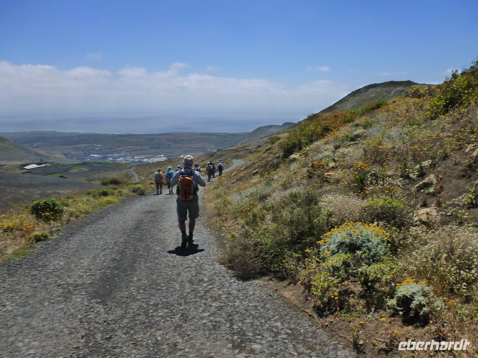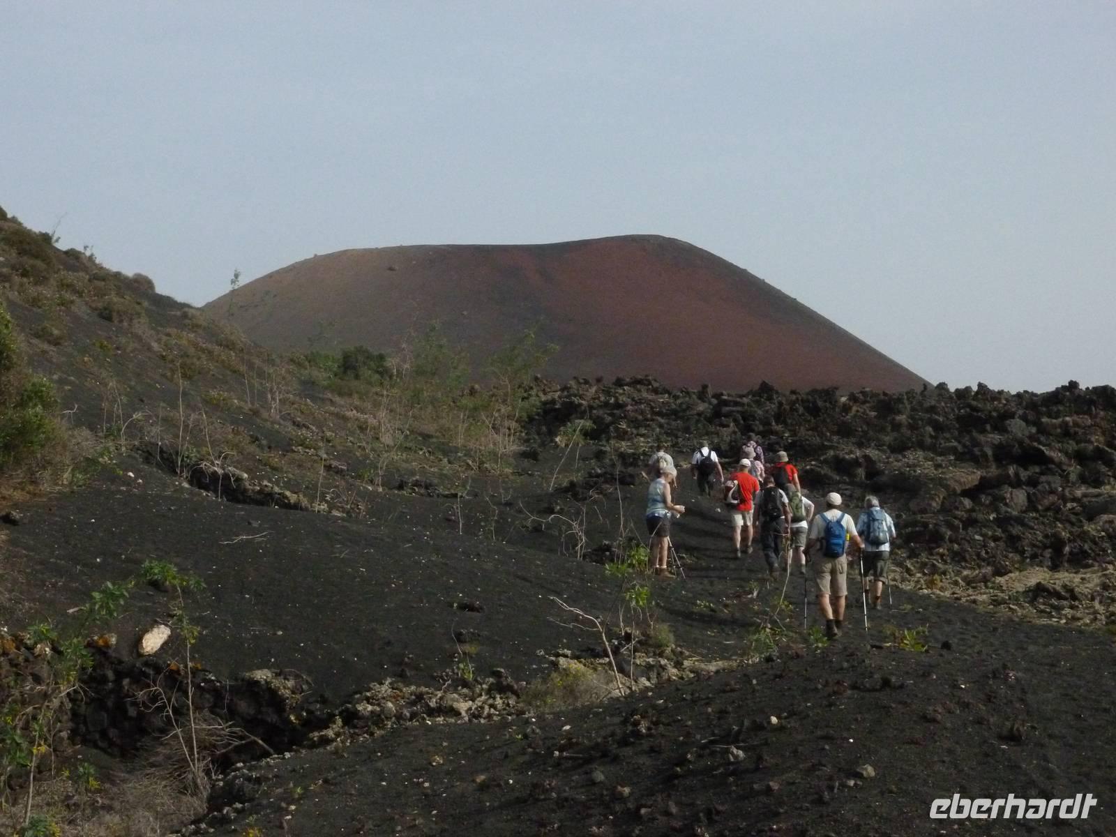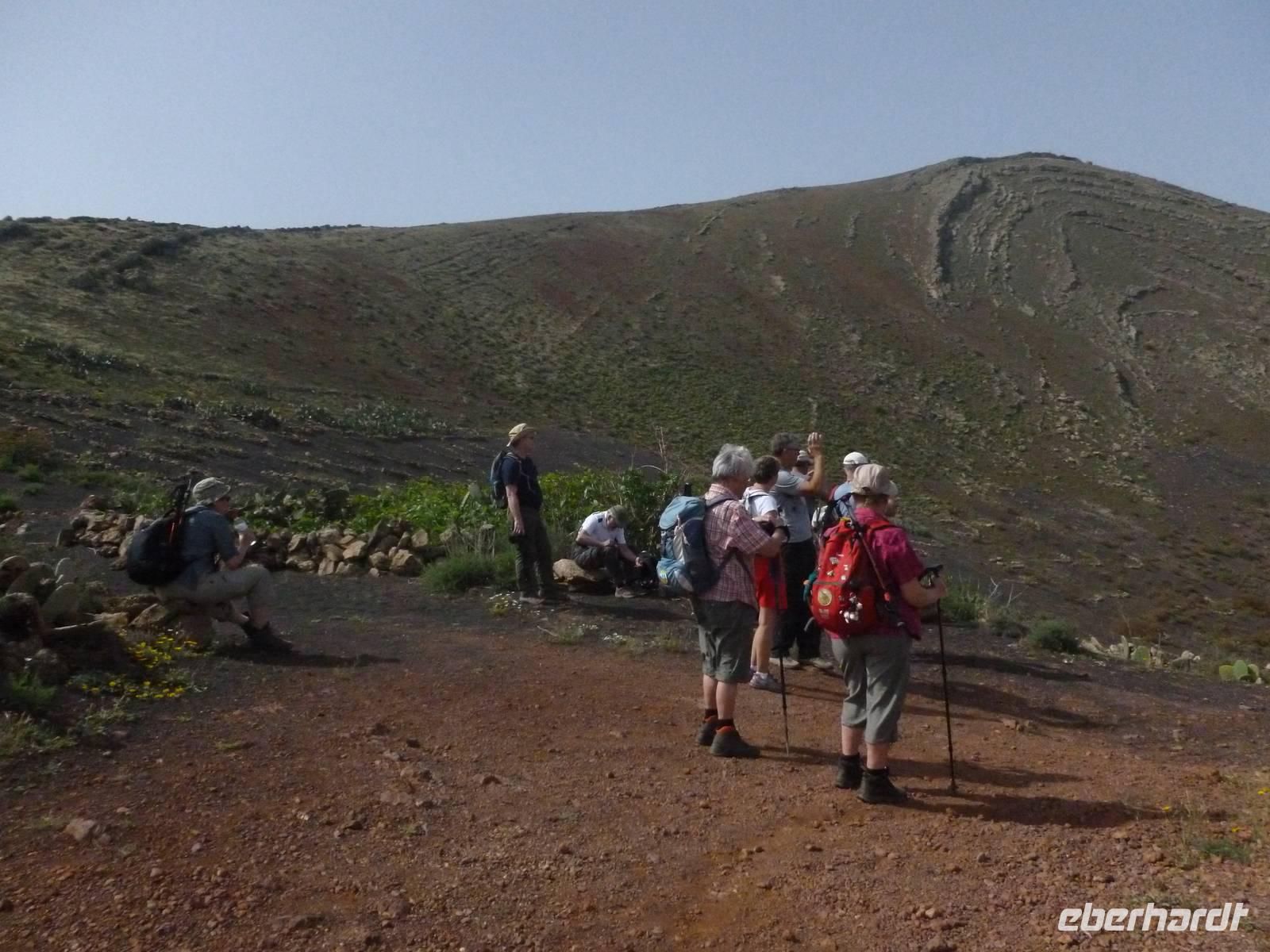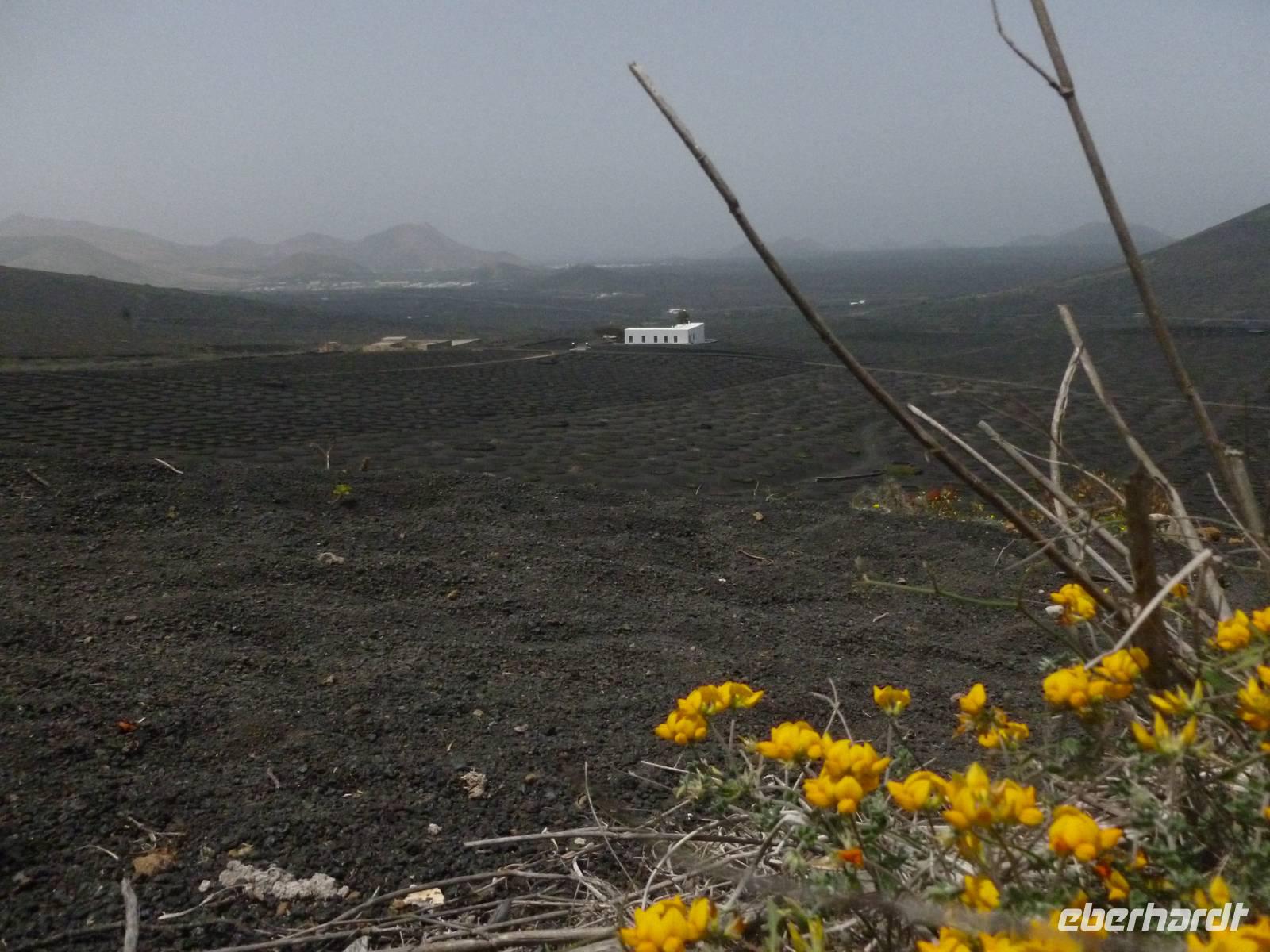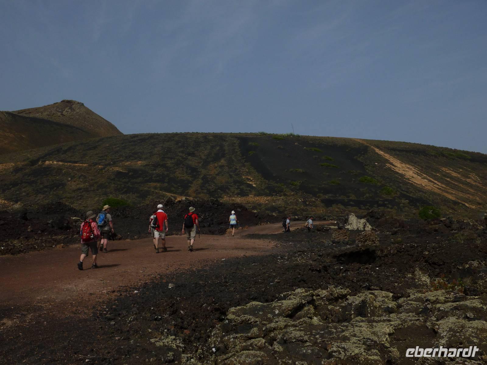 Heute konnten wir das ausgiebige Frühstück noch länger genießen, da uns Roland erst gegen 10 Uhr vom Hotel abgeholt hatte. Unser heutiger Anfangspunkt lag nur ca. 20 Minuten entfernt, oberhalb von La Asomada. Der erste Teil ging leicht bergan, immer in Richtung „Guardilama". Die Sicht war leider etwas diesig, aber dafür zeigte sich die Sonne heute wieder von ihrer besten Seite. Auch die Temperaturen waren deutlich gestiegen. Links und rechts konnten wir immer wieder die mühsam angelegten Weinfelder begutachten, die sehr akribisch von den Landsleuten gepflegt wurden. Auch Rolands Haus konnten wir von Weitem sichten. Weiter ging es nun bergauf in Richtung des Vulkanes „Guardilamas". Dort sind wir am Kraterrand oberhalb in Richtung des Vulkanes „Montana Tinasoria" gelaufen. Der Abstieg war dann stückchenweise sehr steil durch weiche, schwarze Kiesfelder in denen immer wieder bunte Blumen aufblitzten. Anschließend stiegen wir zum Tinasoria auf und machten an der Ruine Rast, um uns bei etwas Obst und einem Müsliriegel zu stärken. Zwischendurch erklärte uns Roland allerlei Wissenswertes aus dem Leben der Lanzarotener. Unser Wanderweg führte nun einmal auf und ab, bis wir unser Ziel, die Bodega „El Chupadero" in Sicht hatten. Das kleine Restaurant, das die Deutsche Barbara seit vielen Jahren betreibt, ist sehr individuell, da keine großen Gruppen abgefertigt werden. Somit konnten wir die verschiedenen Weine bei Serrano-Schinken und Ziegenkäse ganz abseits des Massentourismus genießen. Der Abschied fiel uns sichtlich schwer...