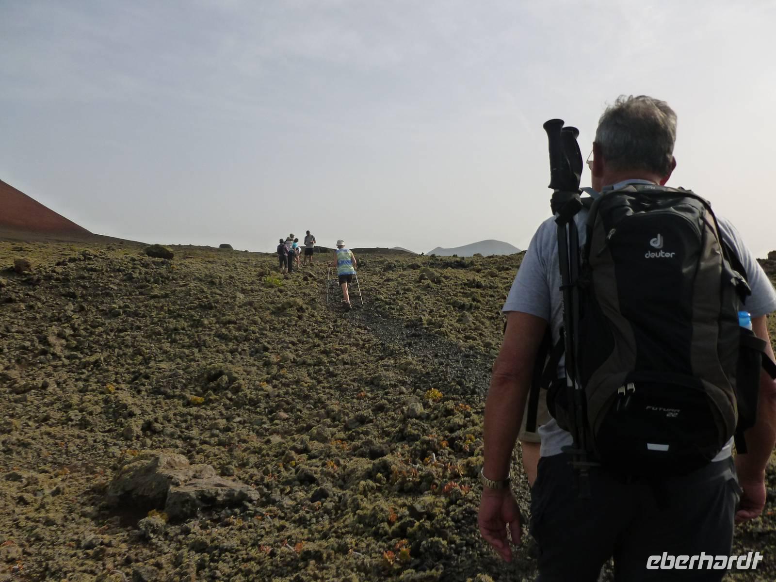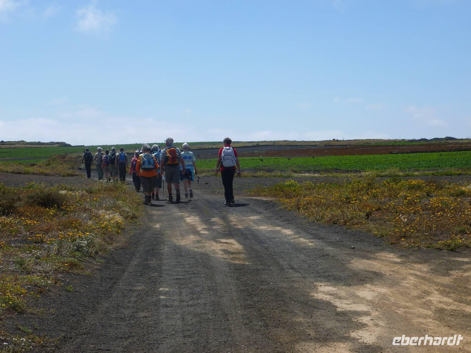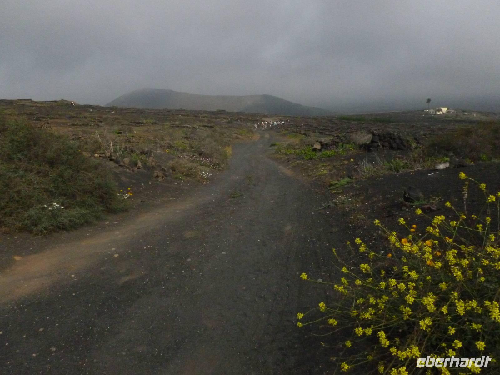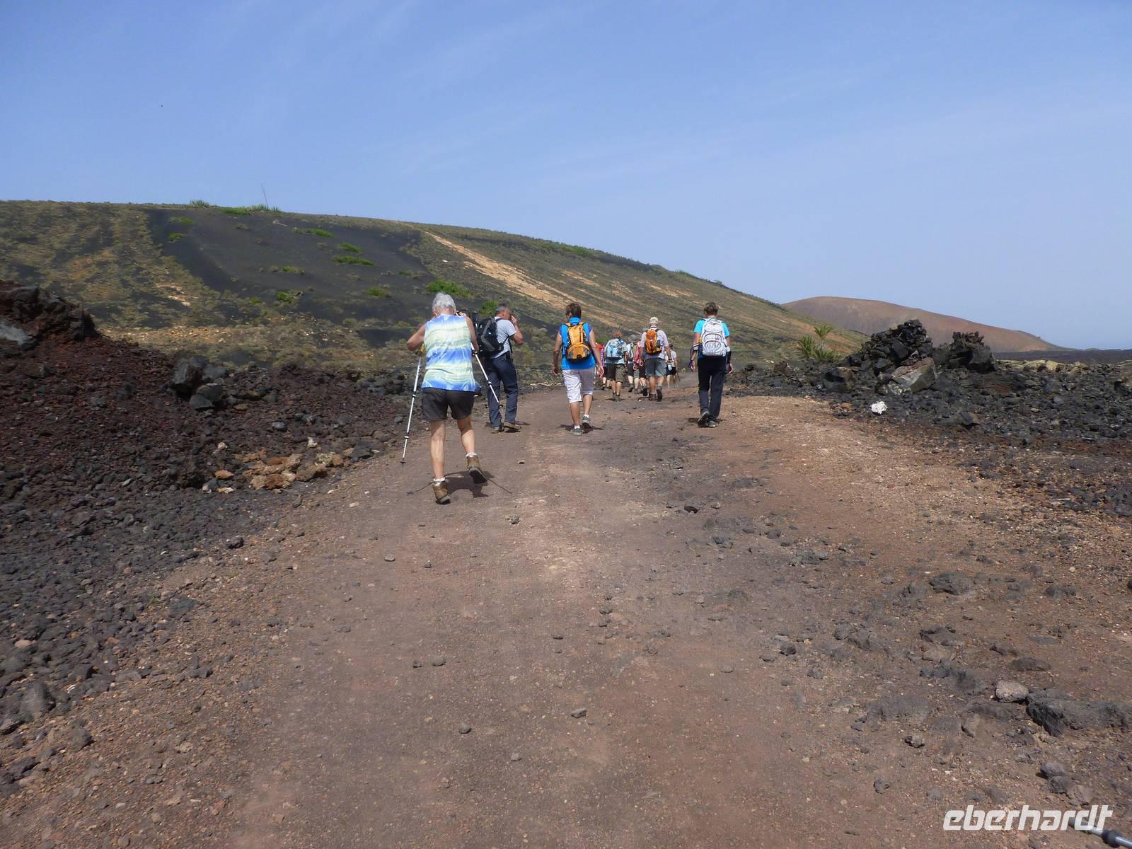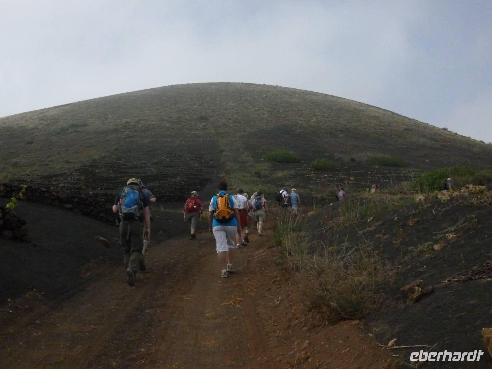 Heute konnten wir das ausgiebige Frühstück noch länger genießen, da uns Roland erst gegen 10 Uhr vom Hotel abgeholt hatte. Unser heutiger Anfangspunkt lag nur ca. 20 Minuten entfernt, oberhalb von La Asomada. Der erste Teil ging leicht bergan, immer in Richtung „Guardilama". Die Sicht war leider etwas diesig, aber dafür zeigte sich die Sonne heute wieder von ihrer besten Seite. Auch die Temperaturen waren deutlich gestiegen. Links und rechts konnten wir immer wieder die mühsam angelegten Weinfelder begutachten, die sehr akribisch von den Landsleuten gepflegt wurden. Auch Rolands Haus konnten wir von Weitem sichten. Weiter ging es nun bergauf in Richtung des Vulkanes „Guardilamas". Dort sind wir am Kraterrand oberhalb in Richtung des Vulkanes „Montana Tinasoria" gelaufen. Der Abstieg war dann stückchenweise sehr steil durch weiche, schwarze Kiesfelder in denen immer wieder bunte Blumen aufblitzten. Anschließend stiegen wir zum Tinasoria auf und machten an der Ruine Rast, um uns bei etwas Obst und einem Müsliriegel zu stärken. Zwischendurch erklärte uns Roland allerlei Wissenswertes aus dem Leben der Lanzarotener. Unser Wanderweg führte nun einmal auf und ab, bis wir unser Ziel, die Bodega „El Chupadero" in Sicht hatten. Das kleine Restaurant, das die Deutsche Barbara seit vielen Jahren betreibt, ist sehr individuell, da keine großen Gruppen abgefertigt werden. Somit konnten wir die verschiedenen Weine bei Serrano-Schinken und Ziegenkäse ganz abseits des Massentourismus genießen. Der Abschied fiel uns sichtlich schwer...