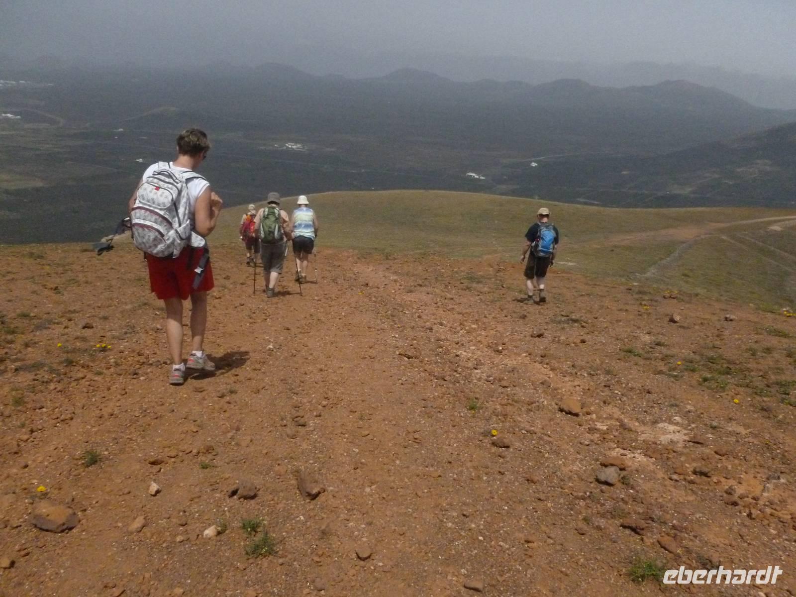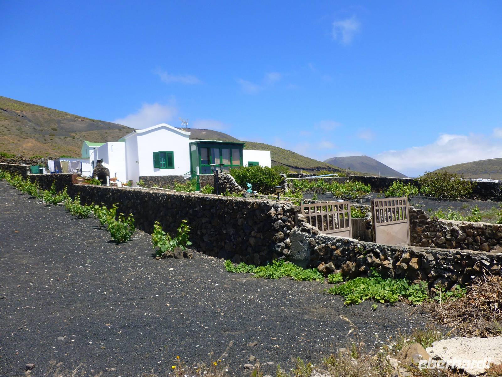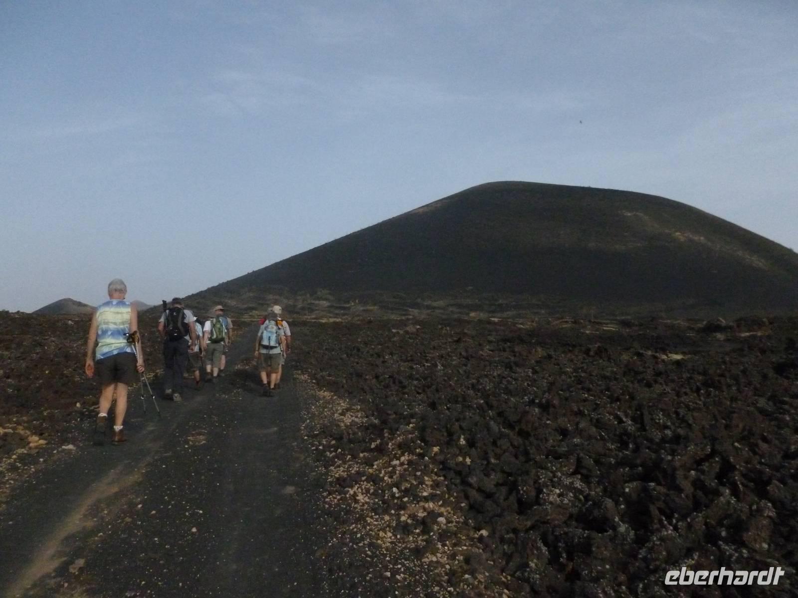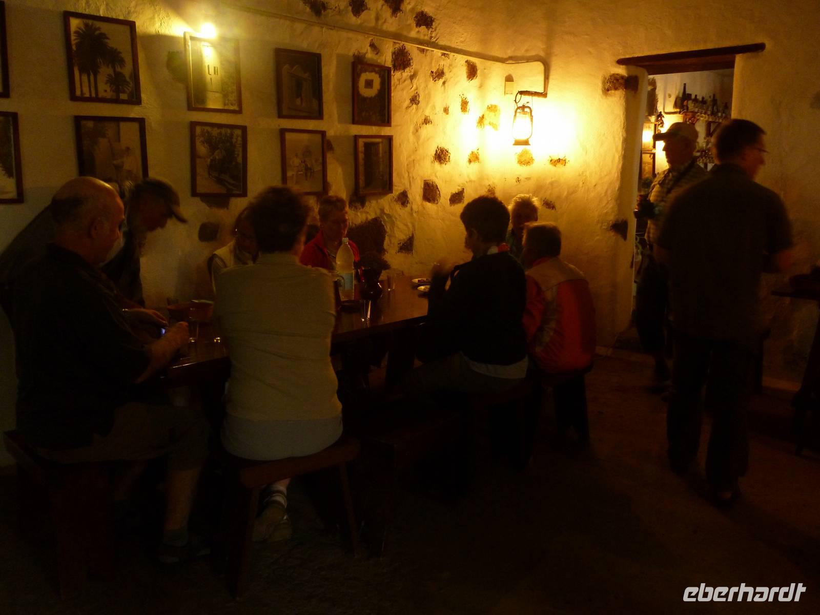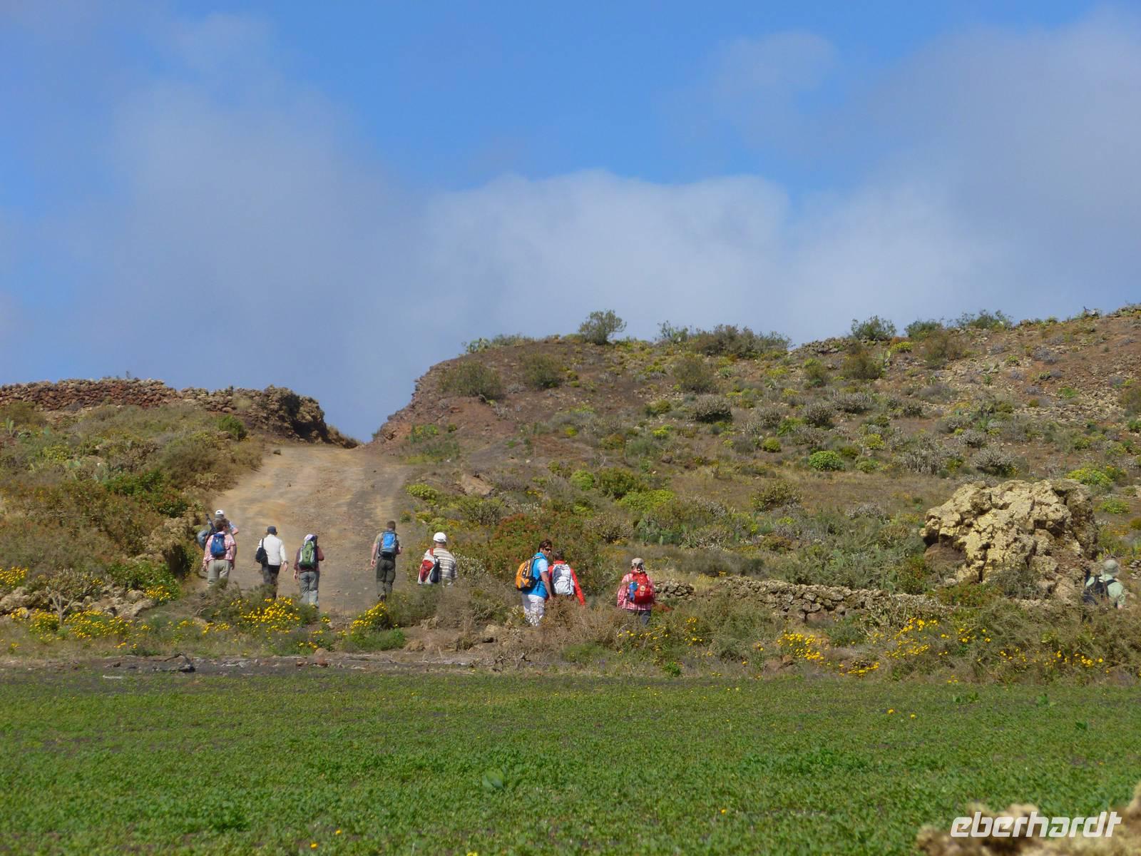 Heute konnten wir das ausgiebige Frühstück noch länger genießen, da uns Roland erst gegen 10 Uhr vom Hotel abgeholt hatte. Unser heutiger Anfangspunkt lag nur ca. 20 Minuten entfernt, oberhalb von La Asomada. Der erste Teil ging leicht bergan, immer in Richtung „Guardilama". Die Sicht war leider etwas diesig, aber dafür zeigte sich die Sonne heute wieder von ihrer besten Seite. Auch die Temperaturen waren deutlich gestiegen. Links und rechts konnten wir immer wieder die mühsam angelegten Weinfelder begutachten, die sehr akribisch von den Landsleuten gepflegt wurden. Auch Rolands Haus konnten wir von Weitem sichten. Weiter ging es nun bergauf in Richtung des Vulkanes „Guardilamas". Dort sind wir am Kraterrand oberhalb in Richtung des Vulkanes „Montana Tinasoria" gelaufen. Der Abstieg war dann stückchenweise sehr steil durch weiche, schwarze Kiesfelder in denen immer wieder bunte Blumen aufblitzten. Anschließend stiegen wir zum Tinasoria auf und machten an der Ruine Rast, um uns bei etwas Obst und einem Müsliriegel zu stärken. Zwischendurch erklärte uns Roland allerlei Wissenswertes aus dem Leben der Lanzarotener. Unser Wanderweg führte nun einmal auf und ab, bis wir unser Ziel, die Bodega „El Chupadero" in Sicht hatten. Das kleine Restaurant, das die Deutsche Barbara seit vielen Jahren betreibt, ist sehr individuell, da keine großen Gruppen abgefertigt werden. Somit konnten wir die verschiedenen Weine bei Serrano-Schinken und Ziegenkäse ganz abseits des Massentourismus genießen. Der Abschied fiel uns sichtlich schwer...