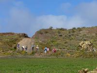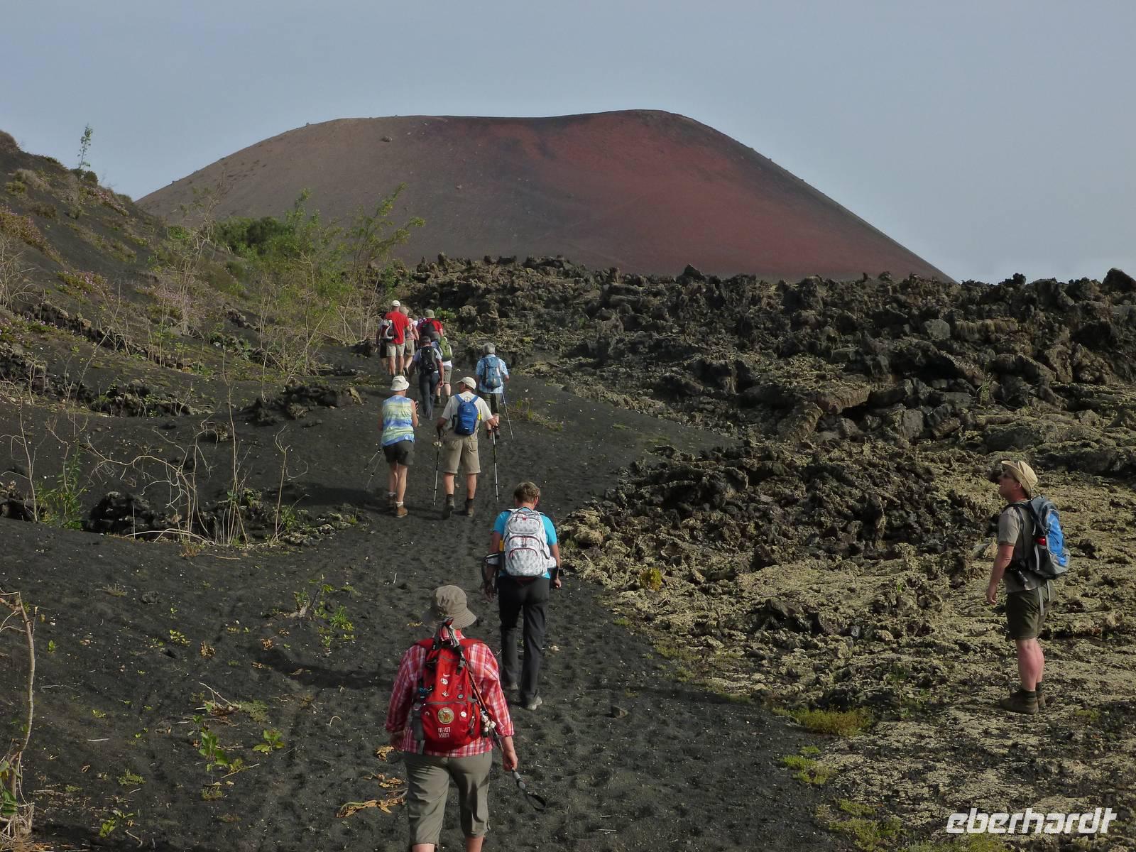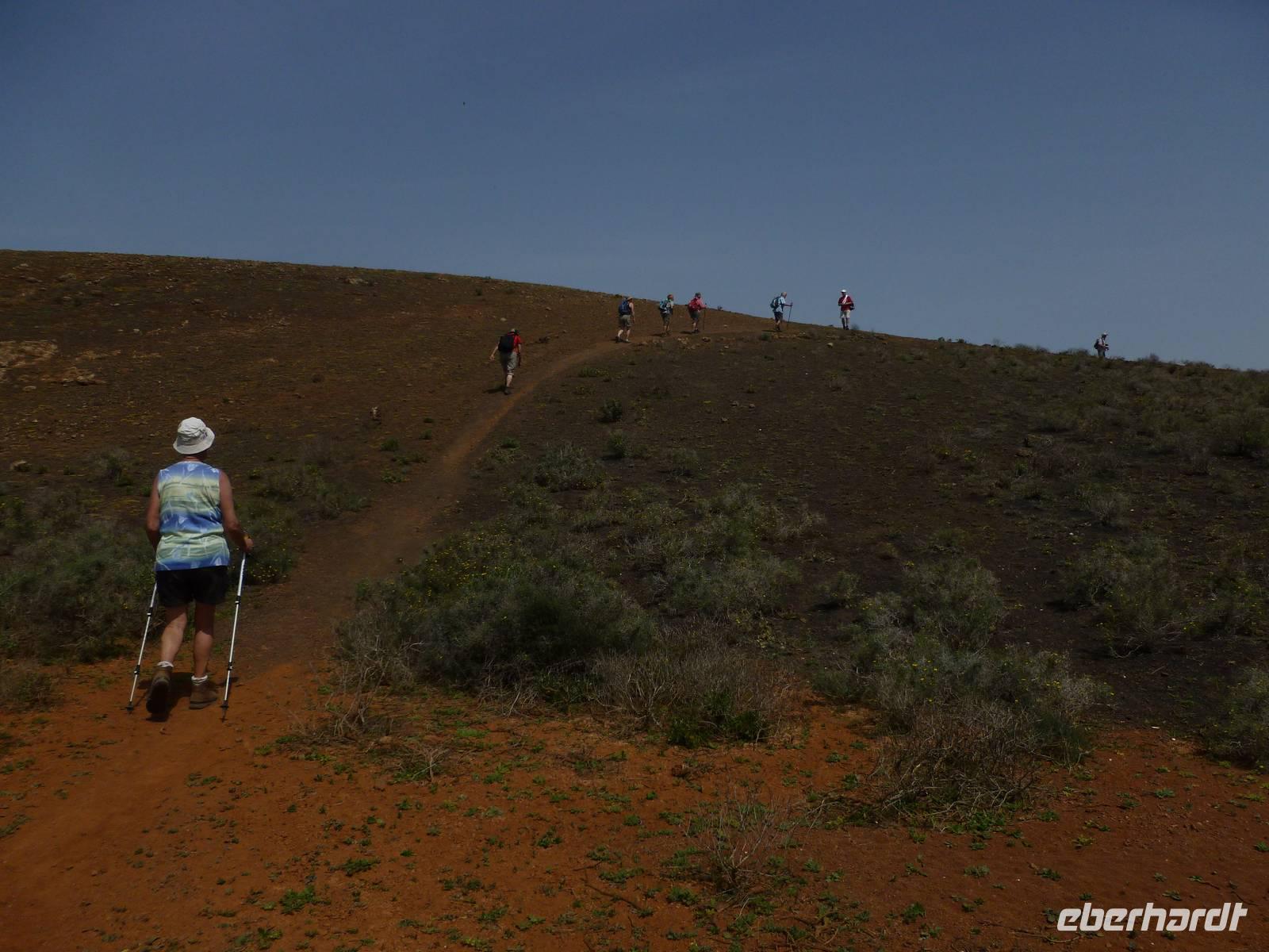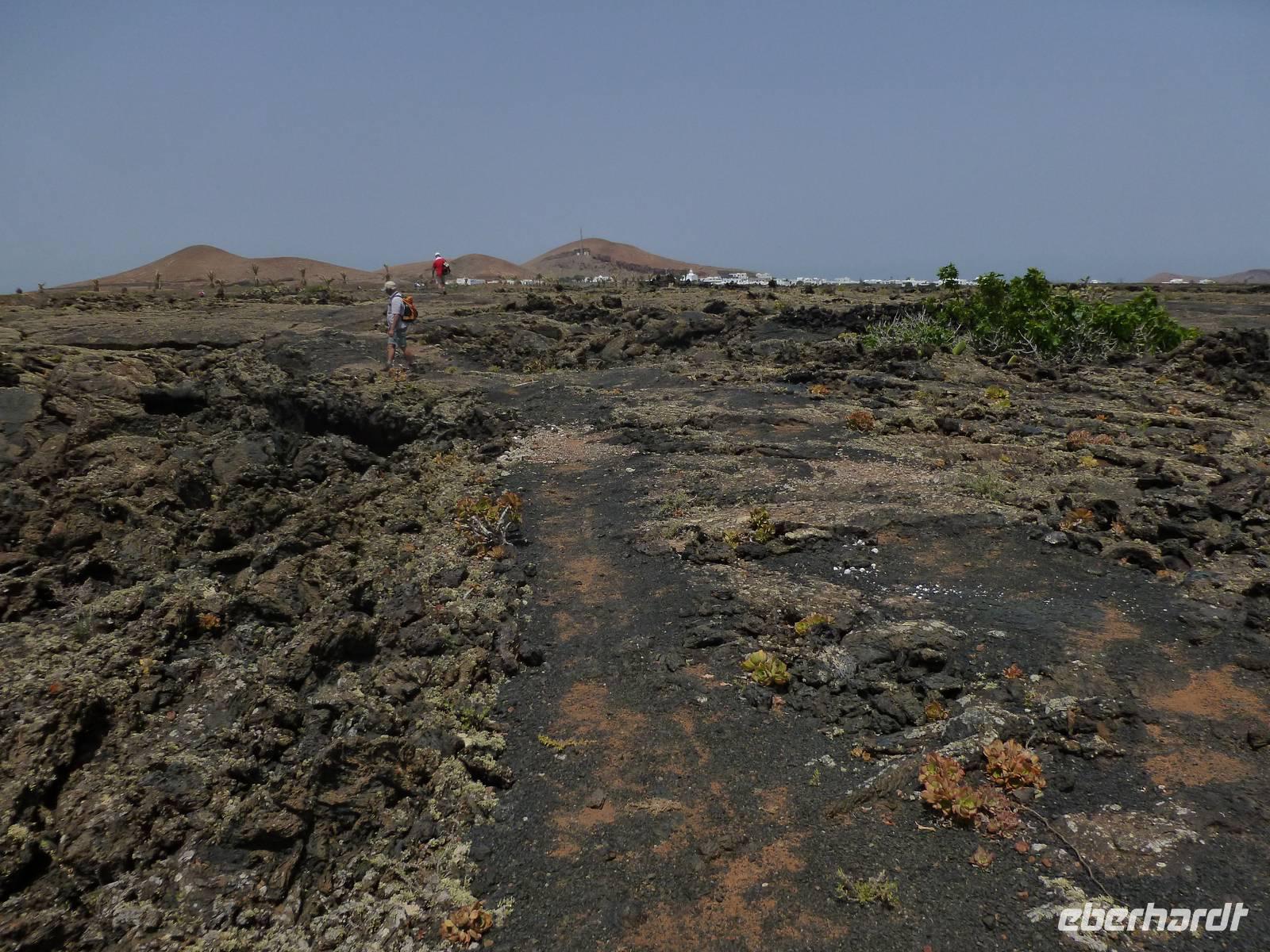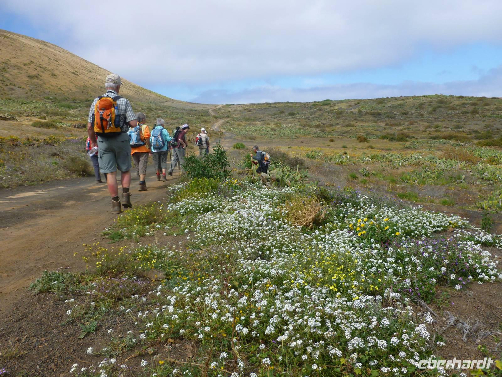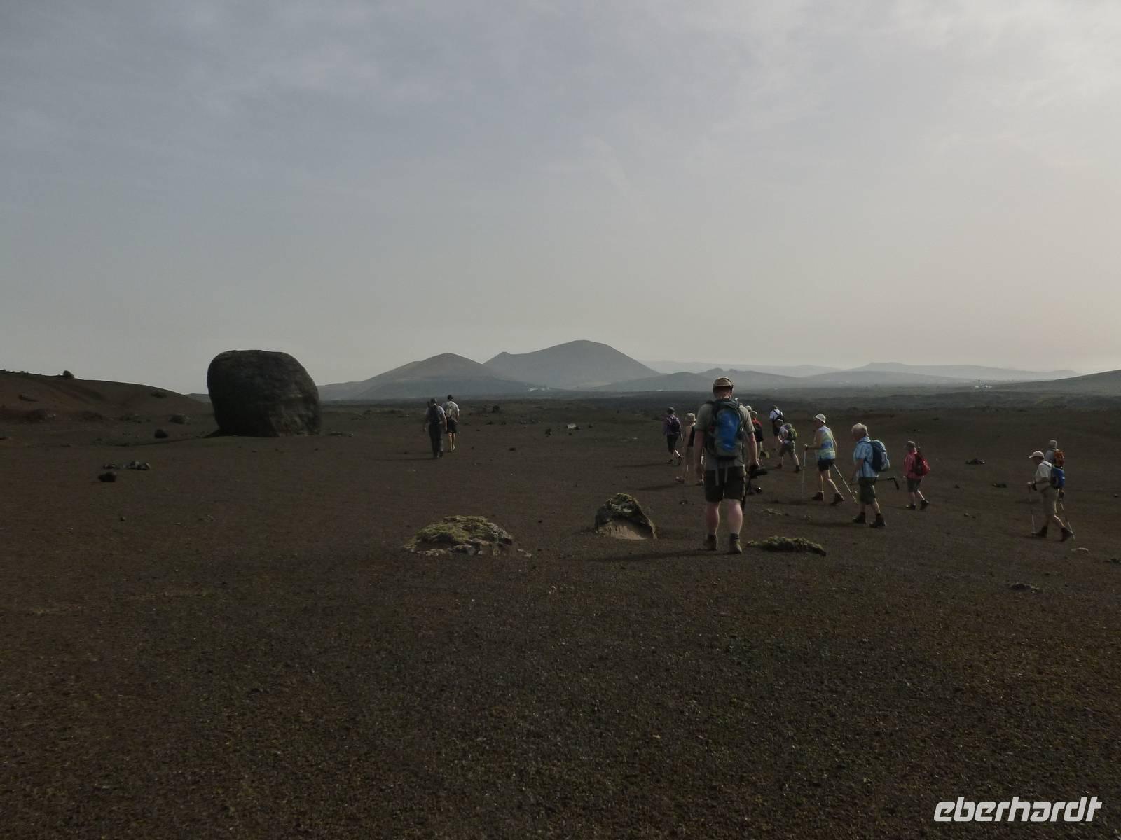 Heute konnten wir das ausgiebige Frühstück noch länger genießen, da uns Roland erst gegen 10 Uhr vom Hotel abgeholt hatte. Unser heutiger Anfangspunkt lag nur ca. 20 Minuten entfernt, oberhalb von La Asomada. Der erste Teil ging leicht bergan, immer in Richtung „Guardilama". Die Sicht war leider etwas diesig, aber dafür zeigte sich die Sonne heute wieder von ihrer besten Seite. Auch die Temperaturen waren deutlich gestiegen. Links und rechts konnten wir immer wieder die mühsam angelegten Weinfelder begutachten, die sehr akribisch von den Landsleuten gepflegt wurden. Auch Rolands Haus konnten wir von Weitem sichten. Weiter ging es nun bergauf in Richtung des Vulkanes „Guardilamas". Dort sind wir am Kraterrand oberhalb in Richtung des Vulkanes „Montana Tinasoria" gelaufen. Der Abstieg war dann stückchenweise sehr steil durch weiche, schwarze Kiesfelder in denen immer wieder bunte Blumen aufblitzten. Anschließend stiegen wir zum Tinasoria auf und machten an der Ruine Rast, um uns bei etwas Obst und einem Müsliriegel zu stärken. Zwischendurch erklärte uns Roland allerlei Wissenswertes aus dem Leben der Lanzarotener. Unser Wanderweg führte nun einmal auf und ab, bis wir unser Ziel, die Bodega „El Chupadero" in Sicht hatten. Das kleine Restaurant, das die Deutsche Barbara seit vielen Jahren betreibt, ist sehr individuell, da keine großen Gruppen abgefertigt werden. Somit konnten wir die verschiedenen Weine bei Serrano-Schinken und Ziegenkäse ganz abseits des Massentourismus genießen. Der Abschied fiel uns sichtlich schwer...