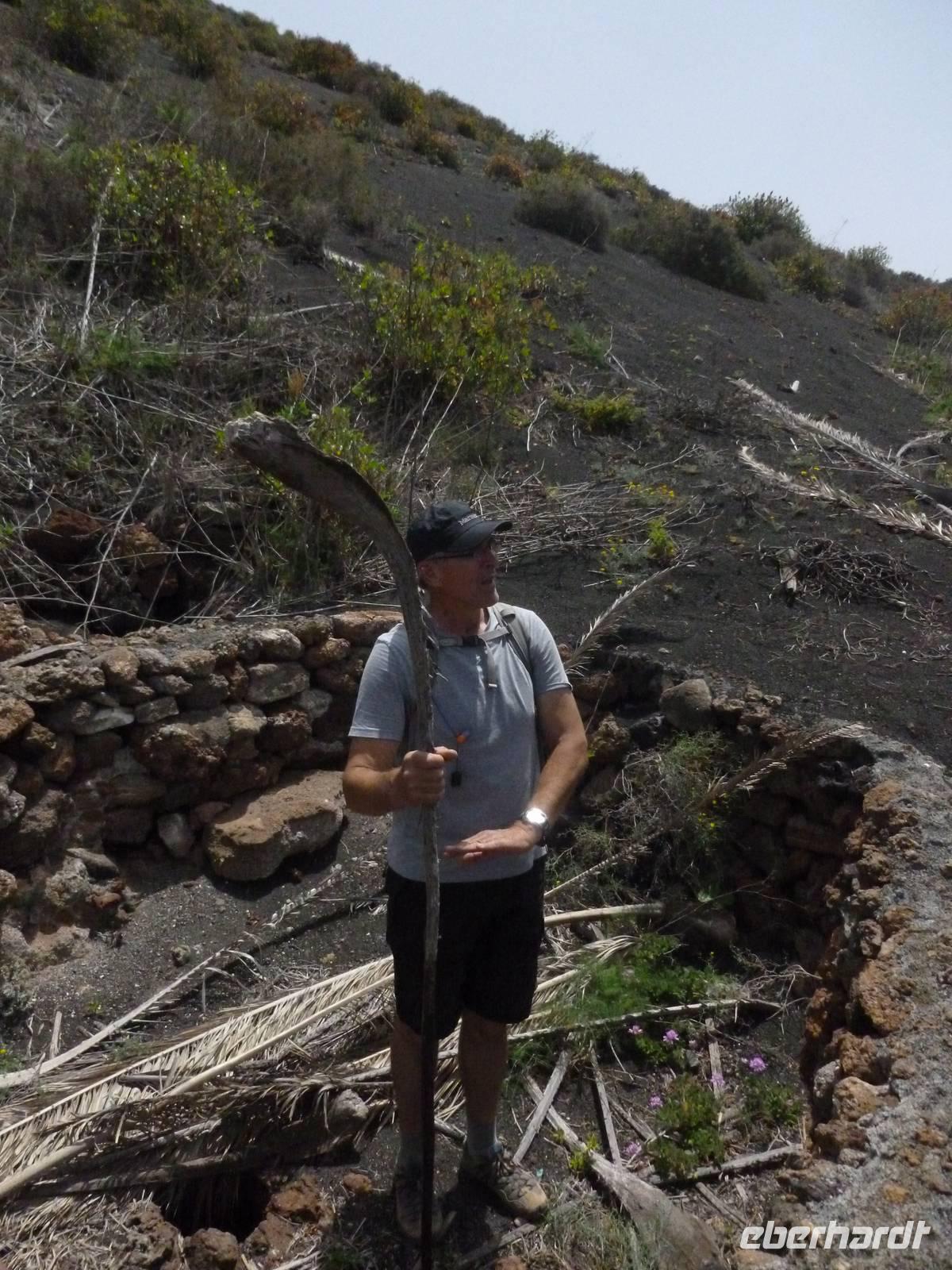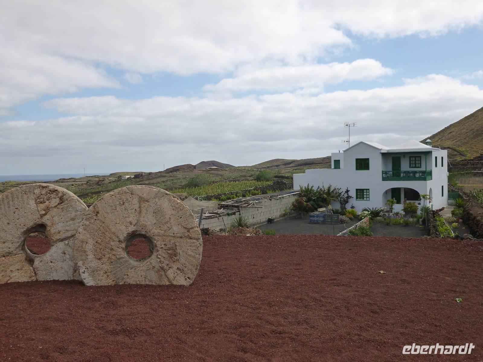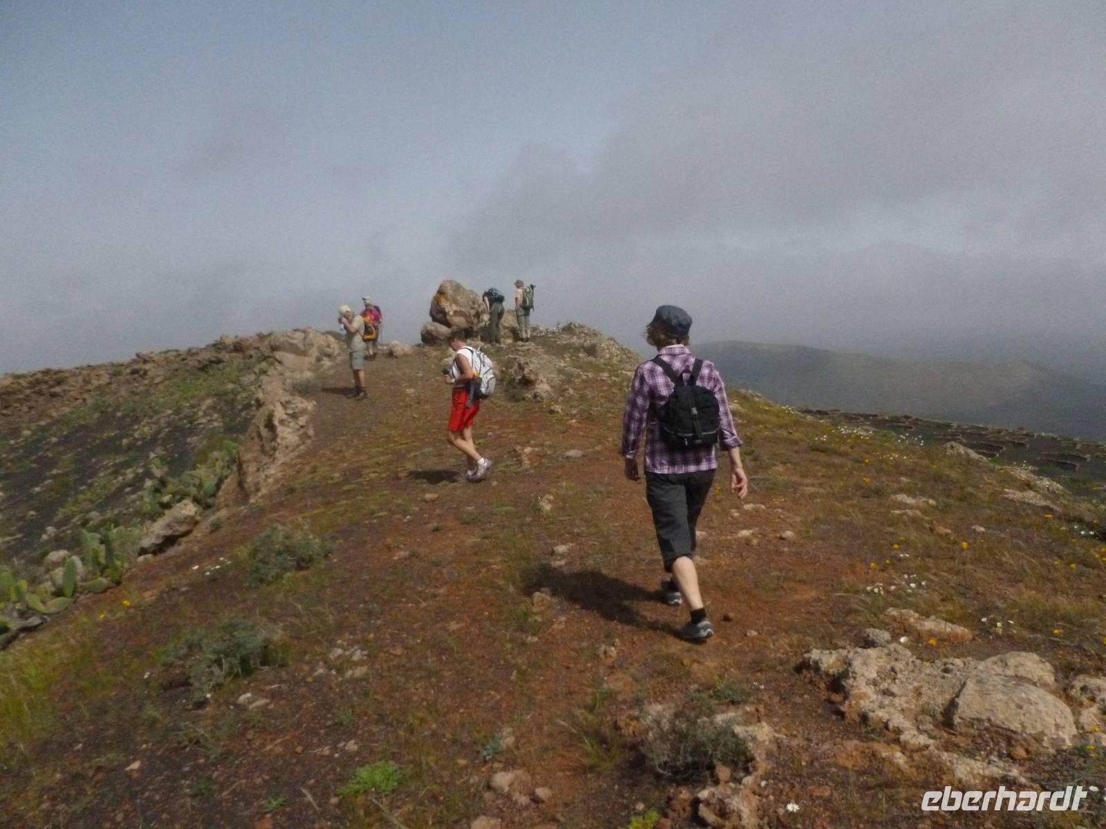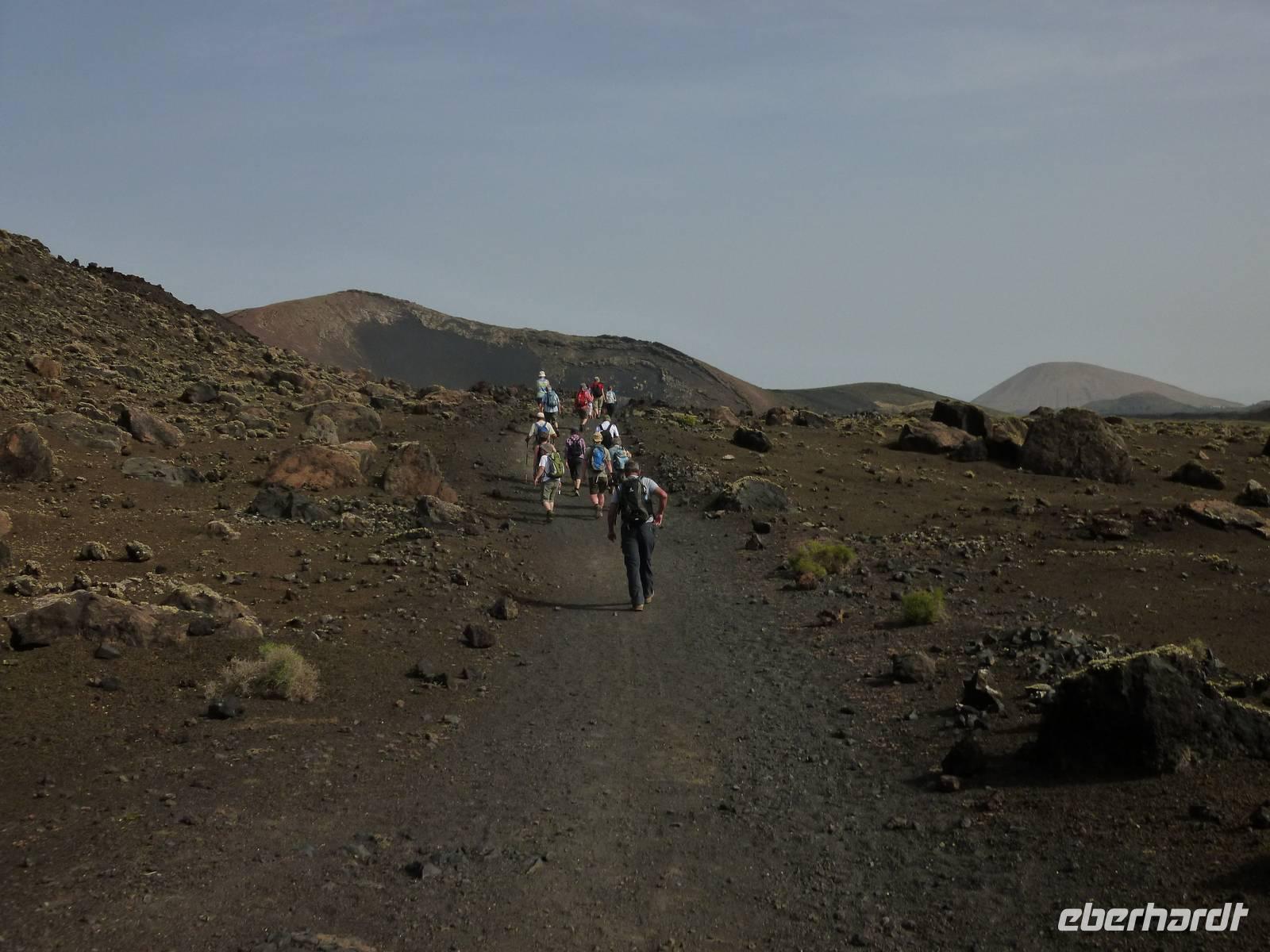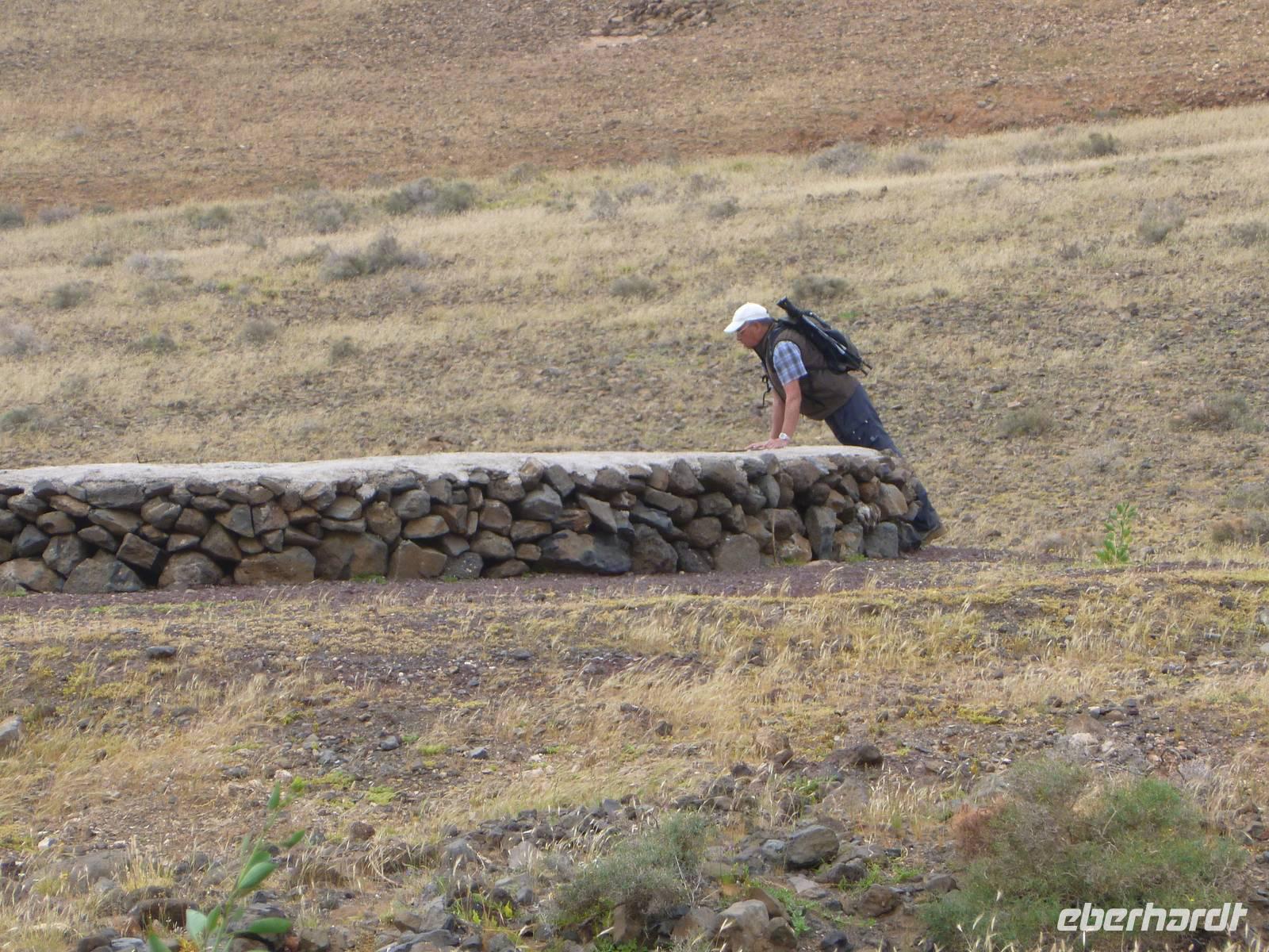 Heute konnten wir das ausgiebige Frühstück noch länger genießen, da uns Roland erst gegen 10 Uhr vom Hotel abgeholt hatte. Unser heutiger Anfangspunkt lag nur ca. 20 Minuten entfernt, oberhalb von La Asomada. Der erste Teil ging leicht bergan, immer in Richtung „Guardilama". Die Sicht war leider etwas diesig, aber dafür zeigte sich die Sonne heute wieder von ihrer besten Seite. Auch die Temperaturen waren deutlich gestiegen. Links und rechts konnten wir immer wieder die mühsam angelegten Weinfelder begutachten, die sehr akribisch von den Landsleuten gepflegt wurden. Auch Rolands Haus konnten wir von Weitem sichten. Weiter ging es nun bergauf in Richtung des Vulkanes „Guardilamas". Dort sind wir am Kraterrand oberhalb in Richtung des Vulkanes „Montana Tinasoria" gelaufen. Der Abstieg war dann stückchenweise sehr steil durch weiche, schwarze Kiesfelder in denen immer wieder bunte Blumen aufblitzten. Anschließend stiegen wir zum Tinasoria auf und machten an der Ruine Rast, um uns bei etwas Obst und einem Müsliriegel zu stärken. Zwischendurch erklärte uns Roland allerlei Wissenswertes aus dem Leben der Lanzarotener. Unser Wanderweg führte nun einmal auf und ab, bis wir unser Ziel, die Bodega „El Chupadero" in Sicht hatten. Das kleine Restaurant, das die Deutsche Barbara seit vielen Jahren betreibt, ist sehr individuell, da keine großen Gruppen abgefertigt werden. Somit konnten wir die verschiedenen Weine bei Serrano-Schinken und Ziegenkäse ganz abseits des Massentourismus genießen. Der Abschied fiel uns sichtlich schwer...