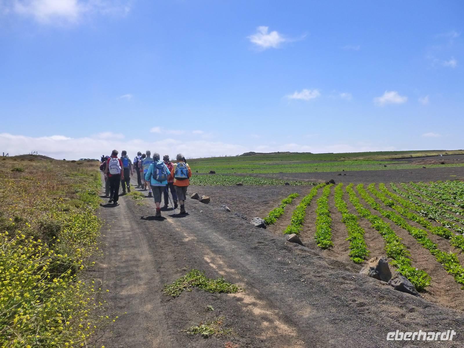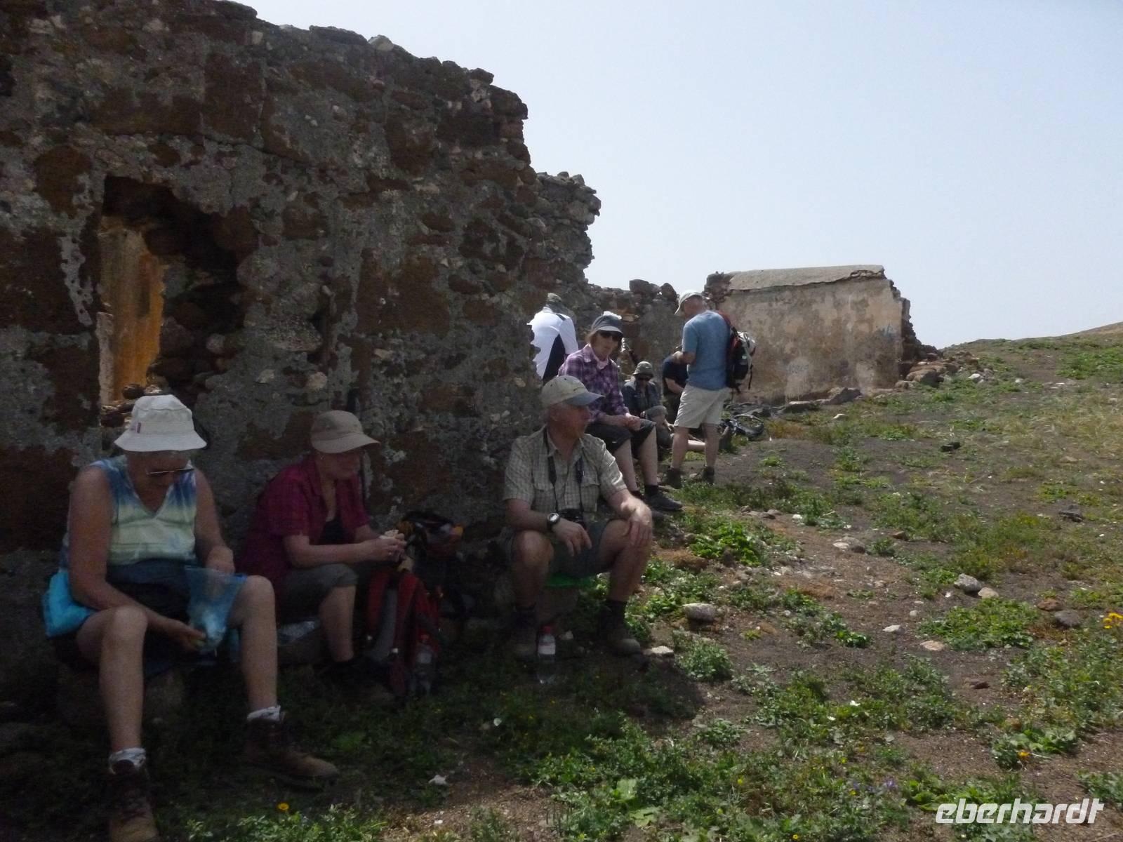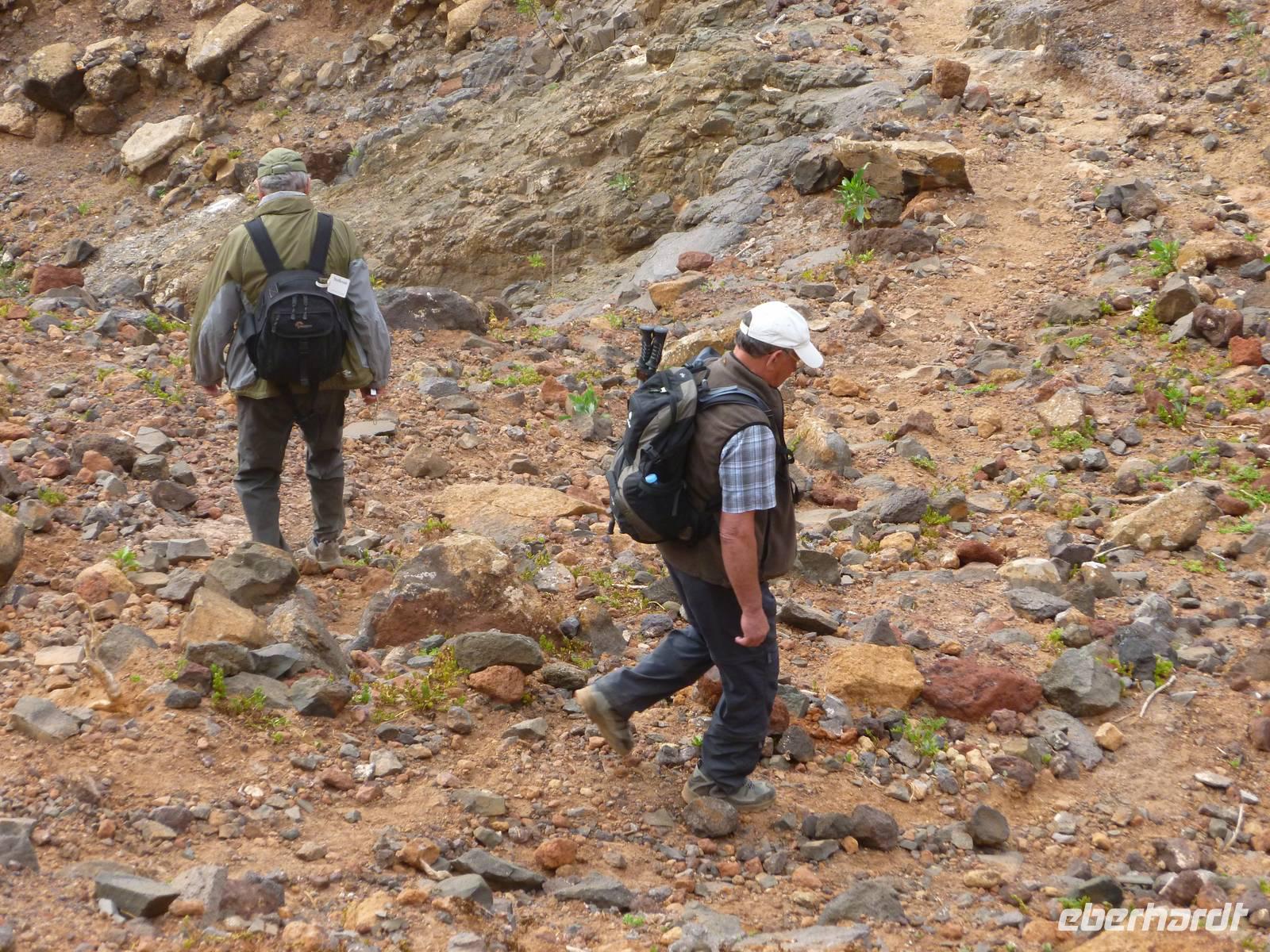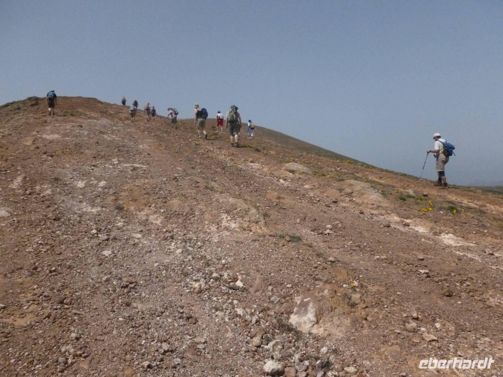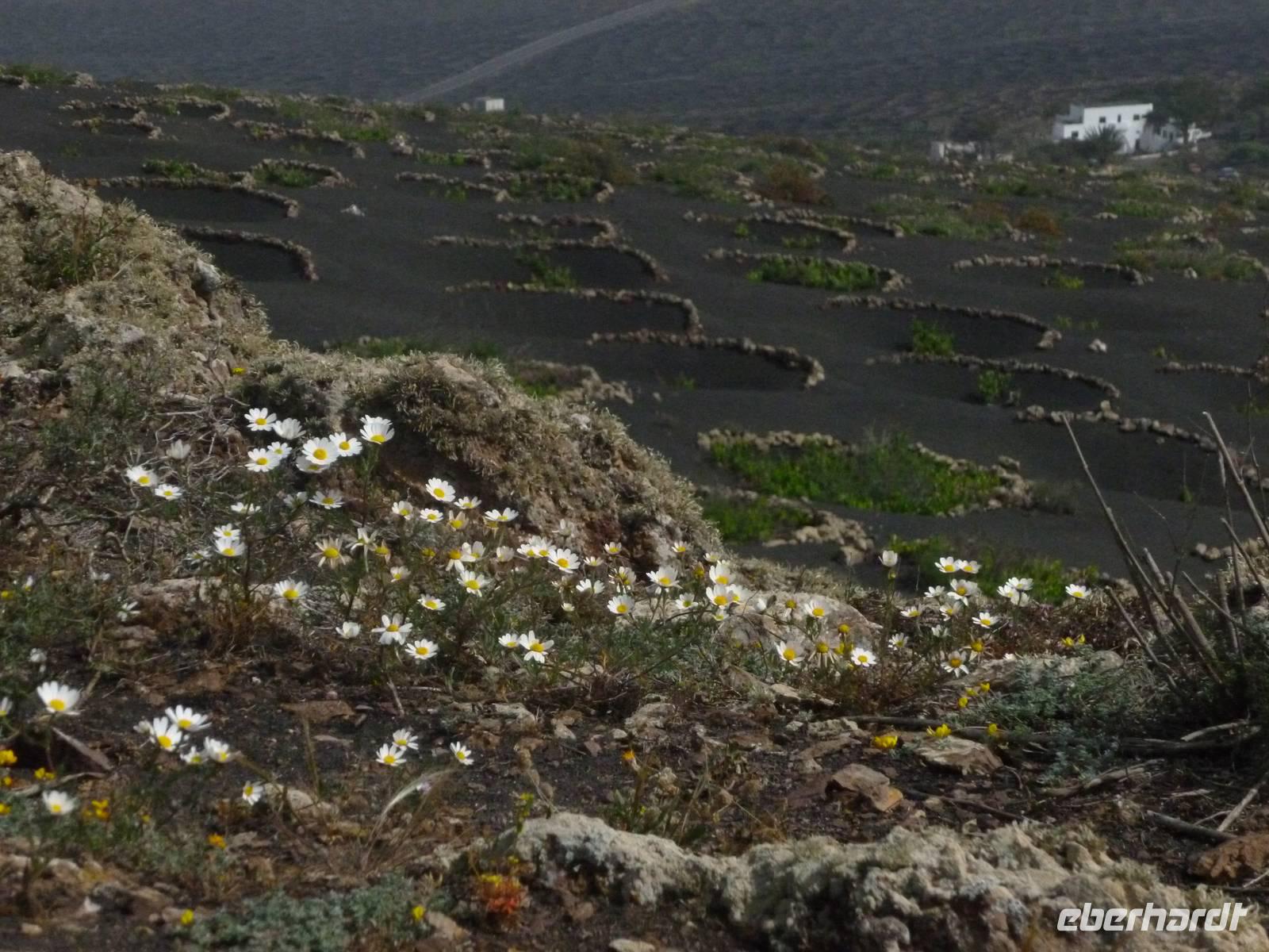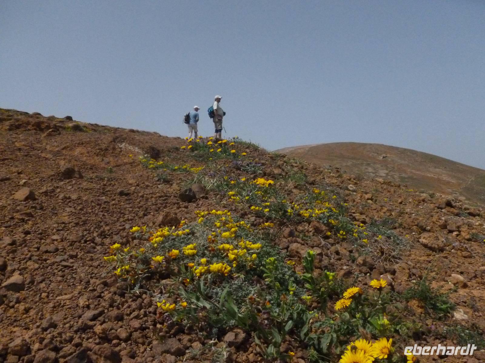 Heute konnten wir das ausgiebige Frühstück noch länger genießen, da uns Roland erst gegen 10 Uhr vom Hotel abgeholt hatte. Unser heutiger Anfangspunkt lag nur ca. 20 Minuten entfernt, oberhalb von La Asomada. Der erste Teil ging leicht bergan, immer in Richtung „Guardilama". Die Sicht war leider etwas diesig, aber dafür zeigte sich die Sonne heute wieder von ihrer besten Seite. Auch die Temperaturen waren deutlich gestiegen. Links und rechts konnten wir immer wieder die mühsam angelegten Weinfelder begutachten, die sehr akribisch von den Landsleuten gepflegt wurden. Auch Rolands Haus konnten wir von Weitem sichten. Weiter ging es nun bergauf in Richtung des Vulkanes „Guardilamas". Dort sind wir am Kraterrand oberhalb in Richtung des Vulkanes „Montana Tinasoria" gelaufen. Der Abstieg war dann stückchenweise sehr steil durch weiche, schwarze Kiesfelder in denen immer wieder bunte Blumen aufblitzten. Anschließend stiegen wir zum Tinasoria auf und machten an der Ruine Rast, um uns bei etwas Obst und einem Müsliriegel zu stärken. Zwischendurch erklärte uns Roland allerlei Wissenswertes aus dem Leben der Lanzarotener. Unser Wanderweg führte nun einmal auf und ab, bis wir unser Ziel, die Bodega „El Chupadero" in Sicht hatten. Das kleine Restaurant, das die Deutsche Barbara seit vielen Jahren betreibt, ist sehr individuell, da keine großen Gruppen abgefertigt werden. Somit konnten wir die verschiedenen Weine bei Serrano-Schinken und Ziegenkäse ganz abseits des Massentourismus genießen. Der Abschied fiel uns sichtlich schwer...