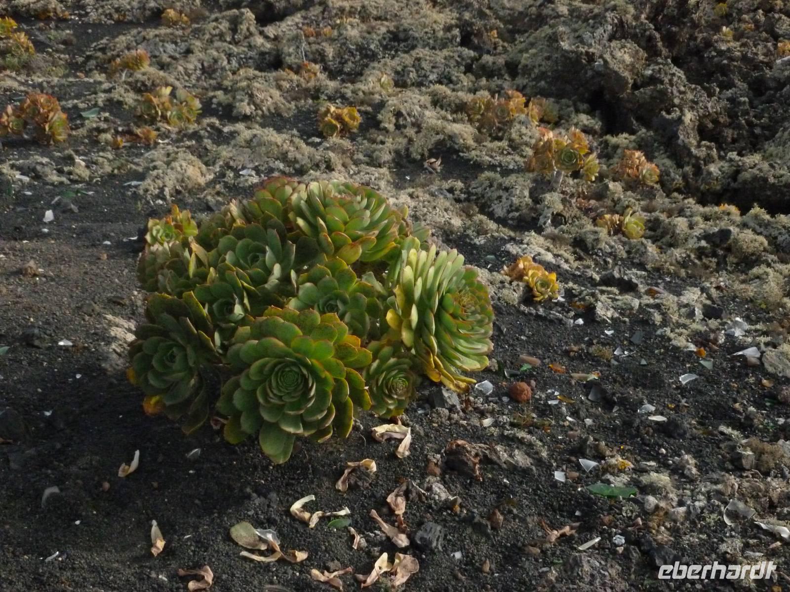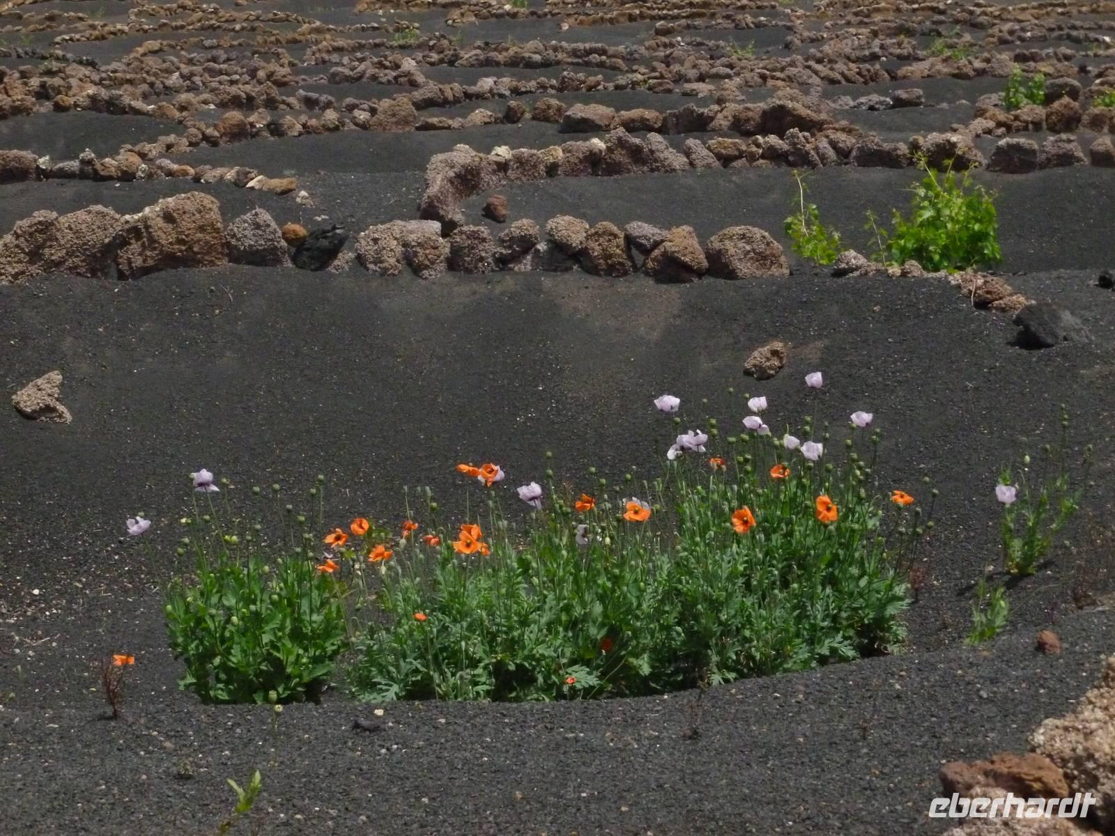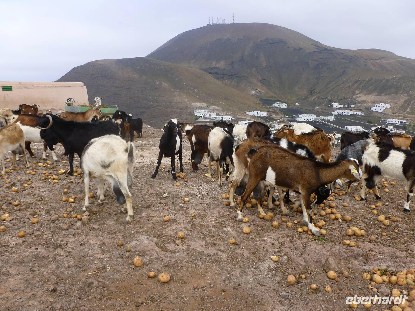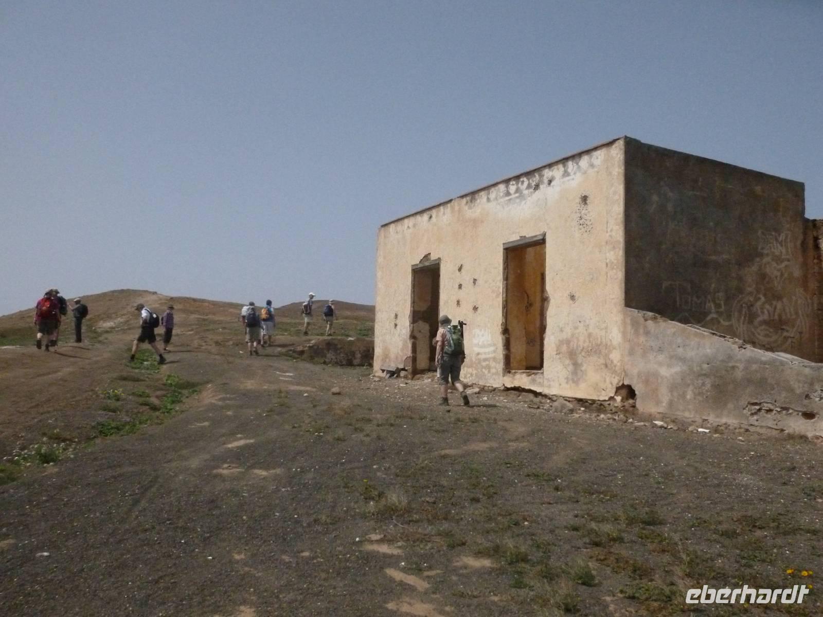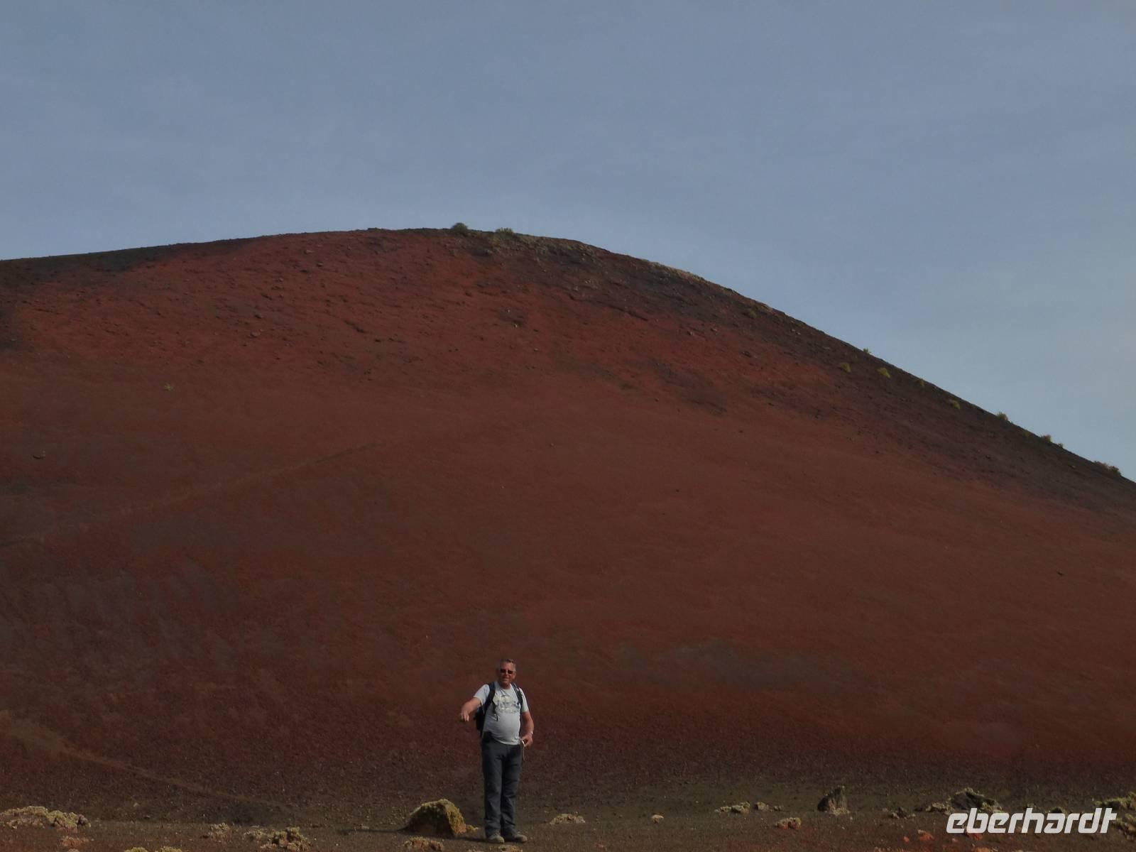 Heute konnten wir das ausgiebige Frühstück noch länger genießen, da uns Roland erst gegen 10 Uhr vom Hotel abgeholt hatte. Unser heutiger Anfangspunkt lag nur ca. 20 Minuten entfernt, oberhalb von La Asomada. Der erste Teil ging leicht bergan, immer in Richtung „Guardilama". Die Sicht war leider etwas diesig, aber dafür zeigte sich die Sonne heute wieder von ihrer besten Seite. Auch die Temperaturen waren deutlich gestiegen. Links und rechts konnten wir immer wieder die mühsam angelegten Weinfelder begutachten, die sehr akribisch von den Landsleuten gepflegt wurden. Auch Rolands Haus konnten wir von Weitem sichten. Weiter ging es nun bergauf in Richtung des Vulkanes „Guardilamas". Dort sind wir am Kraterrand oberhalb in Richtung des Vulkanes „Montana Tinasoria" gelaufen. Der Abstieg war dann stückchenweise sehr steil durch weiche, schwarze Kiesfelder in denen immer wieder bunte Blumen aufblitzten. Anschließend stiegen wir zum Tinasoria auf und machten an der Ruine Rast, um uns bei etwas Obst und einem Müsliriegel zu stärken. Zwischendurch erklärte uns Roland allerlei Wissenswertes aus dem Leben der Lanzarotener. Unser Wanderweg führte nun einmal auf und ab, bis wir unser Ziel, die Bodega „El Chupadero" in Sicht hatten. Das kleine Restaurant, das die Deutsche Barbara seit vielen Jahren betreibt, ist sehr individuell, da keine großen Gruppen abgefertigt werden. Somit konnten wir die verschiedenen Weine bei Serrano-Schinken und Ziegenkäse ganz abseits des Massentourismus genießen. Der Abschied fiel uns sichtlich schwer...