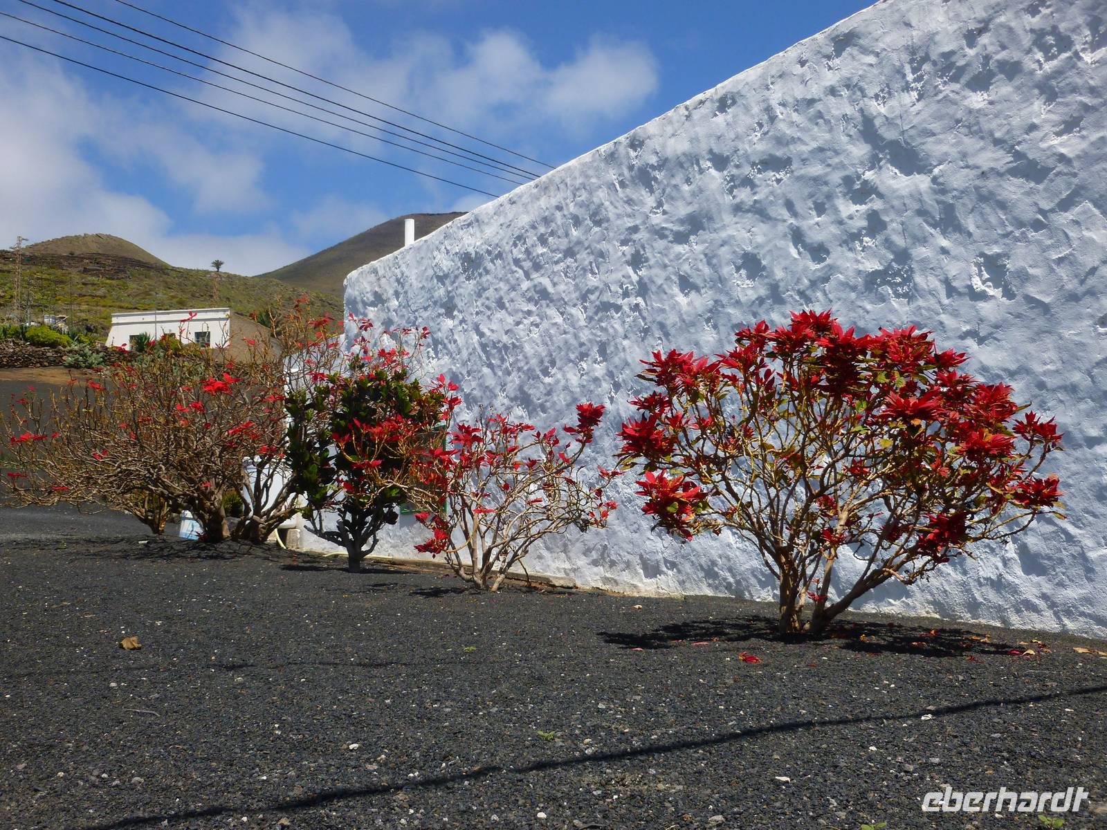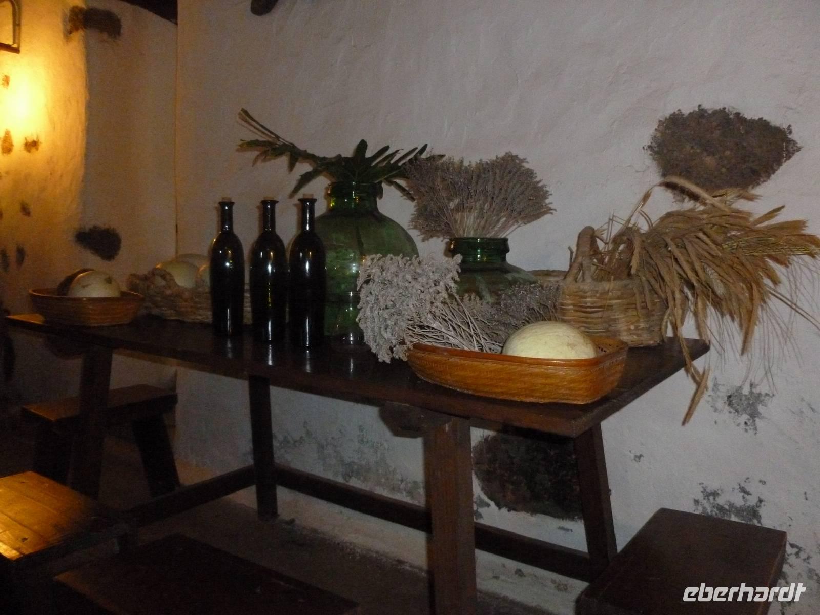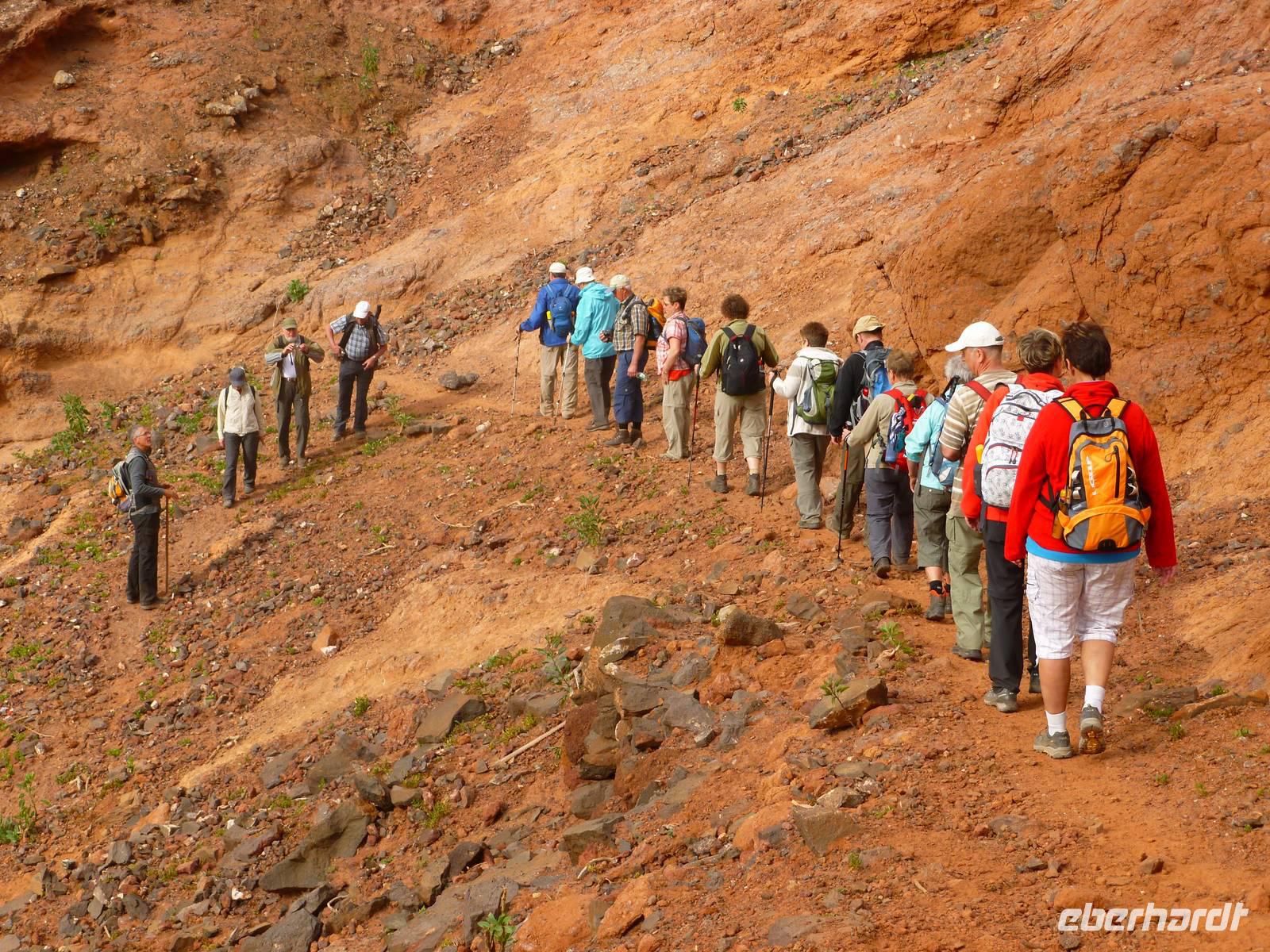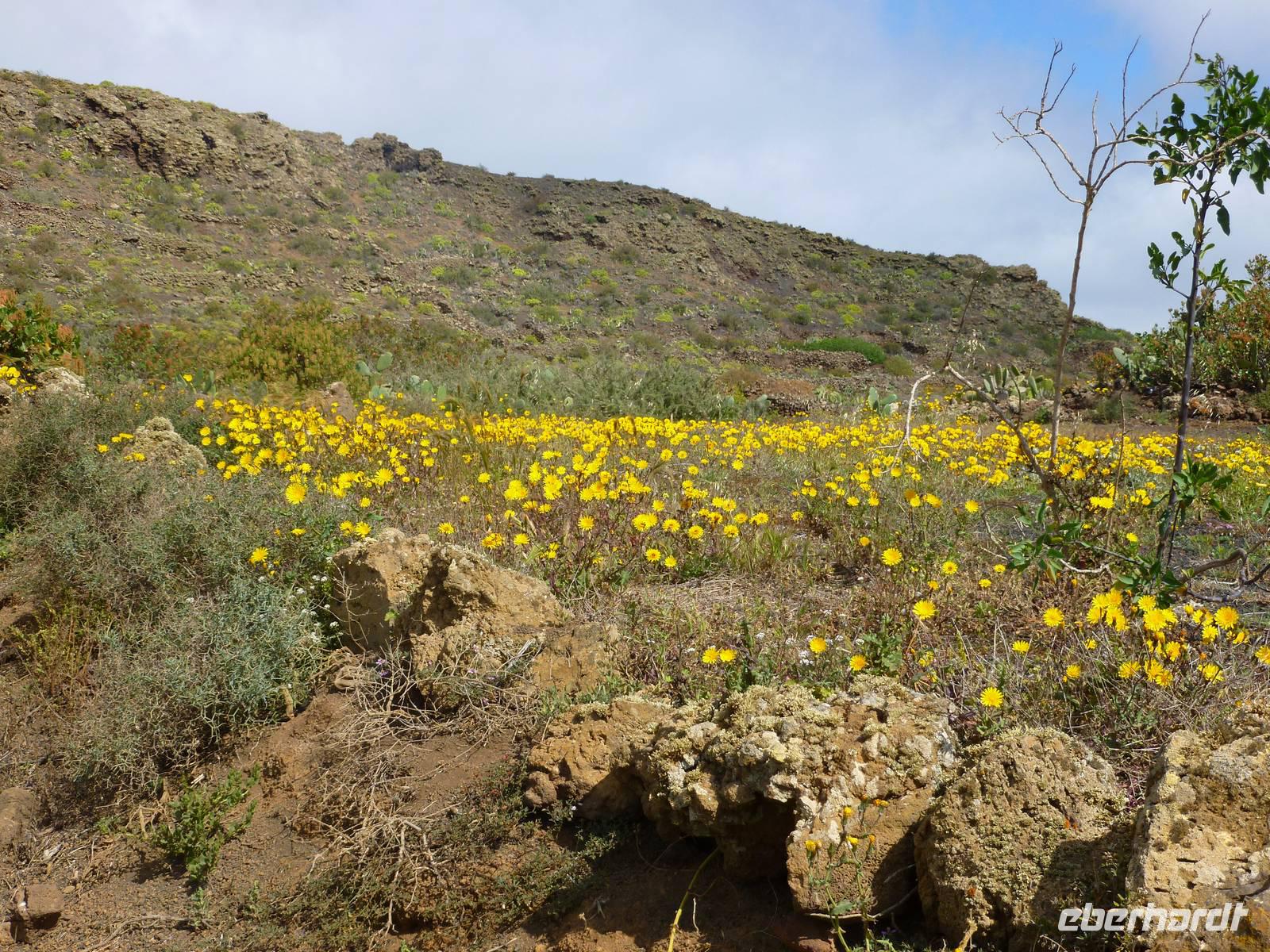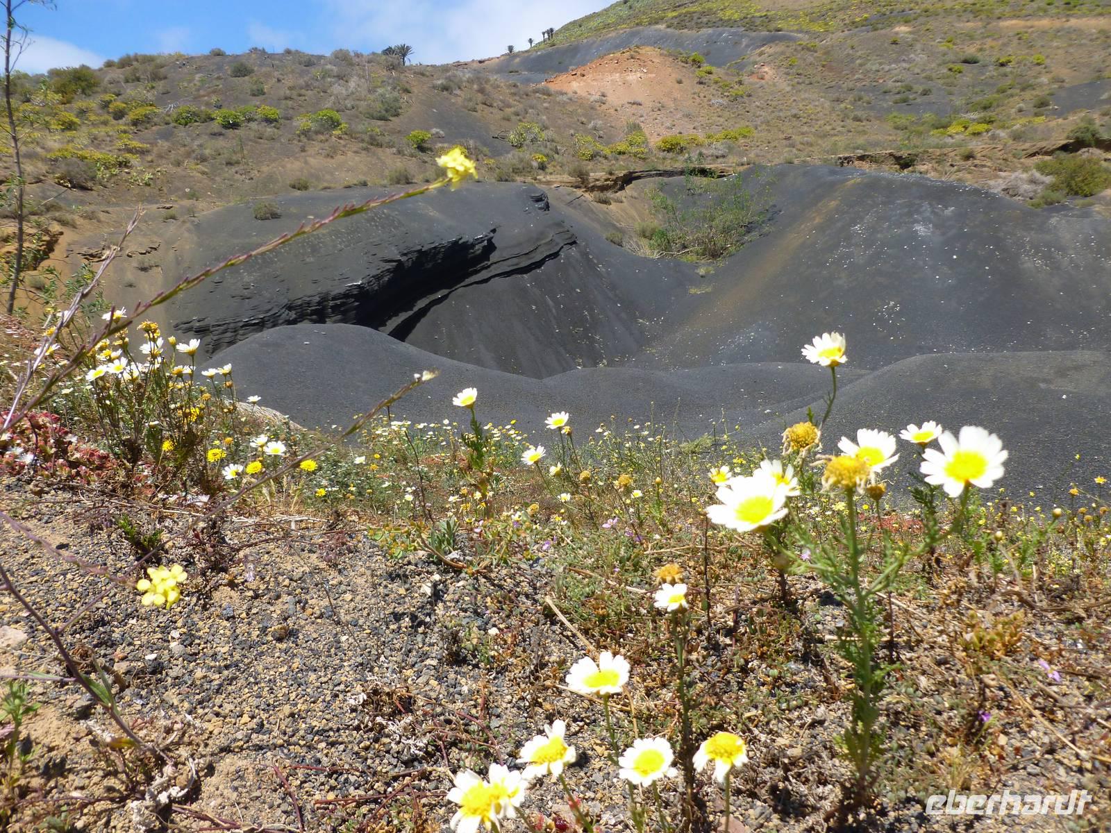 Heute konnten wir das ausgiebige Frühstück noch länger genießen, da uns Roland erst gegen 10 Uhr vom Hotel abgeholt hatte. Unser heutiger Anfangspunkt lag nur ca. 20 Minuten entfernt, oberhalb von La Asomada. Der erste Teil ging leicht bergan, immer in Richtung „Guardilama". Die Sicht war leider etwas diesig, aber dafür zeigte sich die Sonne heute wieder von ihrer besten Seite. Auch die Temperaturen waren deutlich gestiegen. Links und rechts konnten wir immer wieder die mühsam angelegten Weinfelder begutachten, die sehr akribisch von den Landsleuten gepflegt wurden. Auch Rolands Haus konnten wir von Weitem sichten. Weiter ging es nun bergauf in Richtung des Vulkanes „Guardilamas". Dort sind wir am Kraterrand oberhalb in Richtung des Vulkanes „Montana Tinasoria" gelaufen. Der Abstieg war dann stückchenweise sehr steil durch weiche, schwarze Kiesfelder in denen immer wieder bunte Blumen aufblitzten. Anschließend stiegen wir zum Tinasoria auf und machten an der Ruine Rast, um uns bei etwas Obst und einem Müsliriegel zu stärken. Zwischendurch erklärte uns Roland allerlei Wissenswertes aus dem Leben der Lanzarotener. Unser Wanderweg führte nun einmal auf und ab, bis wir unser Ziel, die Bodega „El Chupadero" in Sicht hatten. Das kleine Restaurant, das die Deutsche Barbara seit vielen Jahren betreibt, ist sehr individuell, da keine großen Gruppen abgefertigt werden. Somit konnten wir die verschiedenen Weine bei Serrano-Schinken und Ziegenkäse ganz abseits des Massentourismus genießen. Der Abschied fiel uns sichtlich schwer...