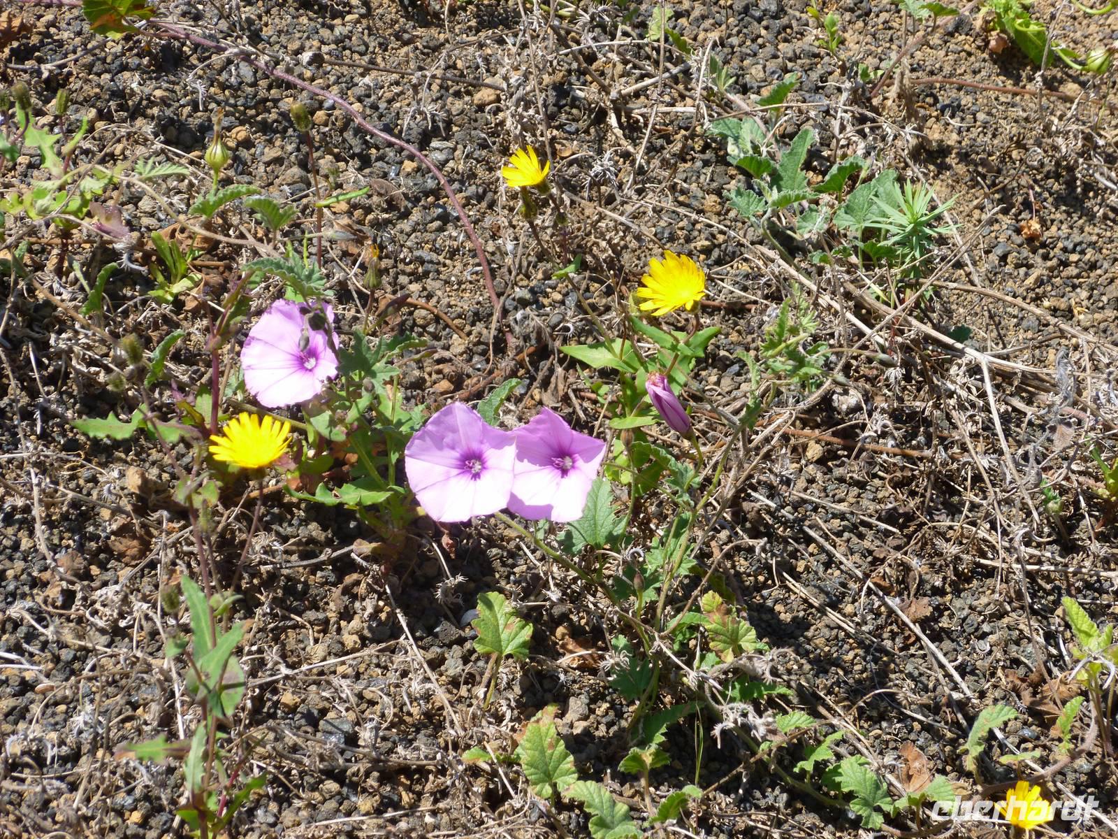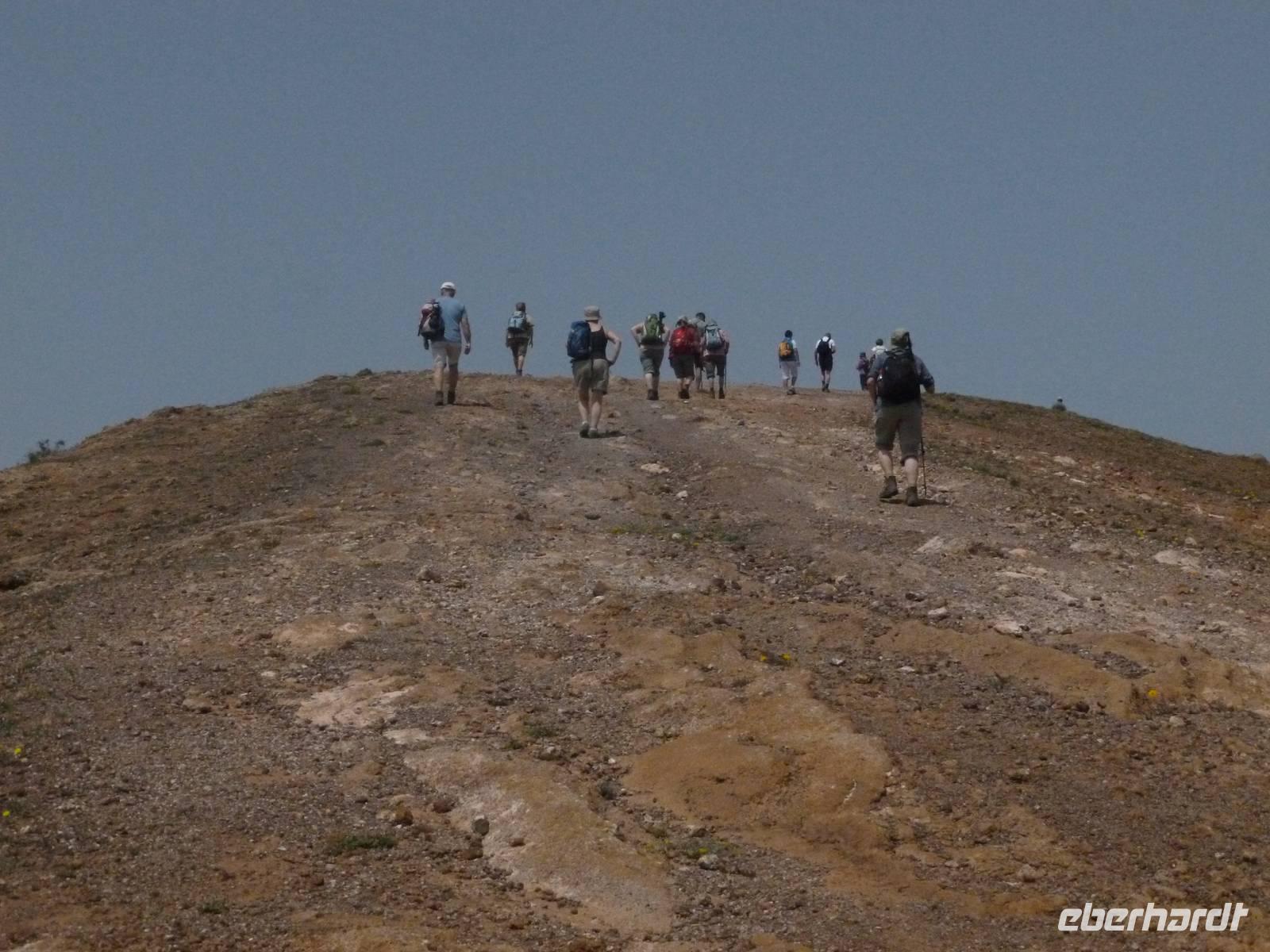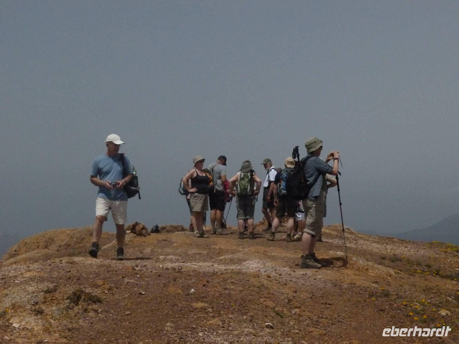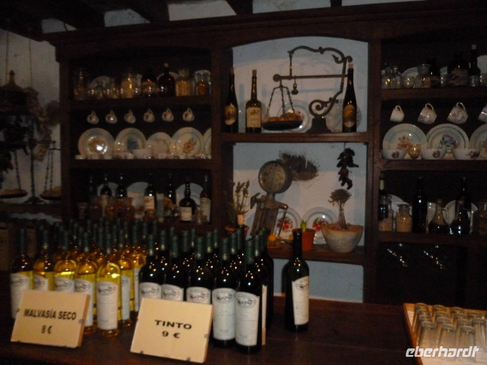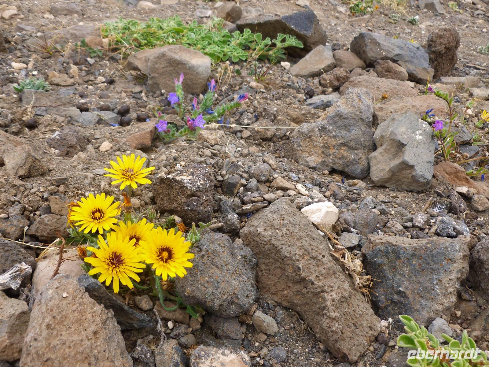 Heute konnten wir das ausgiebige Frühstück noch länger genießen, da uns Roland erst gegen 10 Uhr vom Hotel abgeholt hatte. Unser heutiger Anfangspunkt lag nur ca. 20 Minuten entfernt, oberhalb von La Asomada. Der erste Teil ging leicht bergan, immer in Richtung „Guardilama". Die Sicht war leider etwas diesig, aber dafür zeigte sich die Sonne heute wieder von ihrer besten Seite. Auch die Temperaturen waren deutlich gestiegen. Links und rechts konnten wir immer wieder die mühsam angelegten Weinfelder begutachten, die sehr akribisch von den Landsleuten gepflegt wurden. Auch Rolands Haus konnten wir von Weitem sichten. Weiter ging es nun bergauf in Richtung des Vulkanes „Guardilamas". Dort sind wir am Kraterrand oberhalb in Richtung des Vulkanes „Montana Tinasoria" gelaufen. Der Abstieg war dann stückchenweise sehr steil durch weiche, schwarze Kiesfelder in denen immer wieder bunte Blumen aufblitzten. Anschließend stiegen wir zum Tinasoria auf und machten an der Ruine Rast, um uns bei etwas Obst und einem Müsliriegel zu stärken. Zwischendurch erklärte uns Roland allerlei Wissenswertes aus dem Leben der Lanzarotener. Unser Wanderweg führte nun einmal auf und ab, bis wir unser Ziel, die Bodega „El Chupadero" in Sicht hatten. Das kleine Restaurant, das die Deutsche Barbara seit vielen Jahren betreibt, ist sehr individuell, da keine großen Gruppen abgefertigt werden. Somit konnten wir die verschiedenen Weine bei Serrano-Schinken und Ziegenkäse ganz abseits des Massentourismus genießen. Der Abschied fiel uns sichtlich schwer...