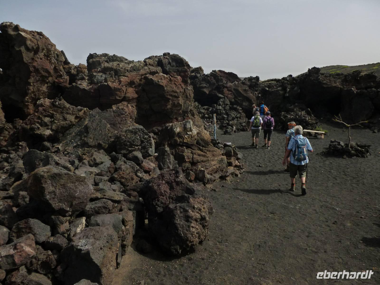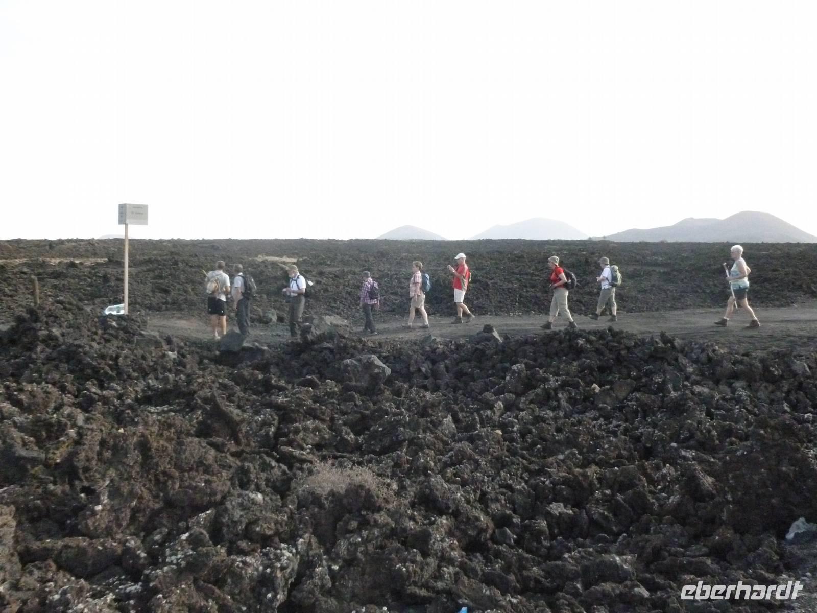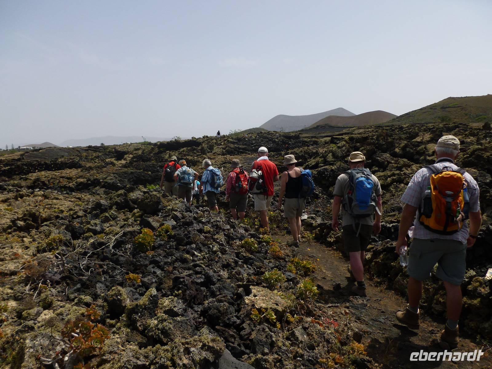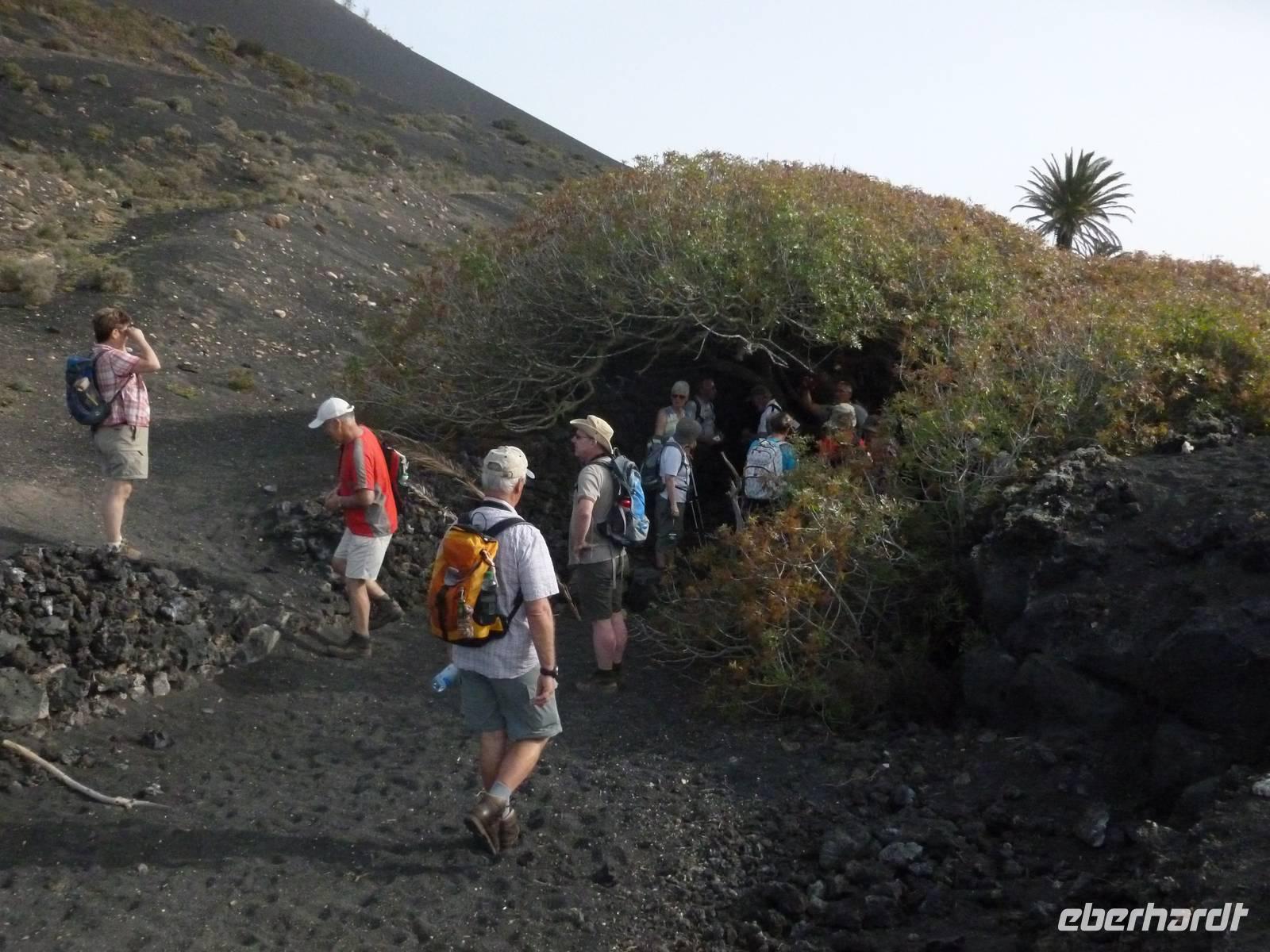 Zur heutigen letzten Wanderung hatten wir das Vulkanische Zentrum des Naturparkes „Los Volcanes" auf dem Programm. Wir fuhren mit Roland wieder in Richtung La Asomada/Masdache und starteten bei strahlend blauem Himmel durch das erstarrte Lavameer. Immer wieder konnten wir kleine grüne Pflänzchen zwischen den Lavakanälen und Vulkantunneln erspähen. Leicht hügelig zog der Weg durch die gigantische Landschaft. Zwischendurch machten wir eine erfrischende Pause in einer kühlen Höhle, in der sich mein Ziegenlikör besonders gut anbot. „Salud" - auf eine gelungene Wanderwoche! Dann konnte es auch schon weitergehen und was sich in den Lavahöhlen an Vegetation verbarg. Auch konnten wir mitten in den Lavabergen zwei spanische Arbeiter beim Schwefeln des Weines beobachten. Kurz vor dem Abschluss der Tour konnten wir nochmal auf einen kleinen Vulkan steigen, in dessen bewachsenen Krater wir hineinschauen konnten. Dann war unser Ziel in Mancha Blanca, die Kirche „Nuestra Señora de los Dolores" nicht mehr weit, die wir endlich vor stahlblauem Himmel vor die Linse bekamen. Traditionell kehrten wir zum gelungenen Abschluss ein und löschten unseren Durst bei einem kühlen Wasser, Cola oder auch Bier. Bevor wir ins Hotel zurückkehrten, nutzten einige die Gelegenheit die Hauptstadt Arrecife auf eigene Faust zu erkunden. Der Rest kühlte sich im klaren Meer ab. Am Abend genossen wir einen kanarischen Abend im Hotel. Nach einem leckeren Aperetif, konnten wir spanische Tortilla, die legendären Mojo-Soßen und leckeren Fisch verkosten. Bevor die Reise zu Ende ging, ließen wir bei einer Sangria am Meer die Wanderwoche stilvoll ausklingen. Auch Roland kam noch einmal vorbei um sich zu verabschieden und vielleicht dem ein oder anderen einen erneuten Besuch auf Lanzarote schmackhaft zu machen.
