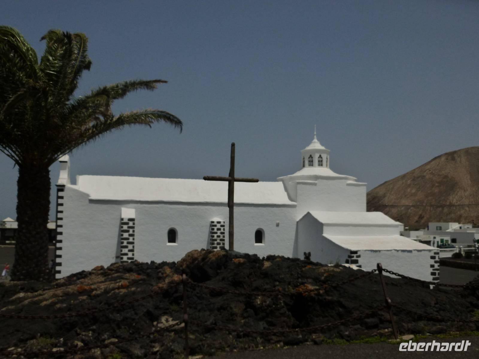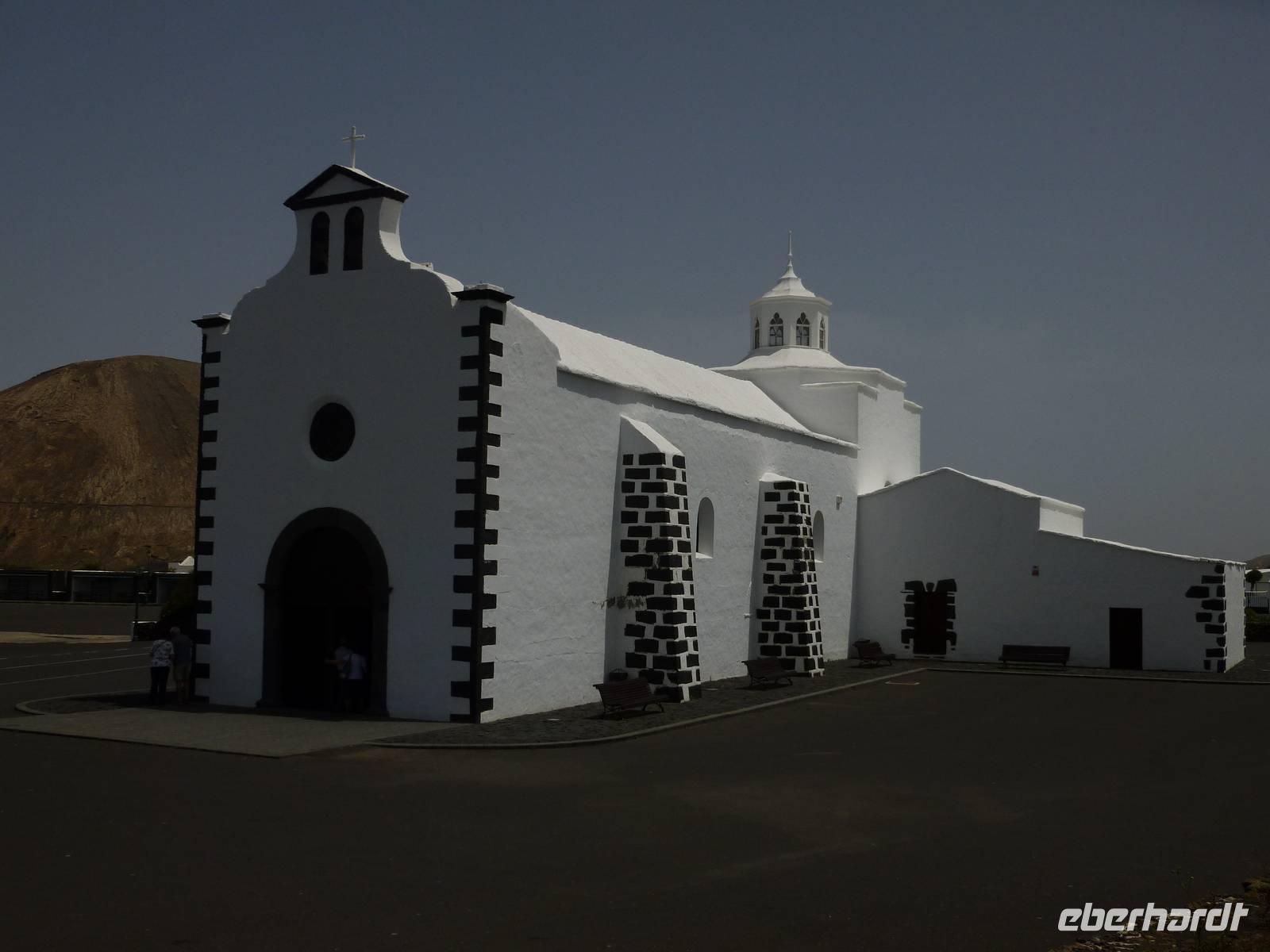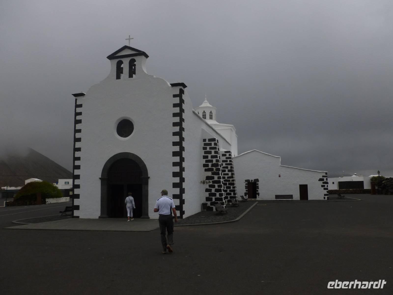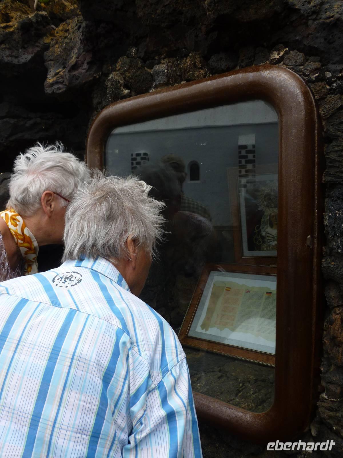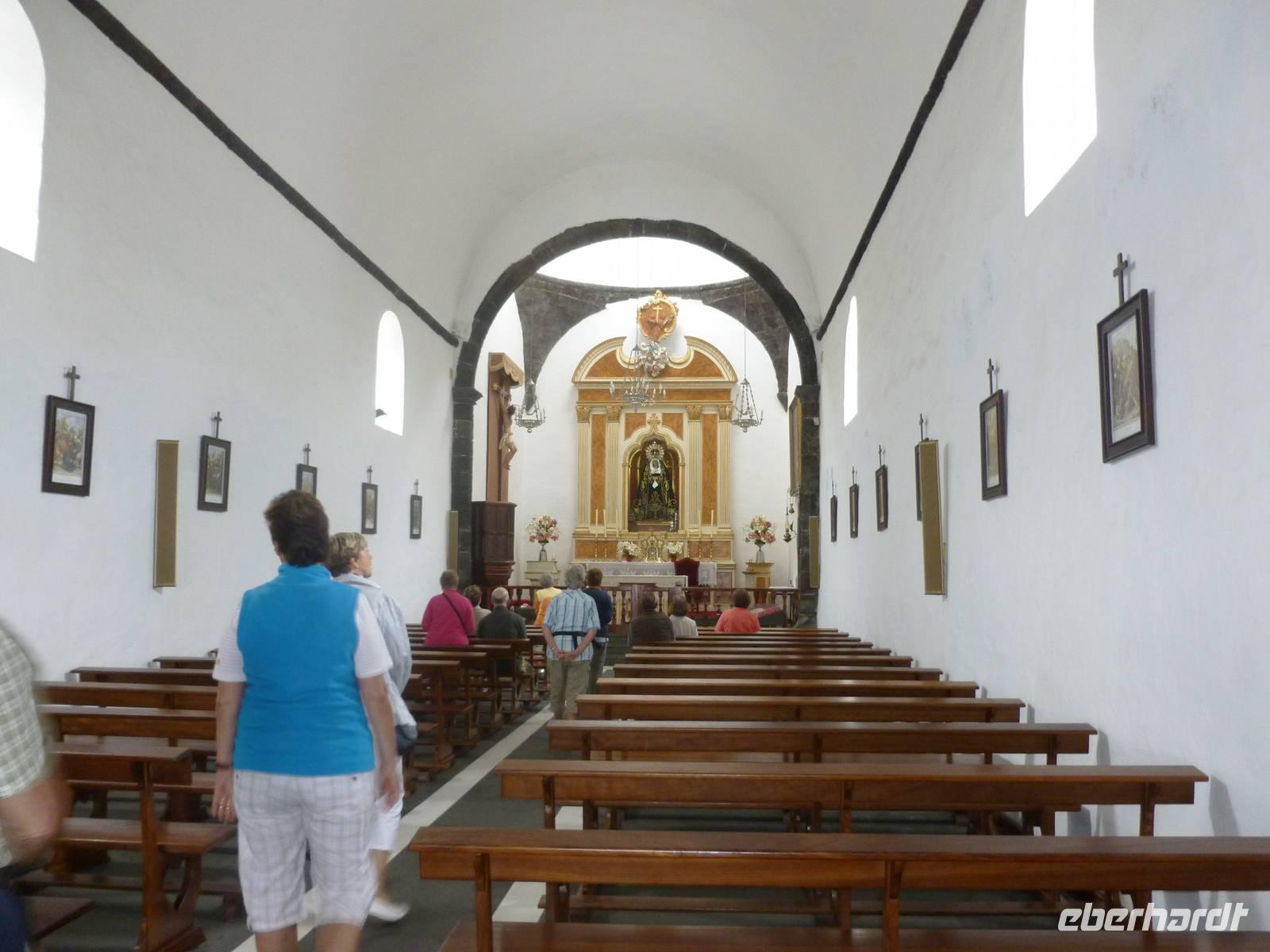 Zur heutigen letzten Wanderung hatten wir das Vulkanische Zentrum des Naturparkes „Los Volcanes" auf dem Programm. Wir fuhren mit Roland wieder in Richtung La Asomada/Masdache und starteten bei strahlend blauem Himmel durch das erstarrte Lavameer. Immer wieder konnten wir kleine grüne Pflänzchen zwischen den Lavakanälen und Vulkantunneln erspähen. Leicht hügelig zog der Weg durch die gigantische Landschaft. Zwischendurch machten wir eine erfrischende Pause in einer kühlen Höhle, in der sich mein Ziegenlikör besonders gut anbot. „Salud" - auf eine gelungene Wanderwoche! Dann konnte es auch schon weitergehen und was sich in den Lavahöhlen an Vegetation verbarg. Auch konnten wir mitten in den Lavabergen zwei spanische Arbeiter beim Schwefeln des Weines beobachten. Kurz vor dem Abschluss der Tour konnten wir nochmal auf einen kleinen Vulkan steigen, in dessen bewachsenen Krater wir hineinschauen konnten. Dann war unser Ziel in Mancha Blanca, die Kirche „Nuestra Señora de los Dolores" nicht mehr weit, die wir endlich vor stahlblauem Himmel vor die Linse bekamen. Traditionell kehrten wir zum gelungenen Abschluss ein und löschten unseren Durst bei einem kühlen Wasser, Cola oder auch Bier. Bevor wir ins Hotel zurückkehrten, nutzten einige die Gelegenheit die Hauptstadt Arrecife auf eigene Faust zu erkunden. Der Rest kühlte sich im klaren Meer ab. Am Abend genossen wir einen kanarischen Abend im Hotel. Nach einem leckeren Aperetif, konnten wir spanische Tortilla, die legendären Mojo-Soßen und leckeren Fisch verkosten. Bevor die Reise zu Ende ging, ließen wir bei einer Sangria am Meer die Wanderwoche stilvoll ausklingen. Auch Roland kam noch einmal vorbei um sich zu verabschieden und vielleicht dem ein oder anderen einen erneuten Besuch auf Lanzarote schmackhaft zu machen.