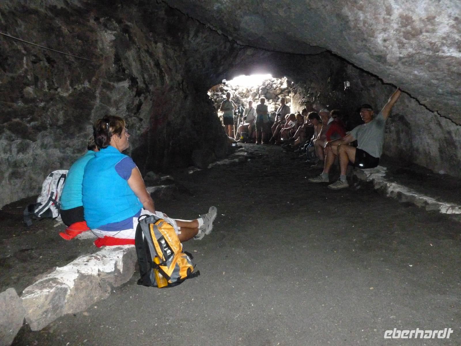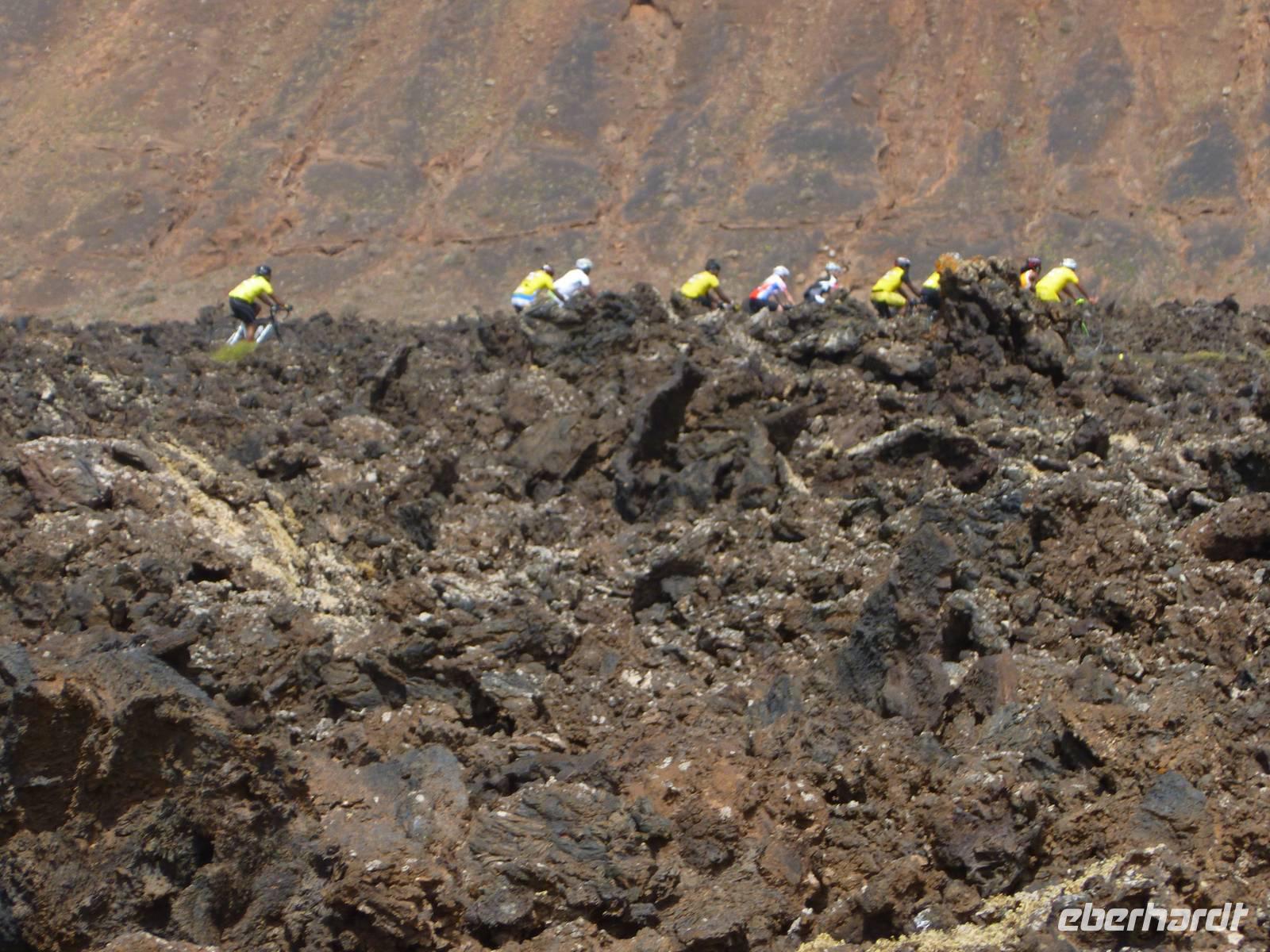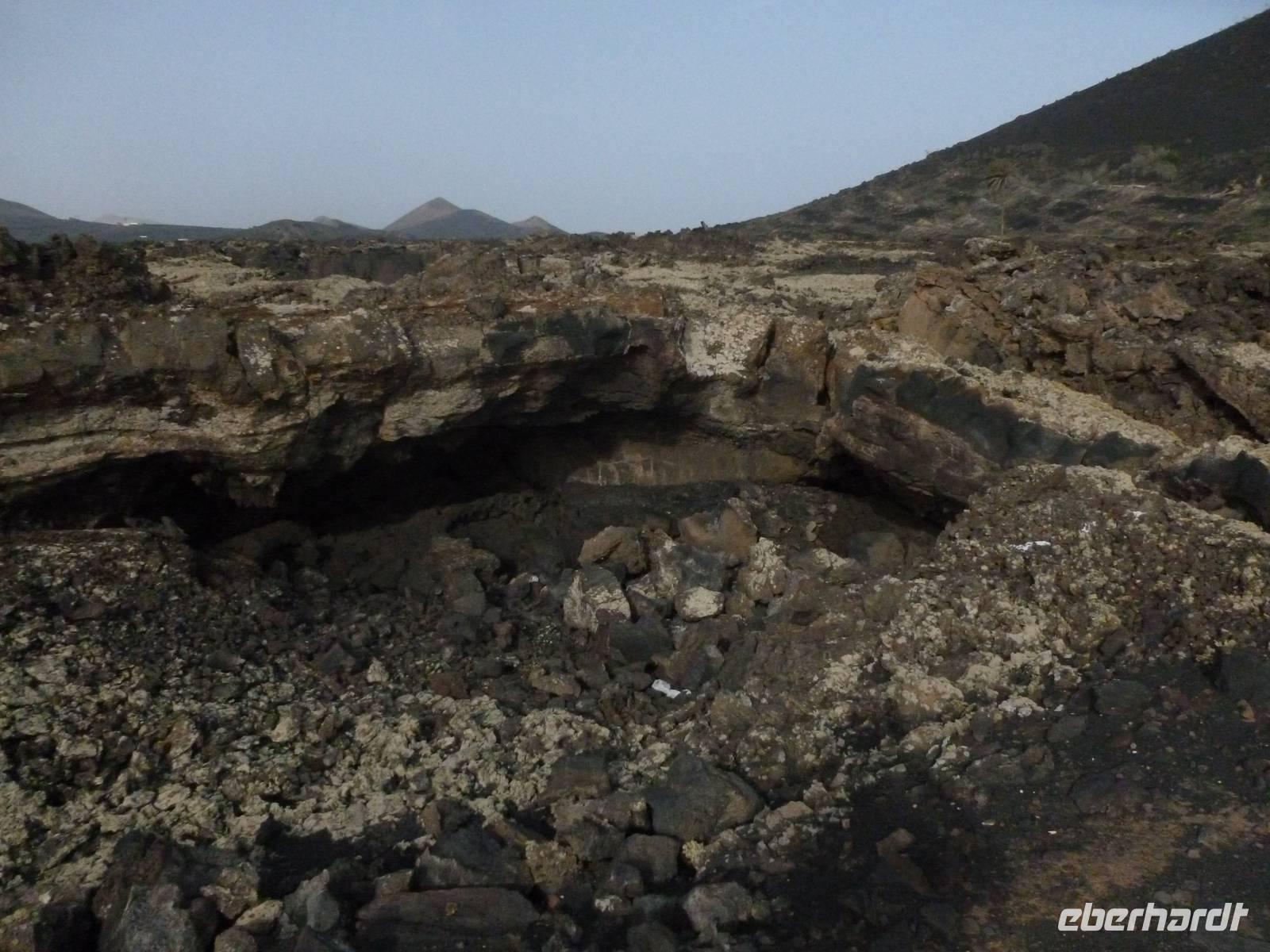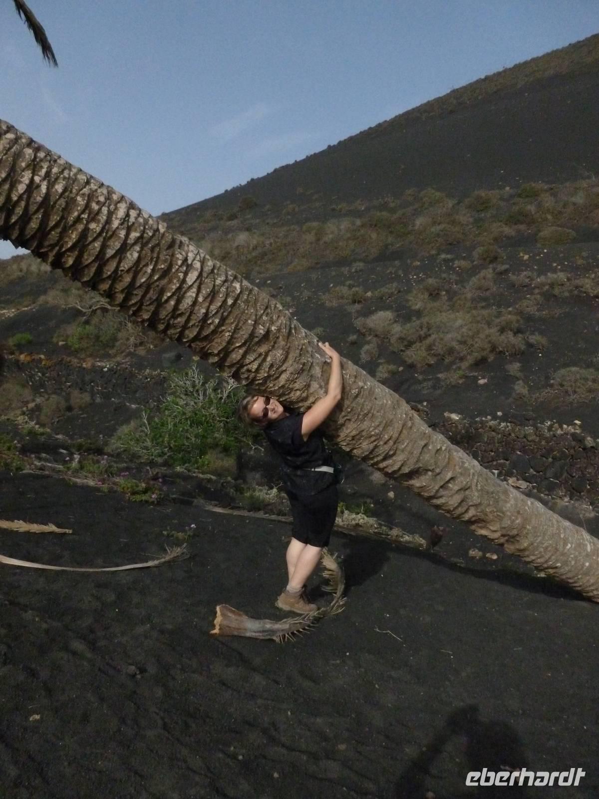 Zur heutigen letzten Wanderung hatten wir das Vulkanische Zentrum des Naturparkes „Los Volcanes" auf dem Programm. Wir fuhren mit Roland wieder in Richtung La Asomada/Masdache und starteten bei strahlend blauem Himmel durch das erstarrte Lavameer. Immer wieder konnten wir kleine grüne Pflänzchen zwischen den Lavakanälen und Vulkantunneln erspähen. Leicht hügelig zog der Weg durch die gigantische Landschaft. Zwischendurch machten wir eine erfrischende Pause in einer kühlen Höhle, in der sich mein Ziegenlikör besonders gut anbot. „Salud" - auf eine gelungene Wanderwoche! Dann konnte es auch schon weitergehen und was sich in den Lavahöhlen an Vegetation verbarg. Auch konnten wir mitten in den Lavabergen zwei spanische Arbeiter beim Schwefeln des Weines beobachten. Kurz vor dem Abschluss der Tour konnten wir nochmal auf einen kleinen Vulkan steigen, in dessen bewachsenen Krater wir hineinschauen konnten. Dann war unser Ziel in Mancha Blanca, die Kirche „Nuestra Señora de los Dolores" nicht mehr weit, die wir endlich vor stahlblauem Himmel vor die Linse bekamen. Traditionell kehrten wir zum gelungenen Abschluss ein und löschten unseren Durst bei einem kühlen Wasser, Cola oder auch Bier. Bevor wir ins Hotel zurückkehrten, nutzten einige die Gelegenheit die Hauptstadt Arrecife auf eigene Faust zu erkunden. Der Rest kühlte sich im klaren Meer ab. Am Abend genossen wir einen kanarischen Abend im Hotel. Nach einem leckeren Aperetif, konnten wir spanische Tortilla, die legendären Mojo-Soßen und leckeren Fisch verkosten. Bevor die Reise zu Ende ging, ließen wir bei einer Sangria am Meer die Wanderwoche stilvoll ausklingen. Auch Roland kam noch einmal vorbei um sich zu verabschieden und vielleicht dem ein oder anderen einen erneuten Besuch auf Lanzarote schmackhaft zu machen.