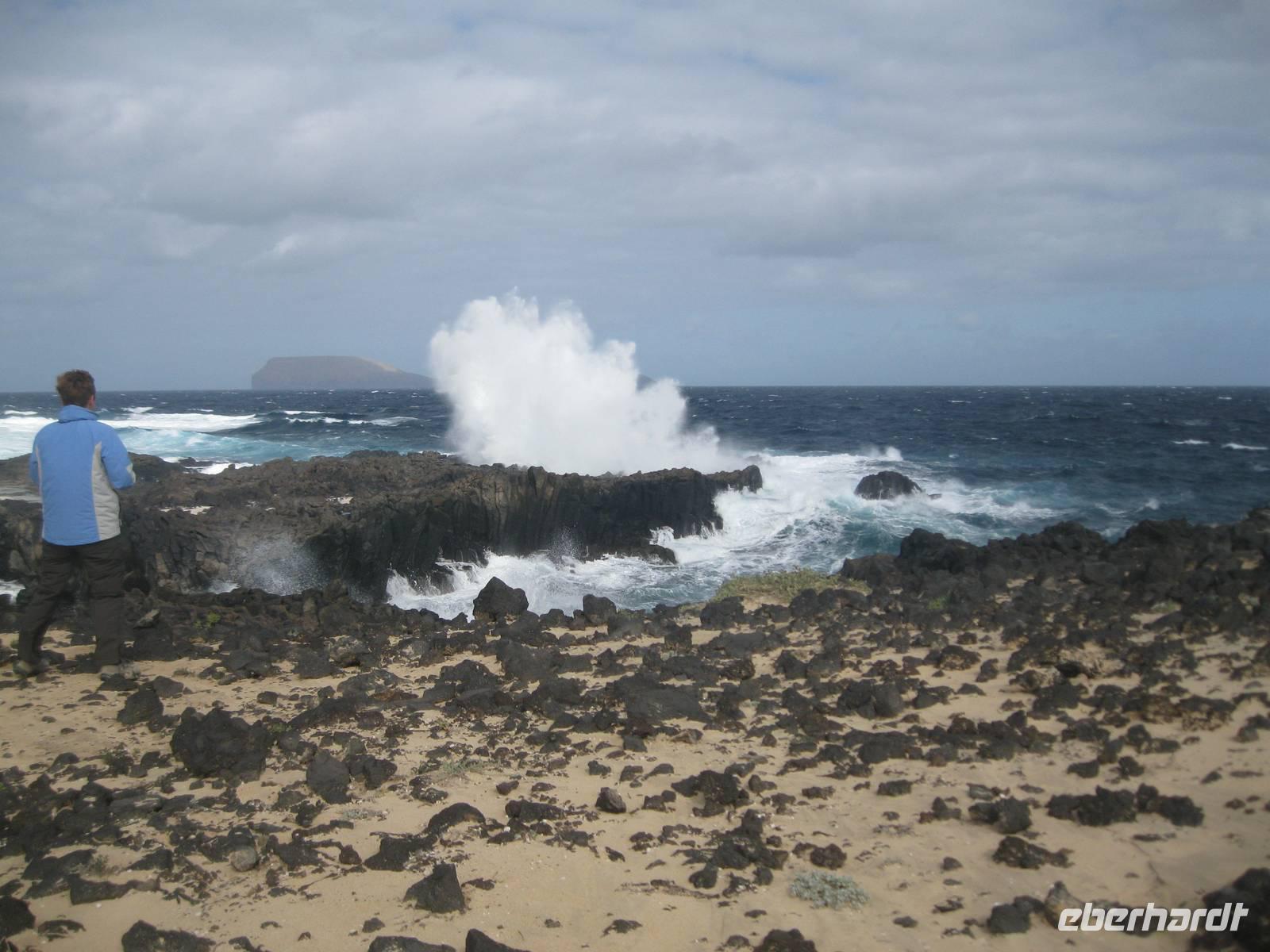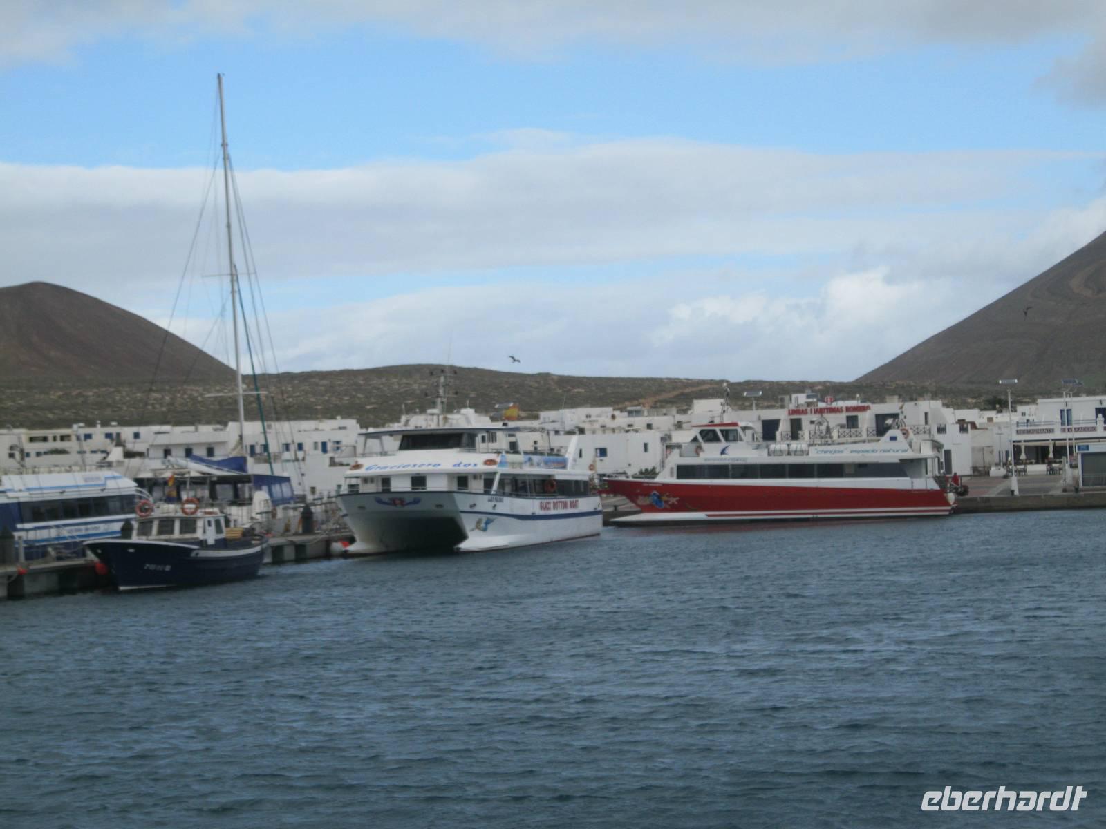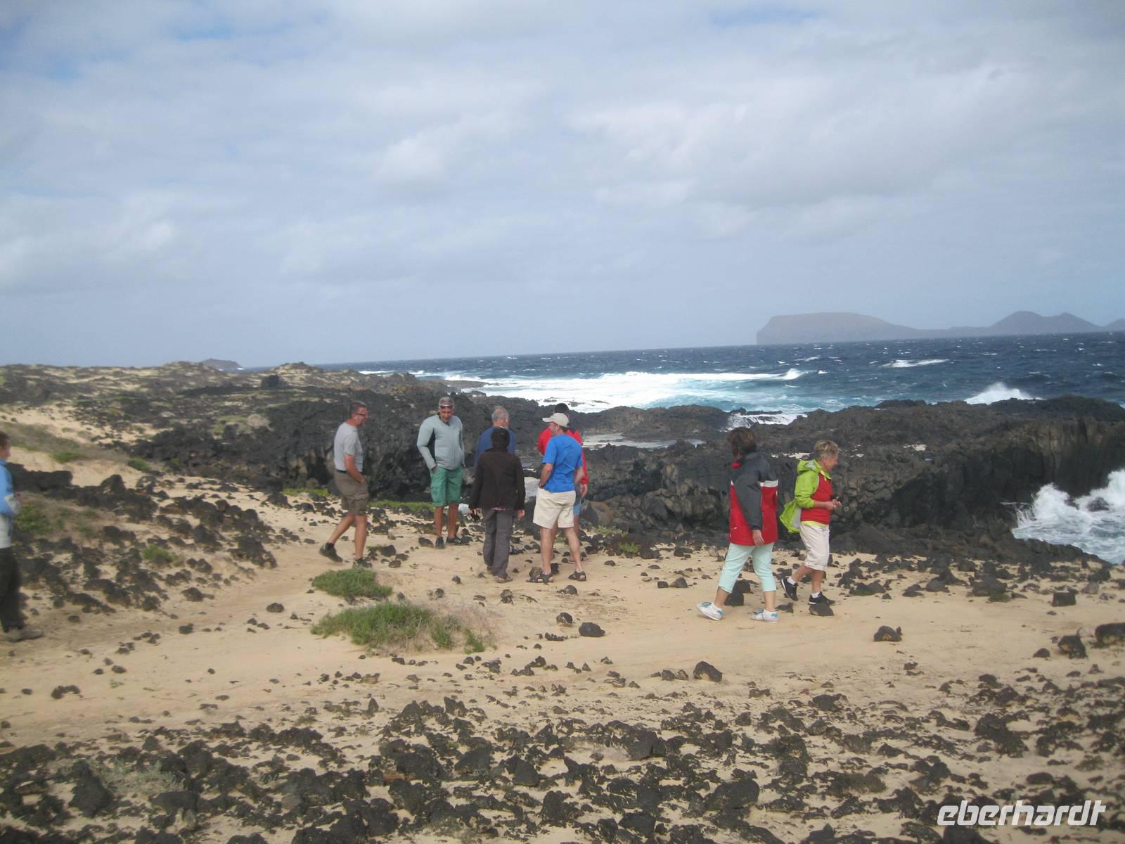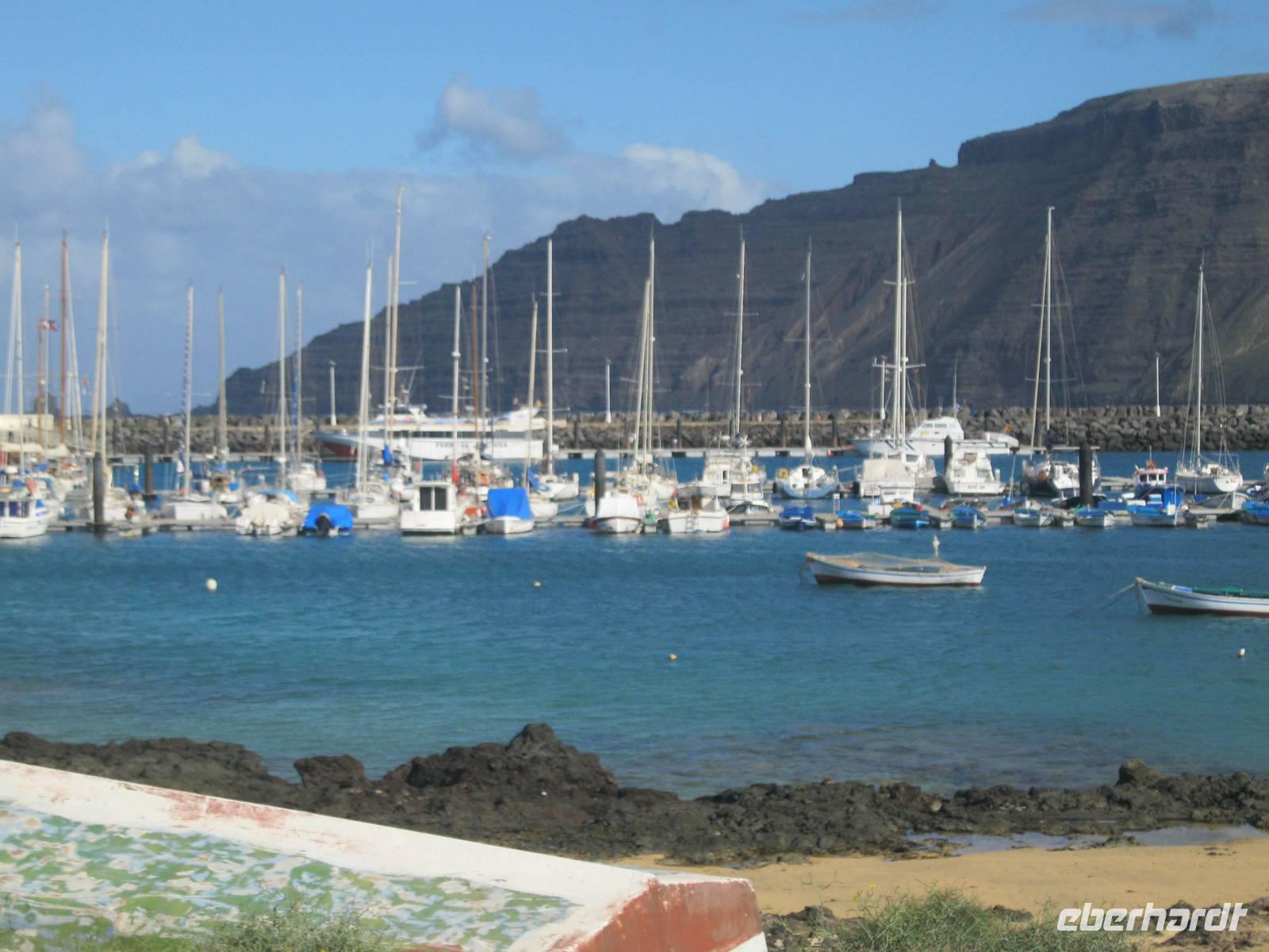 Der heutige Tag begann etwas früher.Wir wollten pünktlich am Fährhafen von Orzola sein und unser Schiff nach Isla Graciosa "entern".Der Atlantik war sehr stürmisch und wir redeten unseren Mägen gut zu.Eigentlich waren wir ja gut behütet.Mit uns im Boot saßen einige Nonnen die, während der Überfahrt, pausenlos den Rosenkranz beteten.Im El Rio wurde die See auch wieder ruhiger u. wir konnten die Einfahrt in den Hafen genießen.Da es zu regnen anfing ,begaben wir uns sofort auf Jeepsafari.Am Fuße des Montana Pedro Barba ging es entlang zum, eigentlich nur noch aus Ferienhäusern bestehenden, Ort Petro Barba.Weiter ging es zur Steilküste die durch die starke Brandung geformt wurde.Unterhalb des Montana Bermeja breiten sich unendlich lange Stände aus und verlocken zum baden.Aber Vorsicht !die Playa de las Conchas ist kreuzgefährlich u.große Warntafeln weisen darauf hin.Wir suchten uns eine ruhige Bucht, mit schönem Sandstrand, zum baden aus-Bahia del Salado.Leider war das Wasser weit draußen und unsere Füße verstanden nun ,daß die Insel aus dem Vulkangestein des Meeres entstanden war.Zurück in der "Inselhauptstadt"versorgten wir uns den Schlüssel zur Fischerkirche Virgen del Mar.Sie ist mit typischen Fischerutensilien, wir Steuerrad als Kanzel ,Schiffsrumpf als Altar,Fischen als Kerzenständer oder Muscheln als Stühle,ausgestattet.Auf der Insel solles die besten Fichrestaurants geben u.dies wollten wir nun probieren.Direkt am Hafen,im Casa Chano,war eine Tafel für uns vorbereite u. wir ließen uns die Köstlichkeiten des Meeres schmecken.Leider wurde es immer kälter u.wir mußten ja auch unsere abenteuerliche Fährüberfahrt nach Lanzarote antreten.Alles in allem ein wirklich gelungener Tag.