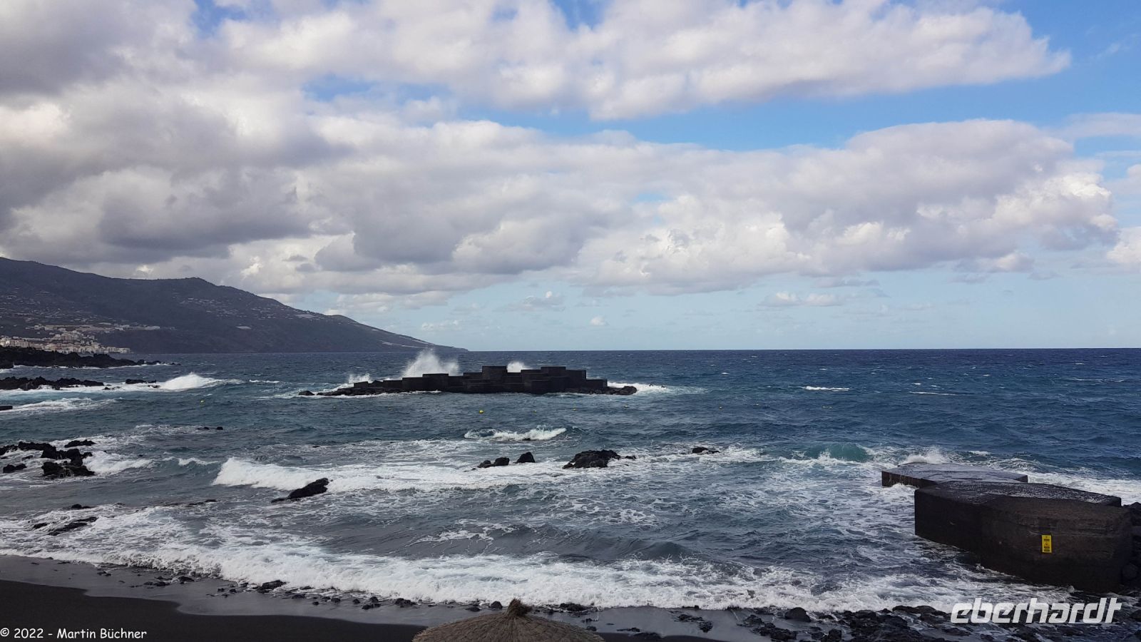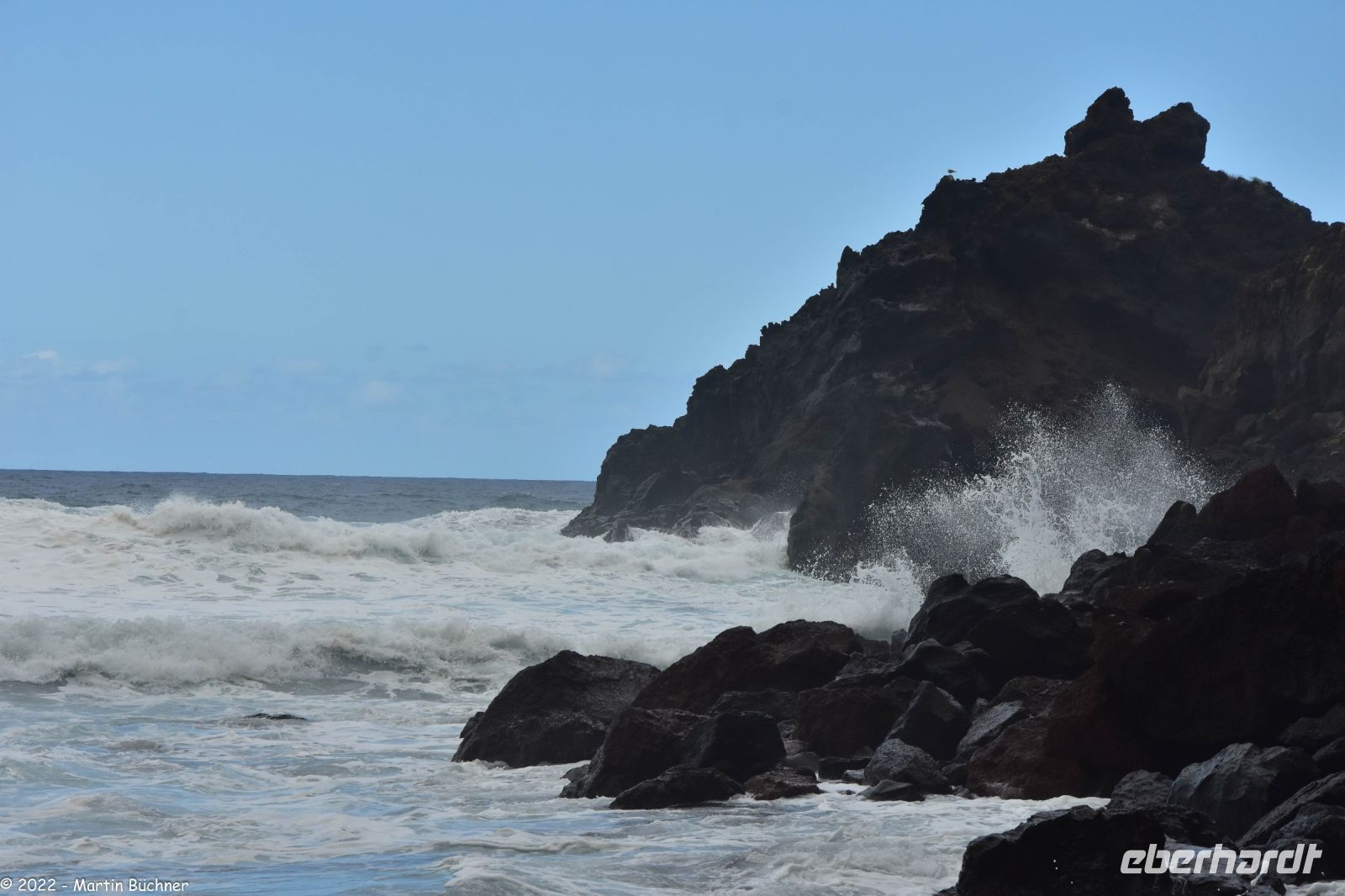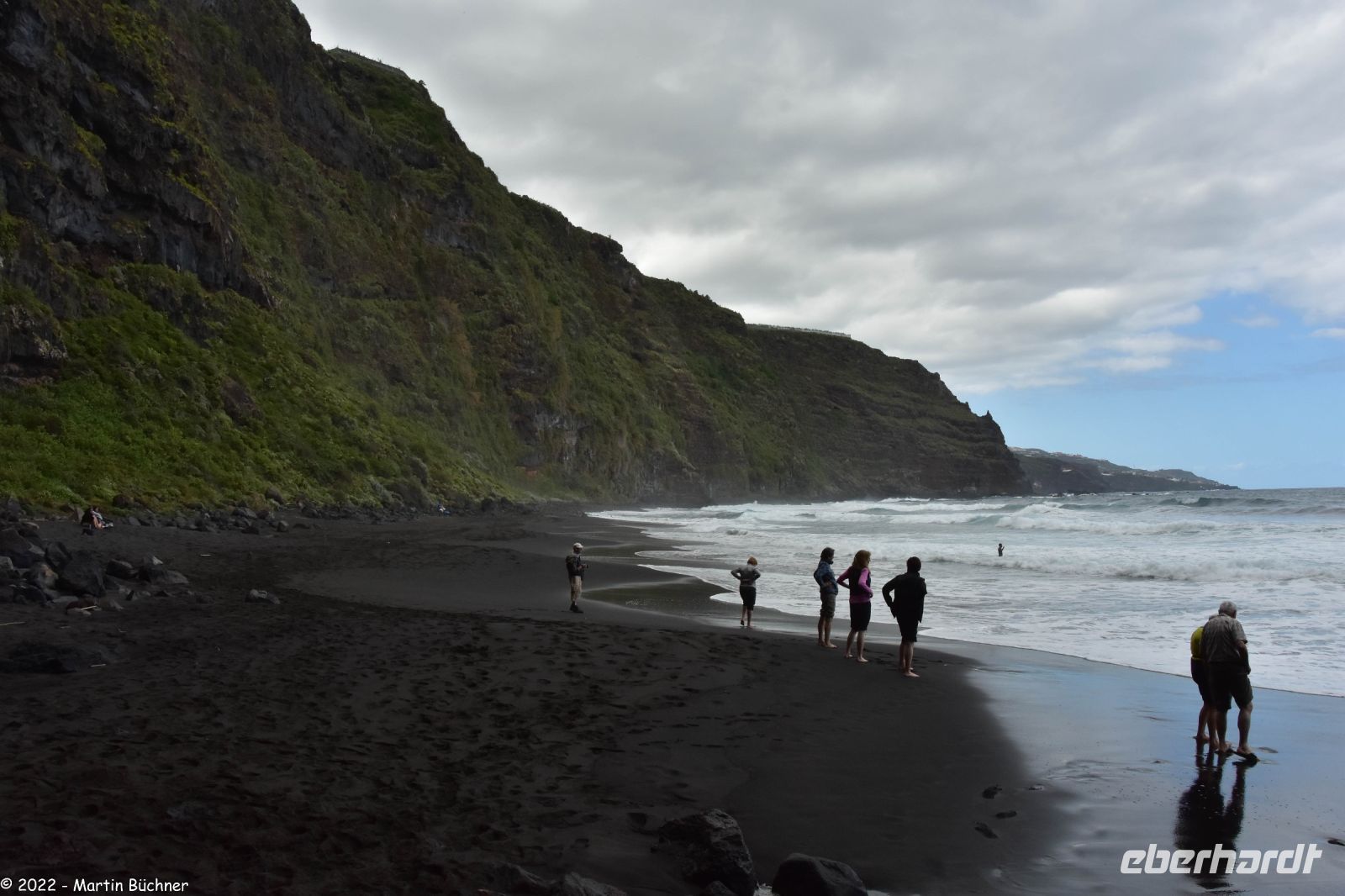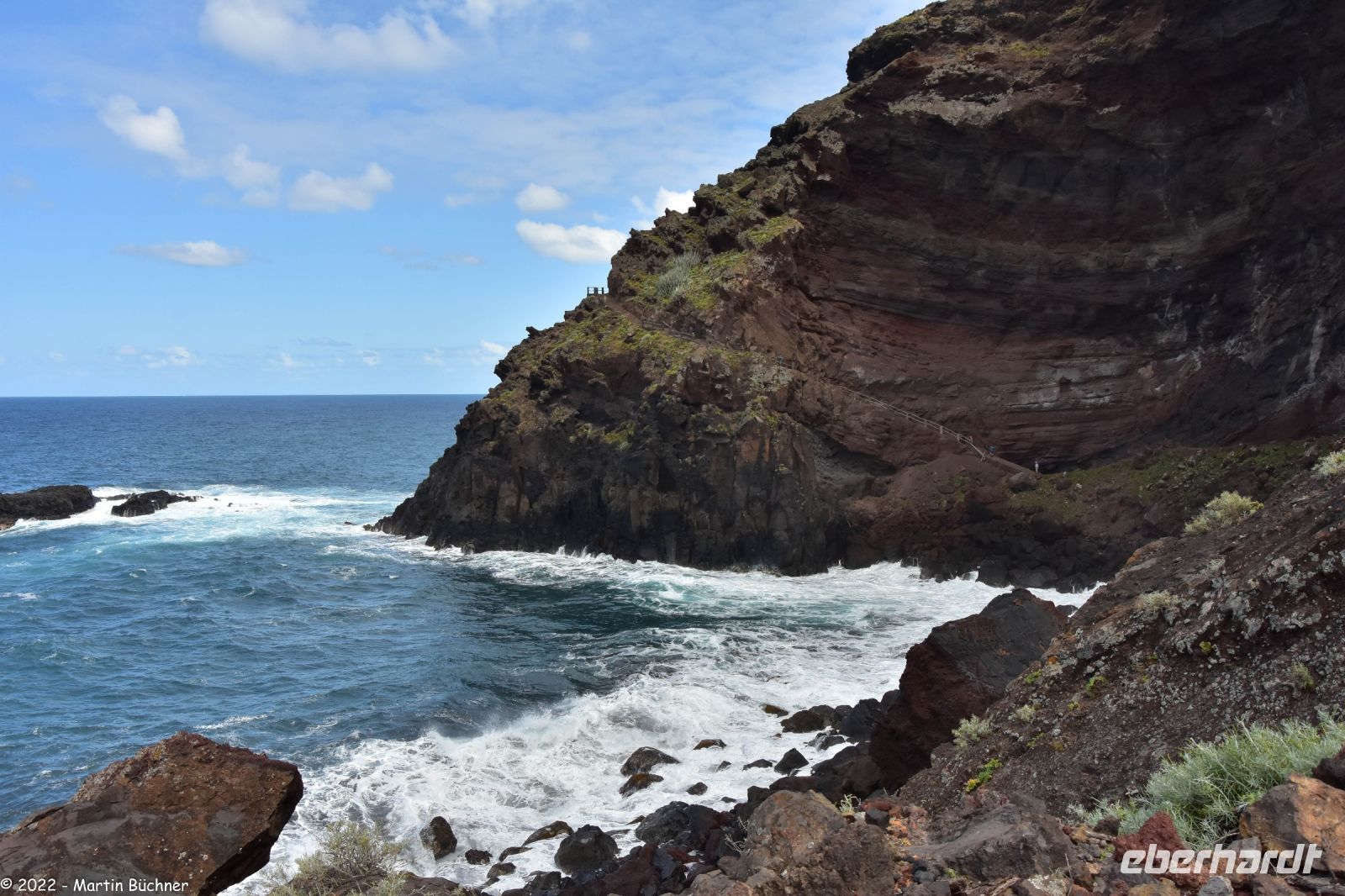 Gemeinsam entscheiden wir uns für einen Besuch des Strandes „Playa de Nogales“. An dieser Steilküste mit schmalen einsamen schwarzen Sandstränden treffen die Elemente aufeinander. Steilküste durch Vulkane geschaffen, durch Meerwasser aufgesprengt und durch Wind und Brandung geformt. Der Zustieg zum Strand erfolgt über eine steile Treppe.