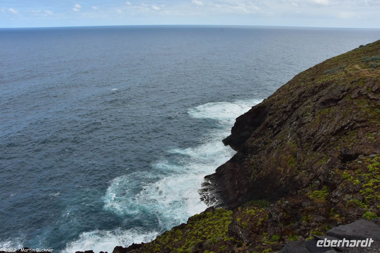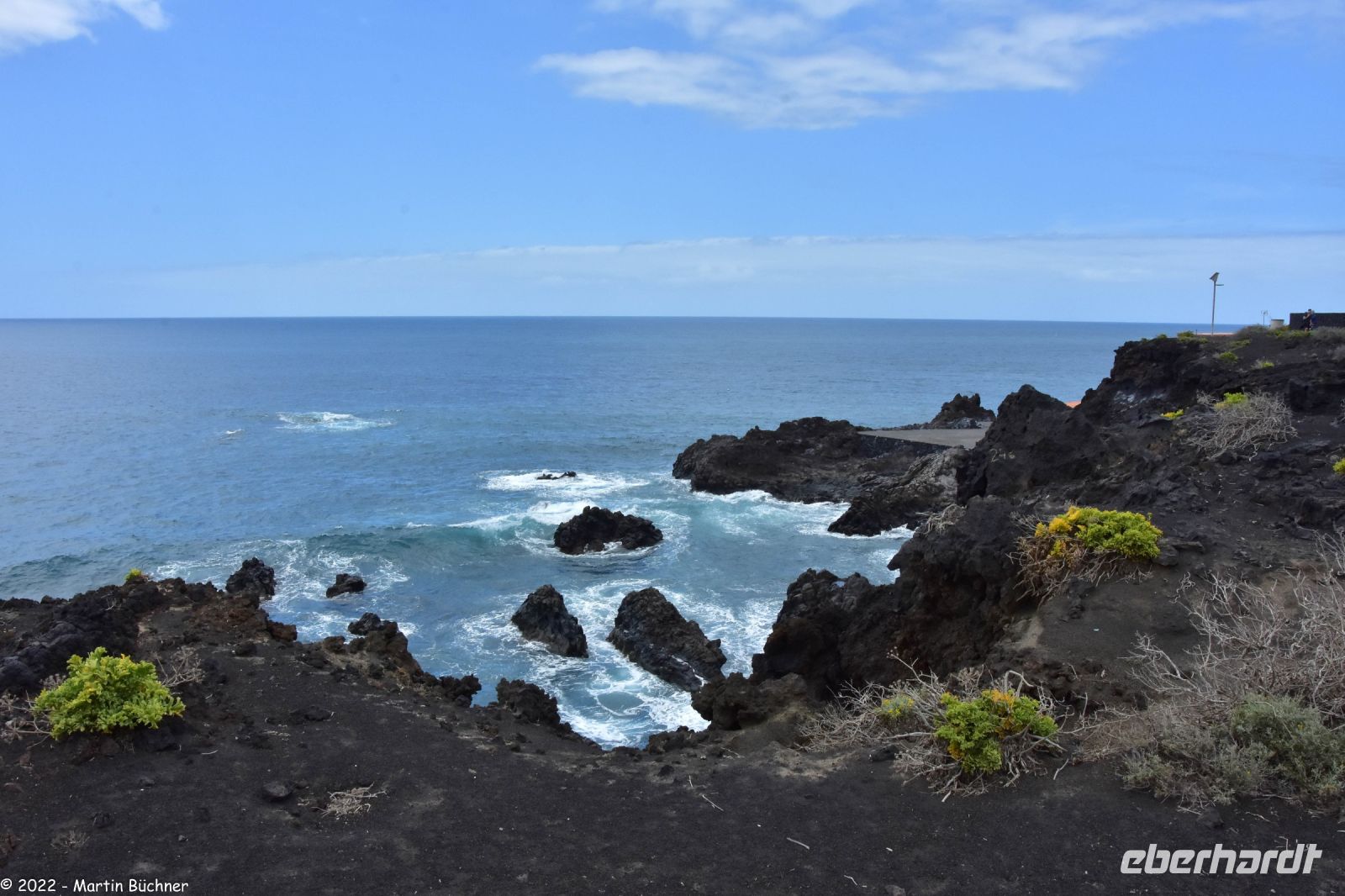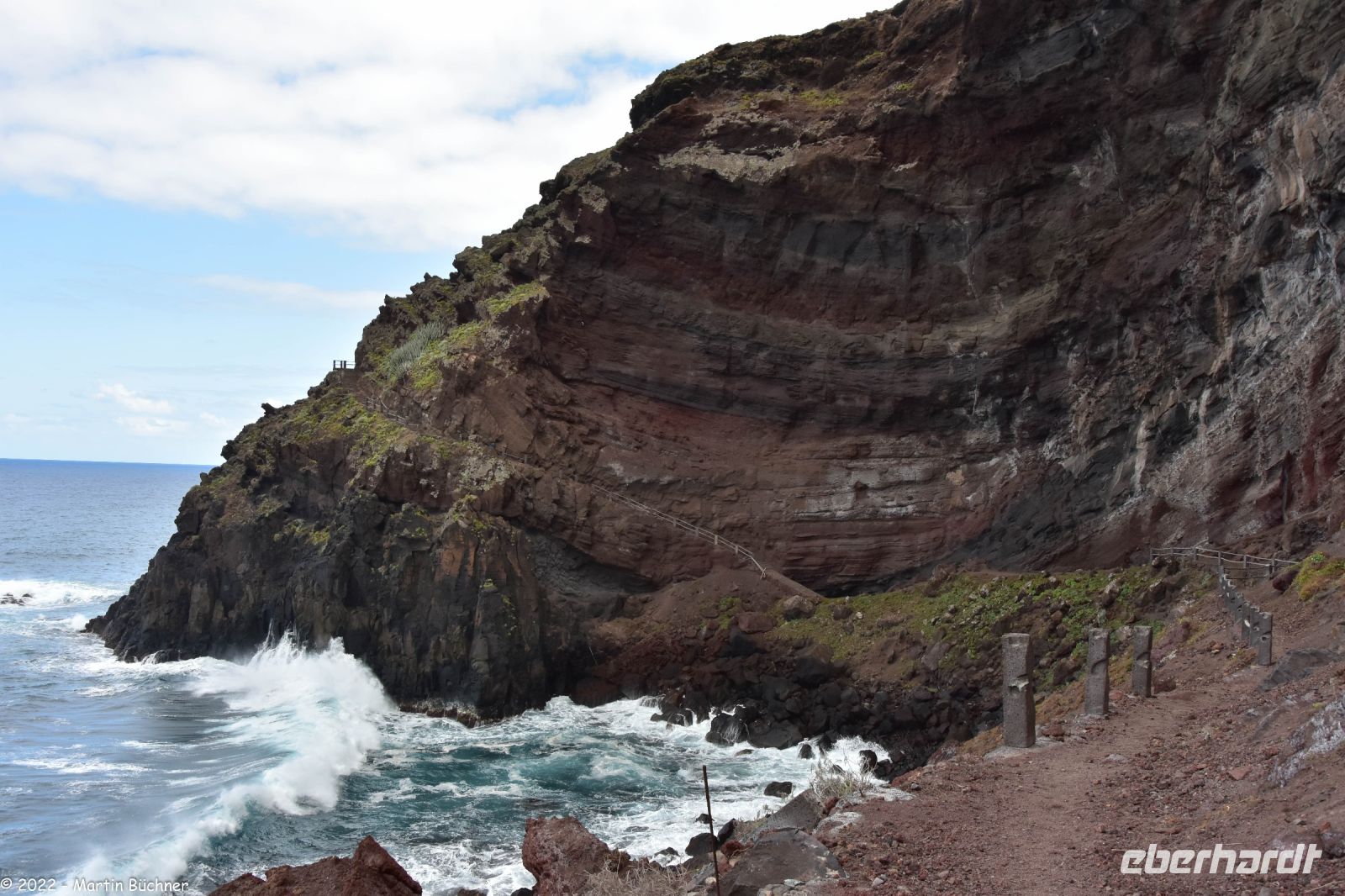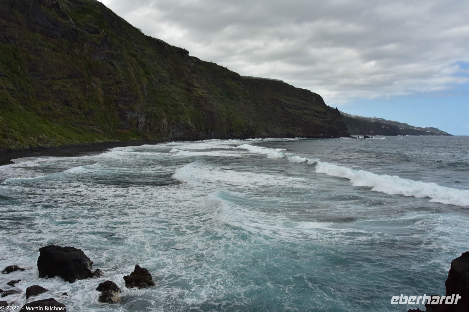 Gemeinsam entscheiden wir uns für einen Besuch des Strandes „Playa de Nogales“. An dieser Steilküste mit schmalen einsamen schwarzen Sandstränden treffen die Elemente aufeinander. Steilküste durch Vulkane geschaffen, durch Meerwasser aufgesprengt und durch Wind und Brandung geformt. Der Zustieg zum Strand erfolgt über eine steile Treppe.