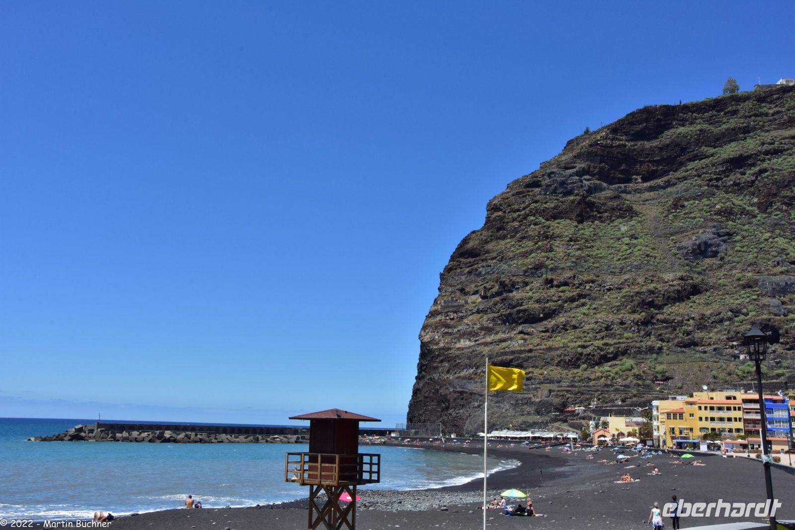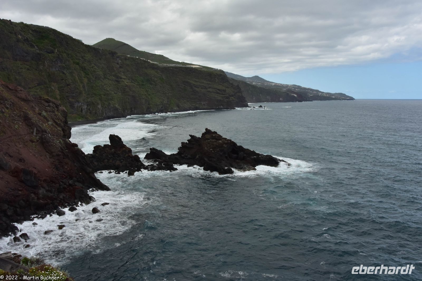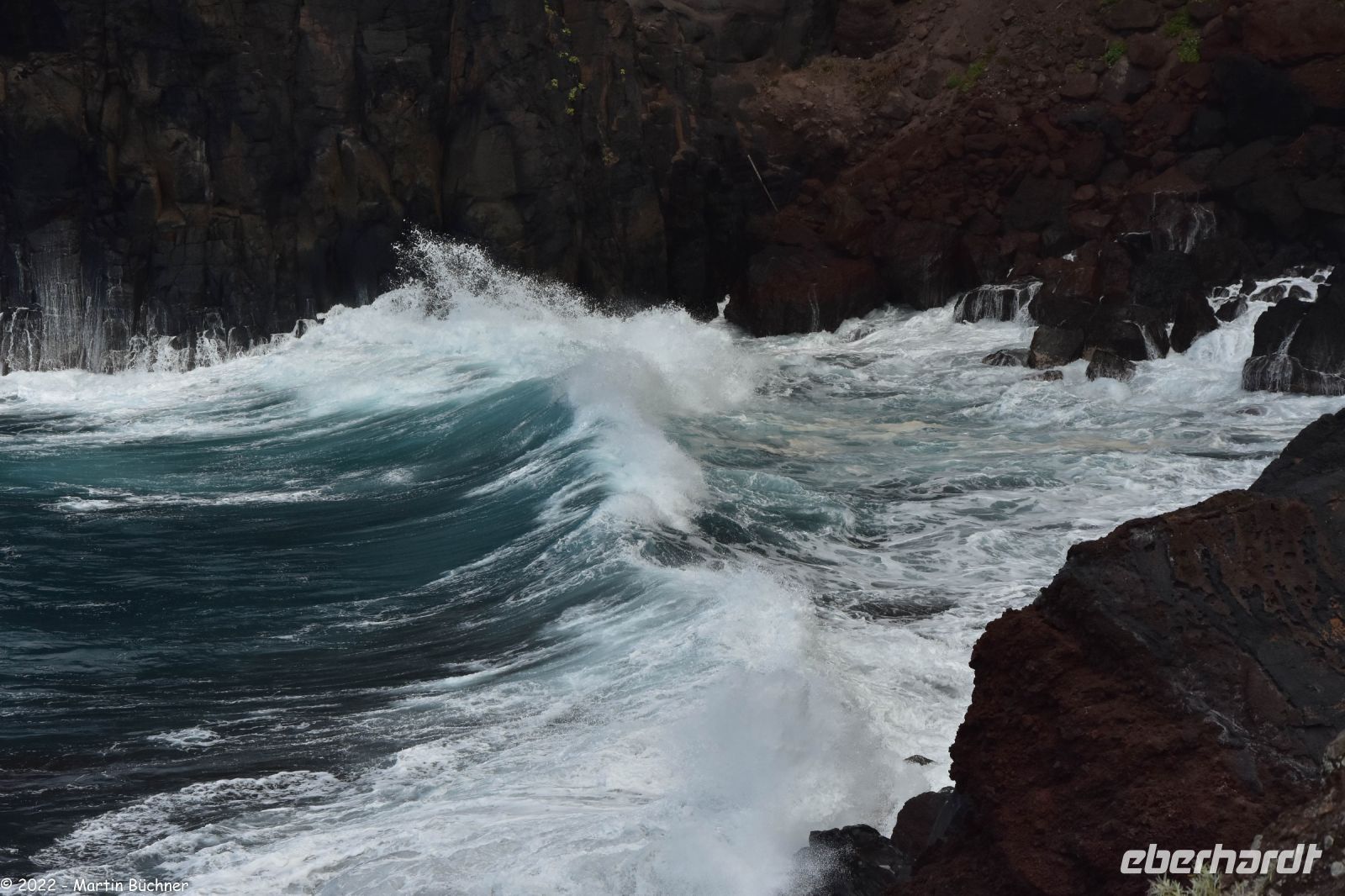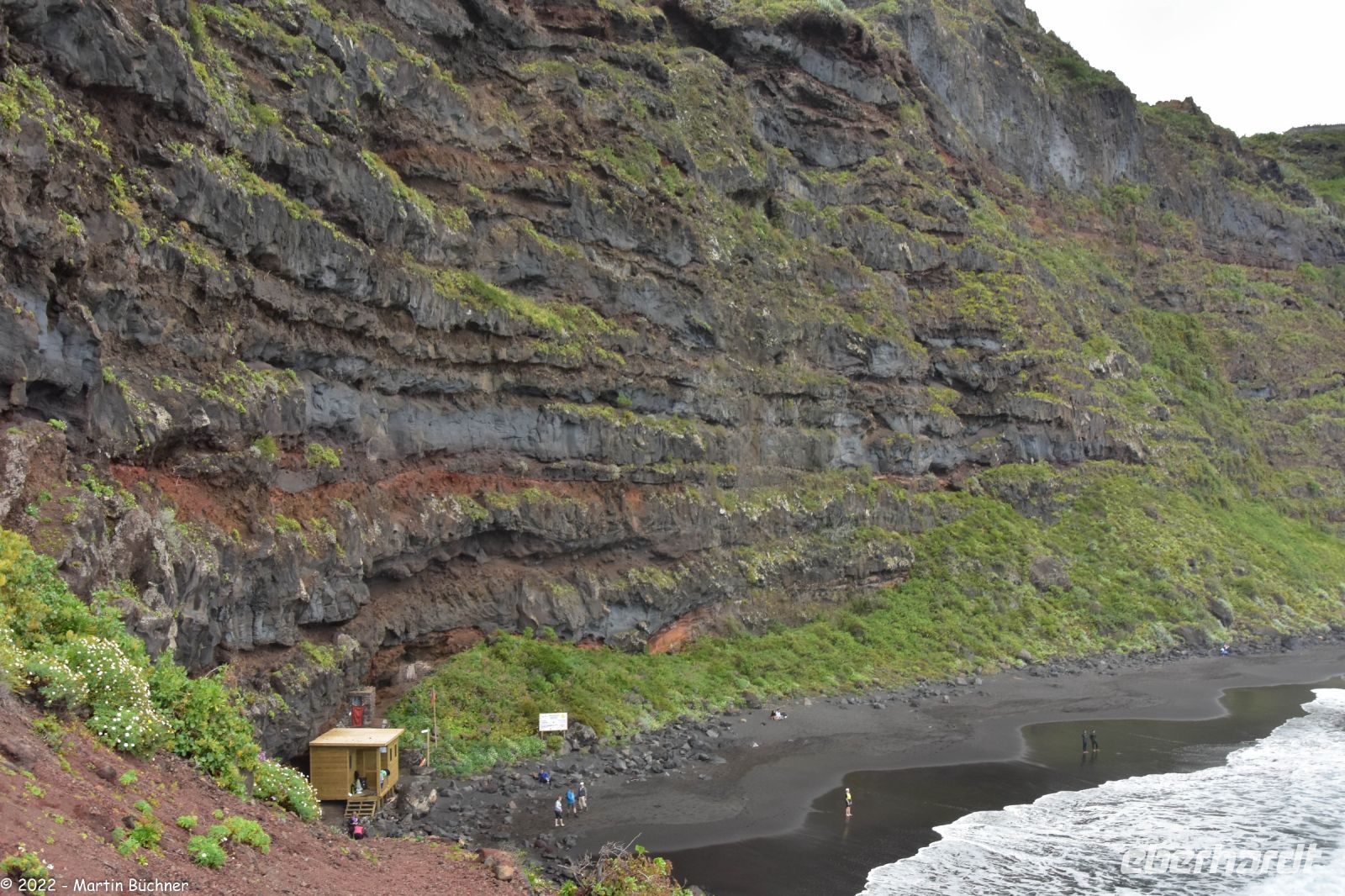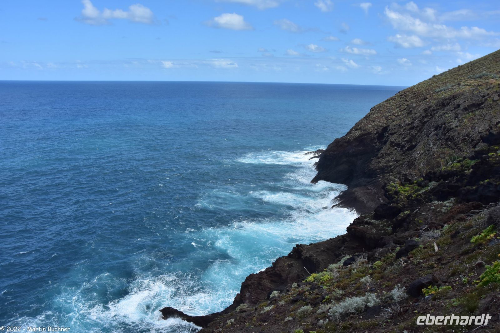 Gemeinsam entscheiden wir uns für einen Besuch des Strandes „Playa de Nogales“. An dieser Steilküste mit schmalen einsamen schwarzen Sandstränden treffen die Elemente aufeinander. Steilküste durch Vulkane geschaffen, durch Meerwasser aufgesprengt und durch Wind und Brandung geformt. Der Zustieg zum Strand erfolgt über eine steile Treppe.