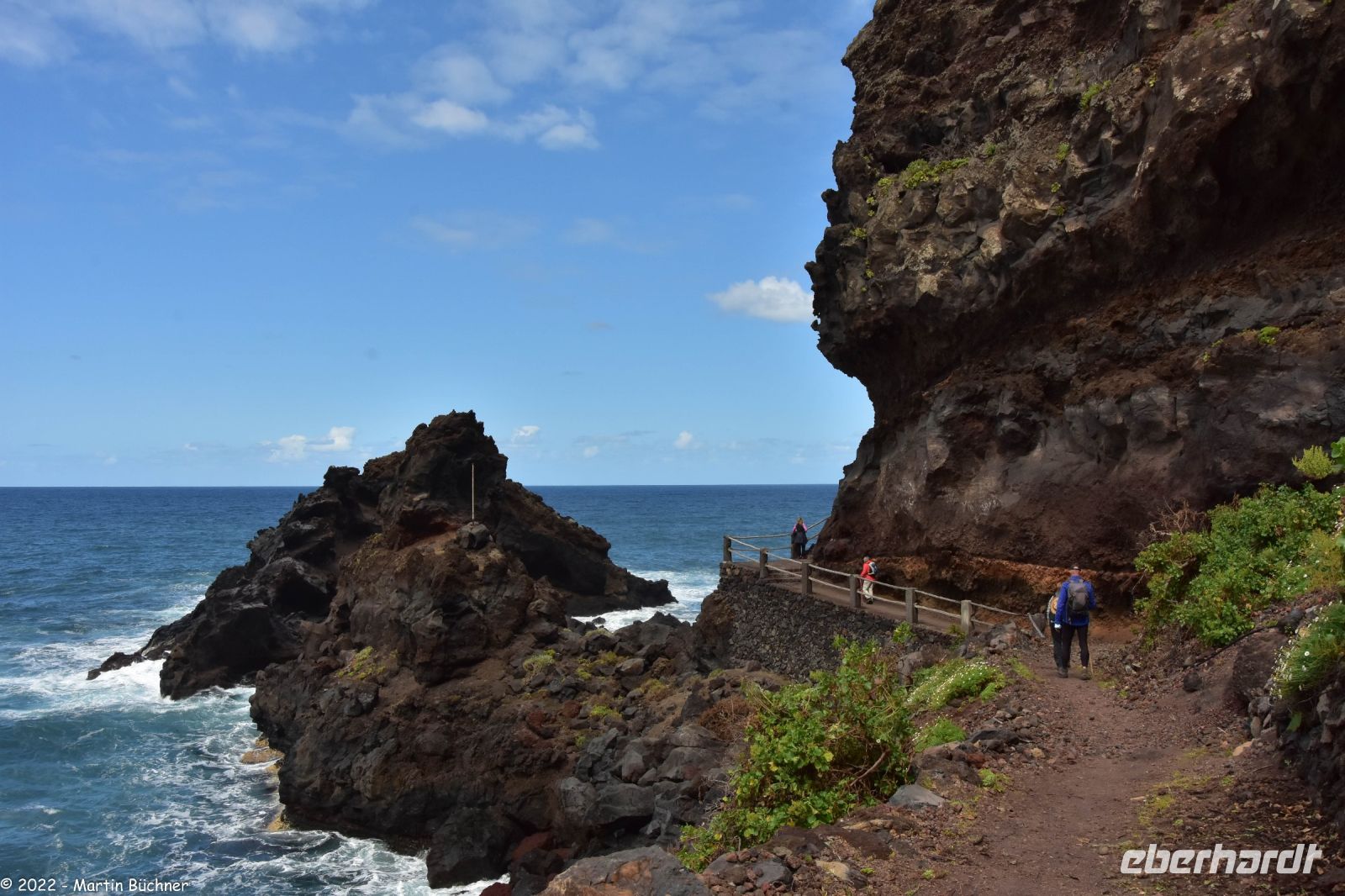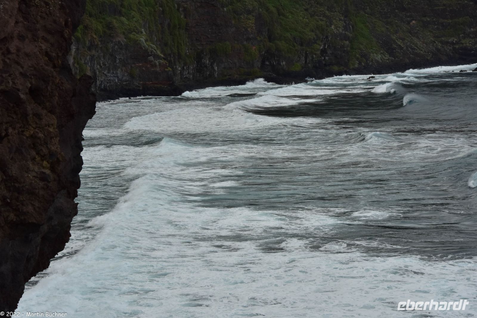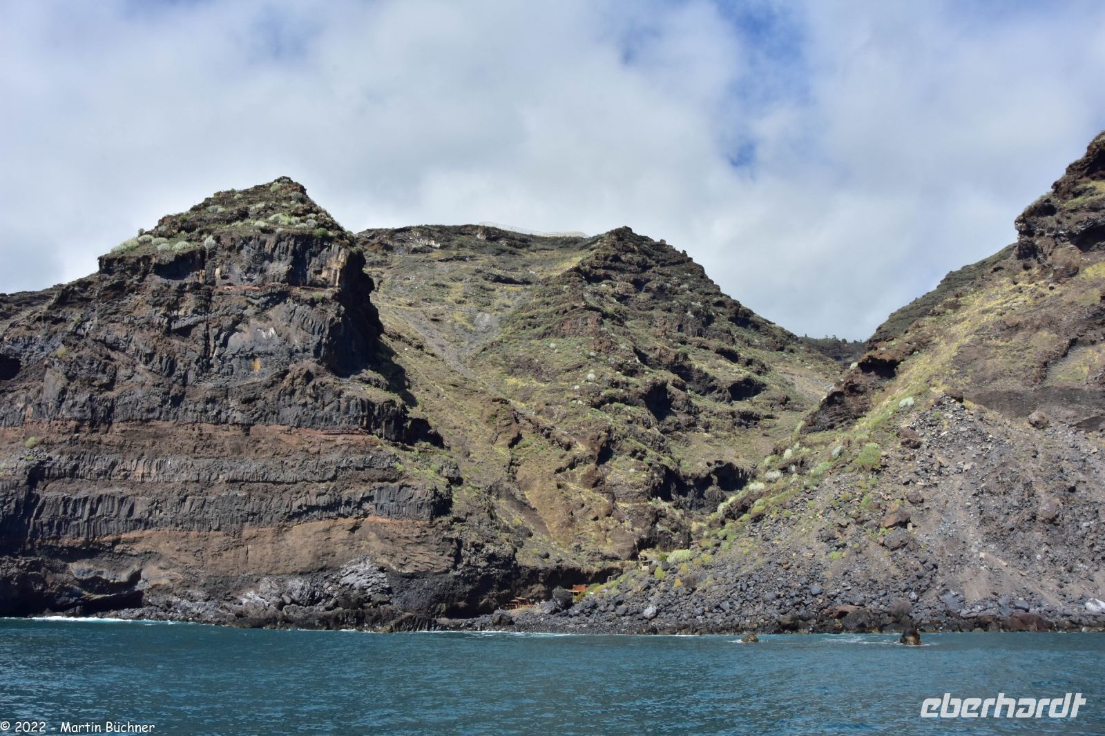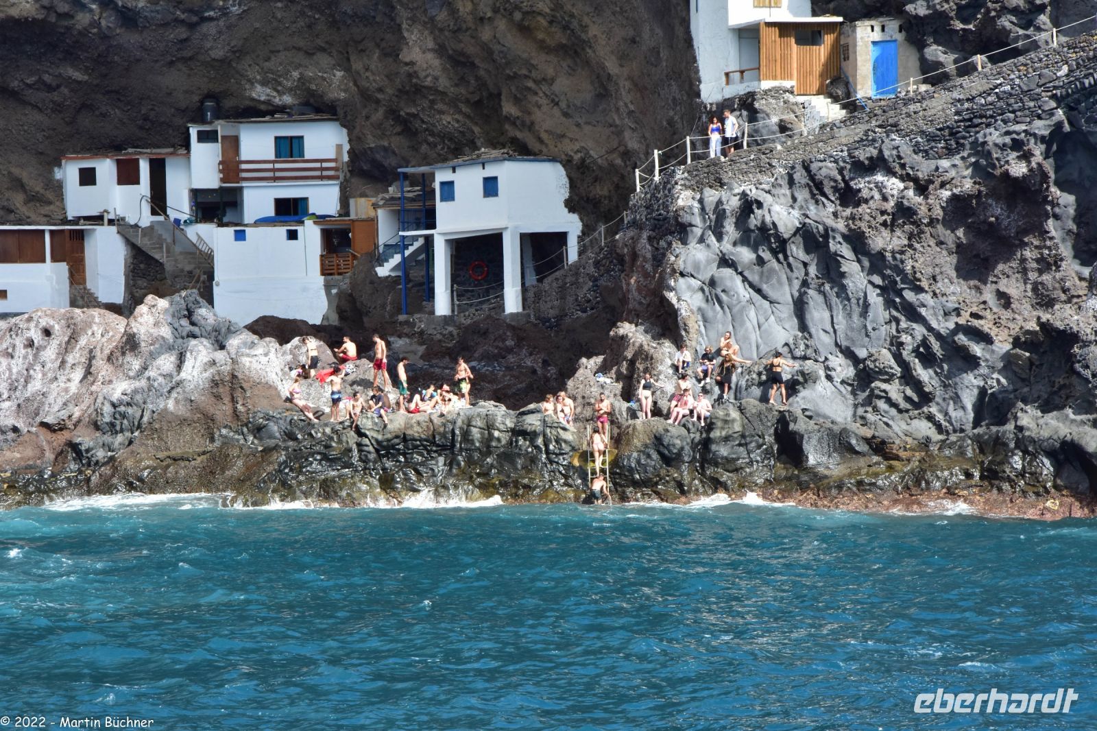 Gemeinsam entscheiden wir uns für einen Besuch des Strandes „Playa de Nogales“. An dieser Steilküste mit schmalen einsamen schwarzen Sandstränden treffen die Elemente aufeinander. Steilküste durch Vulkane geschaffen, durch Meerwasser aufgesprengt und durch Wind und Brandung geformt. Der Zustieg zum Strand erfolgt über eine steile Treppe.
