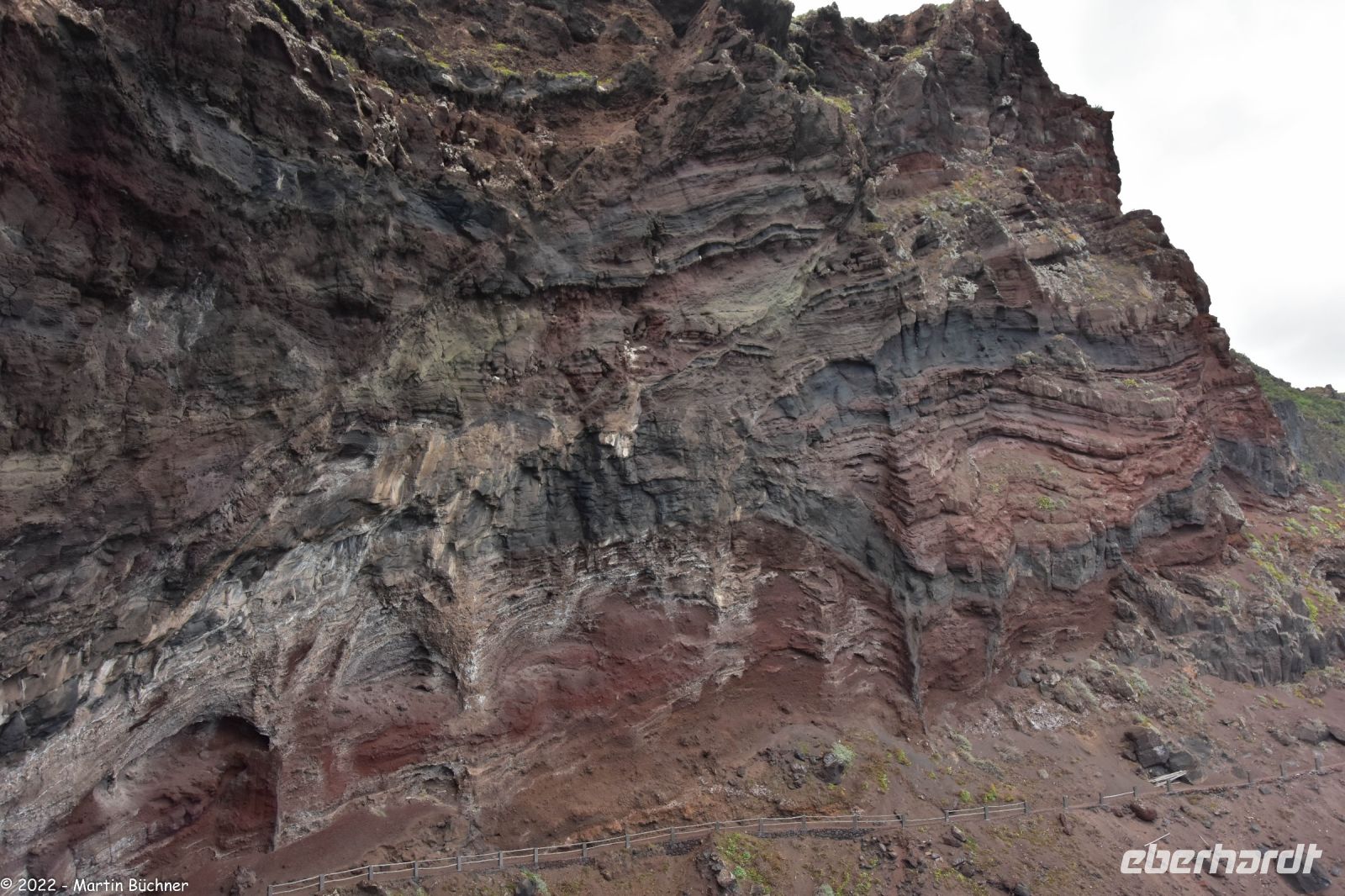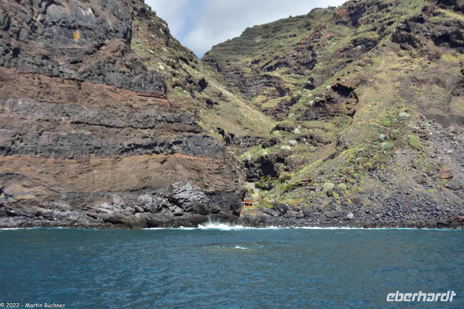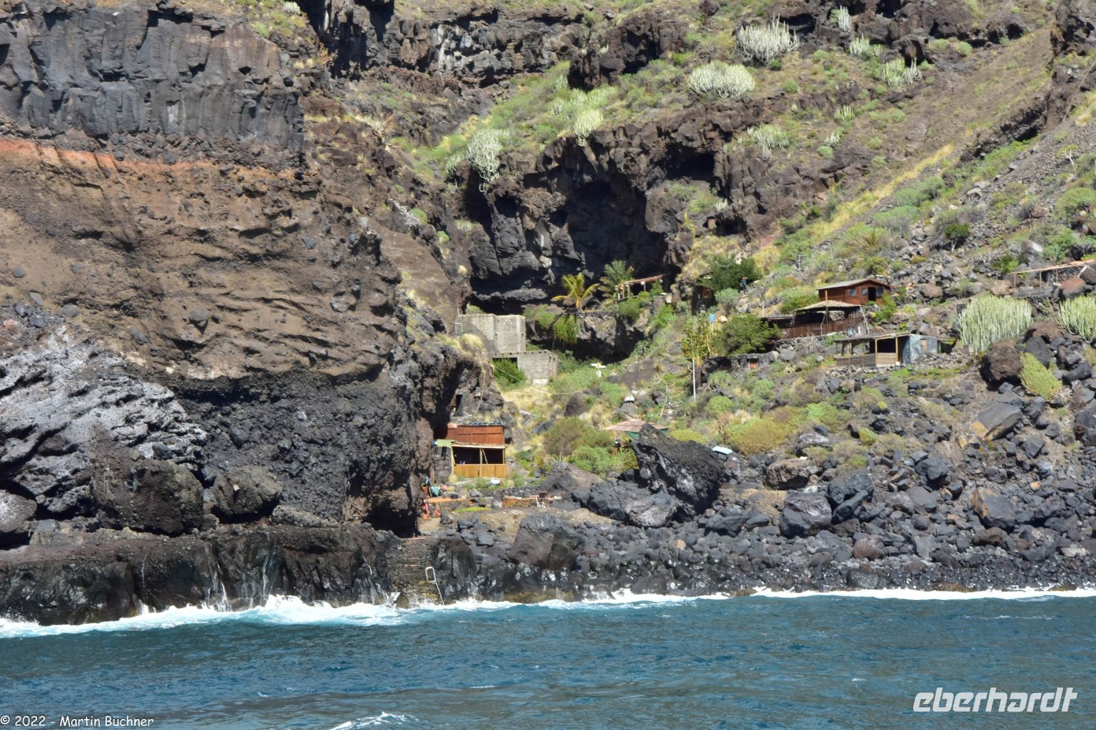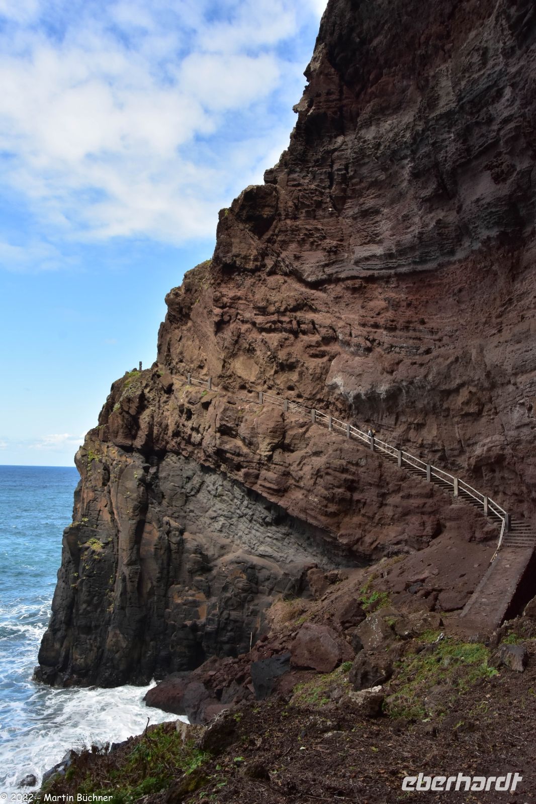 Gemeinsam entscheiden wir uns für einen Besuch des Strandes „Playa de Nogales“. An dieser Steilküste mit schmalen einsamen schwarzen Sandstränden treffen die Elemente aufeinander. Steilküste durch Vulkane geschaffen, durch Meerwasser aufgesprengt und durch Wind und Brandung geformt. Der Zustieg zum Strand erfolgt über eine steile Treppe.