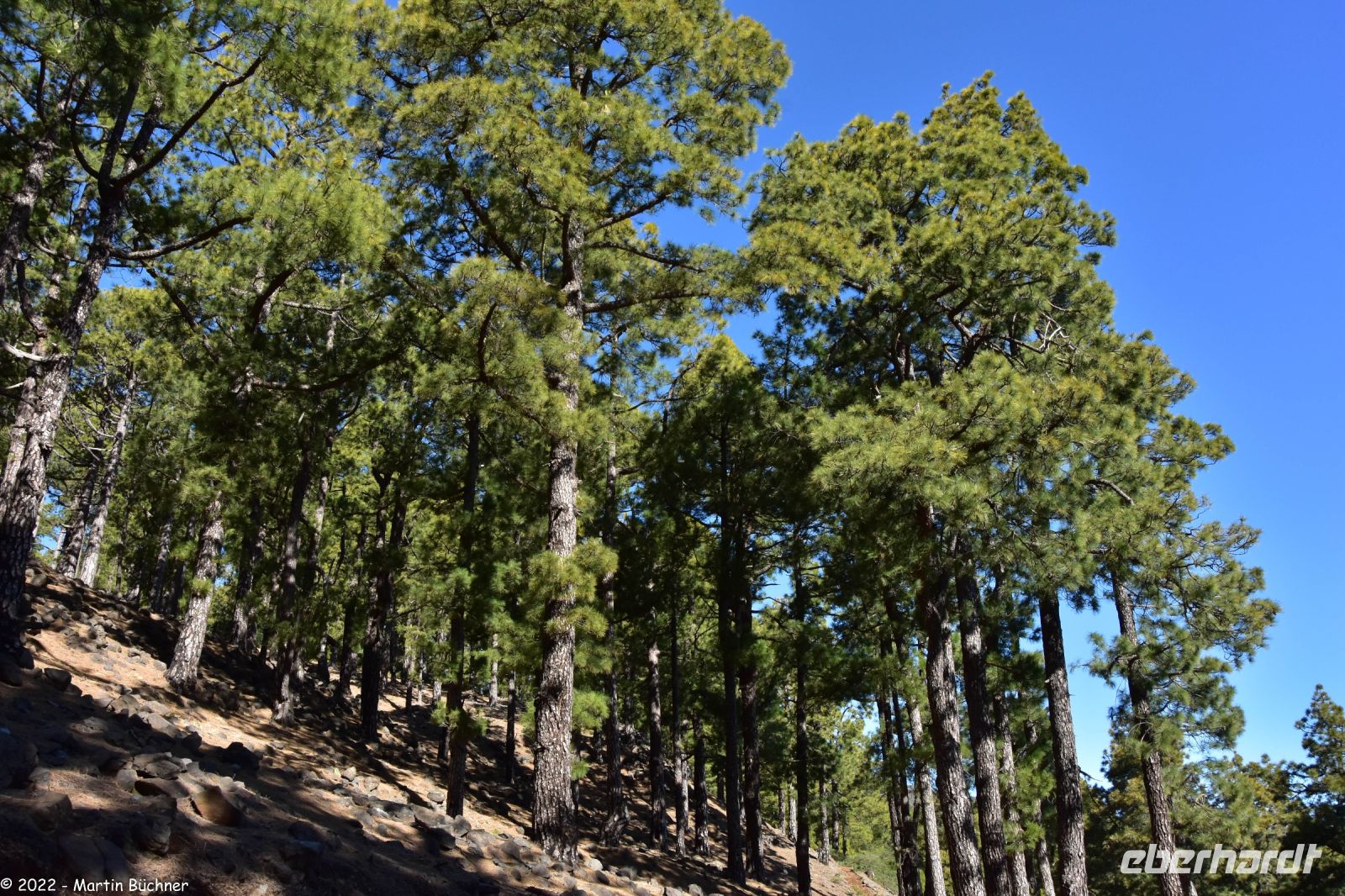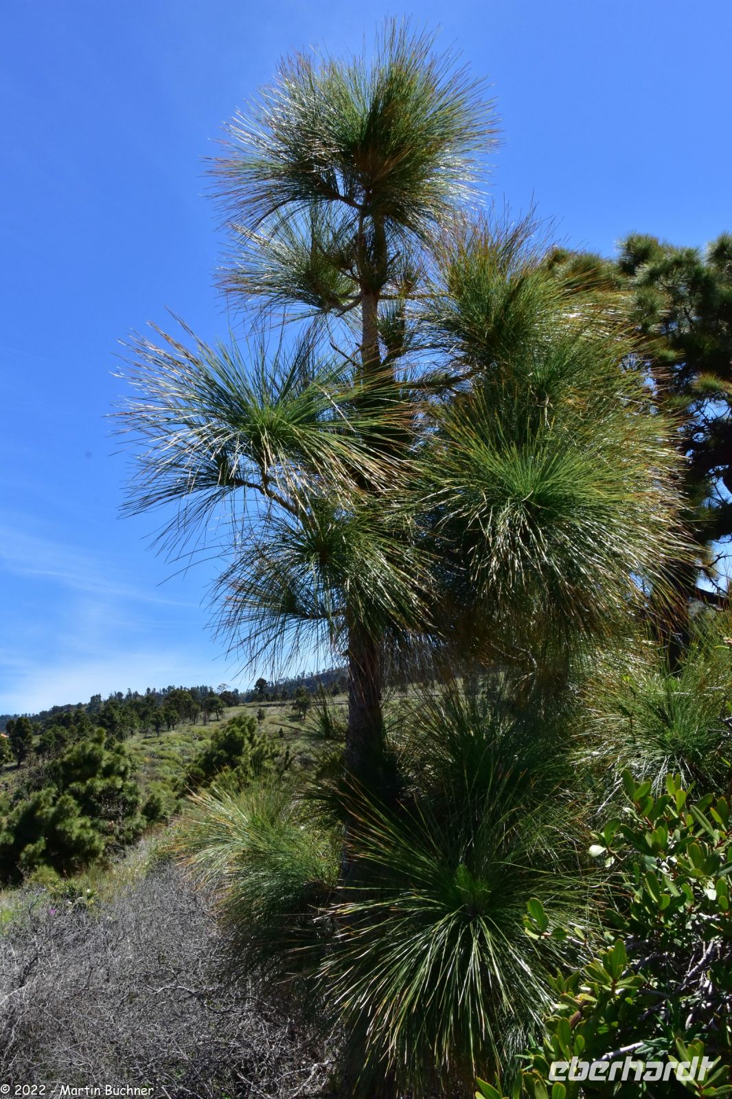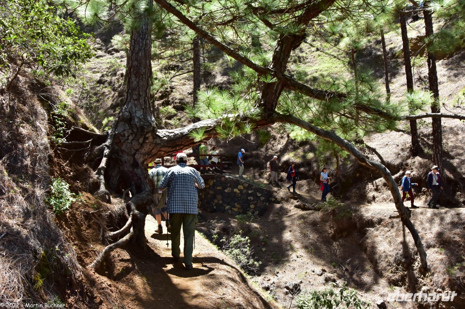 Die Pinien wachsen oberhalb des Lorbeerwaldes. Sie sind die Lebensversicherung für viele Lebewesen auf den Kanarischen Inseln. Sie selbst brauchen sehr wenig Wasser. Mit ihren Nadeln bilden sie große Oberflächen, an denen der Nordostpassat kondensieren kann.