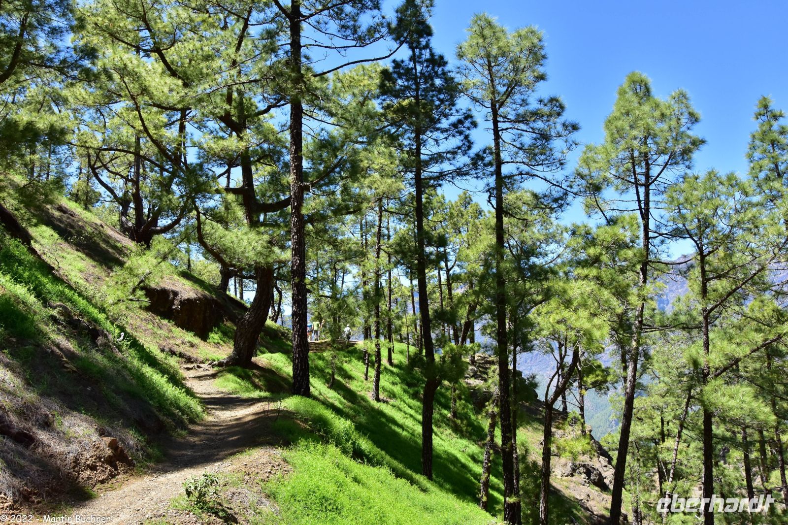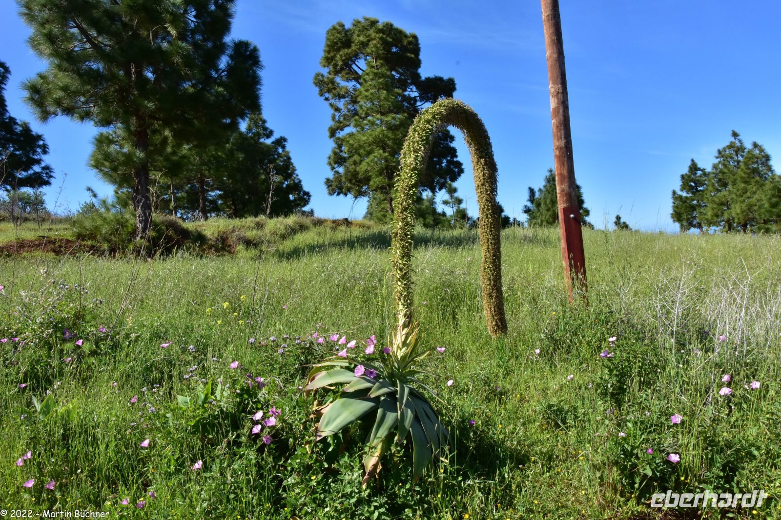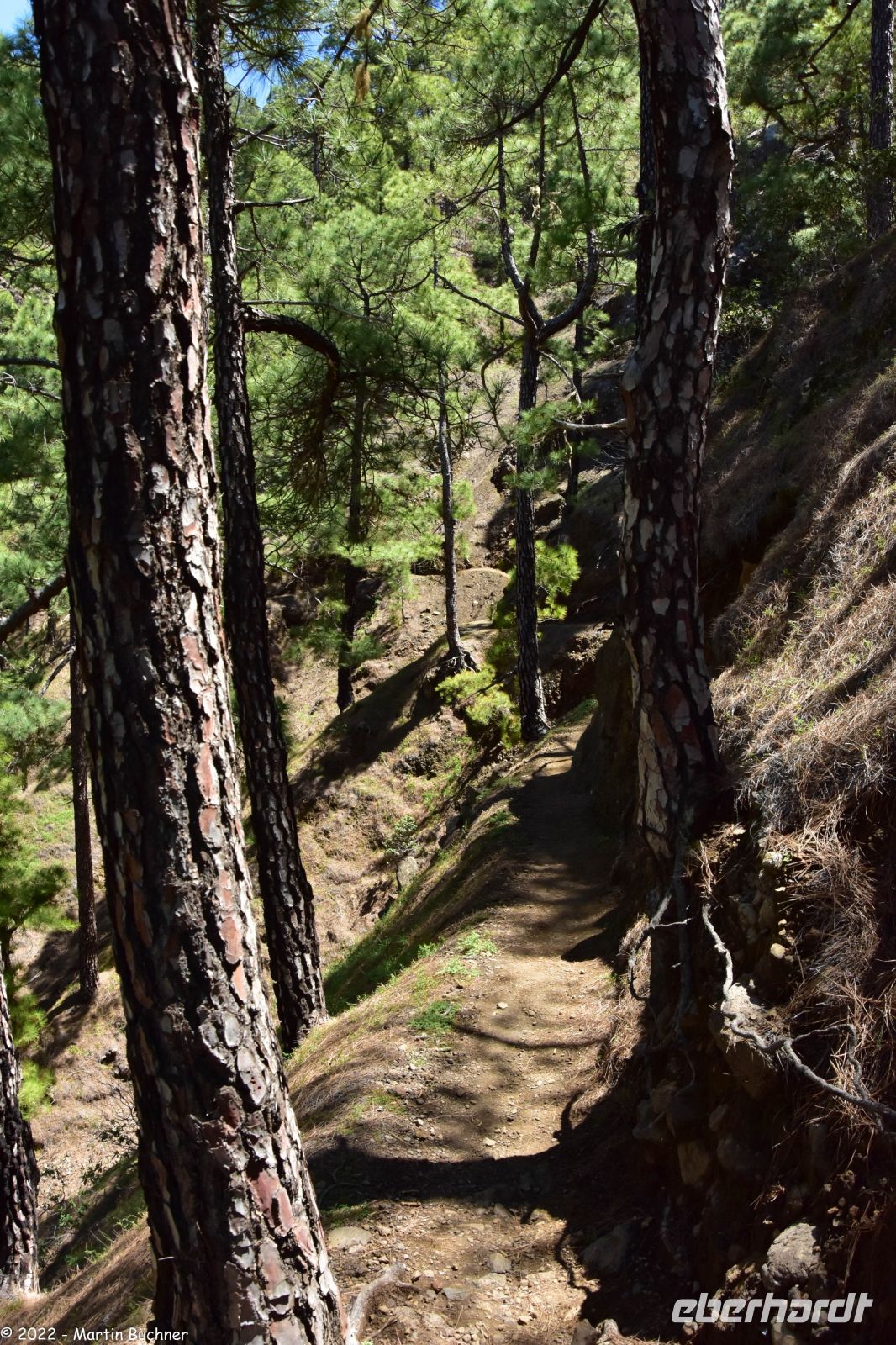 Die Pinien wachsen oberhalb des Lorbeerwaldes. Sie sind die Lebensversicherung für viele Lebewesen auf den Kanarischen Inseln. Sie selbst brauchen sehr wenig Wasser. Mit ihren Nadeln bilden sie große Oberflächen, an denen der Nordostpassat kondensieren kann.