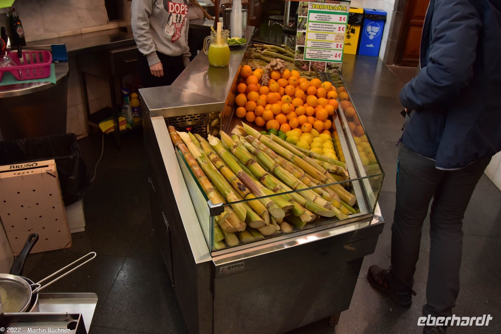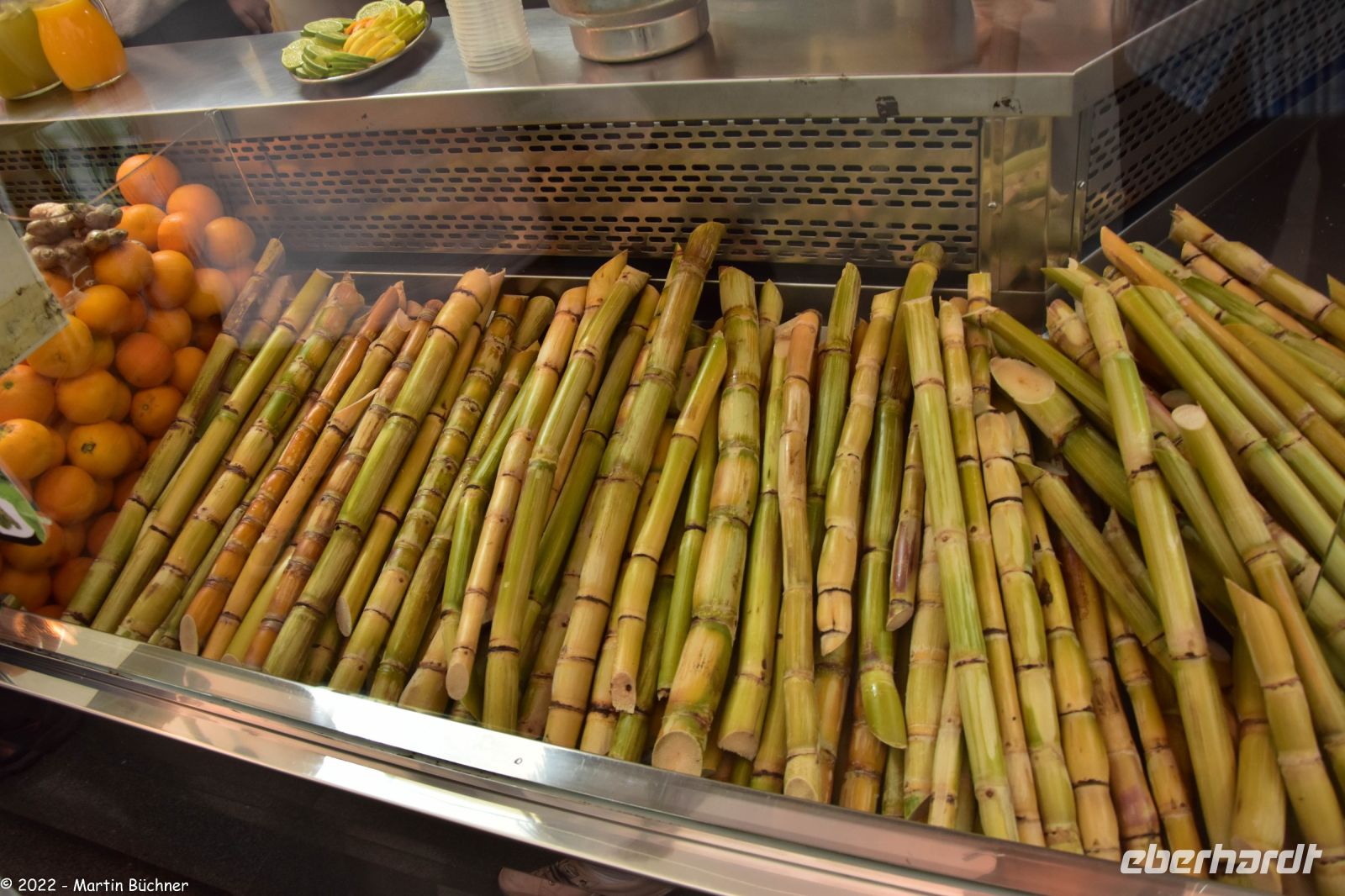 Wir besuchen eine historische Markthalle und probieren Zuckerrohrsaft und wir dürfen frisches Zuckerrohr probieren.