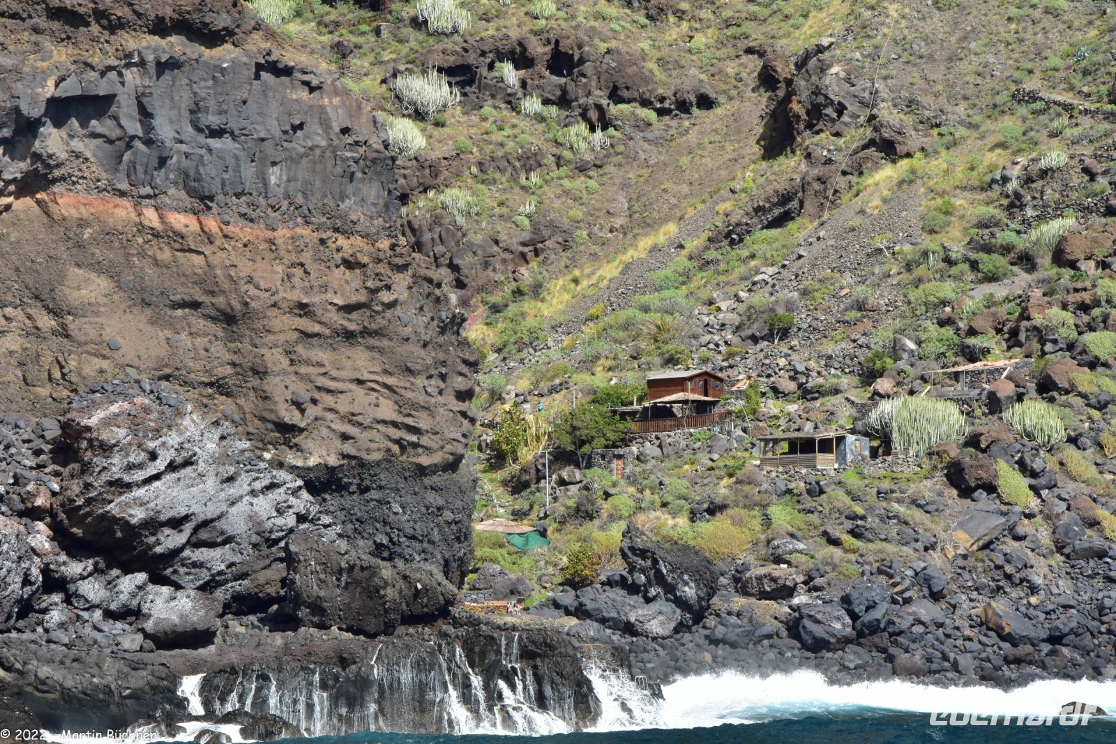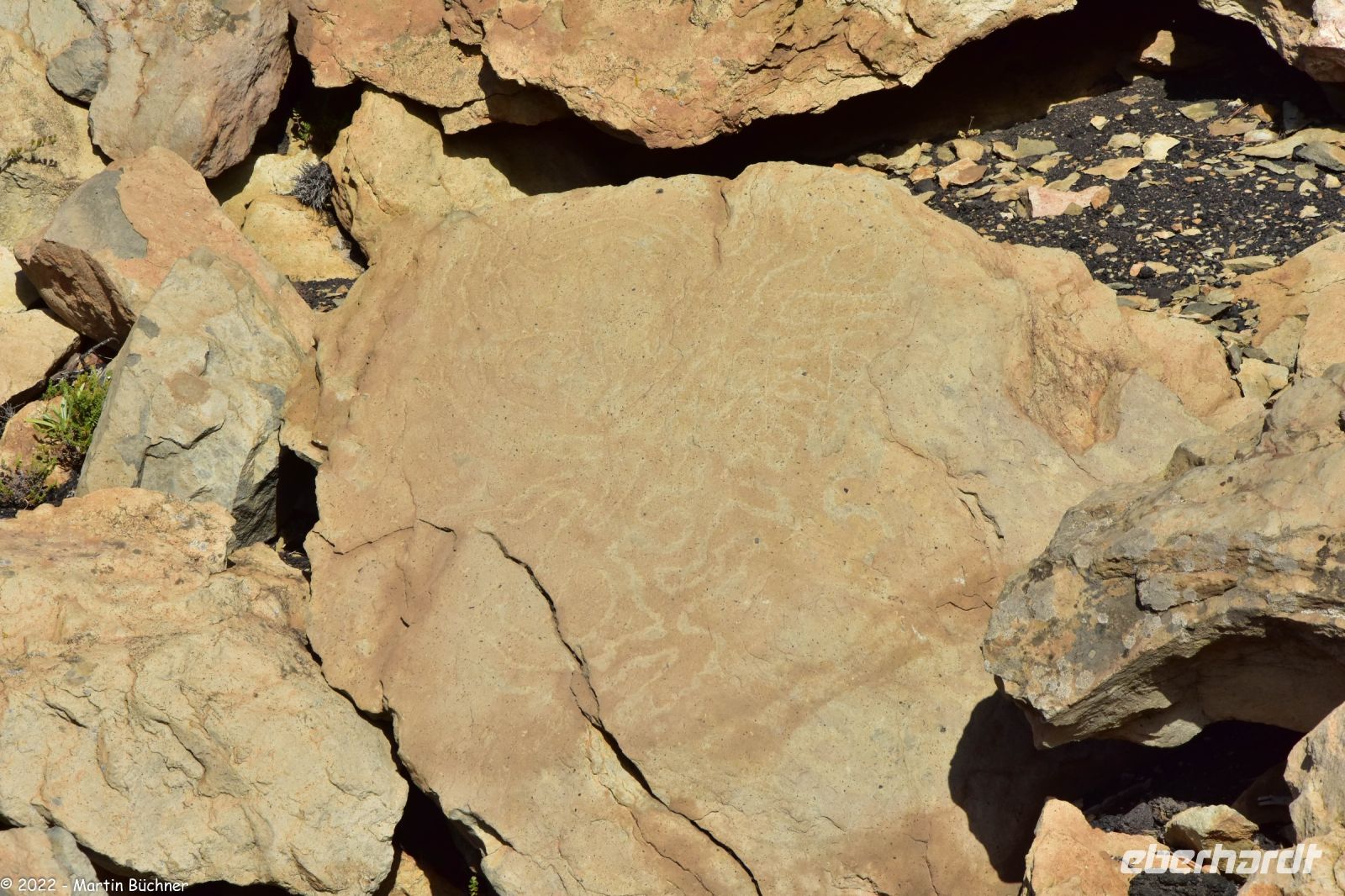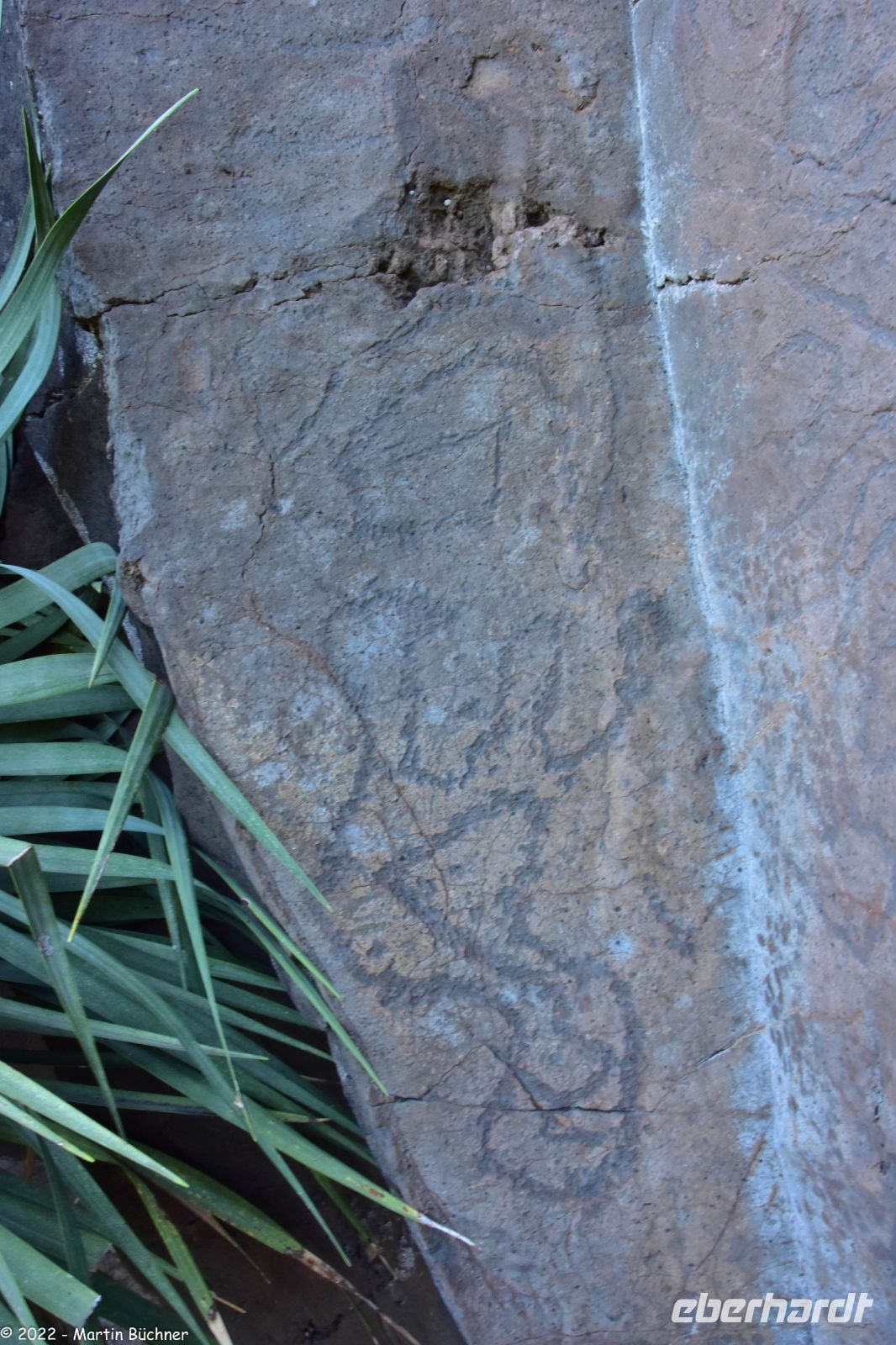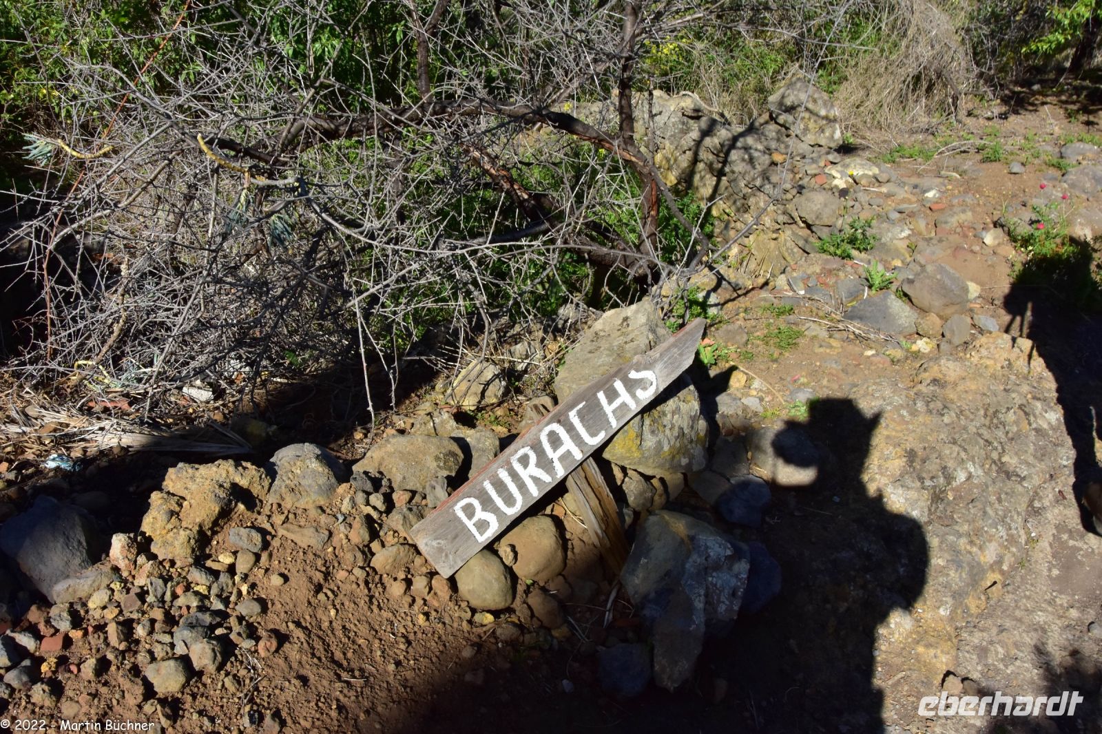 Die heutige Wanderung führt uns in den Nordwesten der Insel, deutlich trockner, da nahezu unberührt vom Passat. In der „Cueva de la Buracas“ finden sich Steinritzungen der Ureinwohner, die hier mutmaßlich sicher und versteckt mit reichlich Trinkwasser lebten. Woher sie stammten, wie sie herkamen, wie sie lebten liegt völlig im Dunkel der Geschichte. Archäologische Funde sind rar. Kurioserweise kannten sie bei Ankunft der Spanier im 15. Jh. weder Boote noch Schiffe. Es bleibt daher ein absolutes Rätsel wie sie auf die Inseln gelangen konnten.