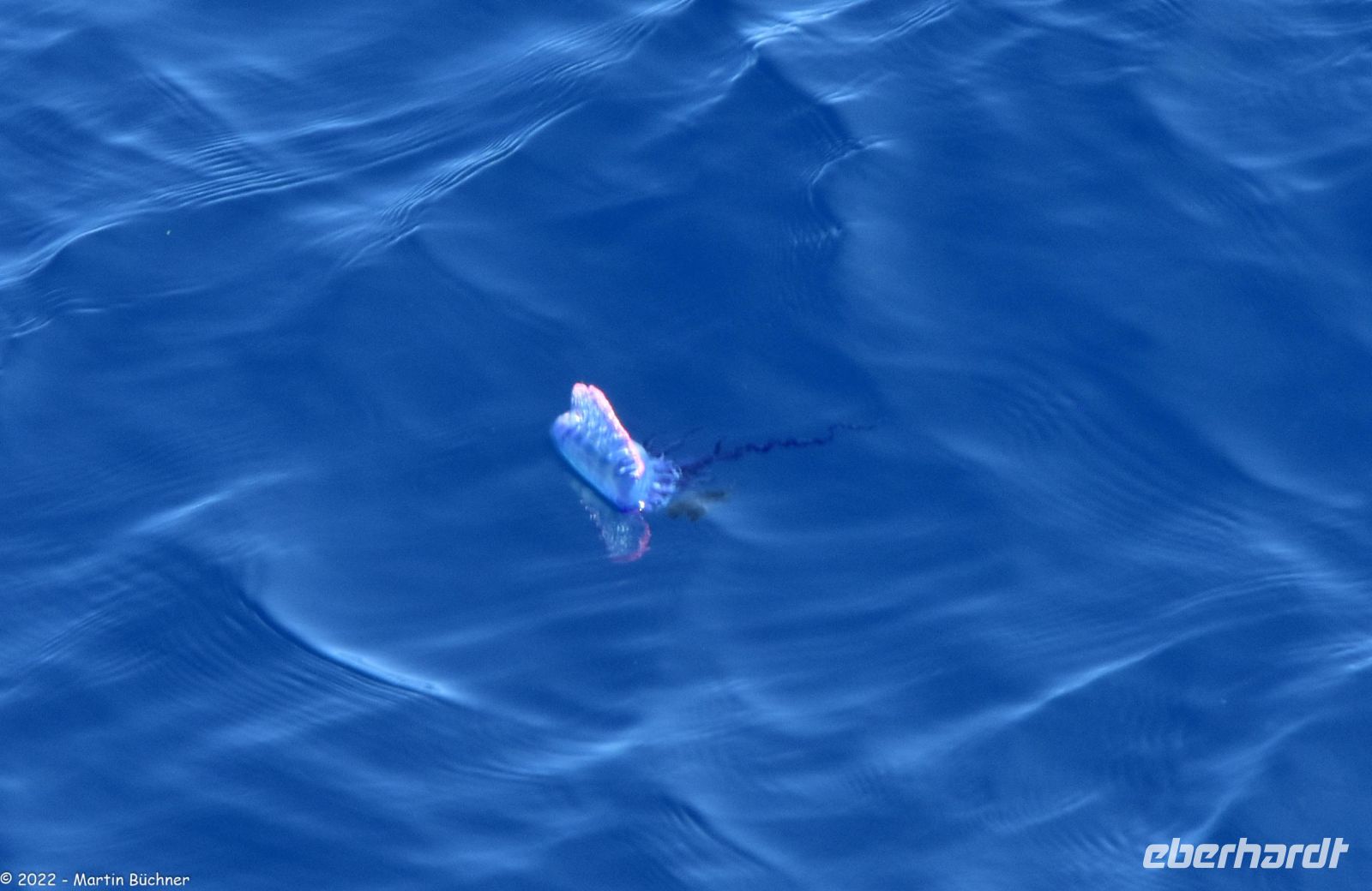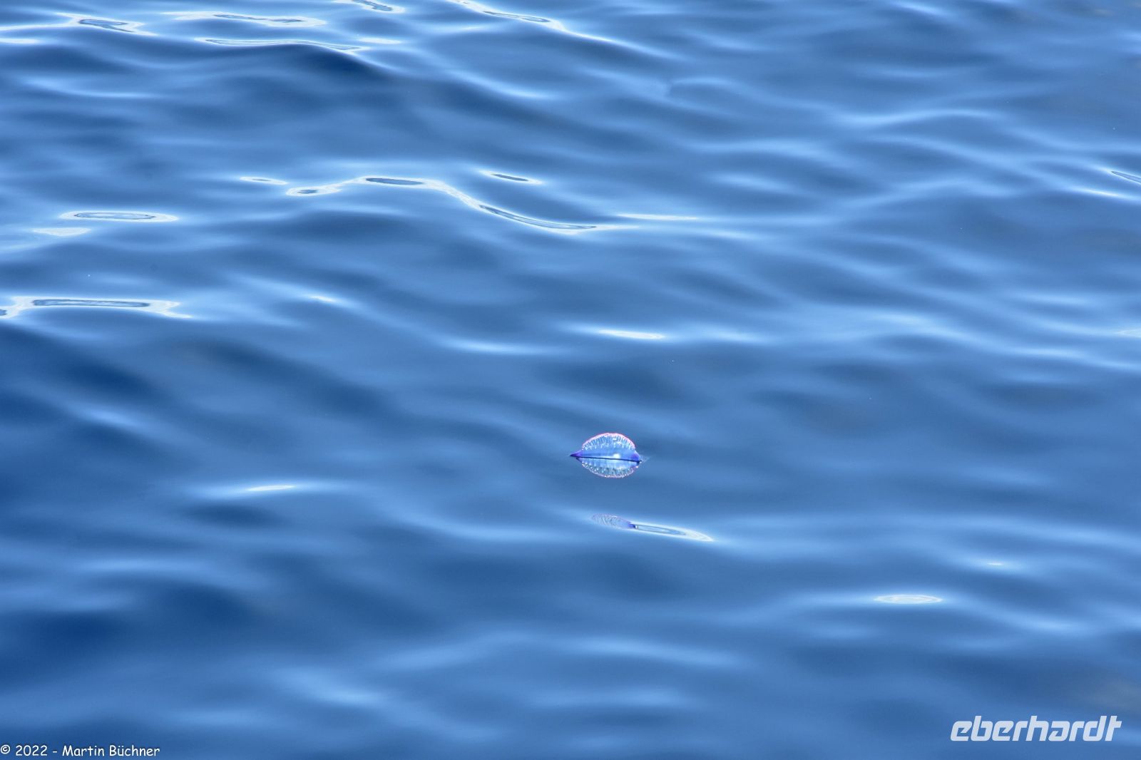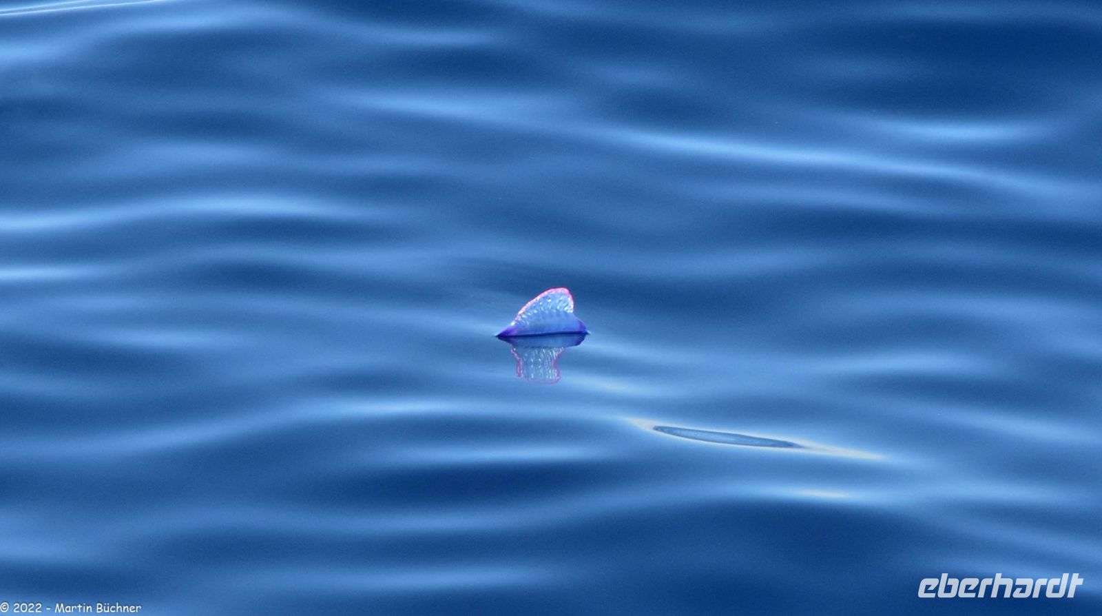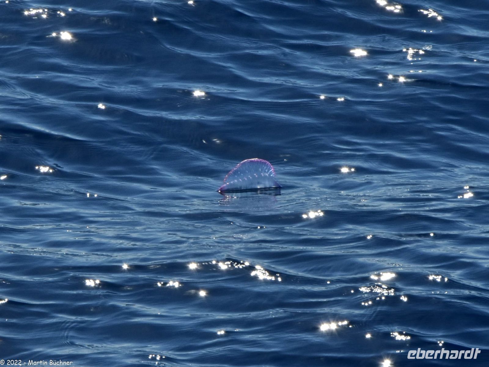 Imposant waren die vielen „Portugiesischen Galeeren“, hochgiftige Quallen, die wie aufgeblasene blaue Plastiktüten auf dem Meer schwimmen bzw. sich durch ihr segelartiges Wesen vom Wind und den Strömungen treiben lassen. Während bis zu 50 Meter lange Tentakel nach fressbaren angeln und in Strandnähe nicht selten ahnungslose Schwimmer mit ihrem Nesselgift schwer verletzen können (giftiger und schmerzhafter als die bekanntere Feuerqualle).