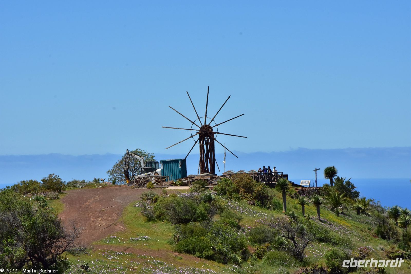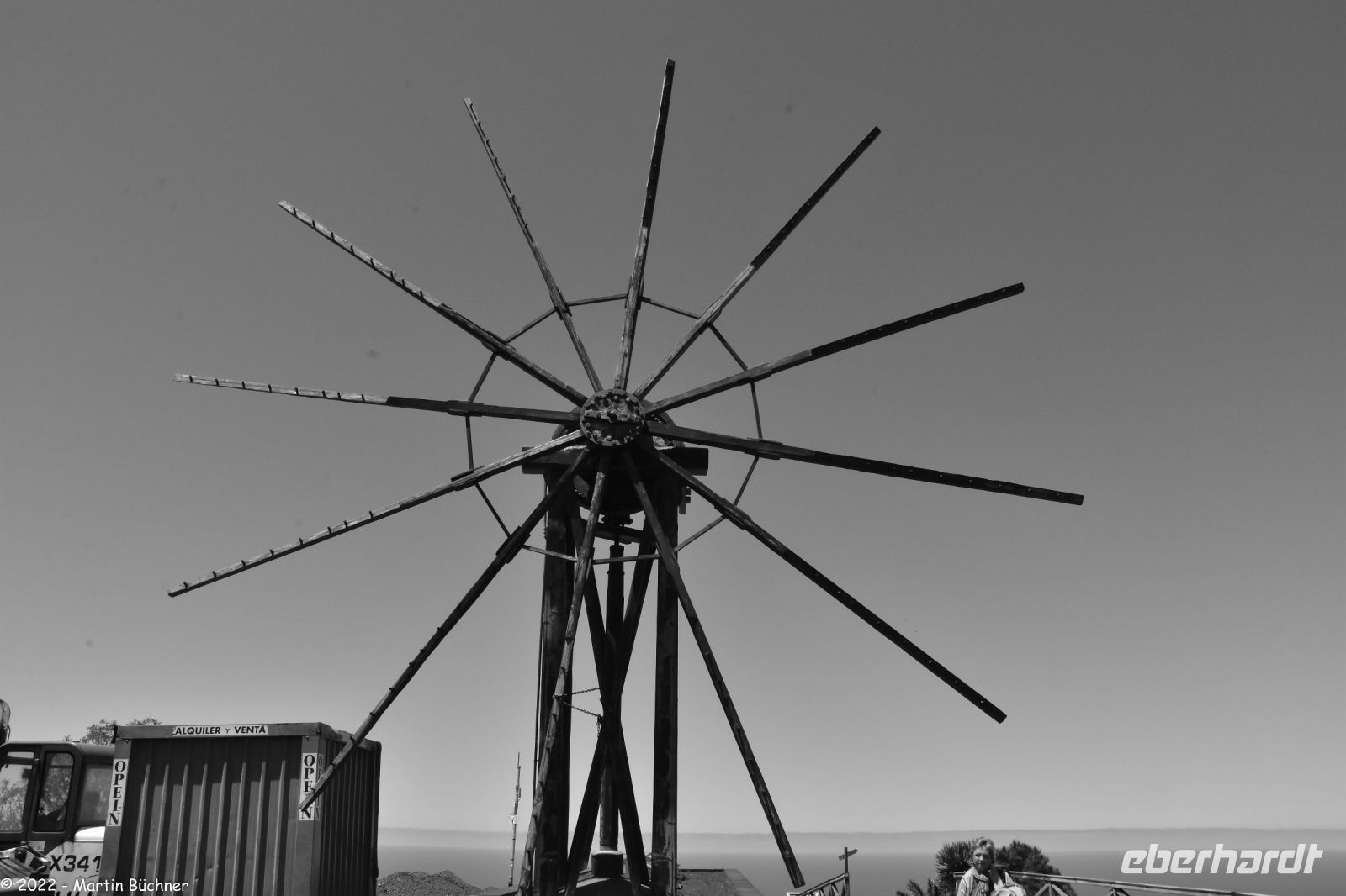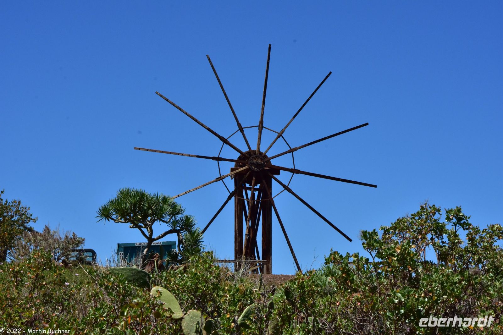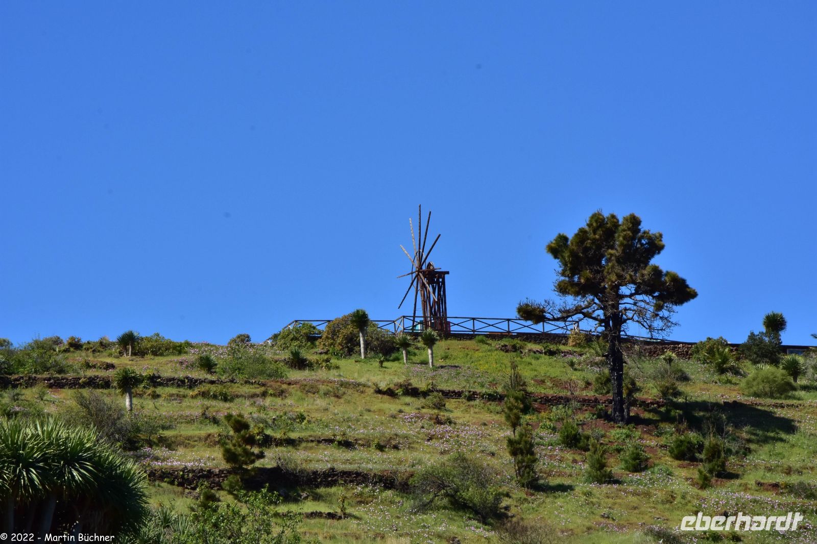 Ende ist einer der typischen Gofio-Windmühlen, genannt „Molino de Buracas“. Gofio ist eine kanarische Mehlmischung aus diversen Getreidearten, die auf den Kanaren zu vielen leckeren Speisen und Getränken verarbeitet werden.