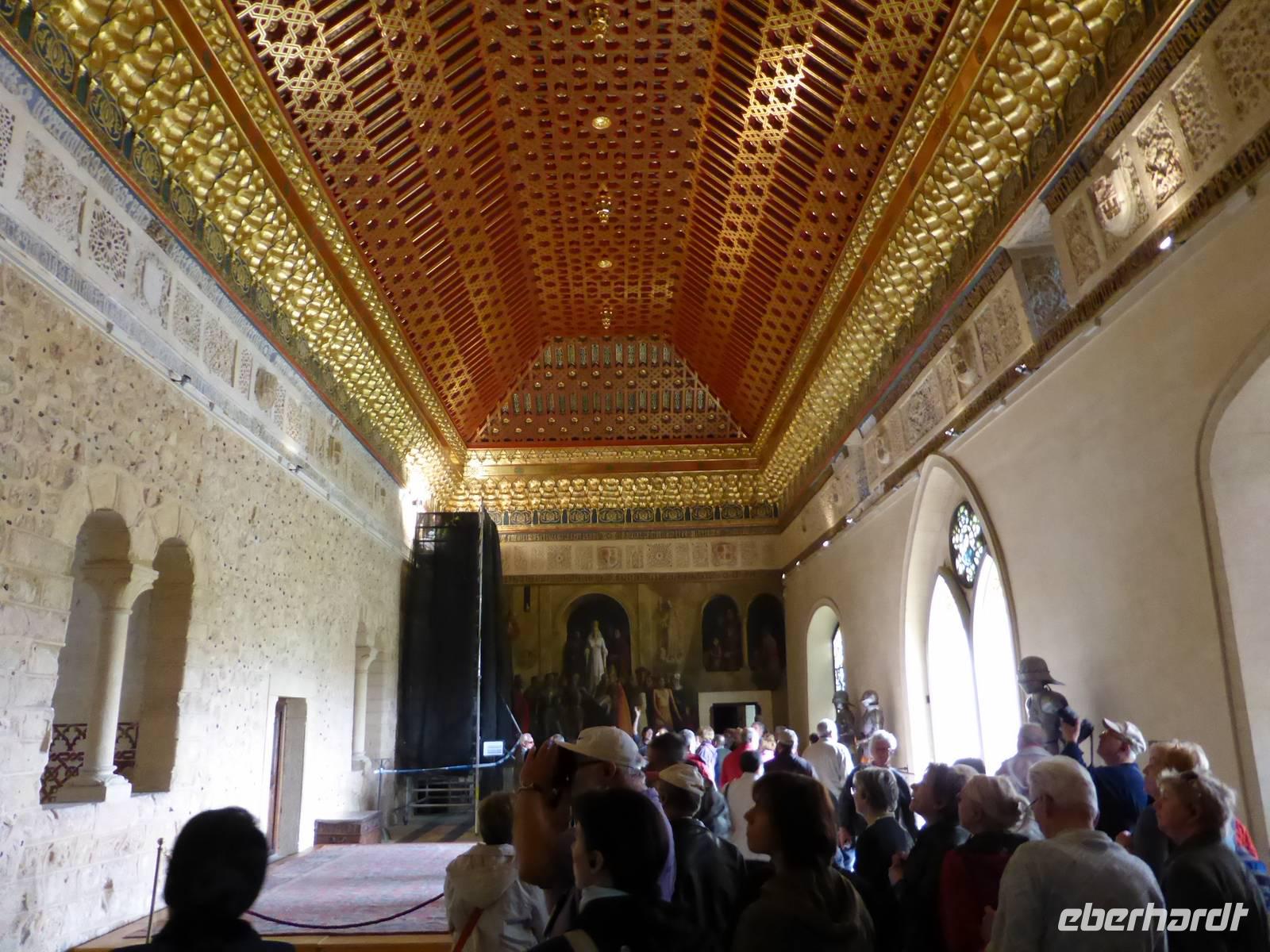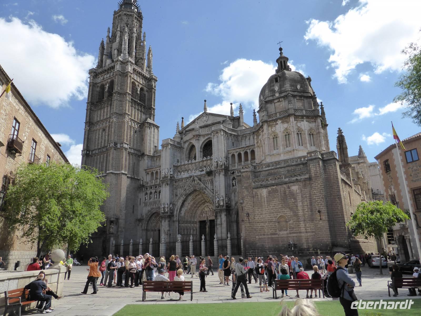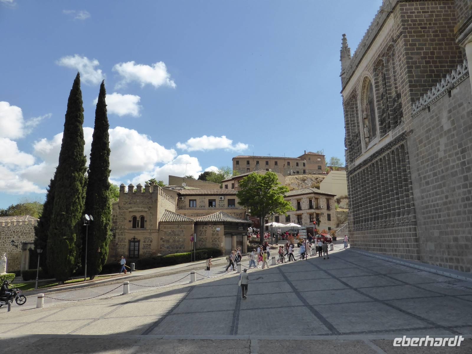 Unsere Besichtigung Toledos begann mit der Fahrt zum Aussichtspunkt auf der Südseite des Rio Tajo. Von diesem hochgelegenen Punkt gelangen uns die schönsten Aufnahmen der Stadt. Anschließend fuhren wir zur Stadtmauer und von dort mit der Rolltreppe in die Altstadt hinauf. Unser Spaziergang führte zum San Juan-Kloster und zur ehemaligen Synagoge, heute Santa Maria la Blanca genannt. Der Höhepunkt war die Besichtigung der Kathedrale, besonders der Kapitel-Saal mit den Gemälden ehemaliger Kardinäle und Erzbischöfe von Toledo sowie die Kunstwerke berühmter Maler wie El Greco, Francisco de Goya oder Raffael. Von der Kathedrale aus spazierten wir zum Zocodover-Platz, wo wir unseren Stadtrundgang beendeten und im Anschluss Freizeit für die Mittagspause und für eigene Erkundungen hatten.