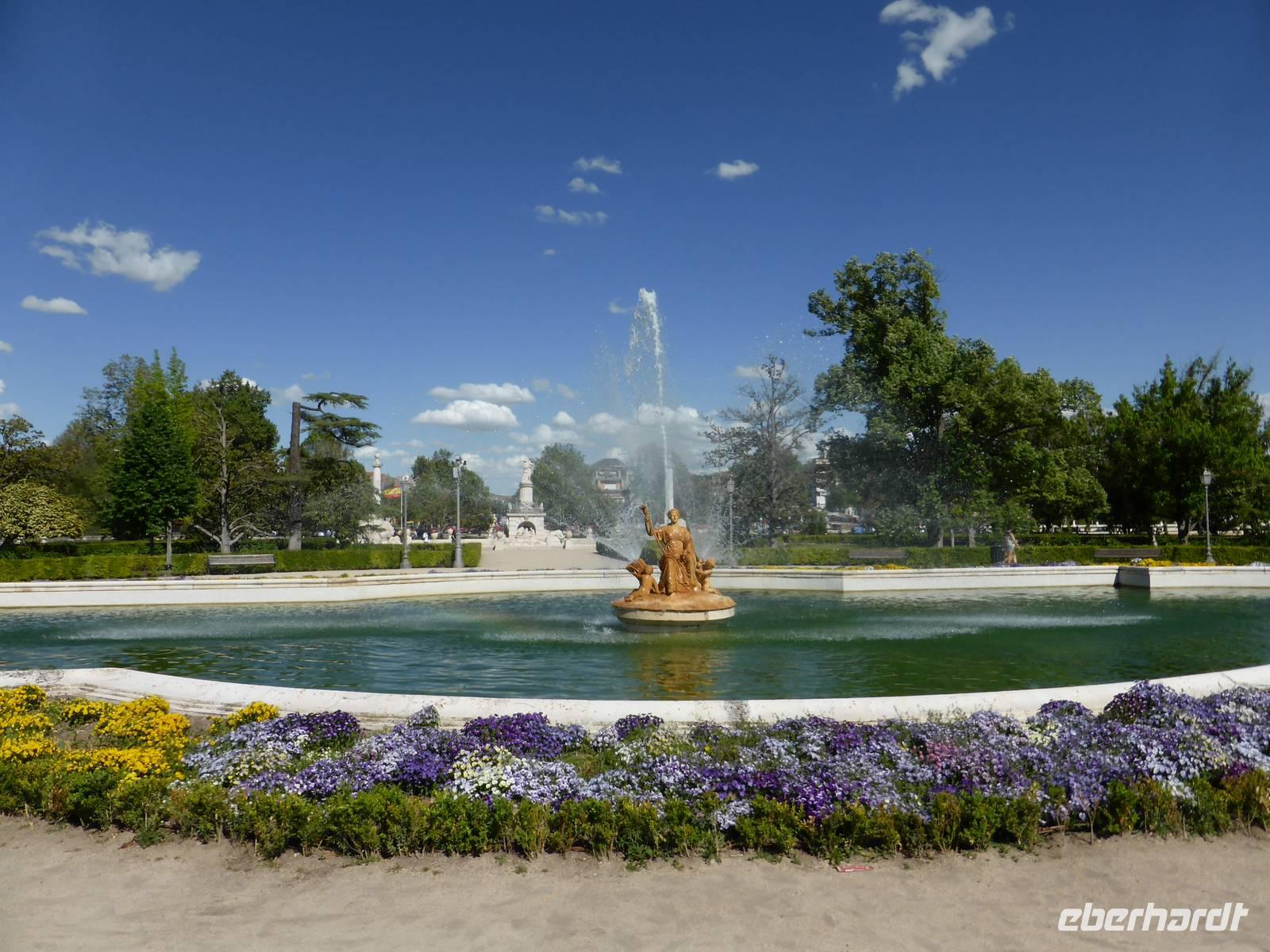 Die Besichtigung des Palacio Real, des königlichen Palastes, dauerte eine knappe Stunde. Mit Hilfe der Audioguides konnte sich jeder von uns frei im Schloss bewegen und über die einzelnen Räume informieren. Auch hier waren, wie im Palacio Real in Madrid, der Thronsaal und der Porzellansaal die beeindruckendsten Palastsäle. Nach der Besichtigung der Innenräume spazierten wir durch die Gärten von Aranjuez, namentlich durch den Jardin de la Isla (der Garteninsel) und den großen Garten vor der Palastanlage mit seinen Wasserbecken und Statuen (Jardin de las Estatuas). Von Aranjuez aus fuhren wir anschließend zu unserem Hotel in Madrid zurück und hielten unterwegs auf einem Berghügel am Kloster Carmelitas Descalzas um das Cruz de Los Angeles zu fotografieren.