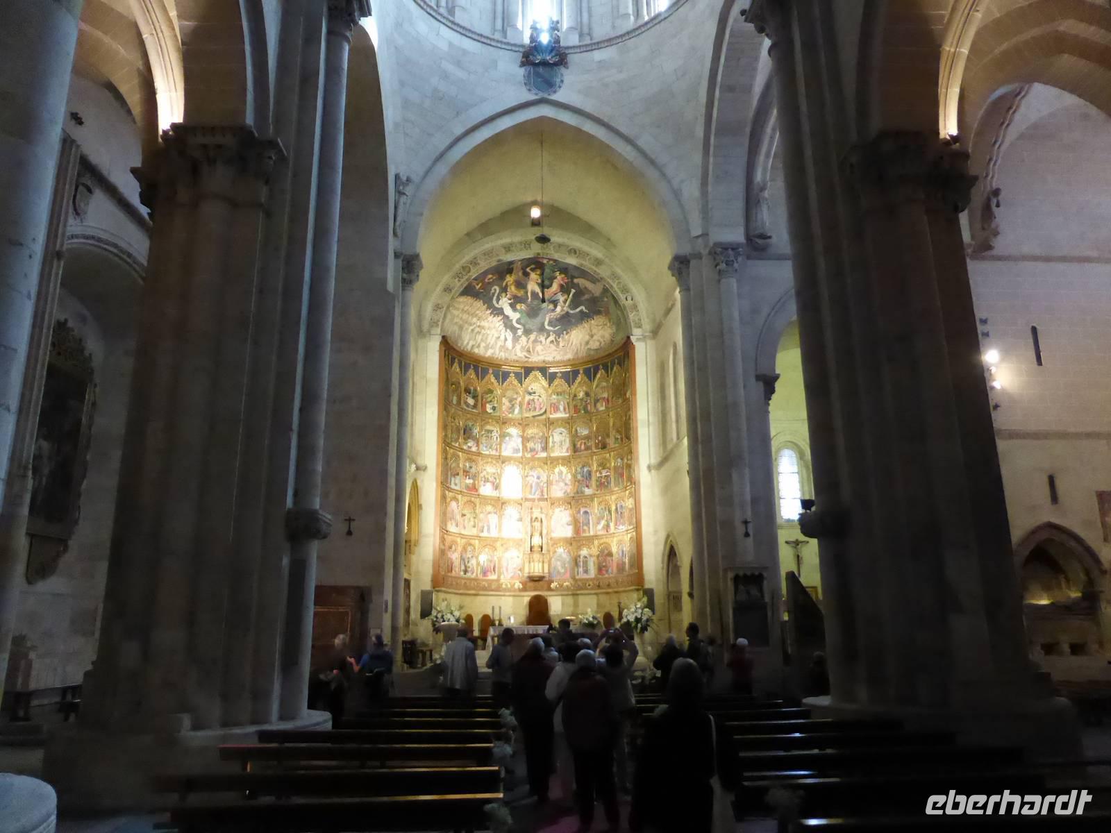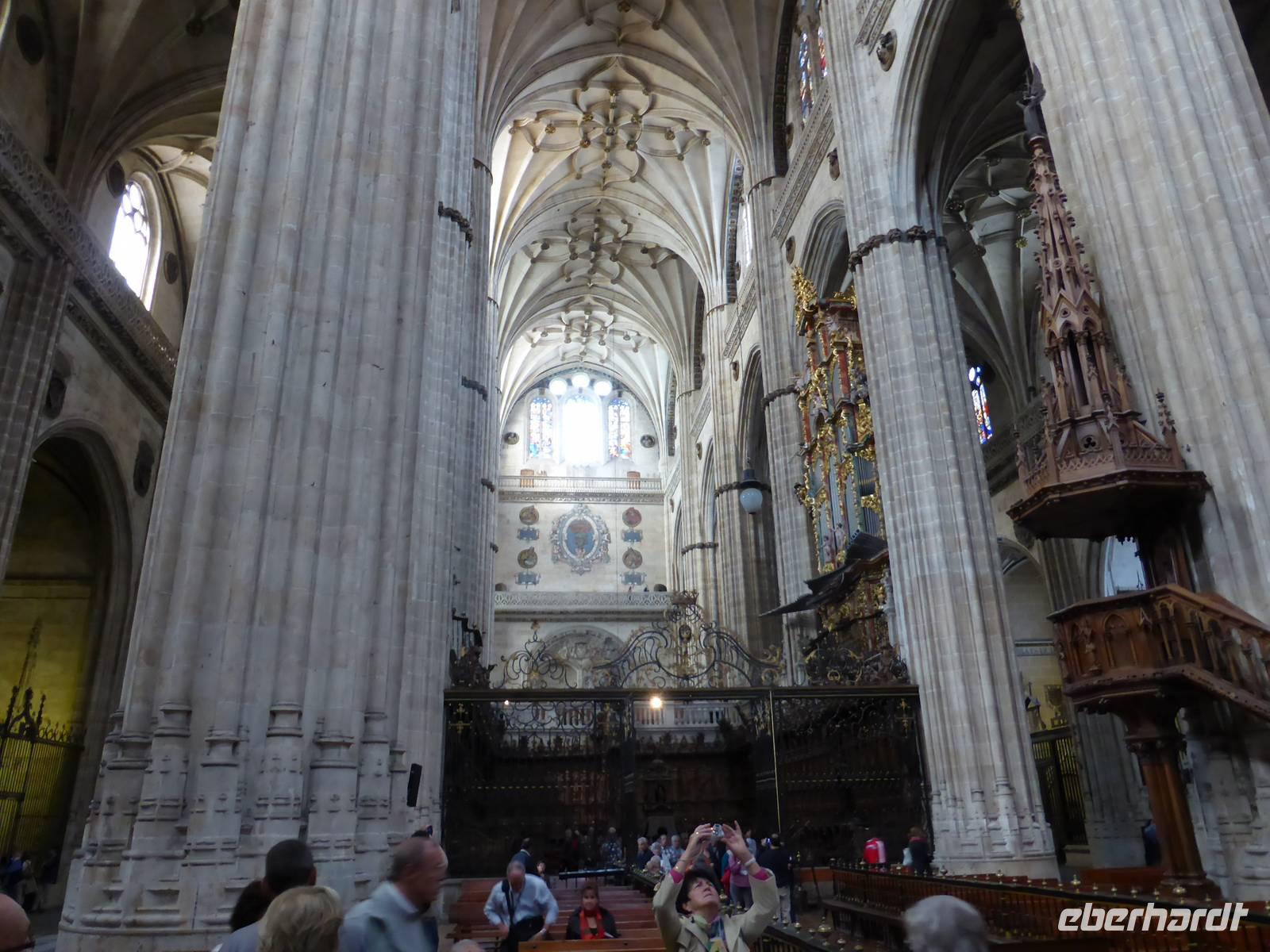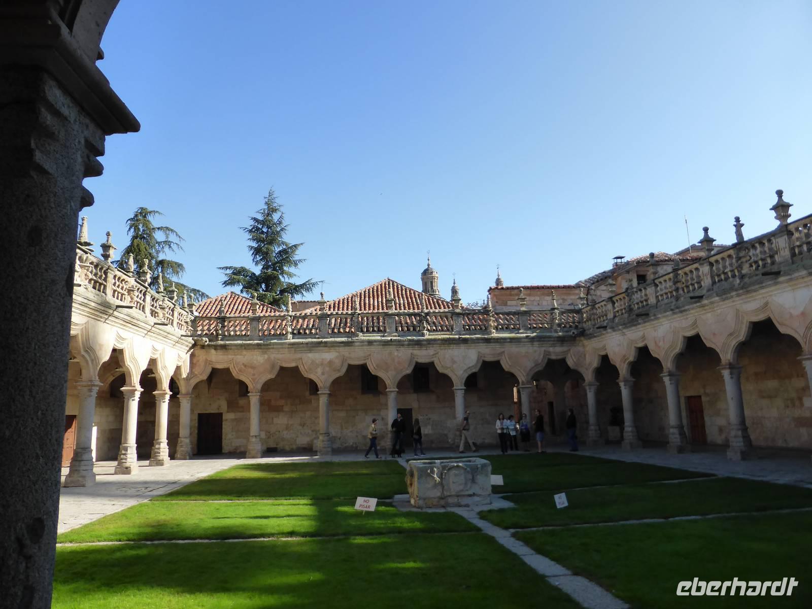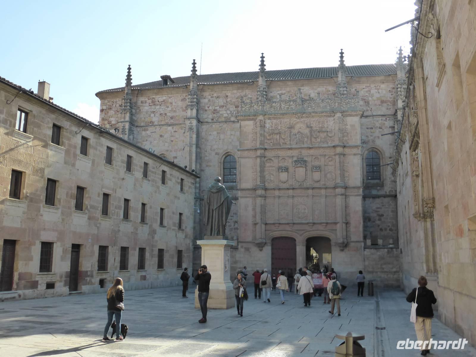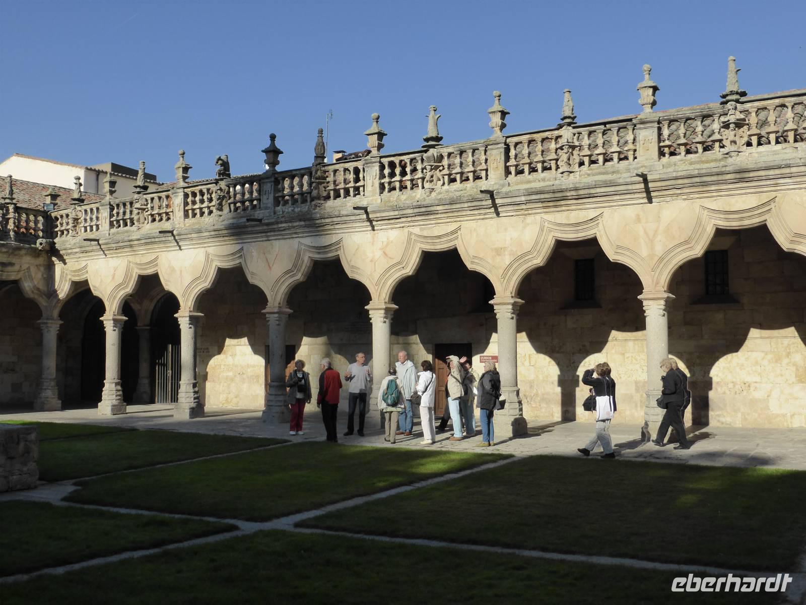 In Salamanca befindet sich die älteste Universitätsstadt Spaniens und die zahlreichen Baudenkmäler der Stadt machen sie zu einem der beliebtesten Reiseziele des Landes. Die Altstadt wurde fast ohne Ausnahme in goldgelbem Sandstein aus Villamayor errichtet. An der Römerbrücke am Rio Tormes wurden wir von unserem örtlichen Reiseleiter Marc begrüßt. Als erstes besichtigten wir die ehrwürdigen Universitätsgebäude, in denen auch schon Miguel Cervantes studiert hatte. Beeindruckend waren die alten Hörsäle mit ihren schlichten Holzbänken. Das Schreiben stand damals nicht im Vordergrund, viel wichtiger waren das genaue Zuhören und Auswendiglernen. Gleich neben der Universität steht die Kathedrale, welche wir anschließend besuchten. Sie besteht aus dem Gebäude der alten Kathedrale mit dem Kreuzgang und aus dem Gebäude der neuen Kathedrale. In der romanischen alten Kathedrale ist das Rentabel mit Darstellungen aus der Geschichte Christi von herausragender Bedeutung. Ebenso eindrucksvoll sind die Seitenschiffe und die Wandgräber, welche mit farbigen Fresken bemalt sind. Die neue Kathedrale, ein spätgotisches Bauwerk, fasziniert durch ihre gewaltigen Ausmaße. Von dort spazierten wir zum Casa de las Conchas, dem Muschelhaus, in dem heute die Universitätsbibliothek untergebracht ist. Seinen Namen erhielt das Haus aufgrund der Jakobs-Muschel-Darstellungen an der Außenfassade. Den Abschluss unseres Stadtrundganges bildete die Besichtigung des Plaza Mayor, an dem wir uns auch von unserem Stadtführer Marc verabschiedeten, um unsere wohlverdiente Mittagspause anzutreten. Am Nachmittag fuhren wir von Salamanca in das 1130 m hoch gelegene Àvila. Die Stadt ist seit der christlichen Rückeroberung im 11.Jahrhundert von einer gewaltigen, 12 Meter hohen Mauer umgeben. Dieses eindrucksvolle Stadtbild erschloss sich uns am besten vom Aussichtspunkt Cruz de los Cuatro Postes, einer kleinen offenen Kapelle oberhalb des Rio Adaja. In Àvila besuchten wir als erstes die Kathedrale, welche ihren wehrhaften Charakter nicht verbergen kann, und spazierten anschließend zum Convento Santa Teresa, dem Geburtsort der Heiligen Theresa von Àvila. Sie ist die bedeutendste spanische Nationalheilige und Gründerin des Ordens der barfüßigen Karmeliterinnen. Von Àvila aus fuhren wir auf direktem Wege nach Madrid zurück und trafen uns nach einer kurzen Pause im Foyer, um wieder gemeinsam zum Abendessen zu gehen. Nach dem Essen im Hotel Toledo erwartete uns ein gewaltiges Unwetter, so dass kein Schuh und keine Hose auf dem kurzen Weg zu unserem Hotel trocken blieben.