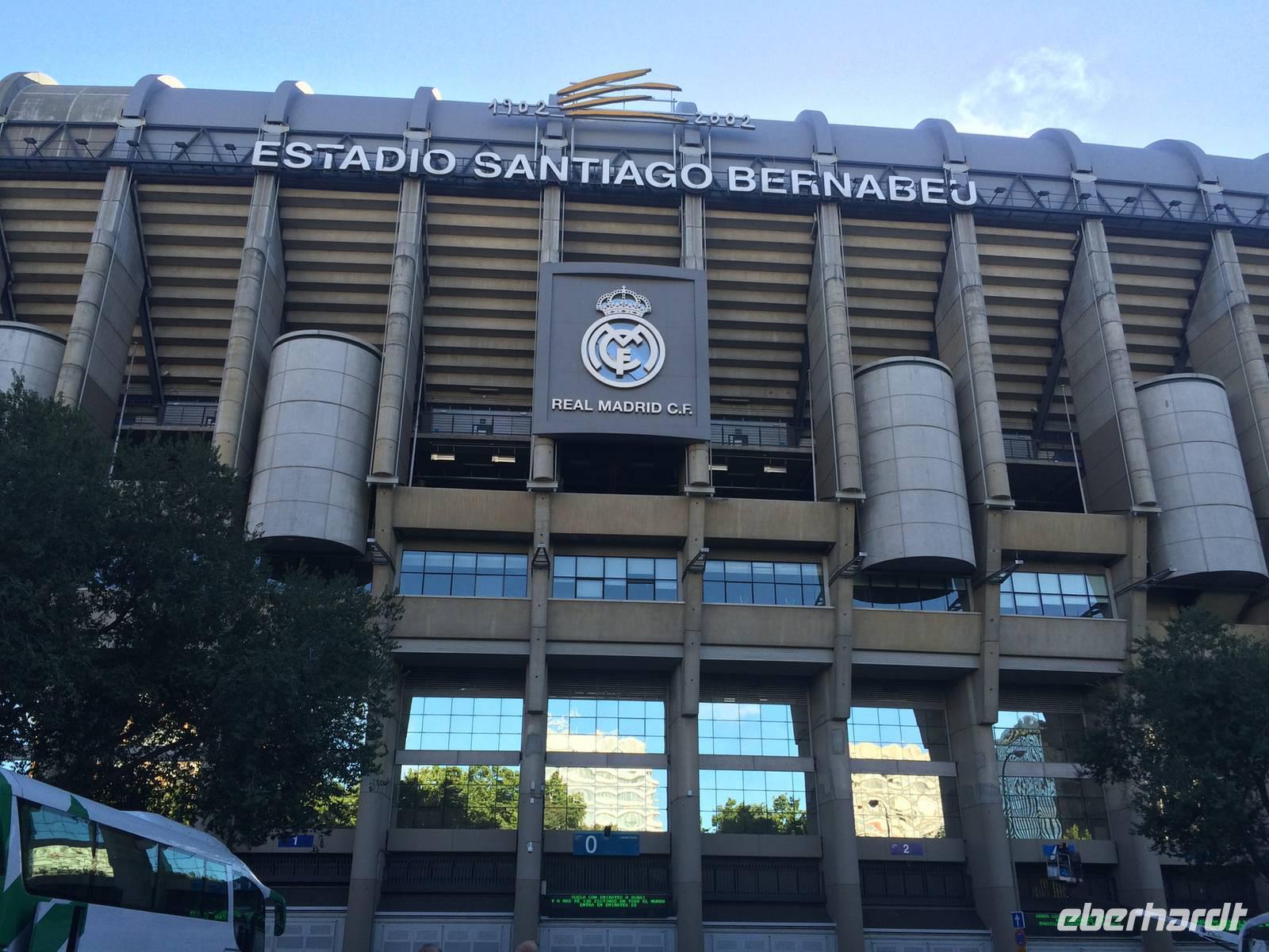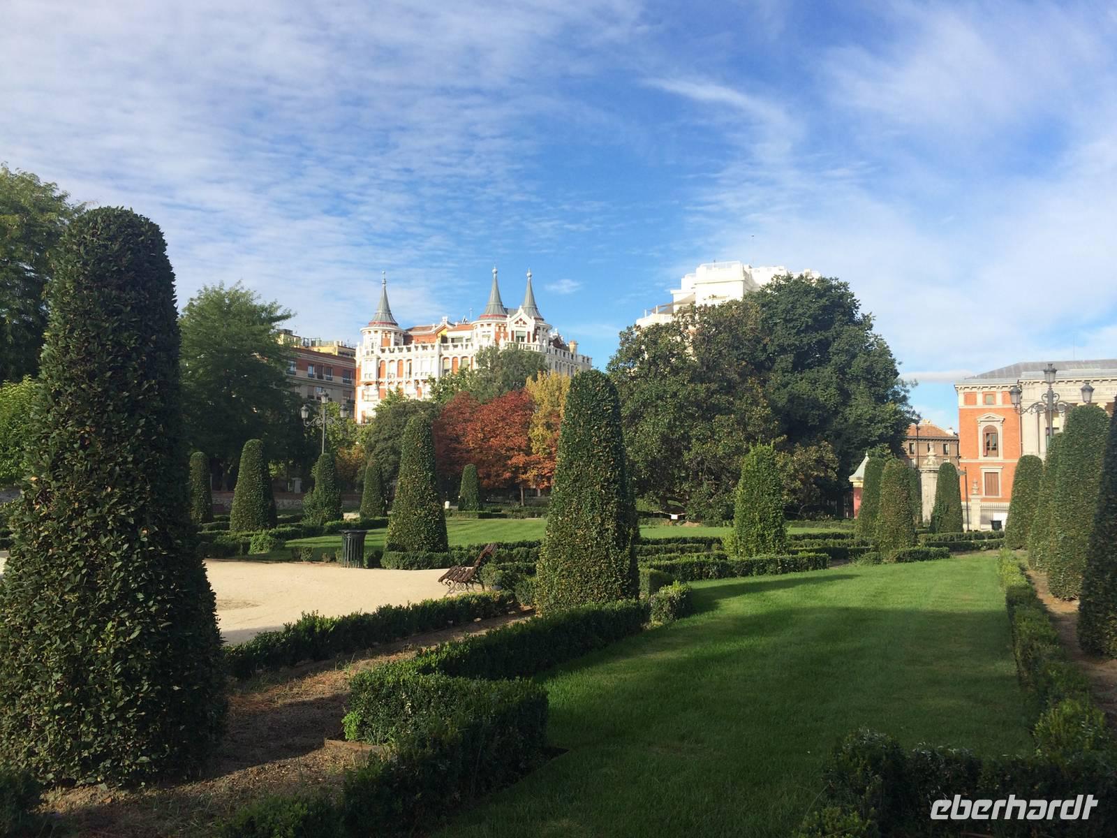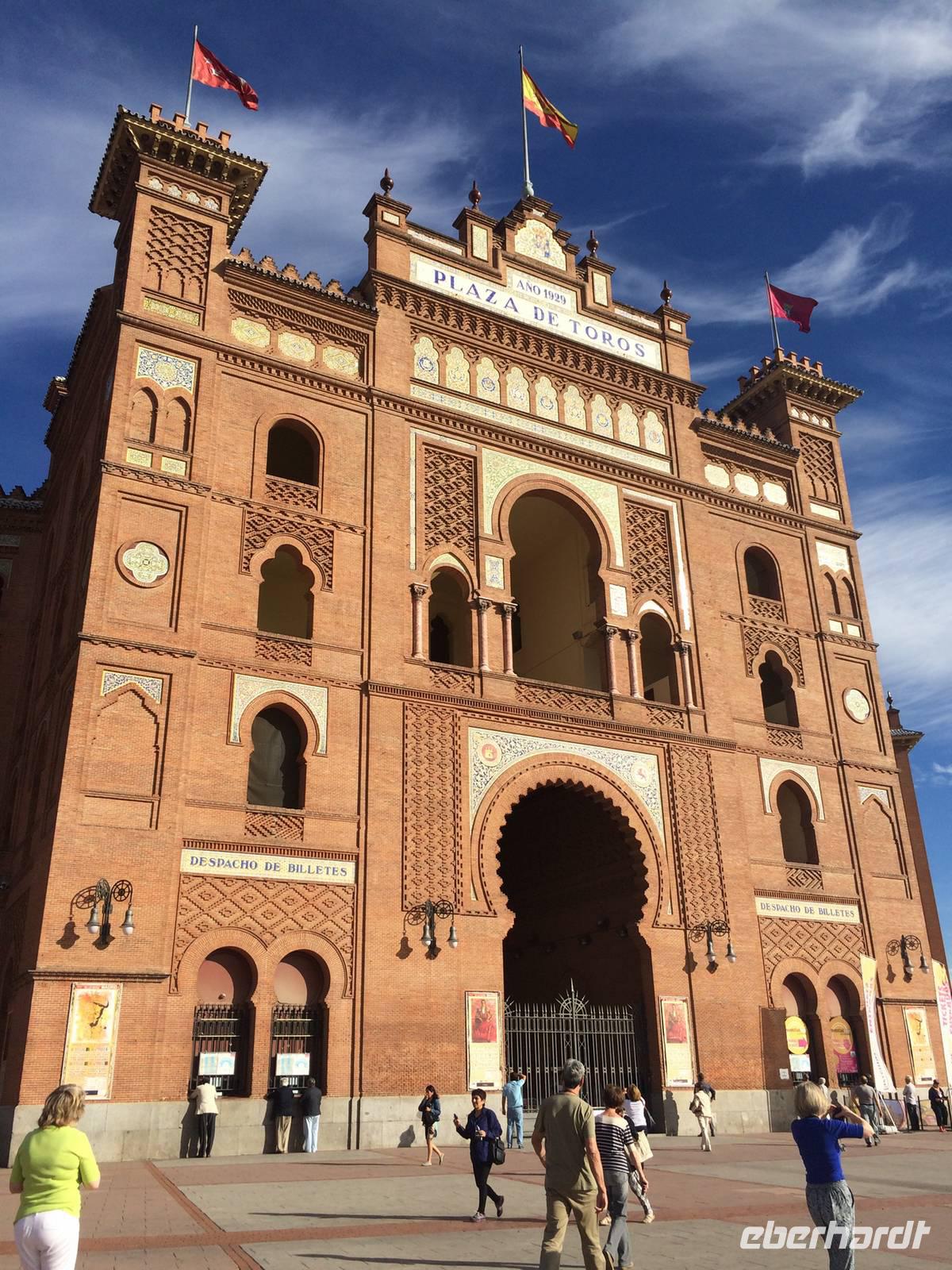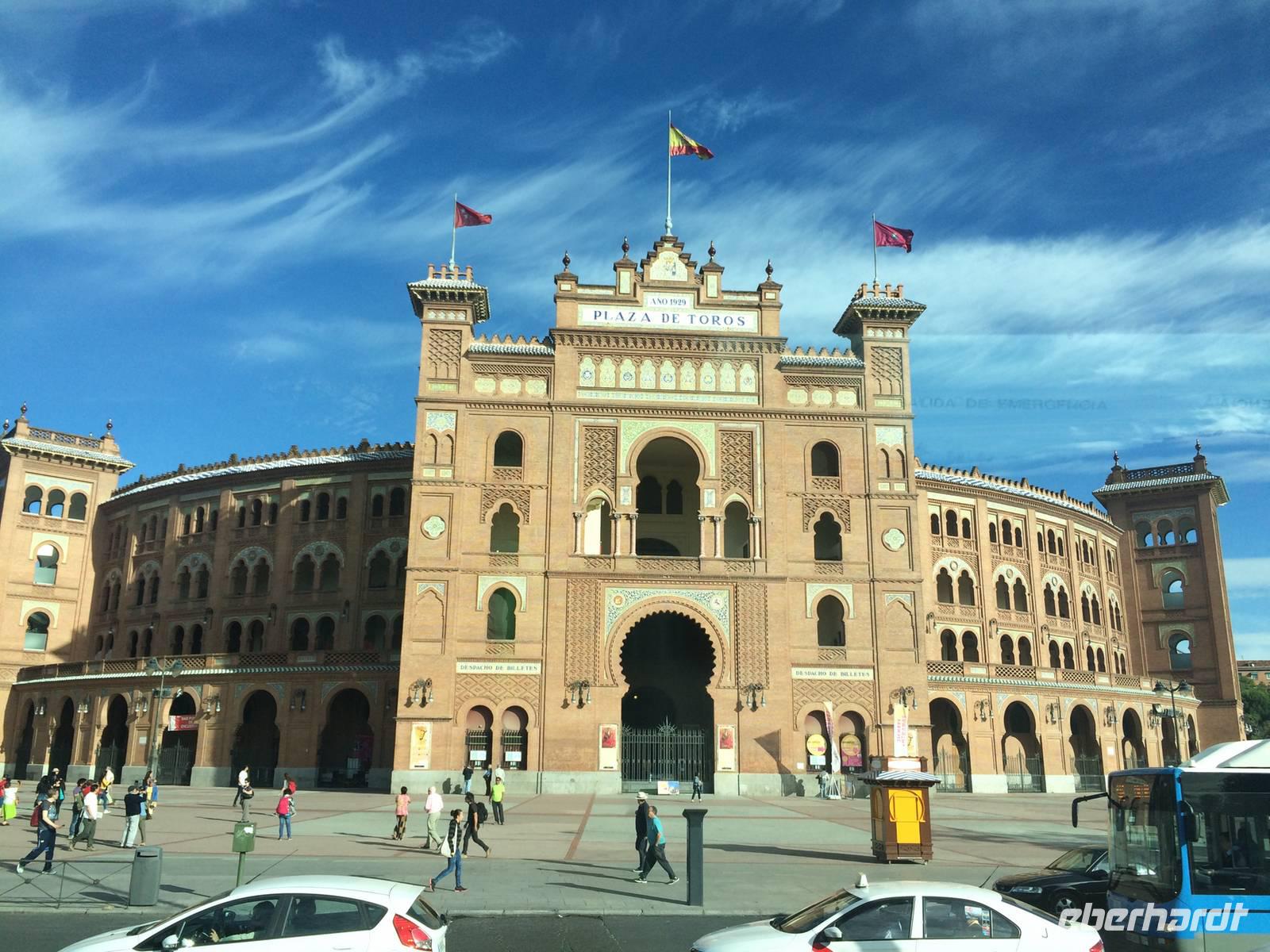Als erstes inspizieren wir den Parque del Retiro am Passeo de Prado. Der Park ging aus den Schlossanlagen des Königs Philipp II hervor, die später weiter gestaltet und erweitert wurden. Nach der Zerstörung während den napoleonischen Kriegen wurde das Schloss nicht wieder erichtet, aber uns blebit heute eine besonders schöne grüne Lunge von Madrid. Die 125 Hektar können wir nicht an dem Tag ablaufen, aber einige Eindrücke gewinnen von den 15.000 Bäumen wie ausgefallen zugeschnittene Zypressen und riesen Pinien. Weiter geht es zum Stierkampfarena Monumental de Las Ventas, die im Jahre 1931 eingeweiht wurde und fast 24.000 Zuschauer beherbergen kann und somit die größte Stierkampfarena der Welt. Der Festplatz hat einen Durchmesser von 60 Metern. In Neomudejarstil vereint sie verschiedene Elemente der Romantik, Renaissance und Gothik mit Elementen aus der islamischen Architektur wie riesige Hufeisenbögen, die Verwendung von roten Backsteinen und handbemalten Kacheln. - Ein wahrlich imposantes Gebäude! Das komplette Gegenteil ist das Fußballstadion Santiago Bernabéu, in dem Real Madrid trainiert und das über 80.000 Zuschauer bei den Spielen mitfeuern lässt. Auf der Siegerliste stehen viele europäische und internationale Titel.