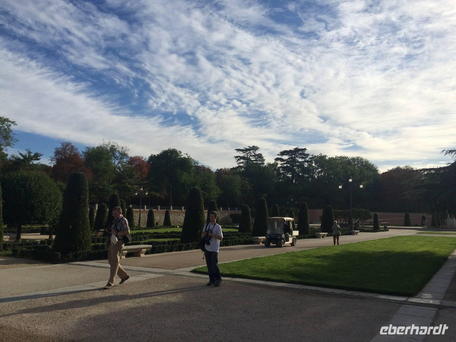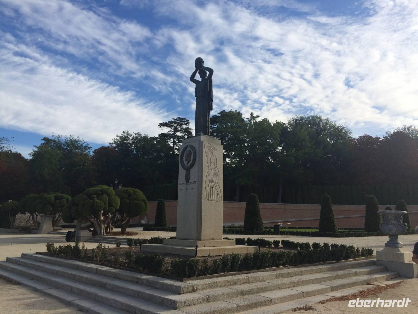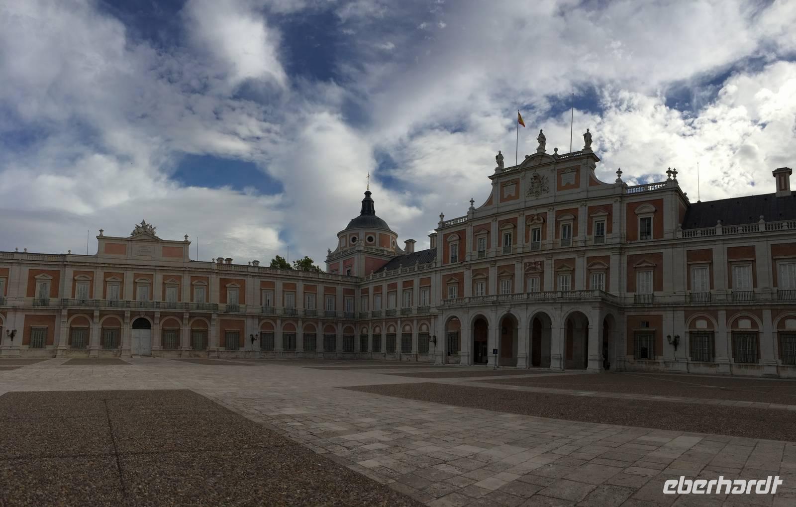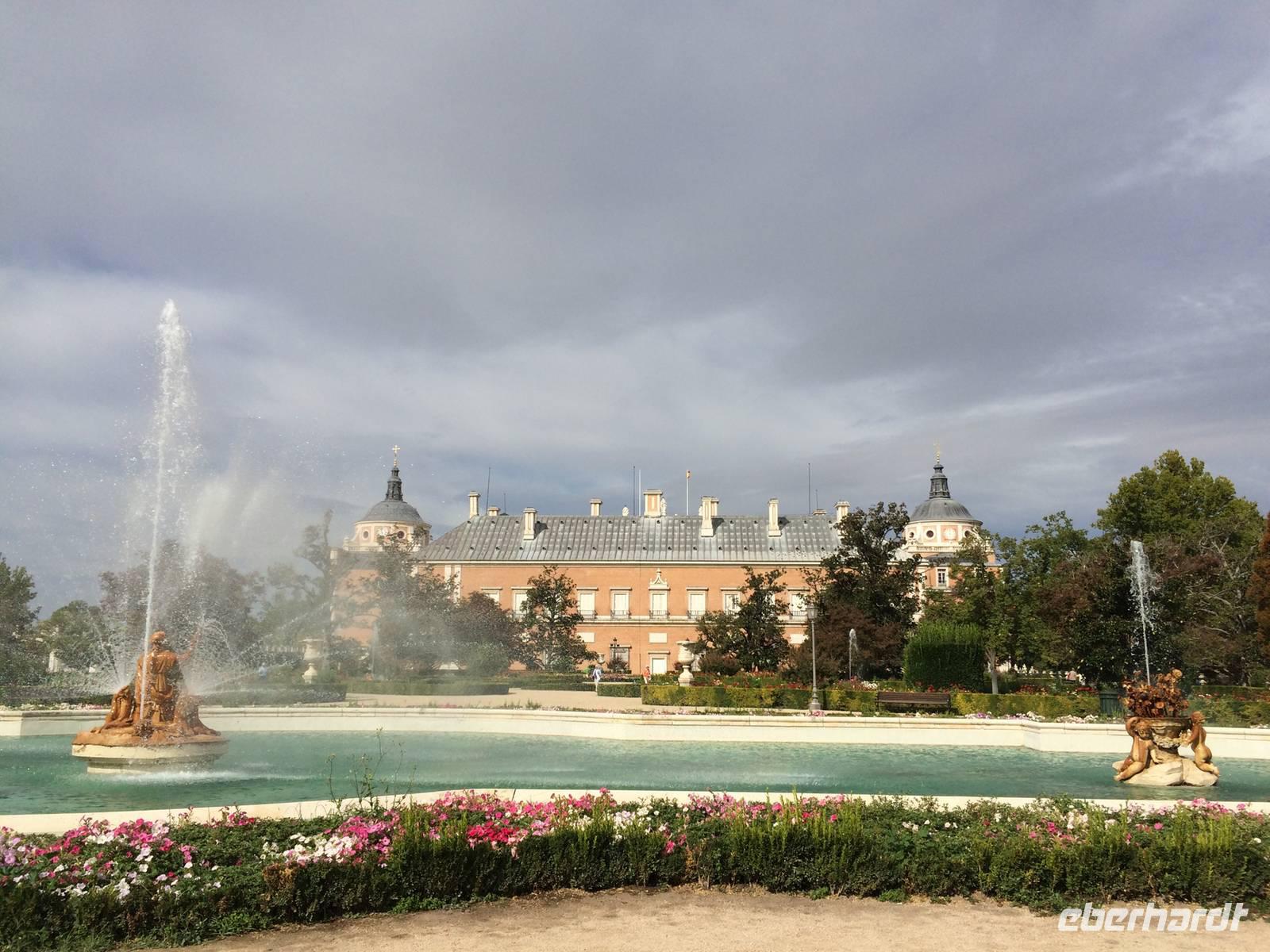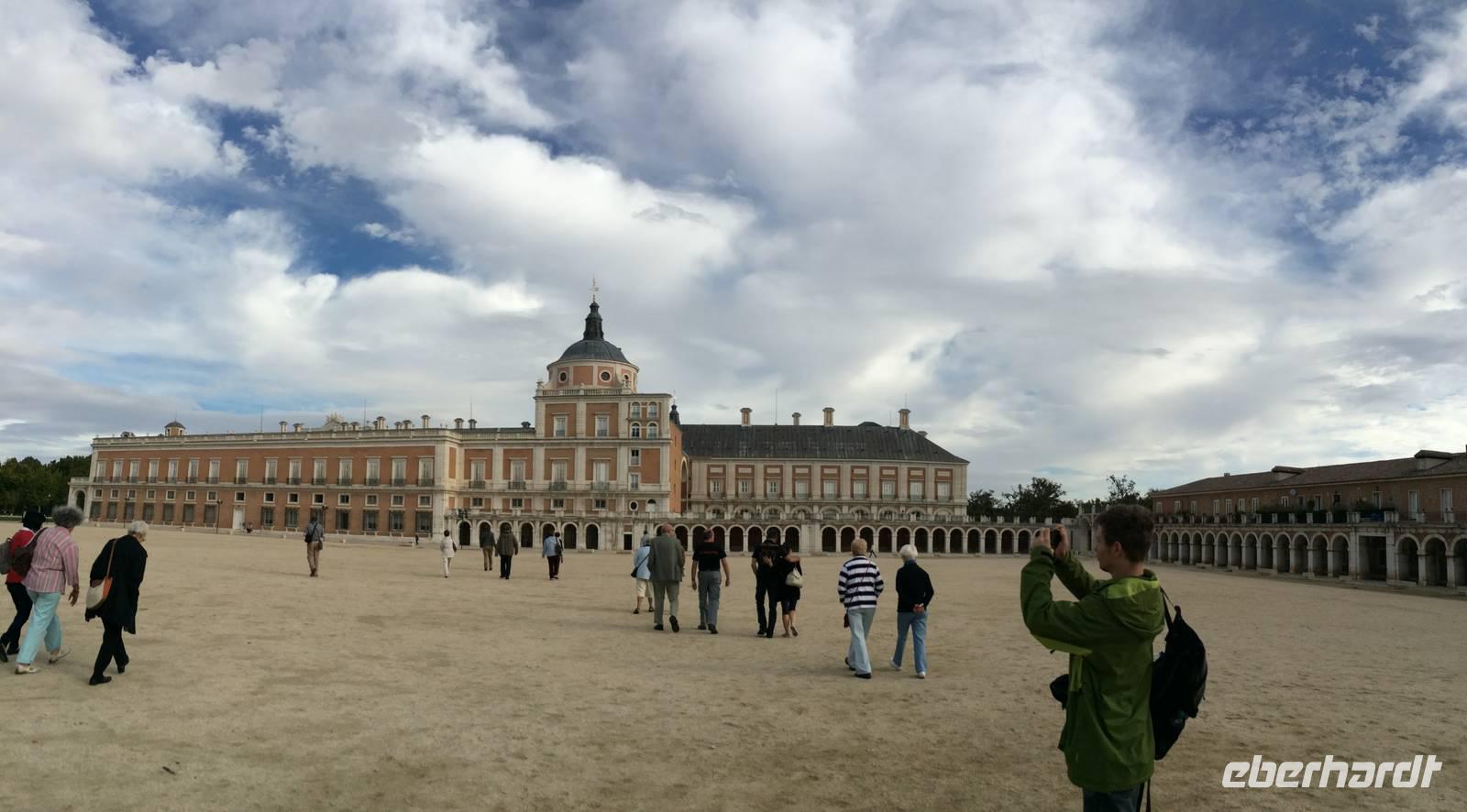 Bei strahlendem Sonnenschein starten wir in einen spannenden Tag. Unser heutiger Ausflug führt uns in die südliche Gegend von Madrid. Idyllisch in einem bewaldeten Wald haben sich die Spanischen Könige in Aranjuez eine Sommerresidenz errichten lassen. Der Palacio Real gilt aufgrund seiner Lage an einer Biegung des Flusses Tajo und der Kombination verschiedener Baustile als eindrucksvolle Sehenswürdigket, die wir uns näher ansehen möchten. Auf dem weitläufigen Plaza de Armas schießen ein paar Erinnerungsfotos, beginnen wir mit der Besichtigung. Beim Bau wurde sehr auf den Einklang zwischen Natur und Mensch, Verlauf des Wassers und die Gartengestaltung geachtet. 2001 erklärte die UNESCO diese Anlage als Weltkulturlandschaft.