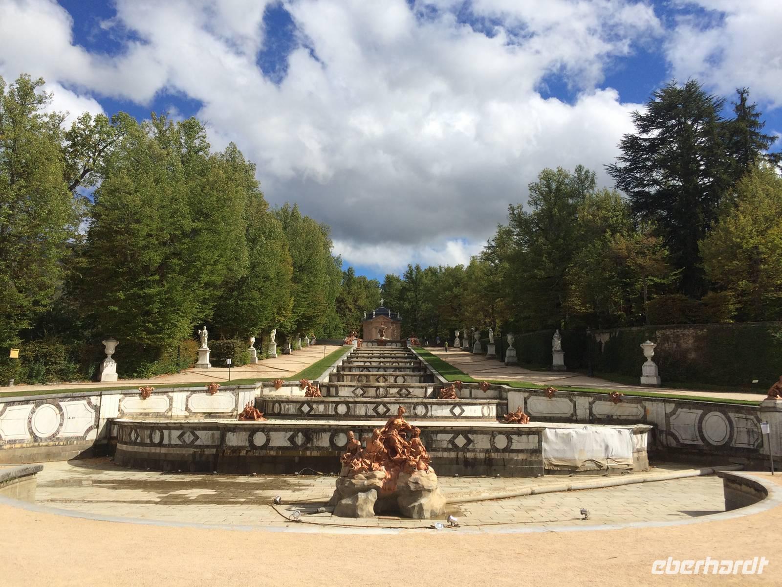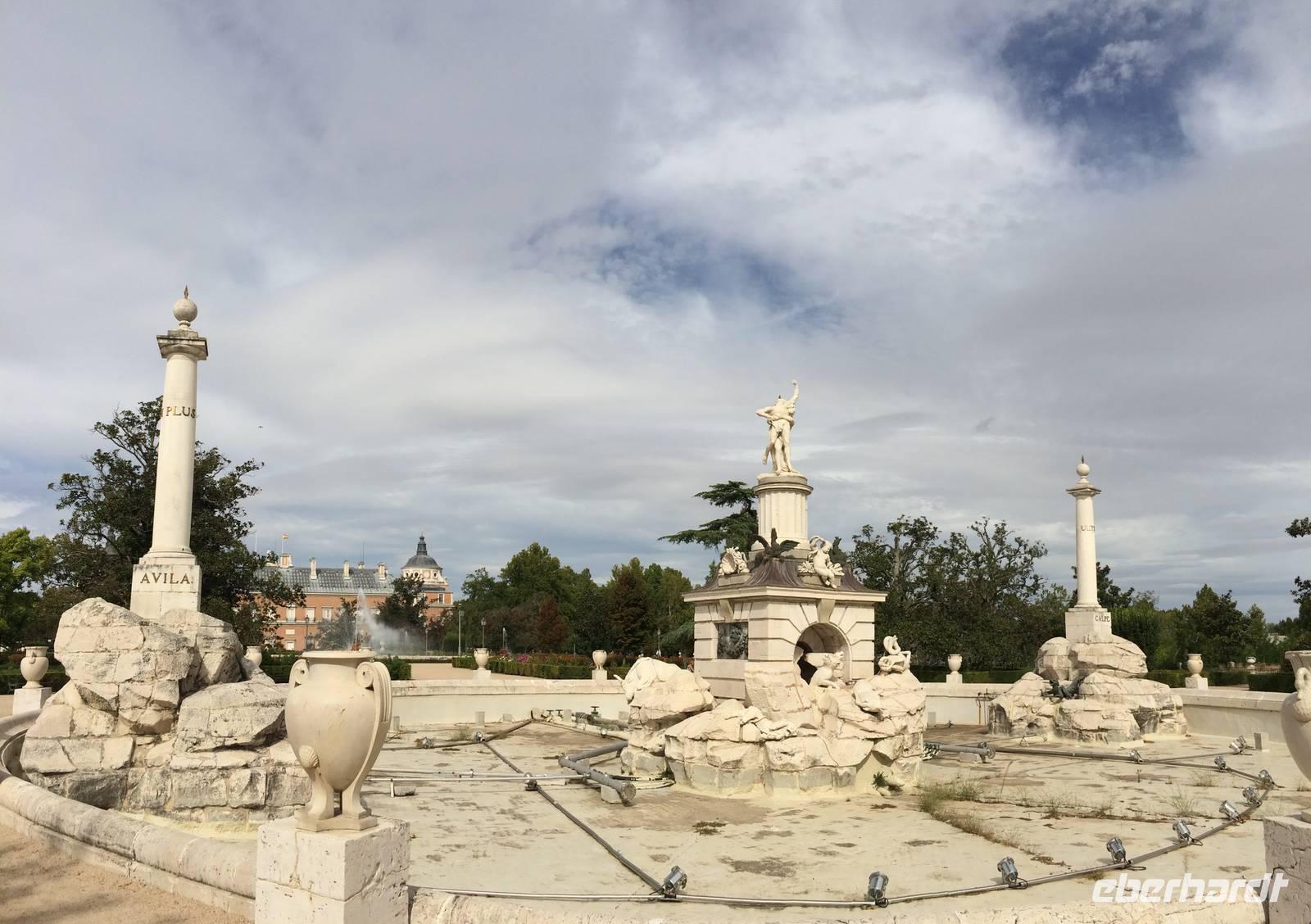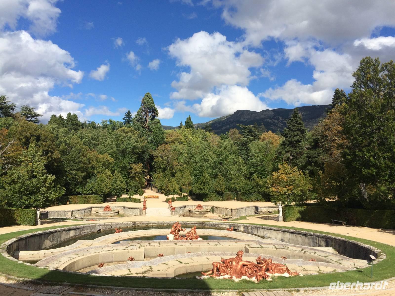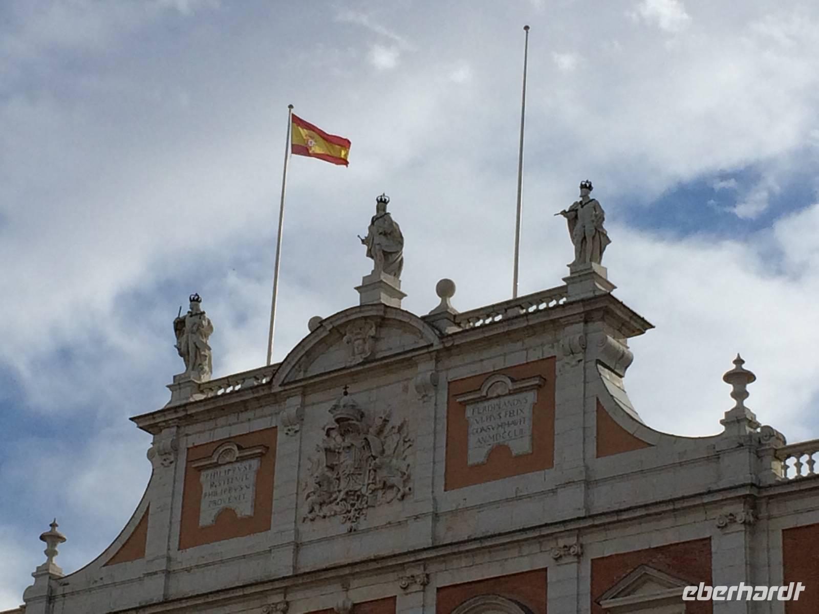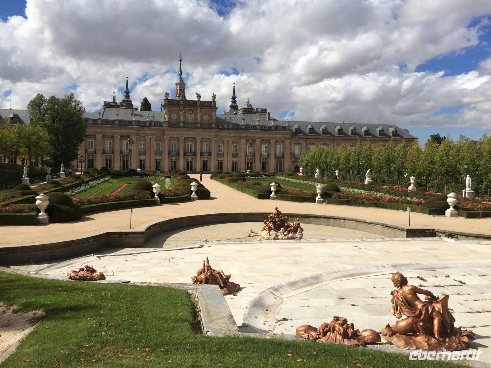Bei strahlendem Sonnenschein starten wir in einen spannenden Tag. Unser heutiger Ausflug führt uns in die südliche Gegend von Madrid. Idyllisch in einem bewaldeten Wald haben sich die Spanischen Könige in Aranjuez eine Sommerresidenz errichten lassen. Der Palacio Real gilt aufgrund seiner Lage an einer Biegung des Flusses Tajo und der Kombination verschiedener Baustile als eindrucksvolle Sehenswürdigket, die wir uns näher ansehen möchten. Auf dem weitläufigen Plaza de Armas schießen ein paar Erinnerungsfotos, beginnen wir mit der Besichtigung. Beim Bau wurde sehr auf den Einklang zwischen Natur und Mensch, Verlauf des Wassers und die Gartengestaltung geachtet. 2001 erklärte die UNESCO diese Anlage als Weltkulturlandschaft.