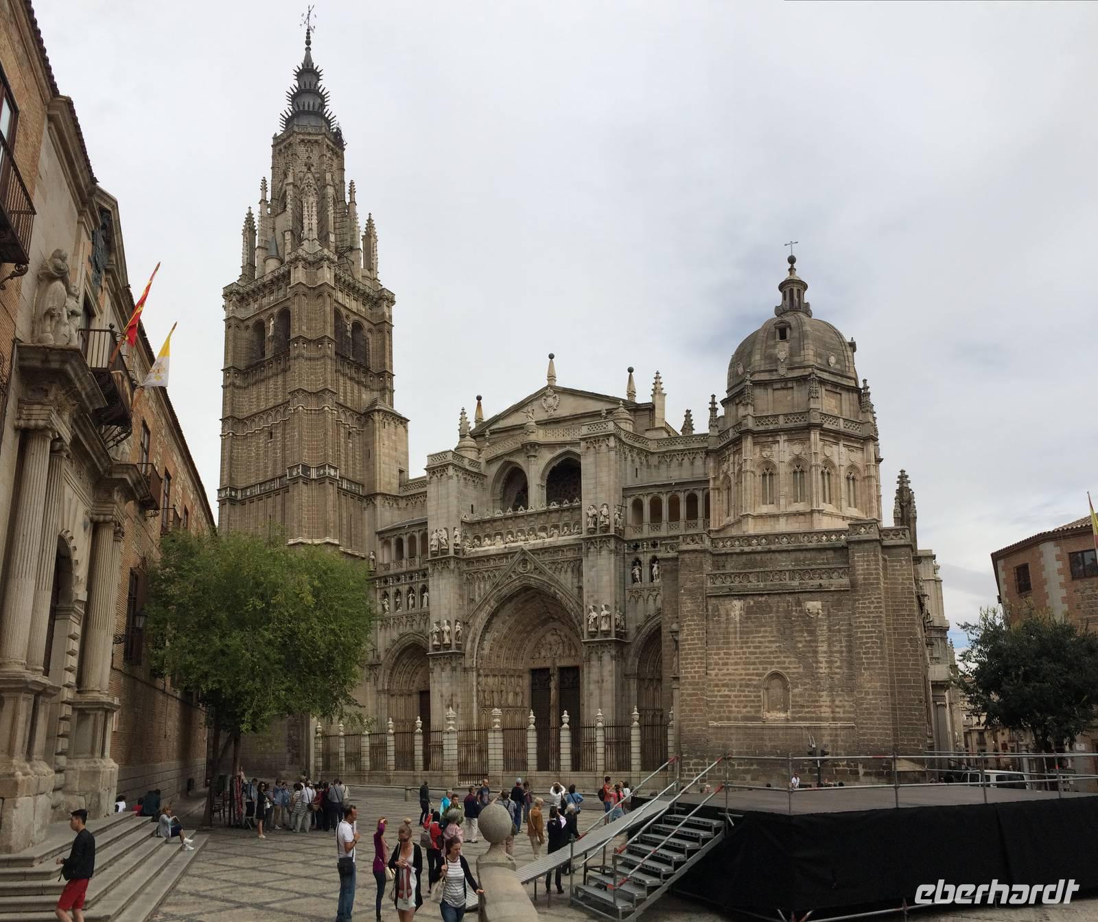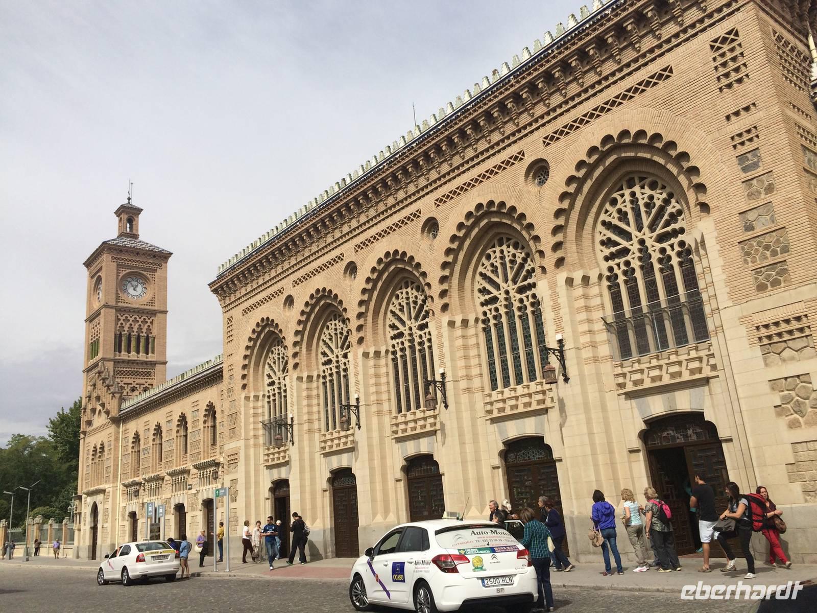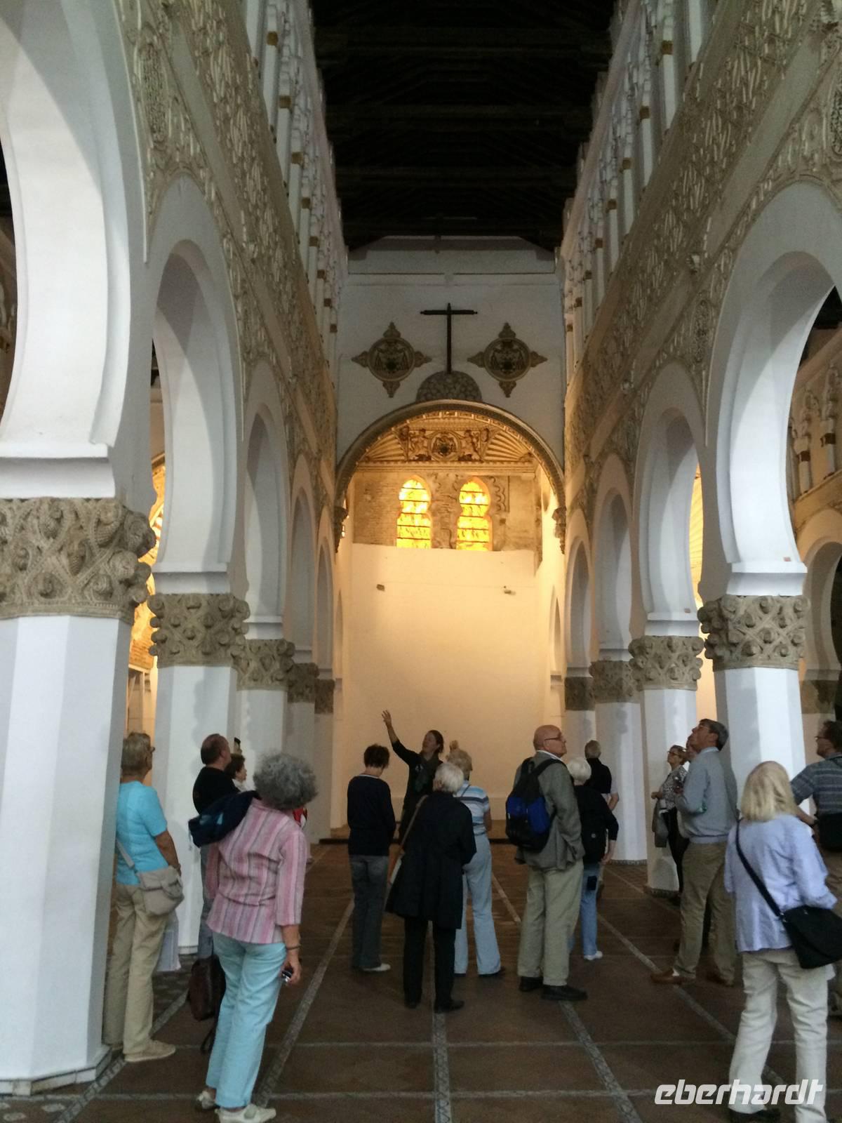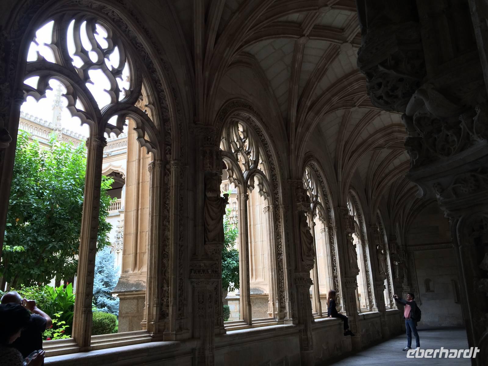 Weil hier über Jahrhunderte hinweg Christen, Muslime und Juden zusammenlebten, ist Toledo auch als "Stadt der drei Kulturen" bekannt. Wir umrunden einmal die Stadt bei einer Panoramatour und werfen einen himmlischen Blick auf die Dächer der Altstadt und über den Tajo, der sich tief in das Hochland eingeschnitten. Ein Künstler, den wir auf dem Aussichtspunkt treffen, malt sogar alle Turmspitzen genaustens auf seine Gemälde ab. Nun wollen wir auch hinter den Mauern einen Blick oder zwei der Stadt haben und finden ein künstlerisches sowie kulturelles Erbe aus Kirchen, Palästen, Festungen, Moscheen und Synagogen. Kein Wunder also, dass Toledo auch die Hauptstadt von Kastilien-La Mancha ist. Viele Gäste haben bereits über Toledo und El Greco gelesen. Live alles zu erleben ist natürlich umso schöner. Eines der Wahrzeichen der Stadt, dem Arco de la Sangre, lernen wir beim Stadtbummel kennen. Der aus Cervantes "Don Quijote" bekannte Bogen mit dem dahinter liegenden Alcazar (Palast) ist für uns ein perfektes Fotomotiv. Als nächstes sehen wir die Kathedrale, ein vorblidliches Werk für spanische Gotik. Sie wurde über eine moslimische Moschee gebaut und besitzt zwei Türme, doch eine davon wurde aufgrund von Geldmangel nicht zu Ende gebaut. Im El Greco-Museum entdecken wir ein berühmtes Bild von El Greco "Das Begräbnis vom Graf Orgaz". Anschließend besichtigen wir die Synagog im Judenviertel "Santa Mara La Blanca". Einen letzten kirchlicher Stopp für den Tag legen wir in der Kirche Juan de los Reyes ein, die für Hochzeiten wegen der Helligkeit sehr beliebt ist.