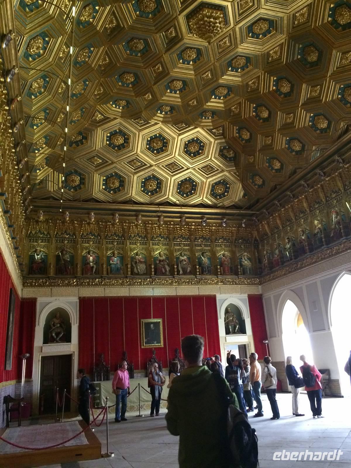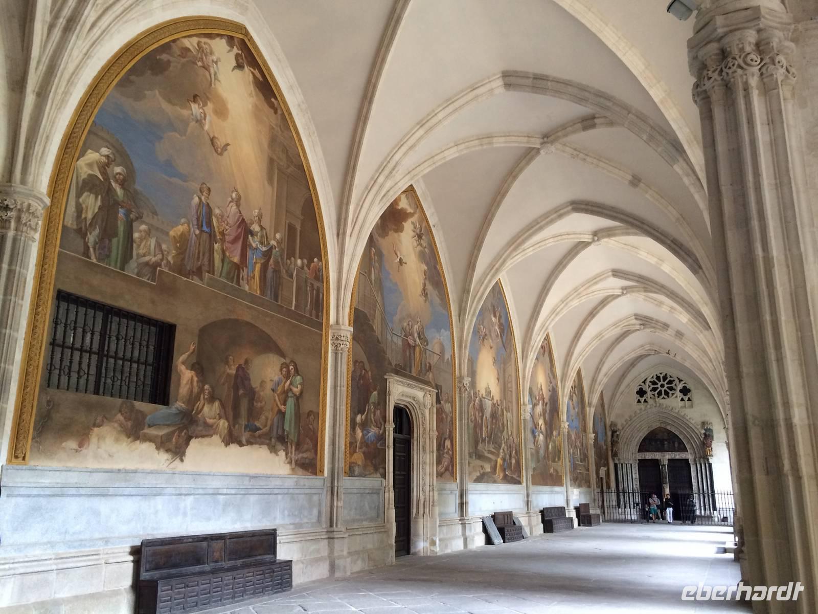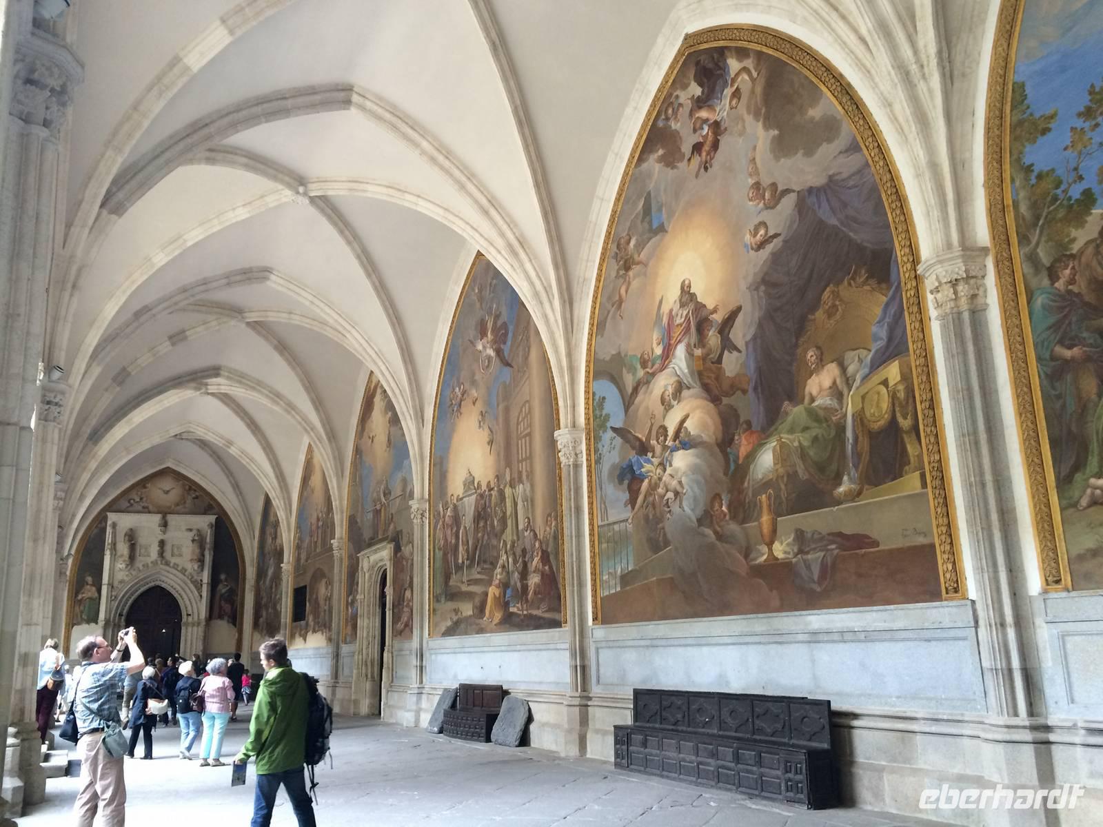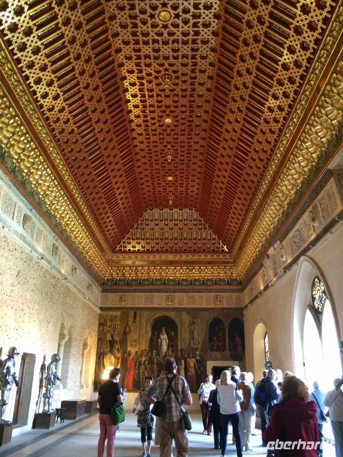 Schon lange Zeit, bevor Madrid überhaupt zur Hauptstadt erkoren wurde, ließen die Araber eine Festung um Toledo bauen, um sich vor dem Vordringen der Christen zu schützen. Später nutzten Karl I und sein Sohn Philipp II dieswe Wehranlage als permanente Residenz. Seitdem wurde die Anlage um- und ausgebaut. Wir genießen Einblicke in viele der 30.000 schmucken Innenräume. Besonders zu bemerken sind unter anderem der Tronsaal mit einer vom berühmten Künstler Tiépolo bemalten Decke oder die Königliche Kapelle, in der eine große Sammlung von Streichinstrumenten des legendären Antonio Stradivari ausgestellt werden. Auch zahlreiche wertvolle Gemälde von Luis Morales, Velázquez oder Goya sind in den Räumlichkeiten zu bewundern.