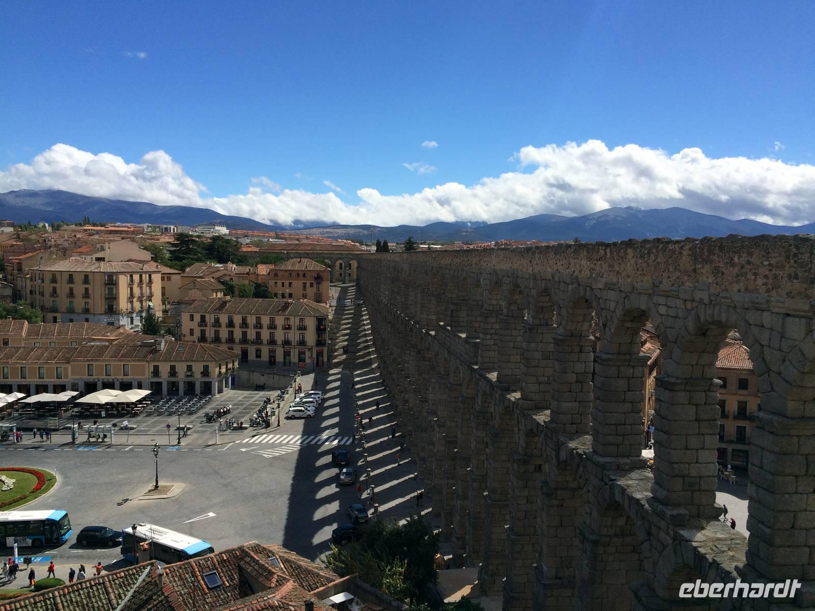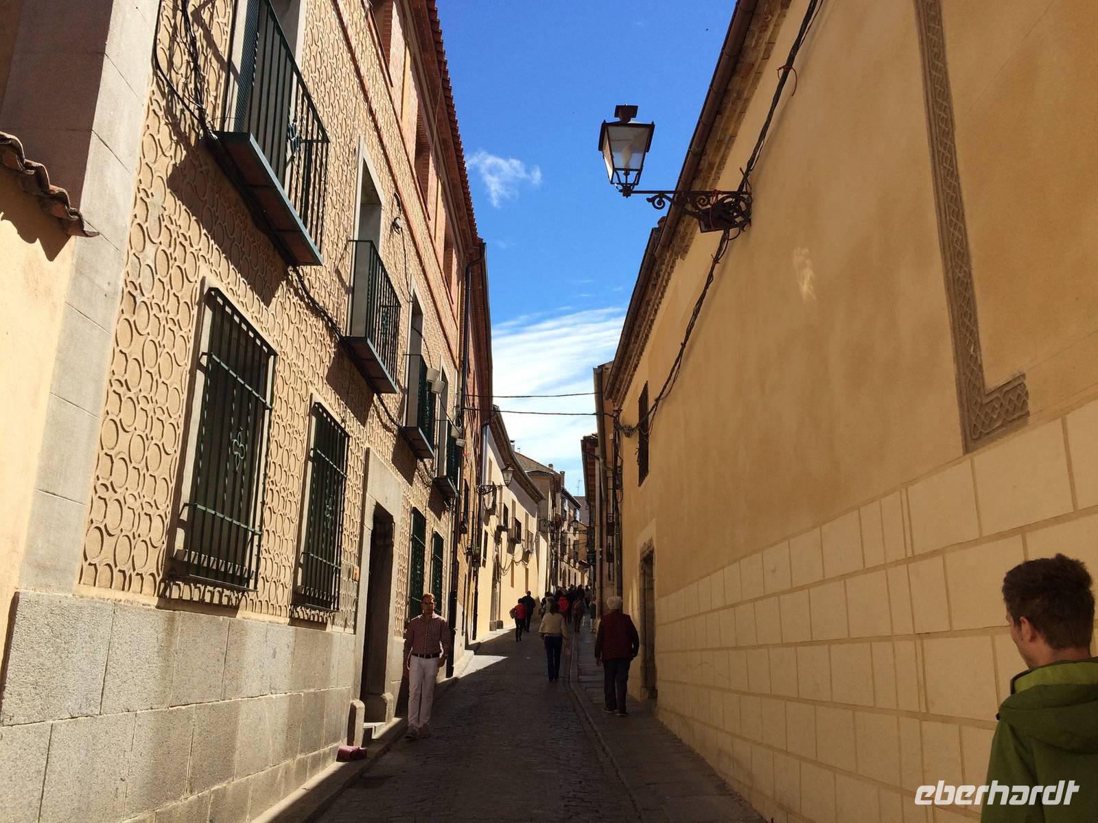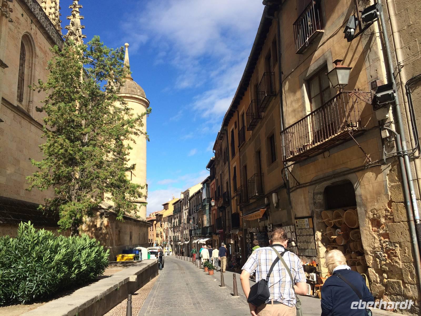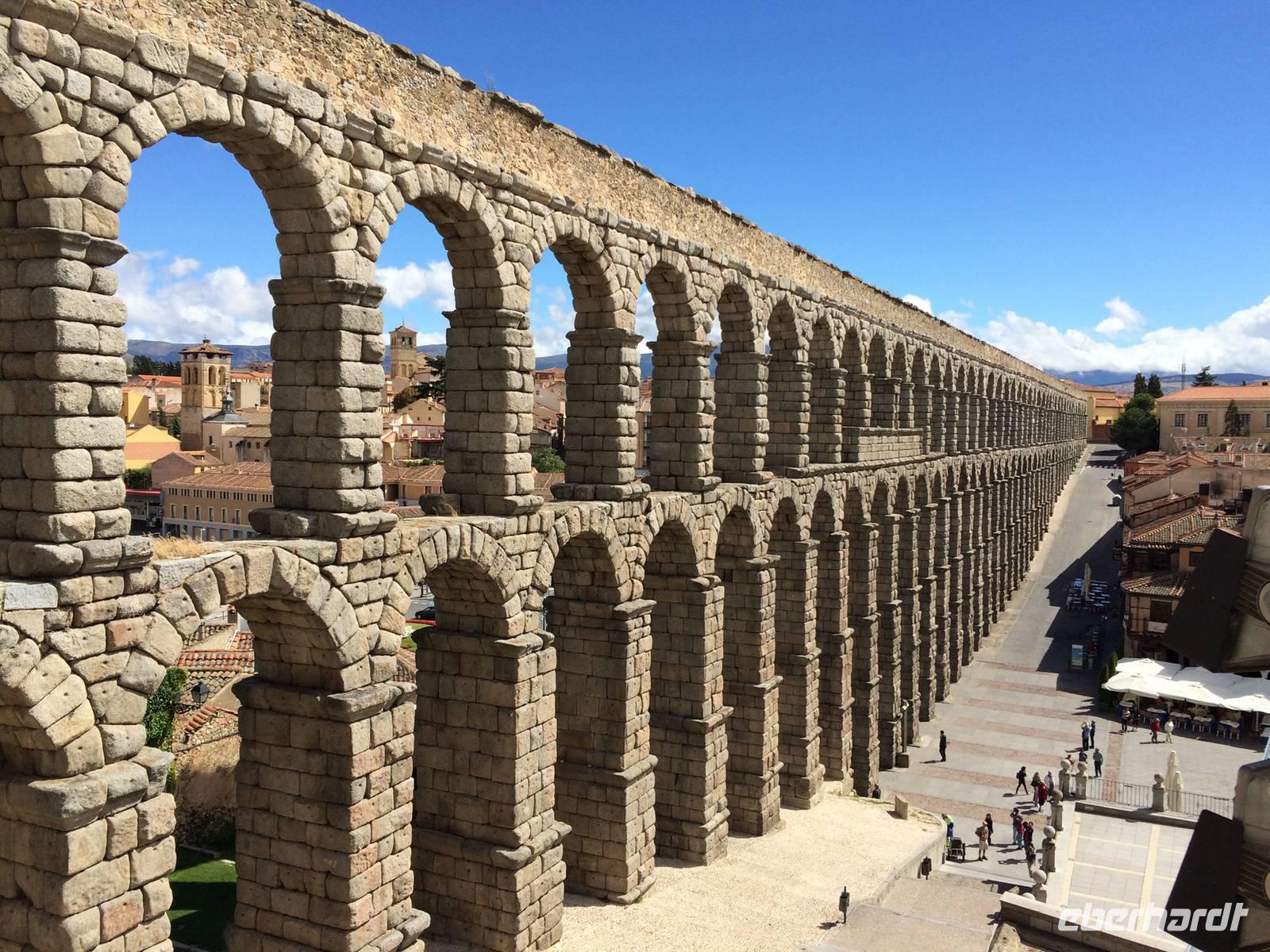 Ein aufregender Tag steht uns bevor. Es geh dieses Mal in das nördliche Umland von Madrid. Erstes Tagesziel: Segovia, die insbesondere für zahlreiche Kirchen aus romanischer Zeit Berühmtheit genießt. Aber noch bekannter ist das 28 Meter hohe römische Aquädukt, welches eine majestätische Kulisse hinter der Altstadt bildet. Genüsslich spazieren wir hinauf zum Alcazar von Segovia. Einige lassen es sich noch besser gehen und lassen sich mit dem Taxi bergauf fahren Unsere Reiseleiterin Petra erzählt uns von der kulinarischen Spezialität der Stadt: Gebratenes Spanferkel. Mhmm... lecker, da läuft uns das Wasser im Mund... Nach einer Stadtbesichtigung mit wunderschöner Kathedrale und den vielen Häusern mit verzierten Wänden (Mudejar-Stil), die es nur hier in Segovia in der Menge gibt, kehren wir ein in einer kleinen Stube eines Delikatessenladens. Anh lädt unsere Gäste ein, kleine Kostproben wie Chorizo (Paprika-Salamiwurs), Käse, Olivenöl und Kekse zu kosten. Buen provecho! Guten Apetit!
