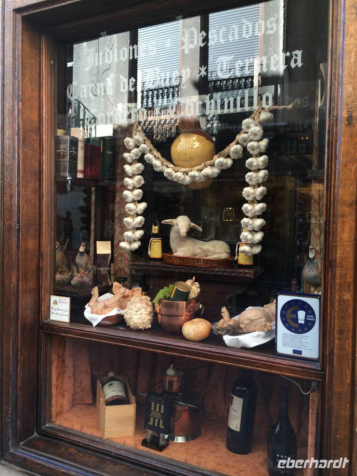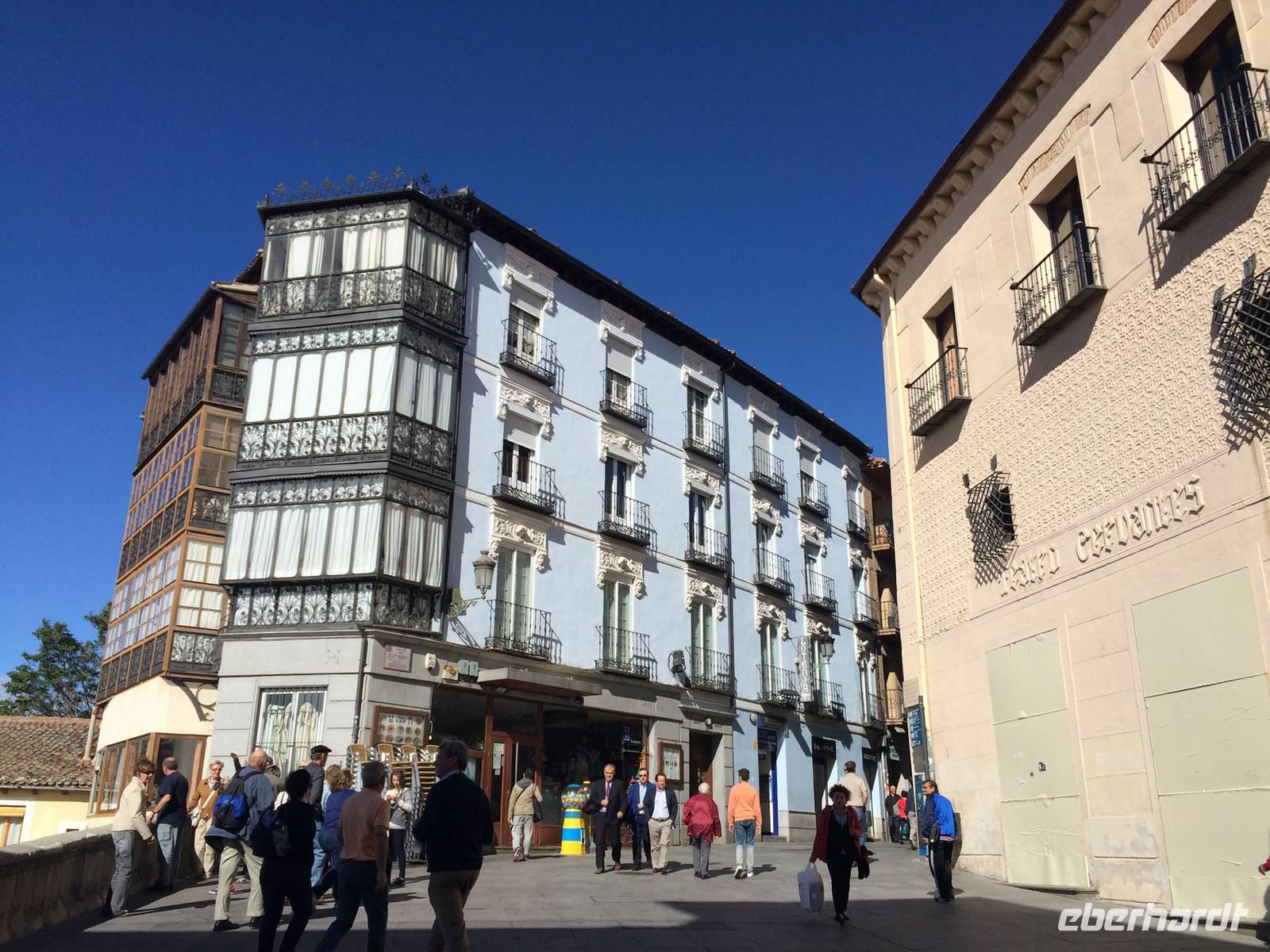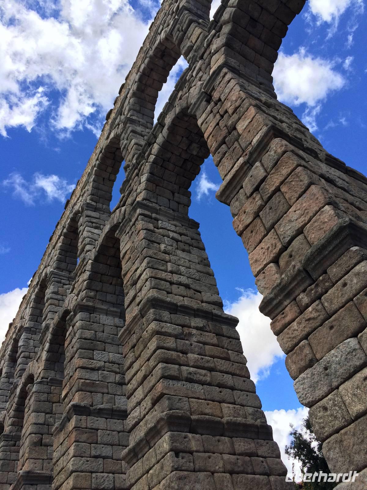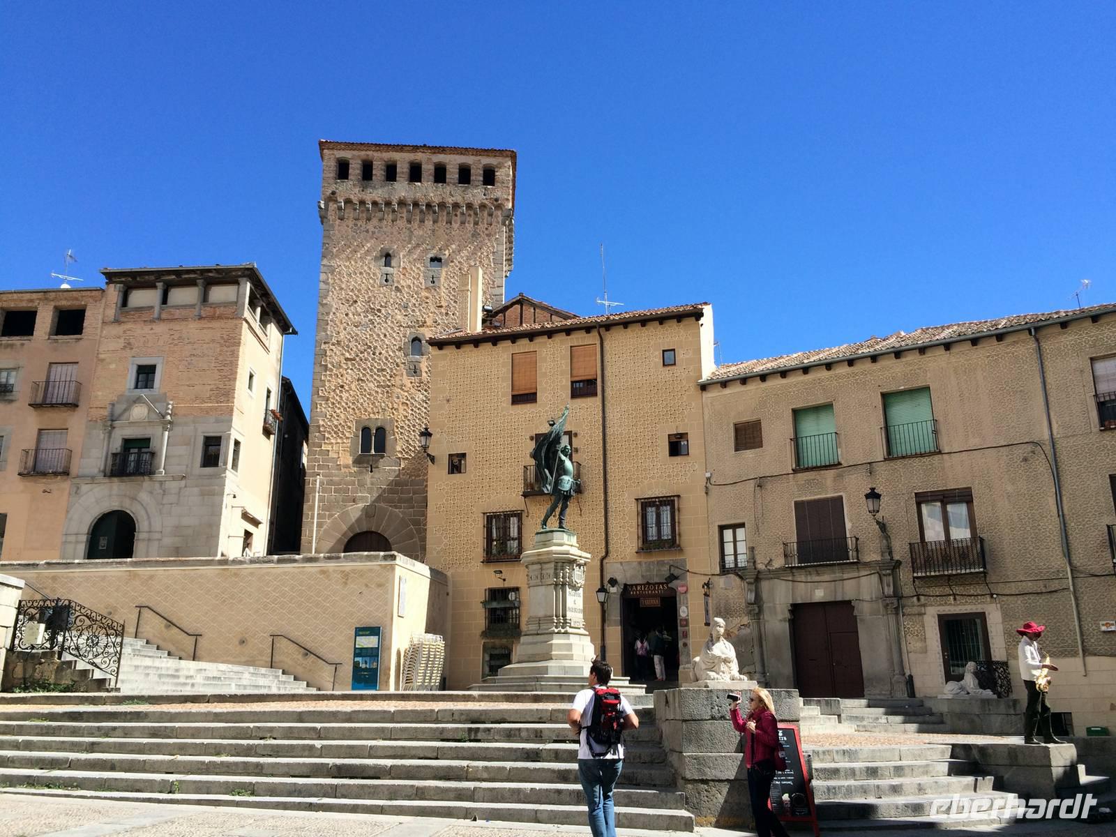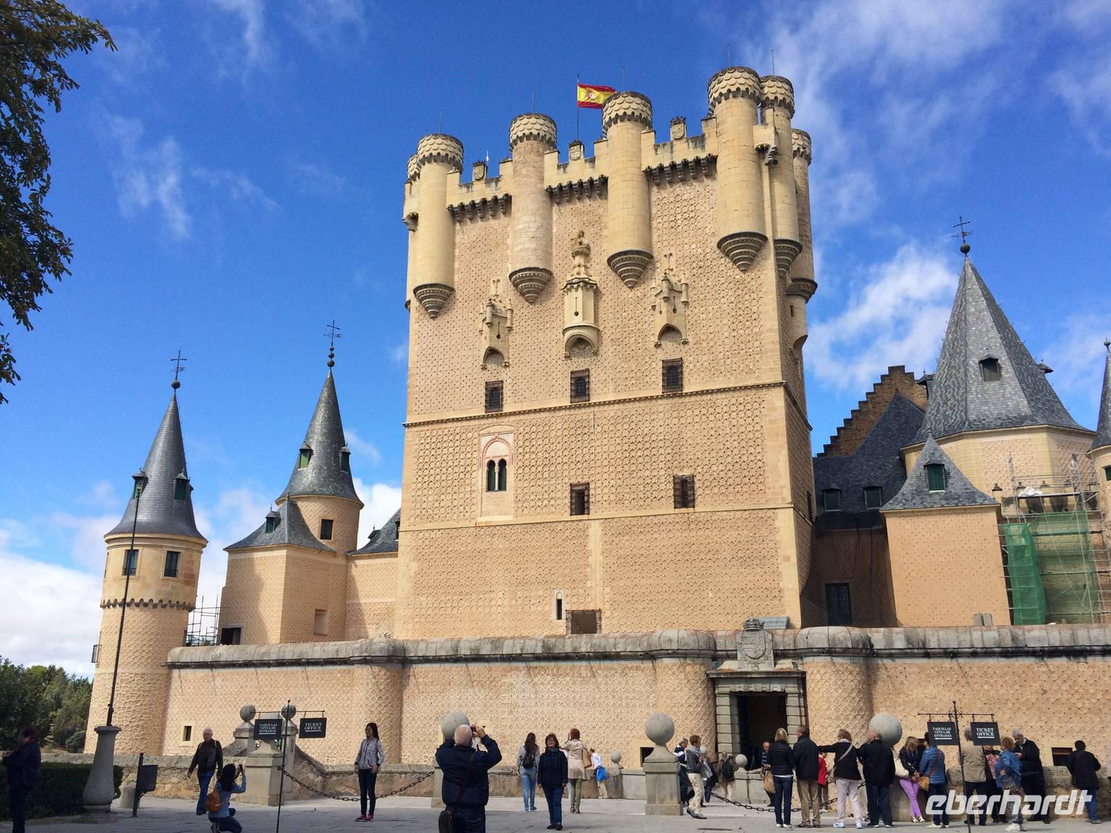 Ein aufregender Tag steht uns bevor. Es geh dieses Mal in das nördliche Umland von Madrid. Erstes Tagesziel: Segovia, die insbesondere für zahlreiche Kirchen aus romanischer Zeit Berühmtheit genießt. Aber noch bekannter ist das 28 Meter hohe römische Aquädukt, welches eine majestätische Kulisse hinter der Altstadt bildet. Genüsslich spazieren wir hinauf zum Alcazar von Segovia. Einige lassen es sich noch besser gehen und lassen sich mit dem Taxi bergauf fahren Unsere Reiseleiterin Petra erzählt uns von der kulinarischen Spezialität der Stadt: Gebratenes Spanferkel. Mhmm... lecker, da läuft uns das Wasser im Mund... Nach einer Stadtbesichtigung mit wunderschöner Kathedrale und den vielen Häusern mit verzierten Wänden (Mudejar-Stil), die es nur hier in Segovia in der Menge gibt, kehren wir ein in einer kleinen Stube eines Delikatessenladens. Anh lädt unsere Gäste ein, kleine Kostproben wie Chorizo (Paprika-Salamiwurs), Käse, Olivenöl und Kekse zu kosten. Buen provecho! Guten Apetit!