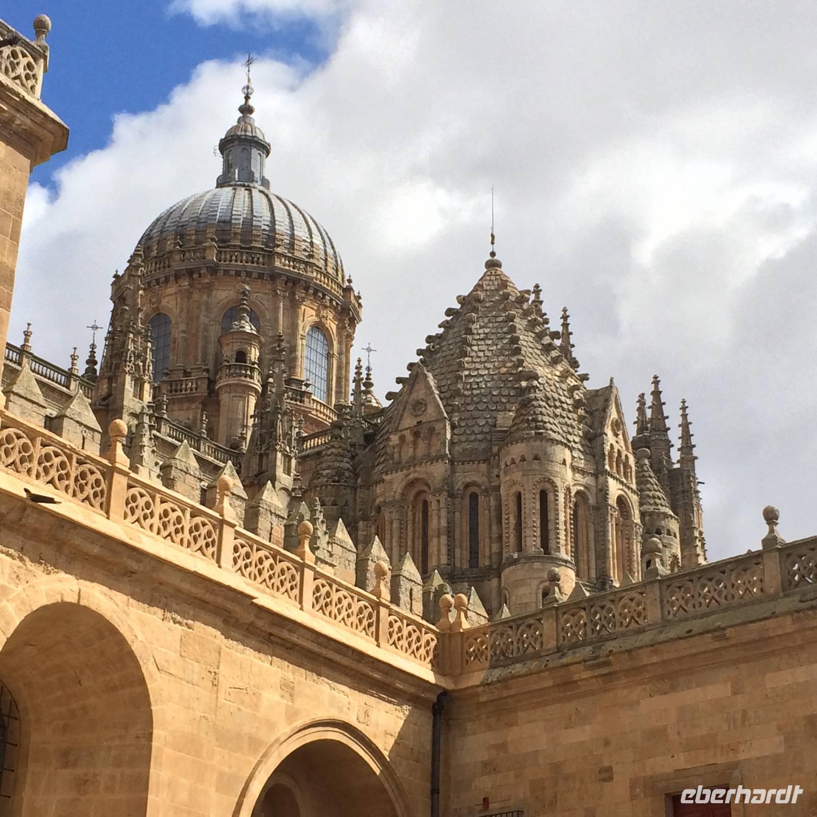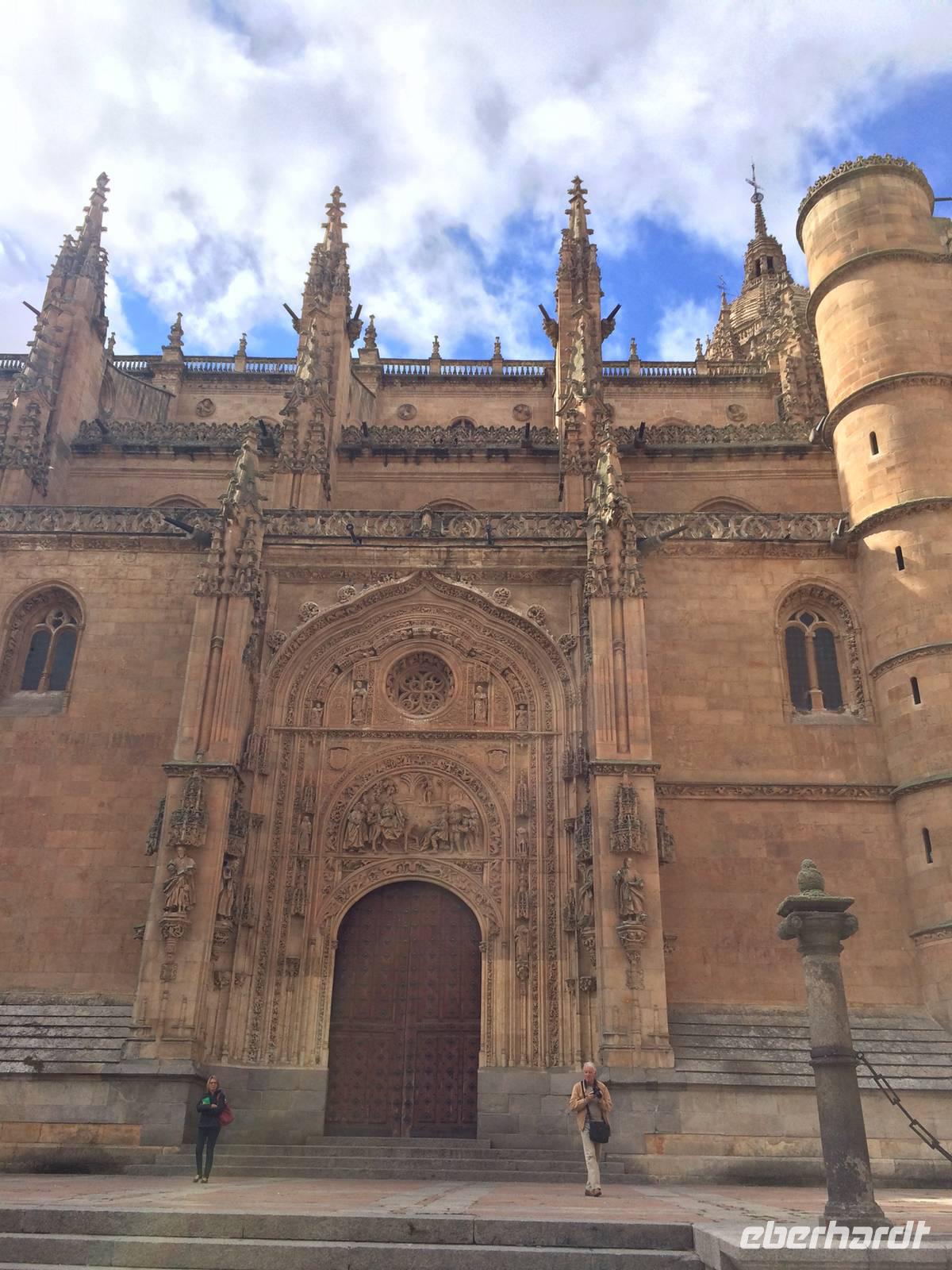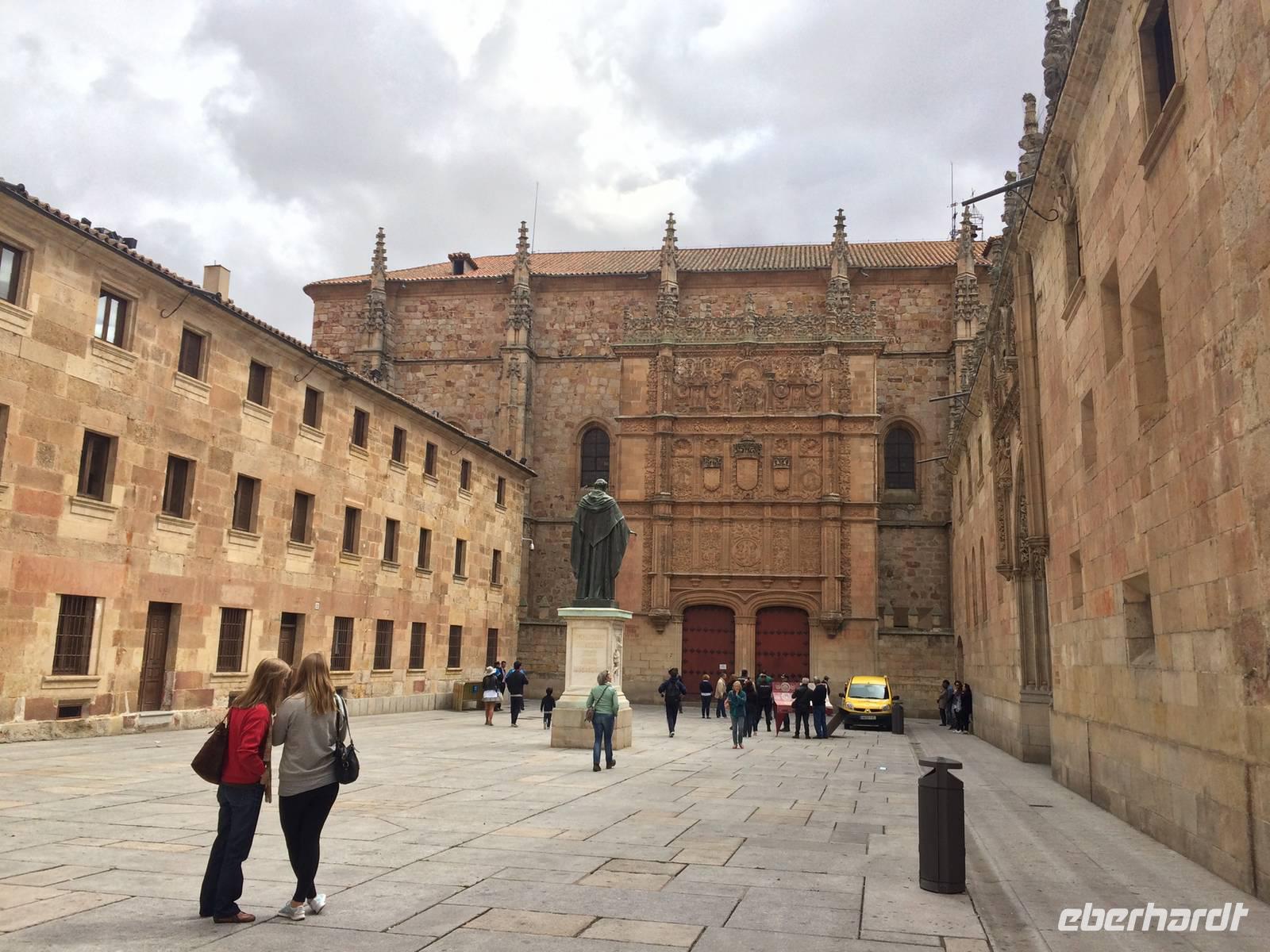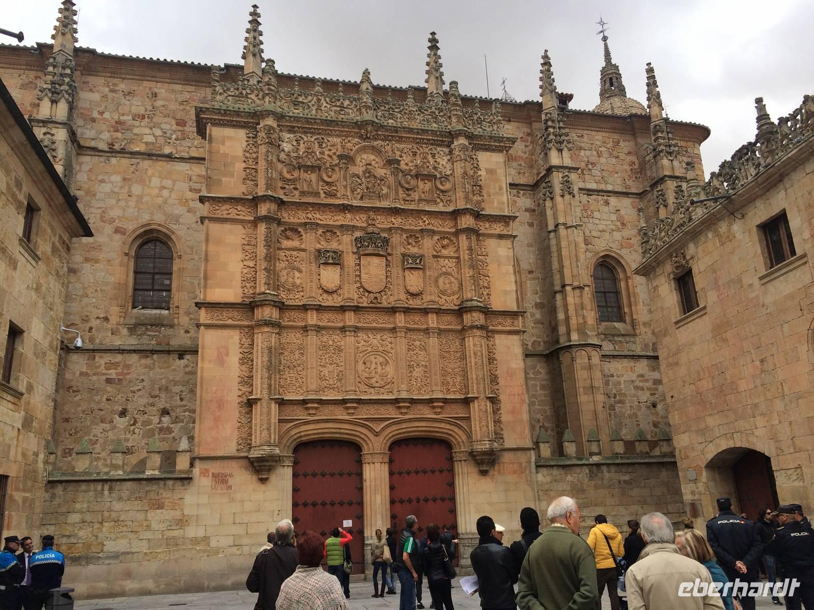 Das perfekte Wetter für eine Fahrt durch die schöne Landschaft von Kastilien-Leon. Wir bekommen die Außmaße und Schönheit des iberischen Scheidengebirges Sierra Guadarrama vor Augen zu sehen. Wir bewundern auch schon einen ersten Blick auf das Städtchen Ávila. Unser Ziel ist zunächst die Universitätenstadt Salamanca. Hier wird das reinste Castellano-Spanisch (Hochspanisch) im ganzen Land gesprochen und so kommen jährlich tausende Schüler und Studenten um die Weltsprache zu erlernen. Architektonisch hat sie ebenfalls jede Menge zu bieten. Die Gebäude verfügen über Fassaden aus goldfarbenen Sandsein, die dieser Stadt eine einzigartige Persönlichkeit verleiht. Die UNESCO hat Salamanca zum "Kulturgut der Menschheit" erklärt. Nach Besichtigung der Kathedrale spazieren wir zur ältesten Universität Spaniens, auch eine der ältesten in Europa. Dessen Fassade ist sehr prunkvoll geziert und wir halten Ausschau nach einem Frosch, den wir dann mit Müh letztendlich erblicken. Am Plaza Mayor beenden wir den Rundgang und streuen aus in die kleinen Bars, um etwas zu Trinken. In Salamanca ist es gängig, dass man zu jeder Getränkebestellung in jeder Bar eine Tapas kostenfrei erhält.