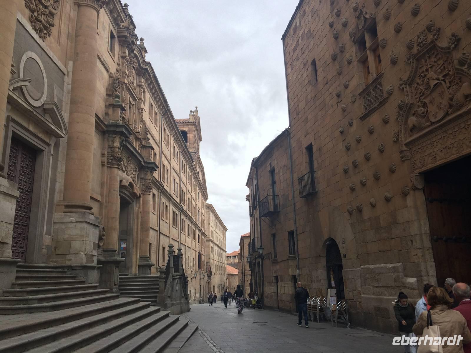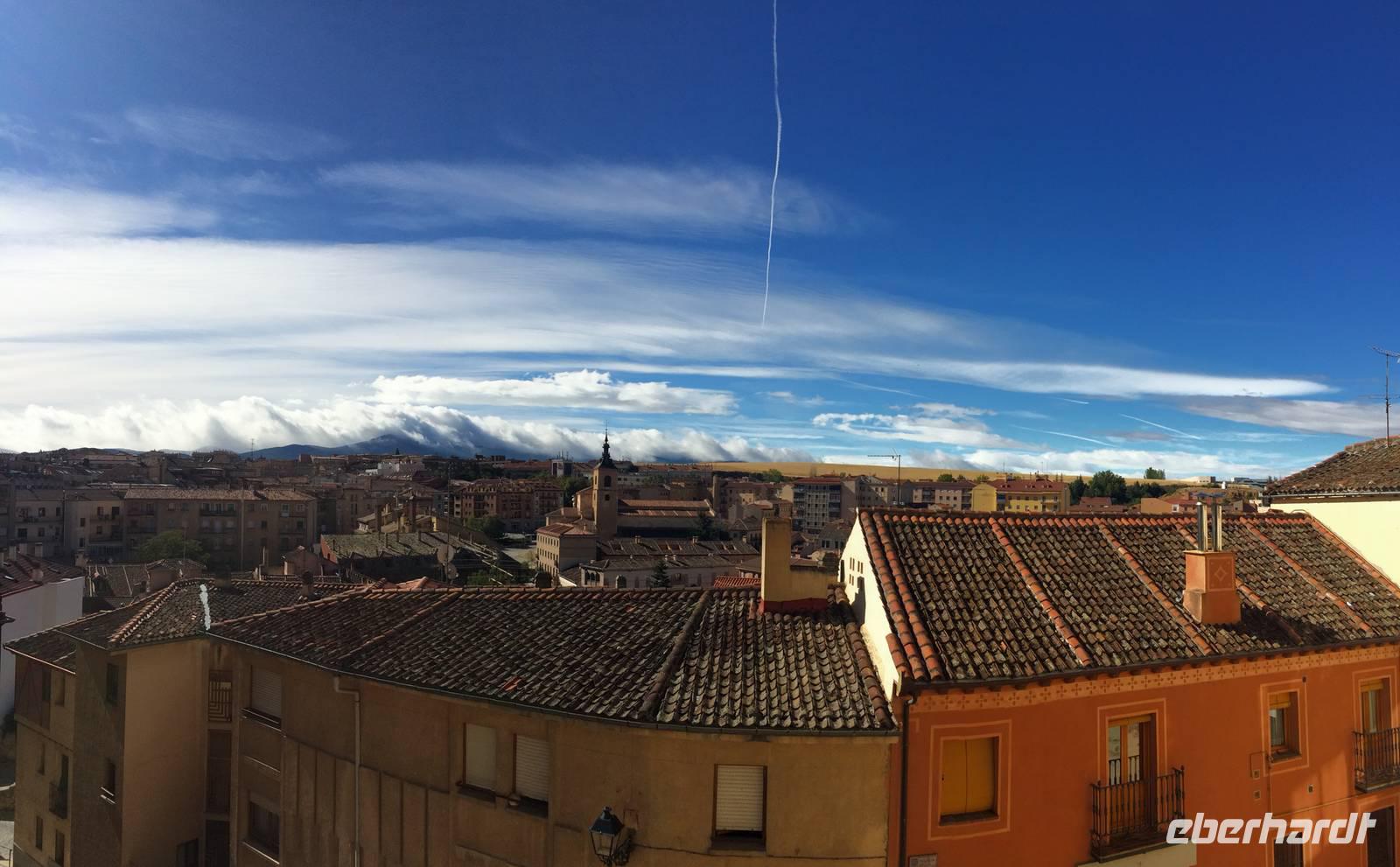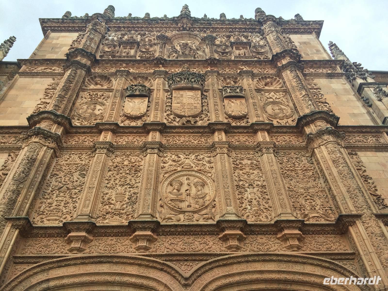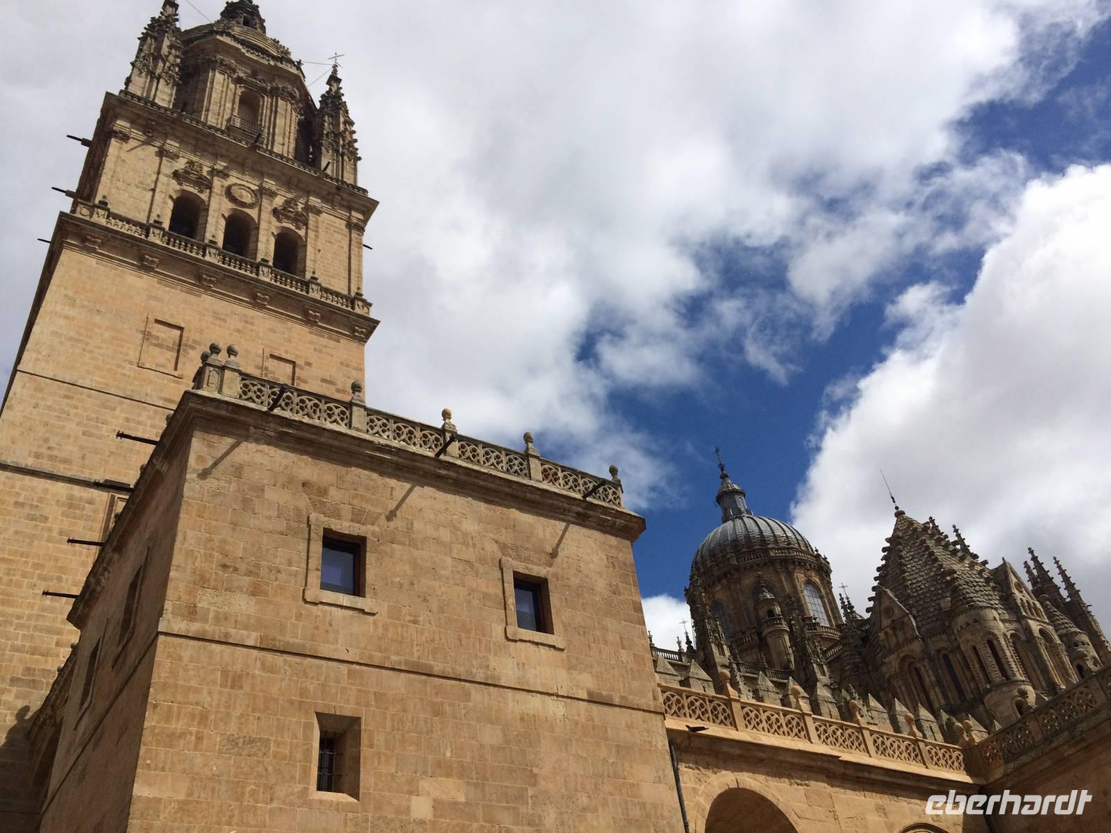 Das perfekte Wetter für eine Fahrt durch die schöne Landschaft von Kastilien-Leon. Wir bekommen die Außmaße und Schönheit des iberischen Scheidengebirges Sierra Guadarrama vor Augen zu sehen. Wir bewundern auch schon einen ersten Blick auf das Städtchen Ávila. Unser Ziel ist zunächst die Universitätenstadt Salamanca. Hier wird das reinste Castellano-Spanisch (Hochspanisch) im ganzen Land gesprochen und so kommen jährlich tausende Schüler und Studenten um die Weltsprache zu erlernen. Architektonisch hat sie ebenfalls jede Menge zu bieten. Die Gebäude verfügen über Fassaden aus goldfarbenen Sandsein, die dieser Stadt eine einzigartige Persönlichkeit verleiht. Die UNESCO hat Salamanca zum "Kulturgut der Menschheit" erklärt. Nach Besichtigung der Kathedrale spazieren wir zur ältesten Universität Spaniens, auch eine der ältesten in Europa. Dessen Fassade ist sehr prunkvoll geziert und wir halten Ausschau nach einem Frosch, den wir dann mit Müh letztendlich erblicken. Am Plaza Mayor beenden wir den Rundgang und streuen aus in die kleinen Bars, um etwas zu Trinken. In Salamanca ist es gängig, dass man zu jeder Getränkebestellung in jeder Bar eine Tapas kostenfrei erhält.