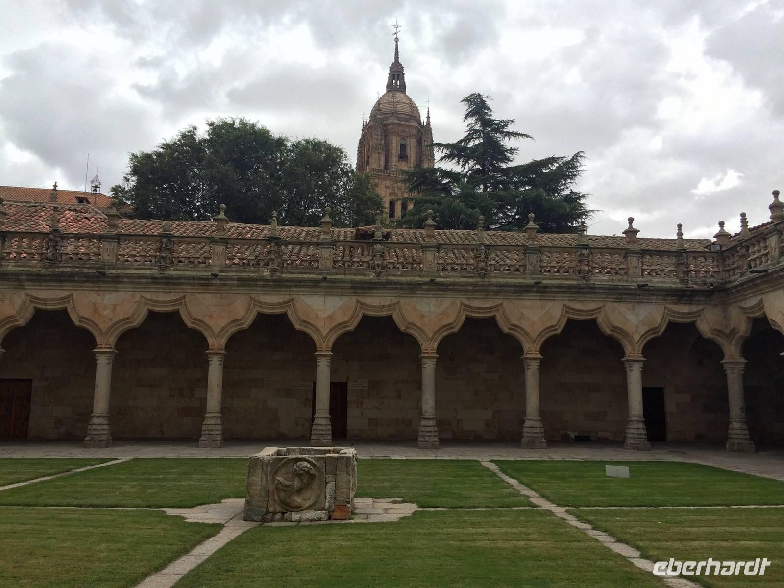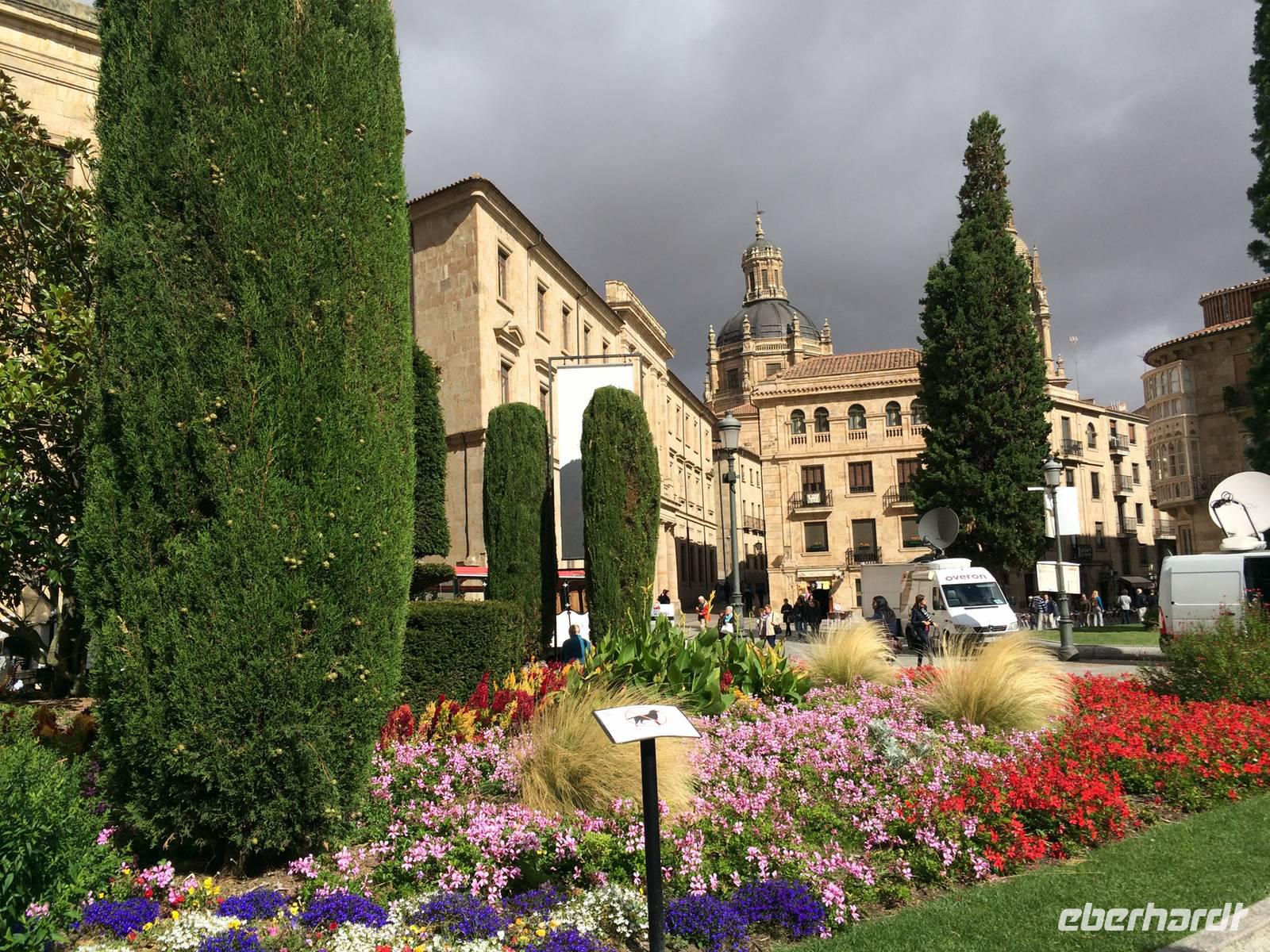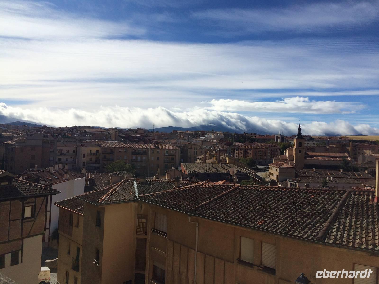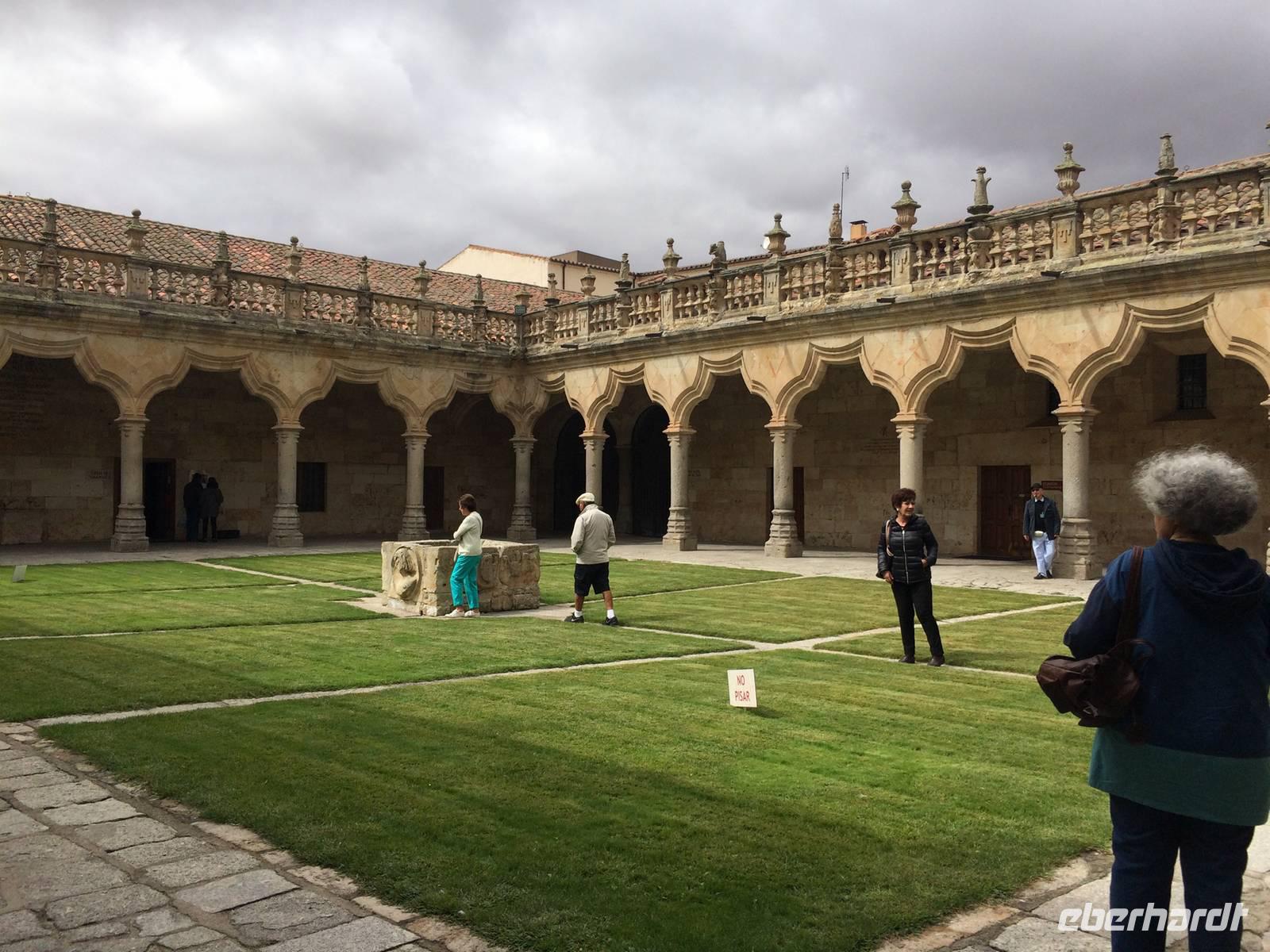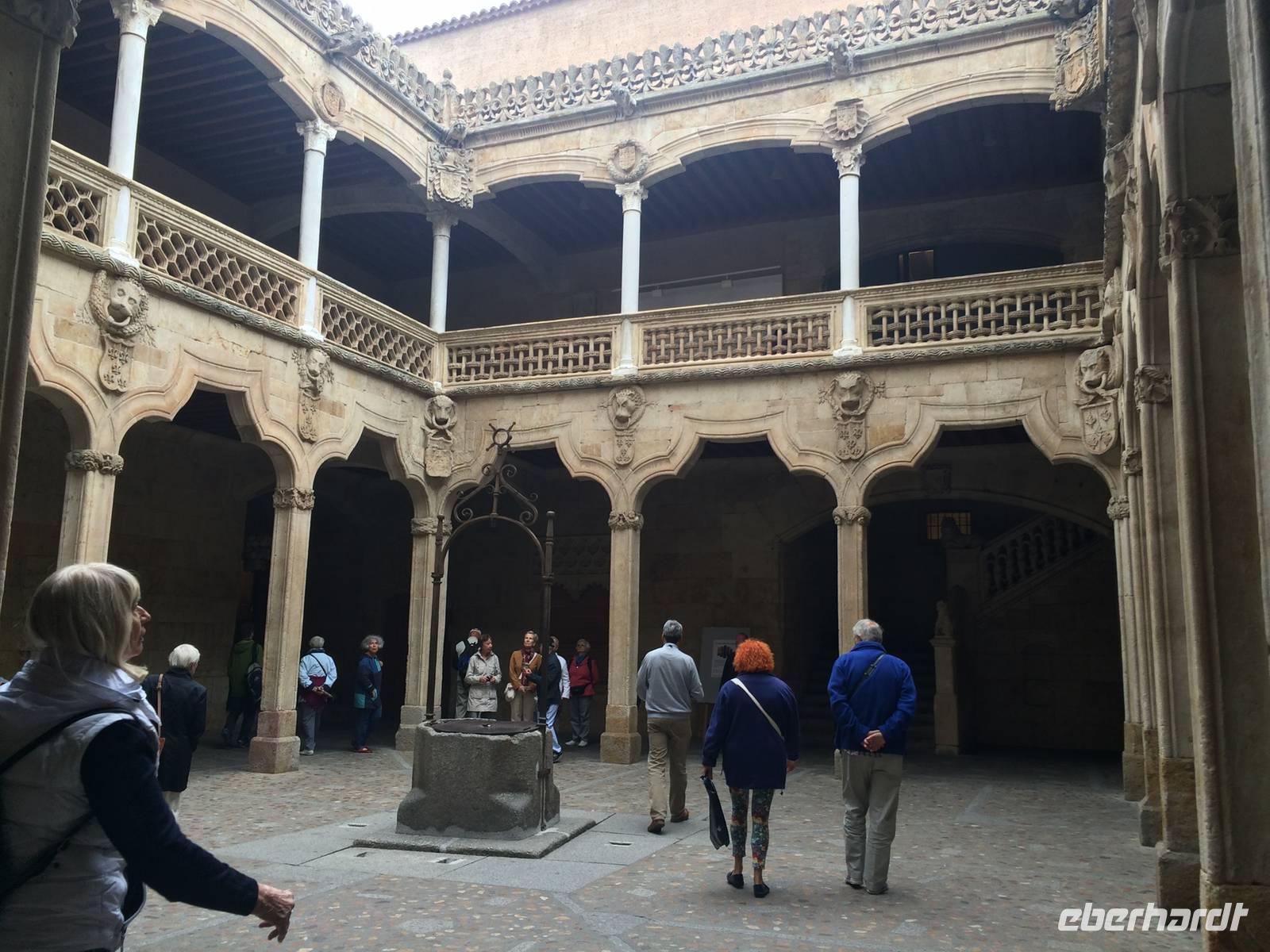 Das perfekte Wetter für eine Fahrt durch die schöne Landschaft von Kastilien-Leon. Wir bekommen die Außmaße und Schönheit des iberischen Scheidengebirges Sierra Guadarrama vor Augen zu sehen. Wir bewundern auch schon einen ersten Blick auf das Städtchen Ávila. Unser Ziel ist zunächst die Universitätenstadt Salamanca. Hier wird das reinste Castellano-Spanisch (Hochspanisch) im ganzen Land gesprochen und so kommen jährlich tausende Schüler und Studenten um die Weltsprache zu erlernen. Architektonisch hat sie ebenfalls jede Menge zu bieten. Die Gebäude verfügen über Fassaden aus goldfarbenen Sandsein, die dieser Stadt eine einzigartige Persönlichkeit verleiht. Die UNESCO hat Salamanca zum "Kulturgut der Menschheit" erklärt. Nach Besichtigung der Kathedrale spazieren wir zur ältesten Universität Spaniens, auch eine der ältesten in Europa. Dessen Fassade ist sehr prunkvoll geziert und wir halten Ausschau nach einem Frosch, den wir dann mit Müh letztendlich erblicken. Am Plaza Mayor beenden wir den Rundgang und streuen aus in die kleinen Bars, um etwas zu Trinken. In Salamanca ist es gängig, dass man zu jeder Getränkebestellung in jeder Bar eine Tapas kostenfrei erhält.