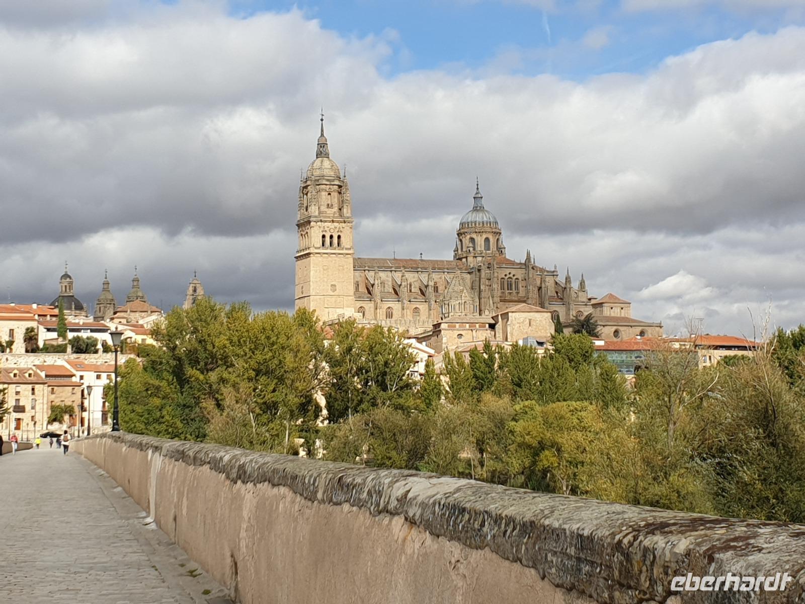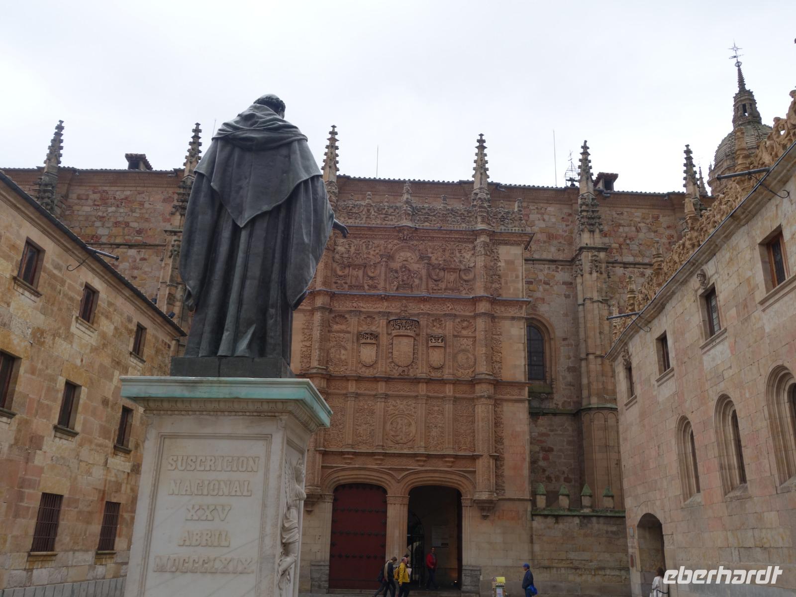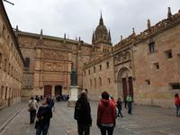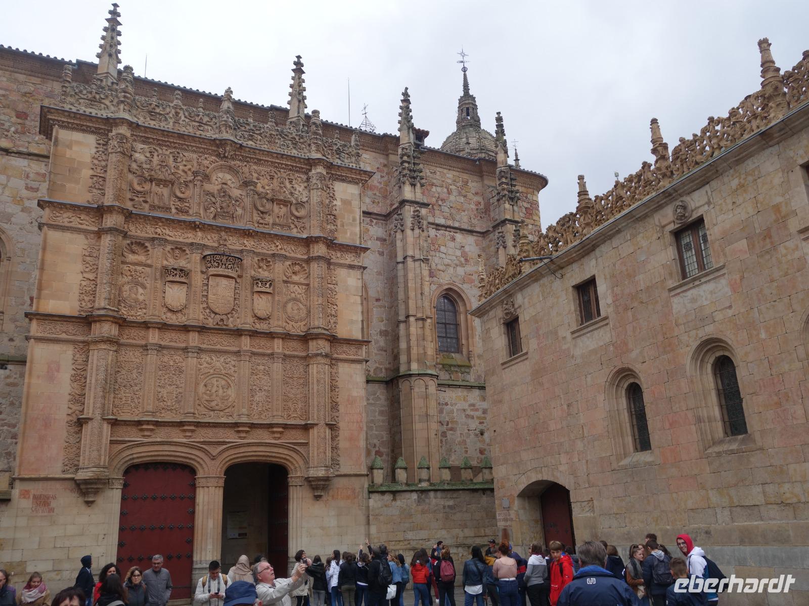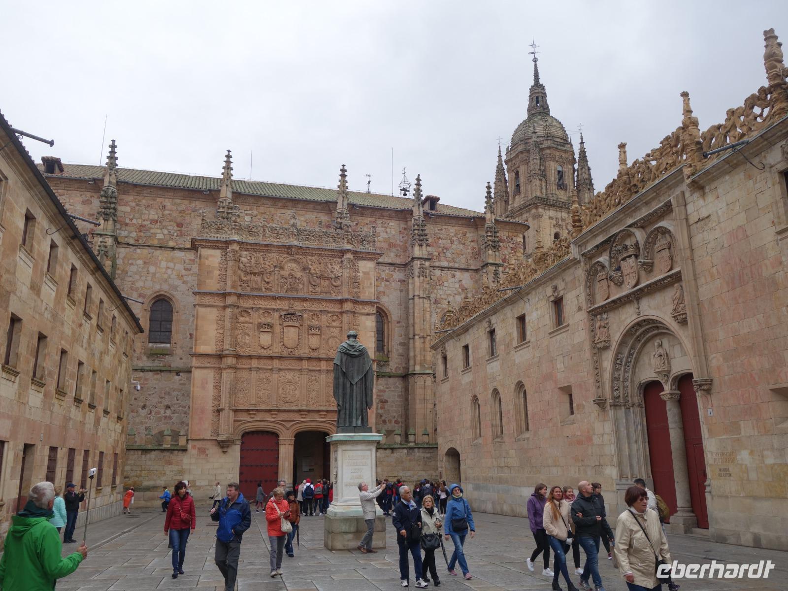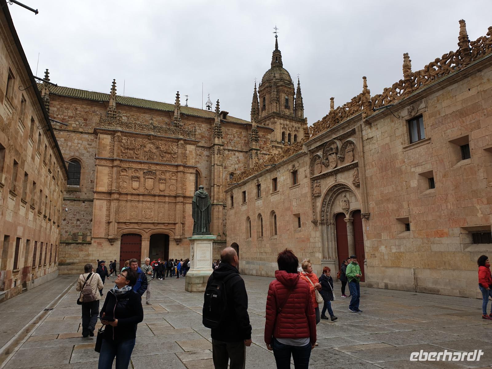 Auf dem Weg nach Salamanca bestaunen wir eine total andere Landschaft mit den grünen Wiesen mit Schafen oder Stieren. Salamanca begrüßt uns mit der römischen Brücke, über die wir morgen den Fluss Tormes überqueren. Die am Fluss Tormes gelegene Stadt galt lange Zeit als maurisches Handelszentrum, ehe sie von den katholischen Herrschern zurückerobert wurde. Die bedeutenden Sehenswürdigkeiten lernten wir bei einem Stadtrundgang kennen. Wir besichtigen auch die bekannte Universität und den Saal, wo die Doctoris Causa heutzutage gefeiert sind. Danach gingen wir unterwegs am Stadtpalast vorbei, und morgen freiwillig besichtigten die neue Kathedrale der Stadt. Auf dem Plaza Mayor gönnten wir Freizeit, um diese Stadt mit mehr als 30.000 Stundenten auf eigene Faust weiter zu erkunden. Einige fanden einen Supermarkt nicht weit von Hotel. Abendessen war heute im Hotel. Wir waren bisschen müde von der langen Reise seit heute morgen früh von zu Hause in Deutschland und freuen uns auf morgen mit Sonne.