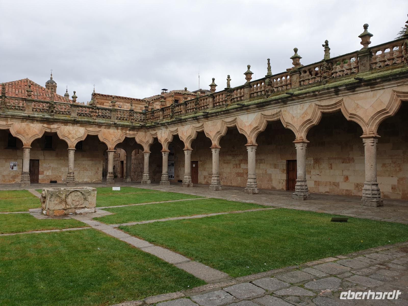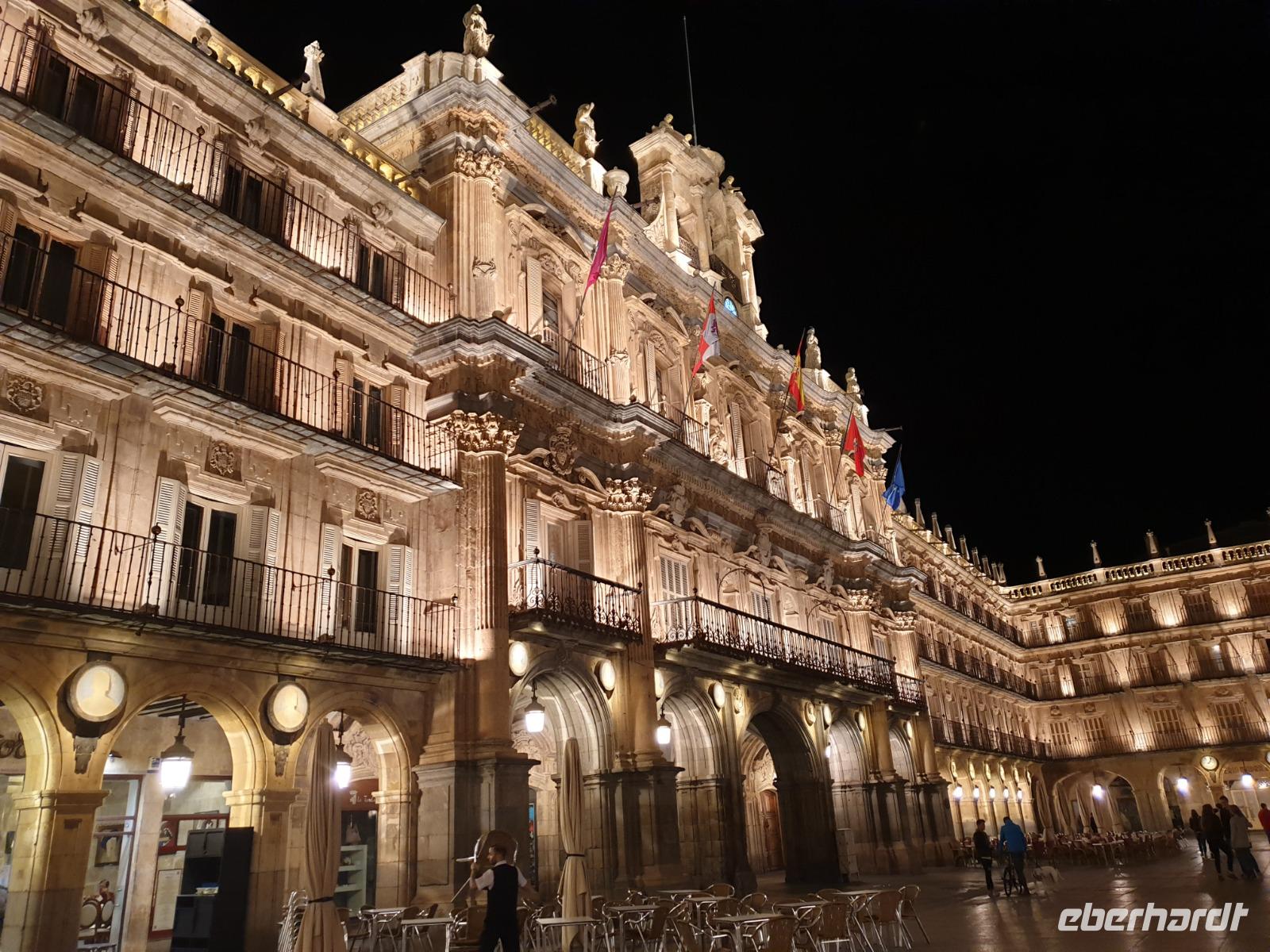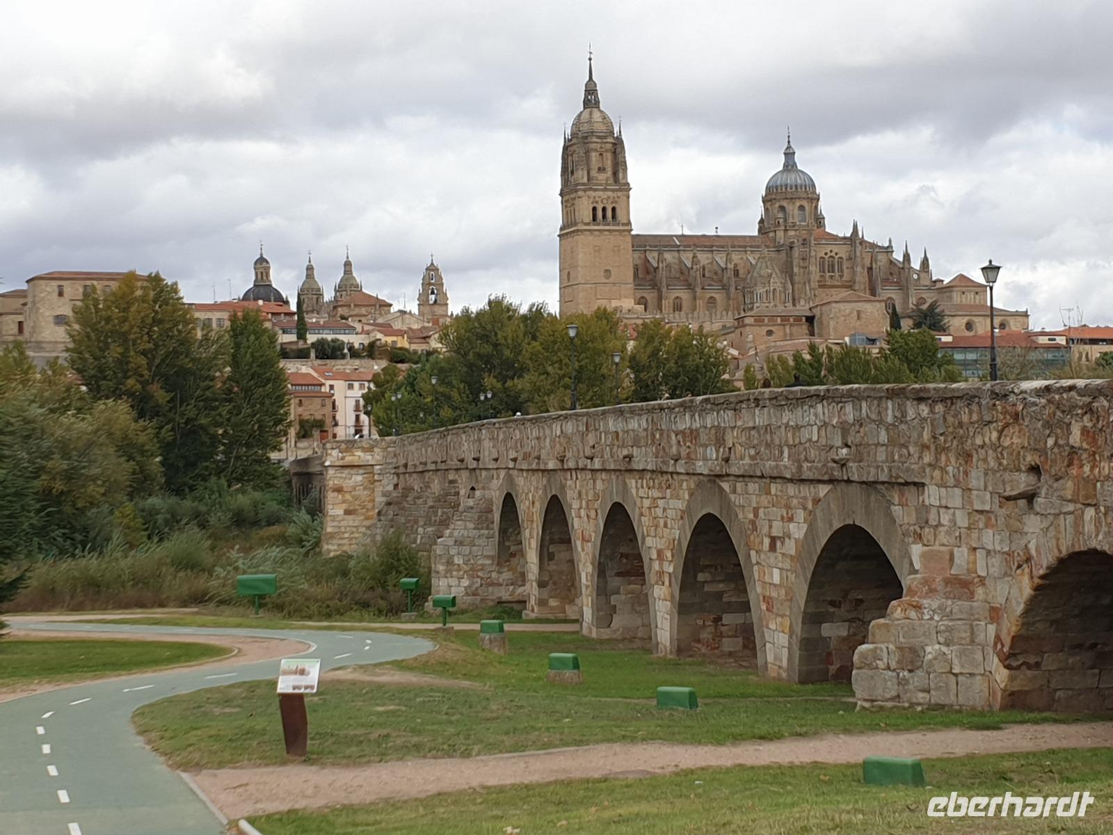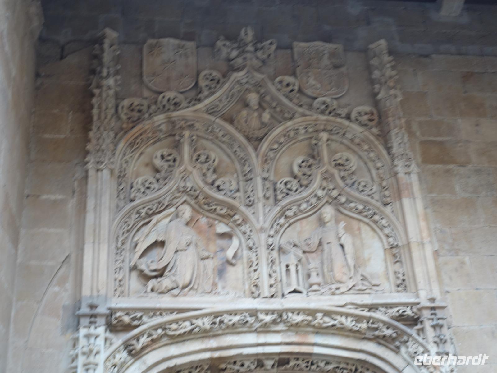 Auf dem Weg nach Salamanca bestaunen wir eine total andere Landschaft mit den grünen Wiesen mit Schafen oder Stieren. Salamanca begrüßt uns mit der römischen Brücke, über die wir morgen den Fluss Tormes überqueren. Die am Fluss Tormes gelegene Stadt galt lange Zeit als maurisches Handelszentrum, ehe sie von den katholischen Herrschern zurückerobert wurde. Die bedeutenden Sehenswürdigkeiten lernten wir bei einem Stadtrundgang kennen. Wir besichtigen auch die bekannte Universität und den Saal, wo die Doctoris Causa heutzutage gefeiert sind. Danach gingen wir unterwegs am Stadtpalast vorbei, und morgen freiwillig besichtigten die neue Kathedrale der Stadt. Auf dem Plaza Mayor gönnten wir Freizeit, um diese Stadt mit mehr als 30.000 Stundenten auf eigene Faust weiter zu erkunden. Einige fanden einen Supermarkt nicht weit von Hotel. Abendessen war heute im Hotel. Wir waren bisschen müde von der langen Reise seit heute morgen früh von zu Hause in Deutschland und freuen uns auf morgen mit Sonne.