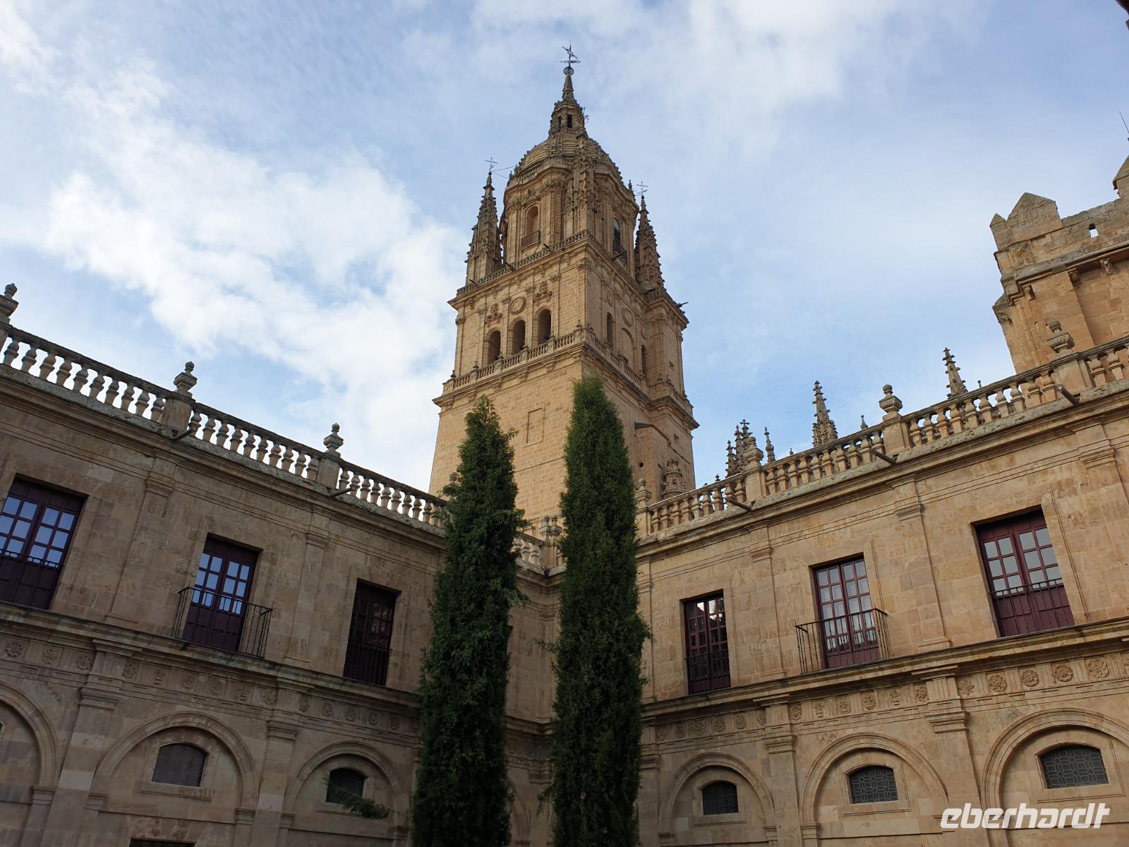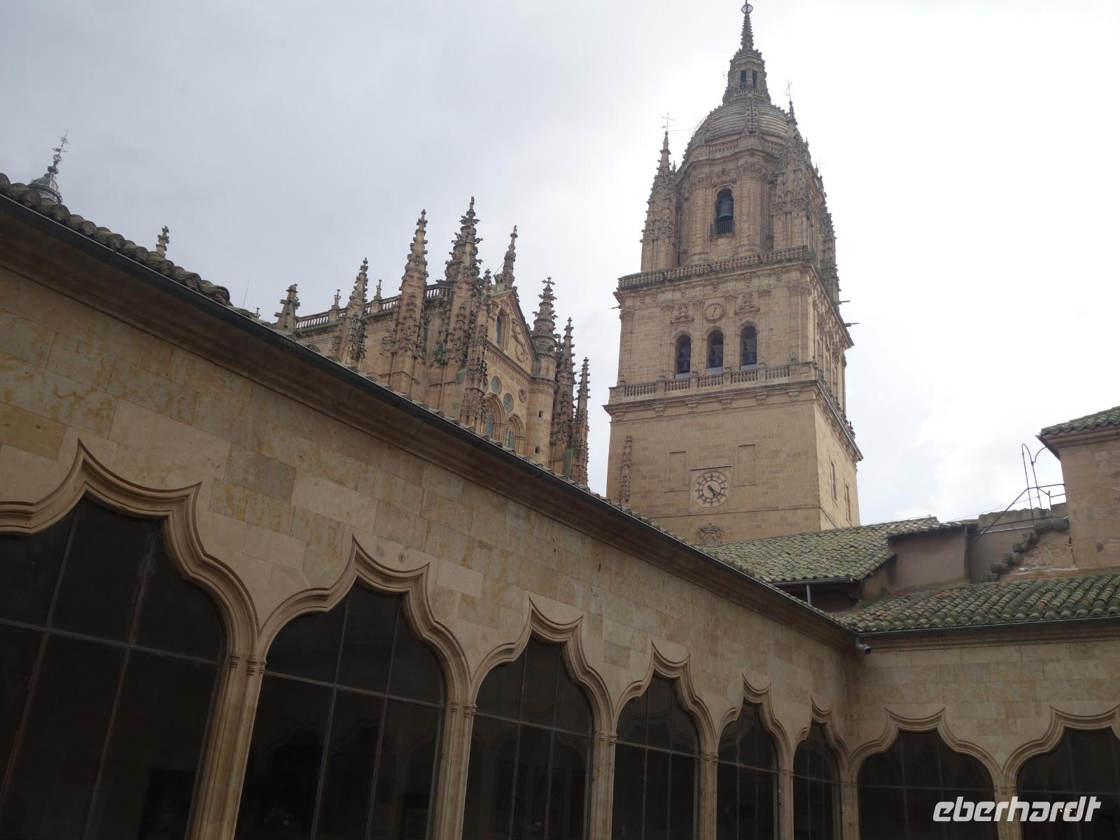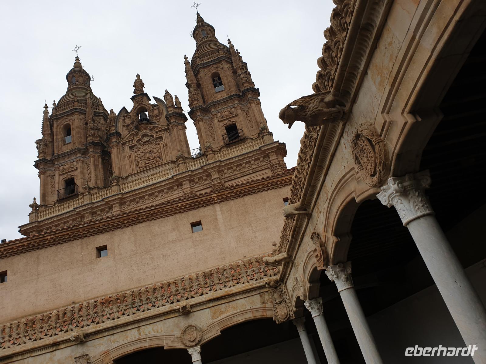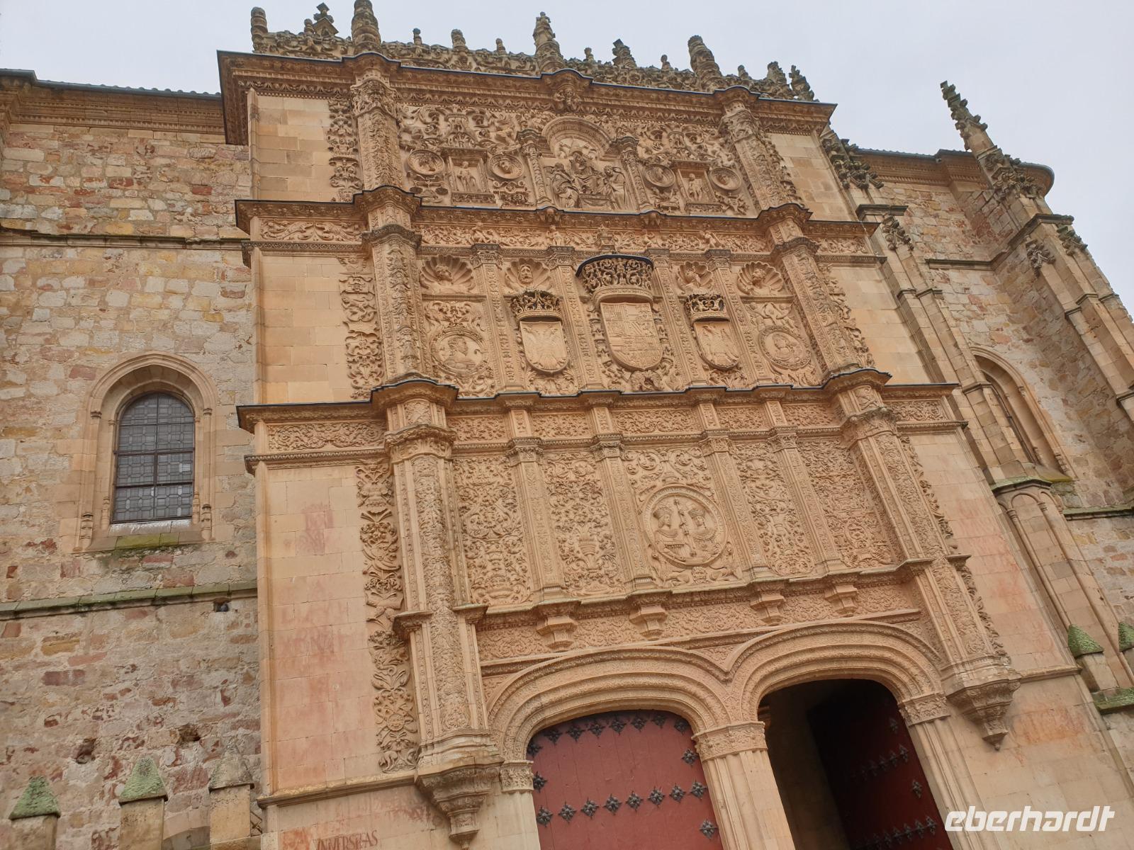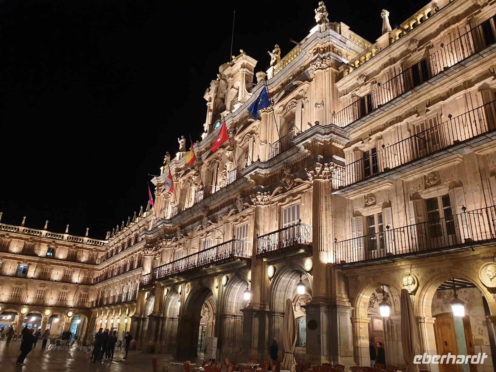Auf dem Weg nach Salamanca bestaunen wir eine total andere Landschaft mit den grünen Wiesen mit Schafen oder Stieren. Salamanca begrüßt uns mit der römischen Brücke, über die wir morgen den Fluss Tormes überqueren. Die am Fluss Tormes gelegene Stadt galt lange Zeit als maurisches Handelszentrum, ehe sie von den katholischen Herrschern zurückerobert wurde. Die bedeutenden Sehenswürdigkeiten lernten wir bei einem Stadtrundgang kennen. Wir besichtigen auch die bekannte Universität und den Saal, wo die Doctoris Causa heutzutage gefeiert sind. Danach gingen wir unterwegs am Stadtpalast vorbei, und morgen freiwillig besichtigten die neue Kathedrale der Stadt. Auf dem Plaza Mayor gönnten wir Freizeit, um diese Stadt mit mehr als 30.000 Stundenten auf eigene Faust weiter zu erkunden. Einige fanden einen Supermarkt nicht weit von Hotel. Abendessen war heute im Hotel. Wir waren bisschen müde von der langen Reise seit heute morgen früh von zu Hause in Deutschland und freuen uns auf morgen mit Sonne.