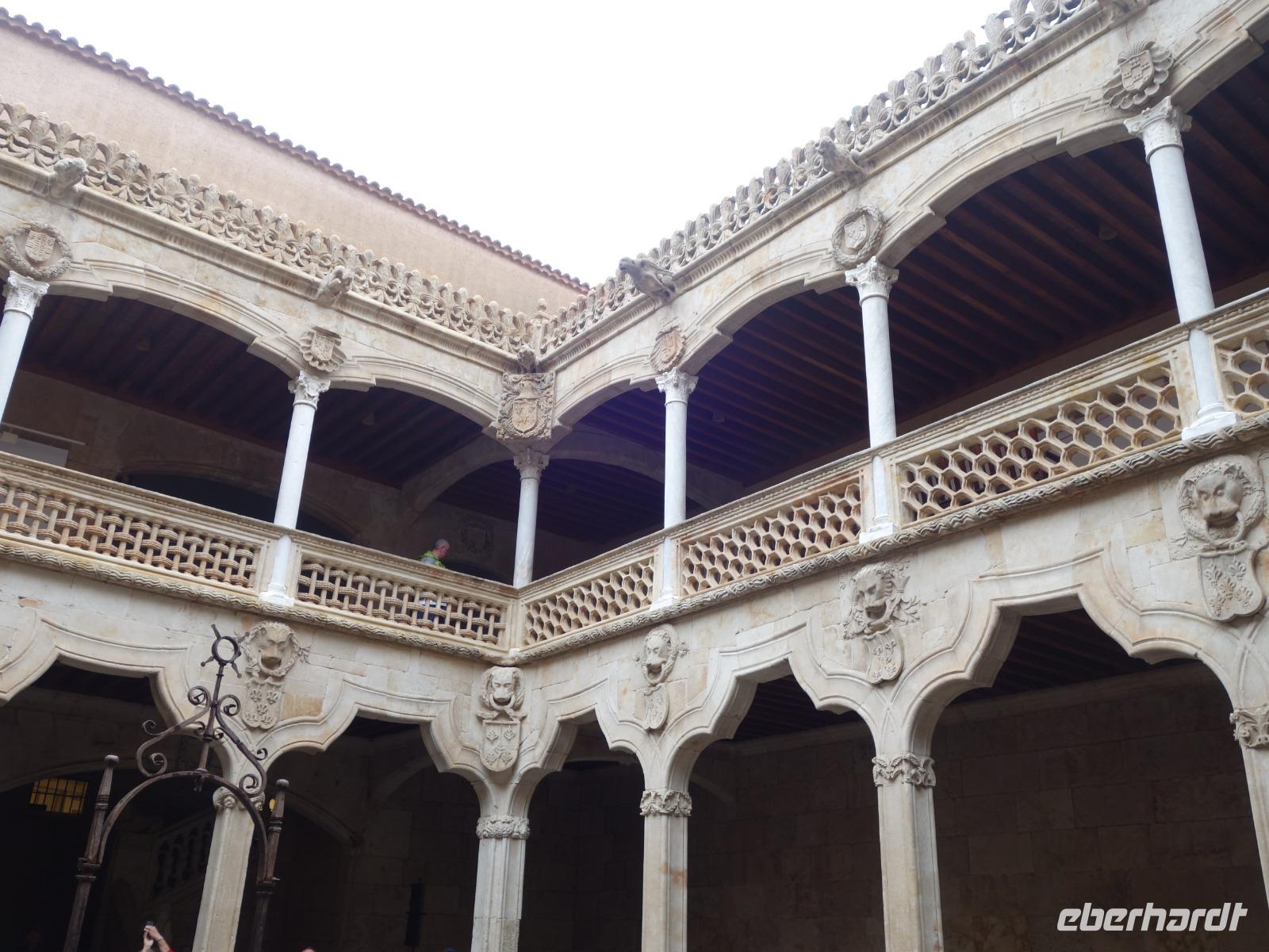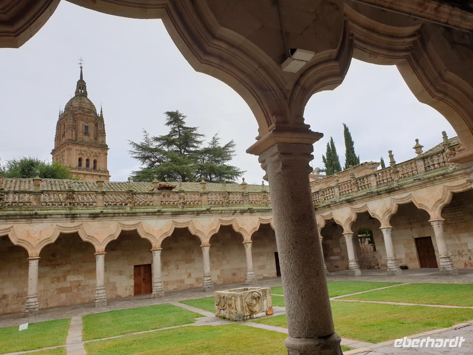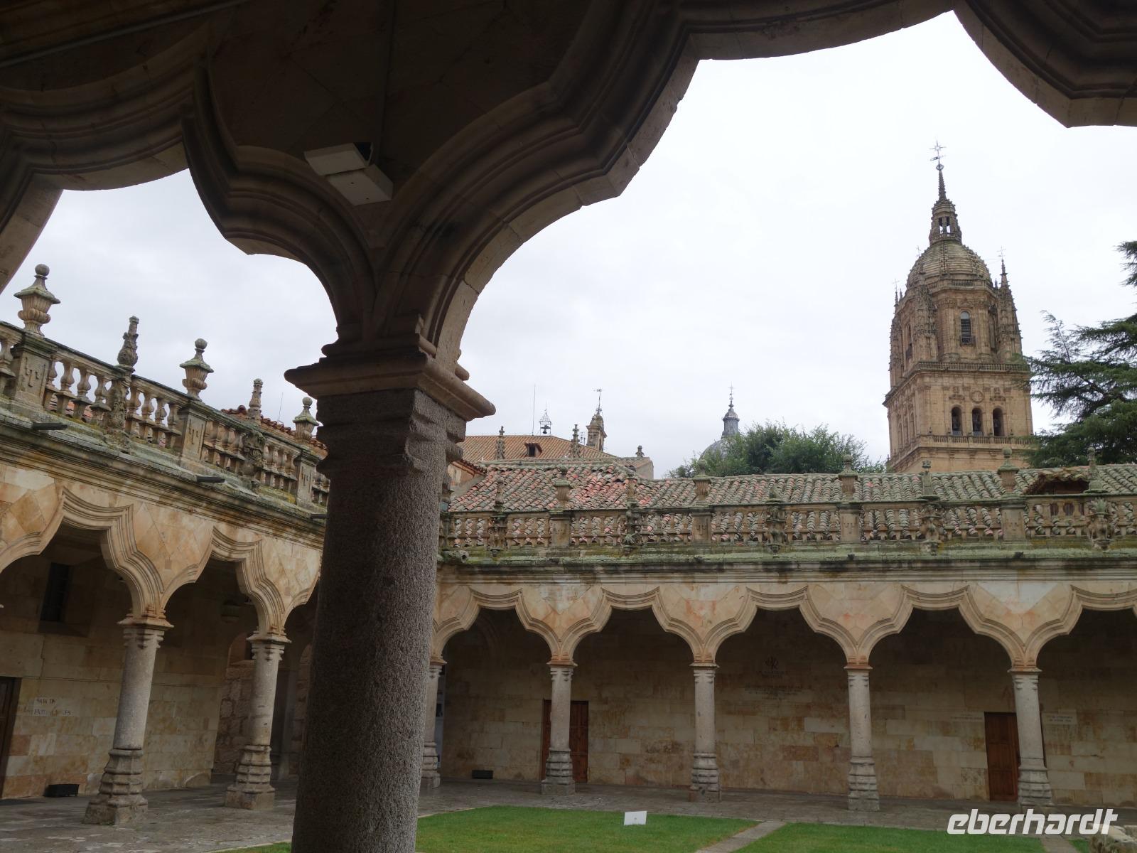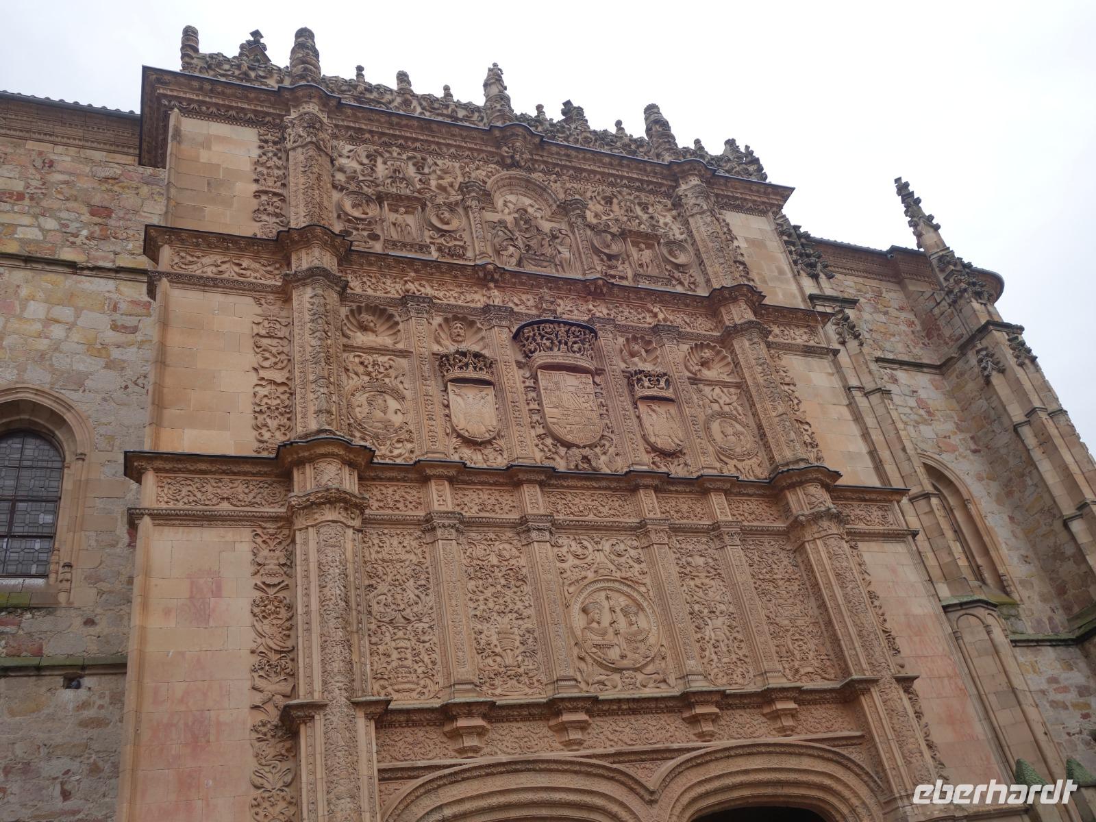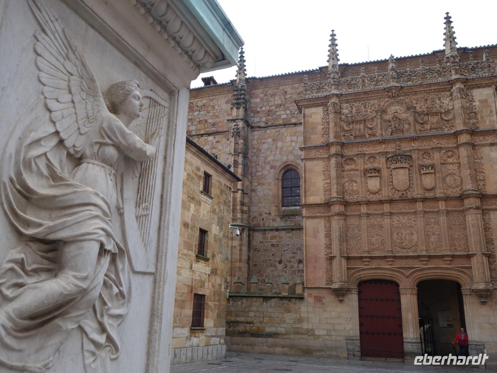 Auf dem Weg nach Salamanca bestaunen wir eine total andere Landschaft mit den grünen Wiesen mit Schafen oder Stieren. Salamanca begrüßt uns mit der römischen Brücke, über die wir morgen den Fluss Tormes überqueren. Die am Fluss Tormes gelegene Stadt galt lange Zeit als maurisches Handelszentrum, ehe sie von den katholischen Herrschern zurückerobert wurde. Die bedeutenden Sehenswürdigkeiten lernten wir bei einem Stadtrundgang kennen. Wir besichtigen auch die bekannte Universität und den Saal, wo die Doctoris Causa heutzutage gefeiert sind. Danach gingen wir unterwegs am Stadtpalast vorbei, und morgen freiwillig besichtigten die neue Kathedrale der Stadt. Auf dem Plaza Mayor gönnten wir Freizeit, um diese Stadt mit mehr als 30.000 Stundenten auf eigene Faust weiter zu erkunden. Einige fanden einen Supermarkt nicht weit von Hotel. Abendessen war heute im Hotel. Wir waren bisschen müde von der langen Reise seit heute morgen früh von zu Hause in Deutschland und freuen uns auf morgen mit Sonne.