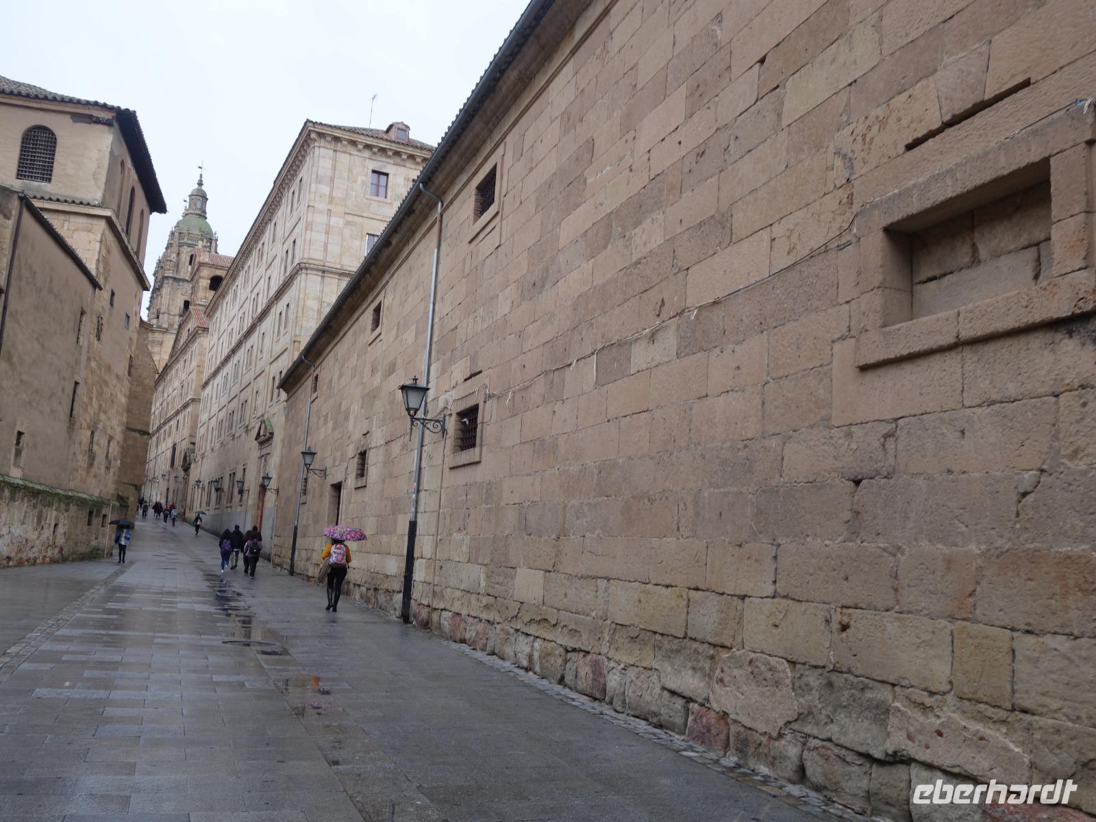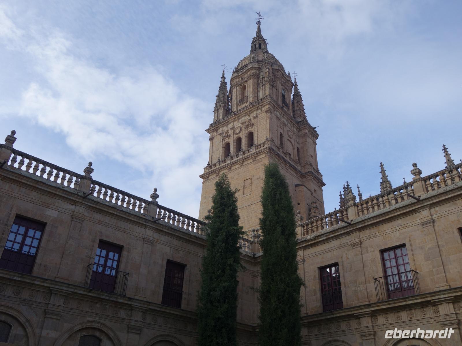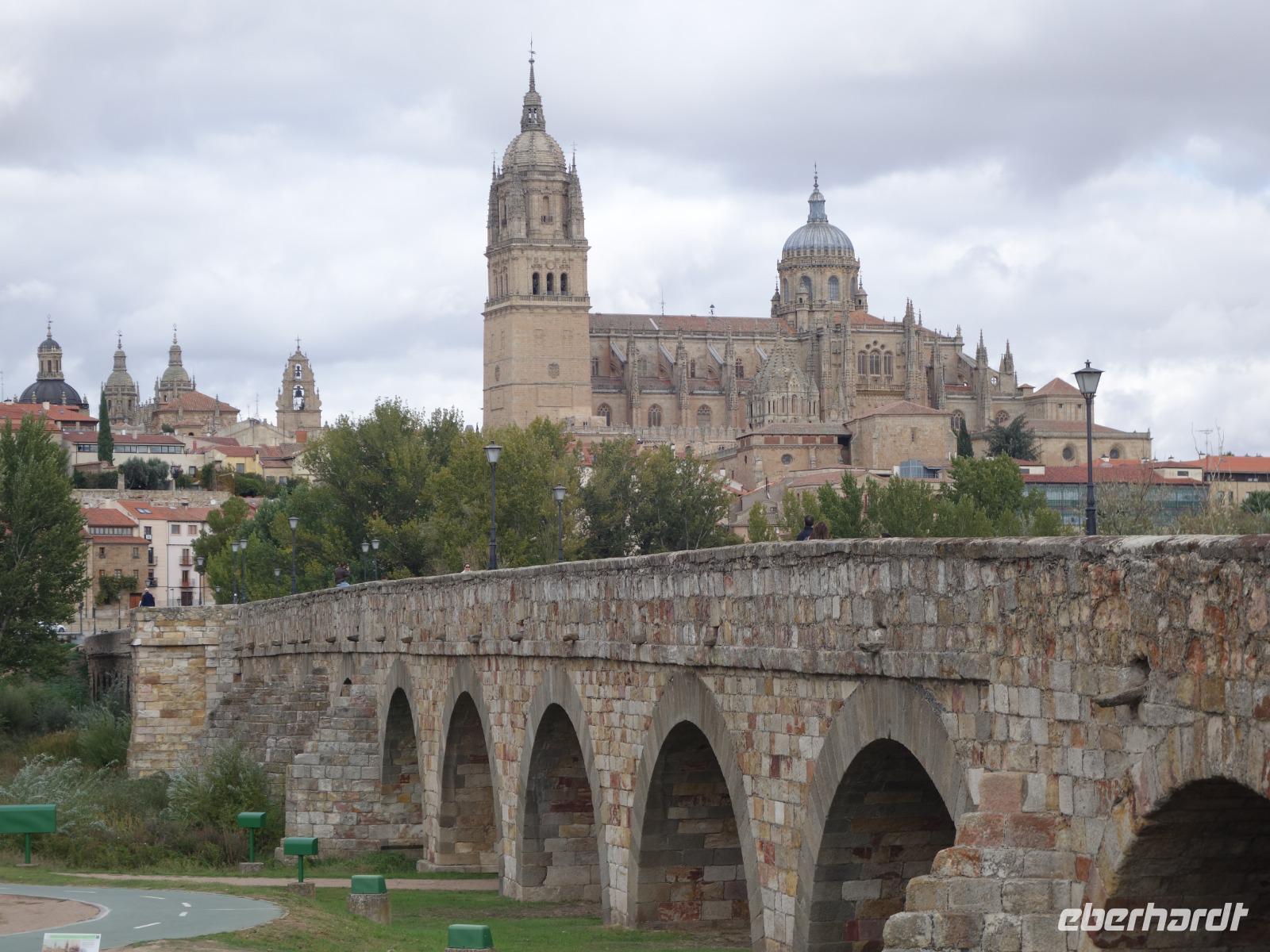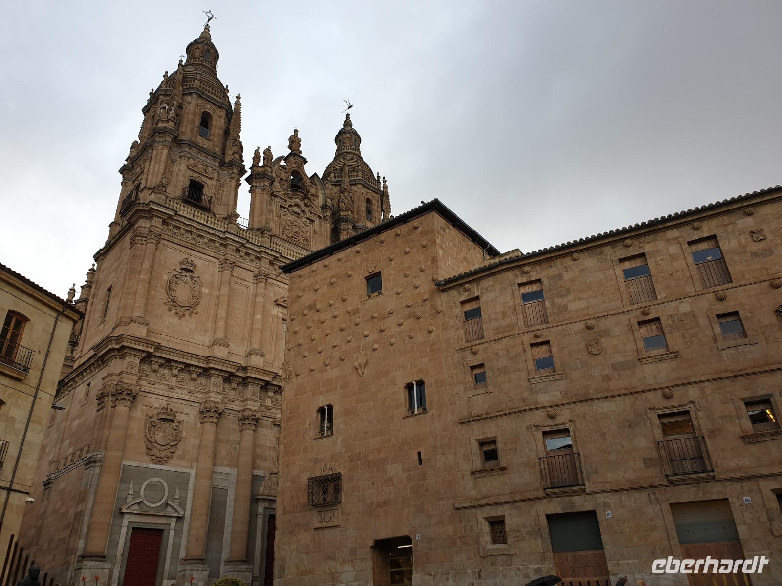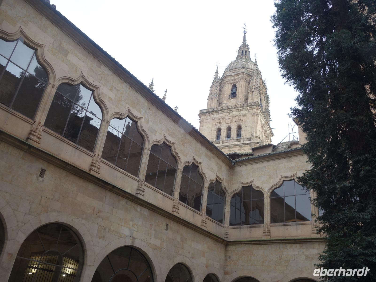 Auf dem Weg nach Salamanca bestaunen wir eine total andere Landschaft mit den grünen Wiesen mit Schafen oder Stieren. Salamanca begrüßt uns mit der römischen Brücke, über die wir morgen den Fluss Tormes überqueren. Die am Fluss Tormes gelegene Stadt galt lange Zeit als maurisches Handelszentrum, ehe sie von den katholischen Herrschern zurückerobert wurde. Die bedeutenden Sehenswürdigkeiten lernten wir bei einem Stadtrundgang kennen. Wir besichtigen auch die bekannte Universität und den Saal, wo die Doctoris Causa heutzutage gefeiert sind. Danach gingen wir unterwegs am Stadtpalast vorbei, und morgen freiwillig besichtigten die neue Kathedrale der Stadt. Auf dem Plaza Mayor gönnten wir Freizeit, um diese Stadt mit mehr als 30.000 Stundenten auf eigene Faust weiter zu erkunden. Einige fanden einen Supermarkt nicht weit von Hotel. Abendessen war heute im Hotel. Wir waren bisschen müde von der langen Reise seit heute morgen früh von zu Hause in Deutschland und freuen uns auf morgen mit Sonne.