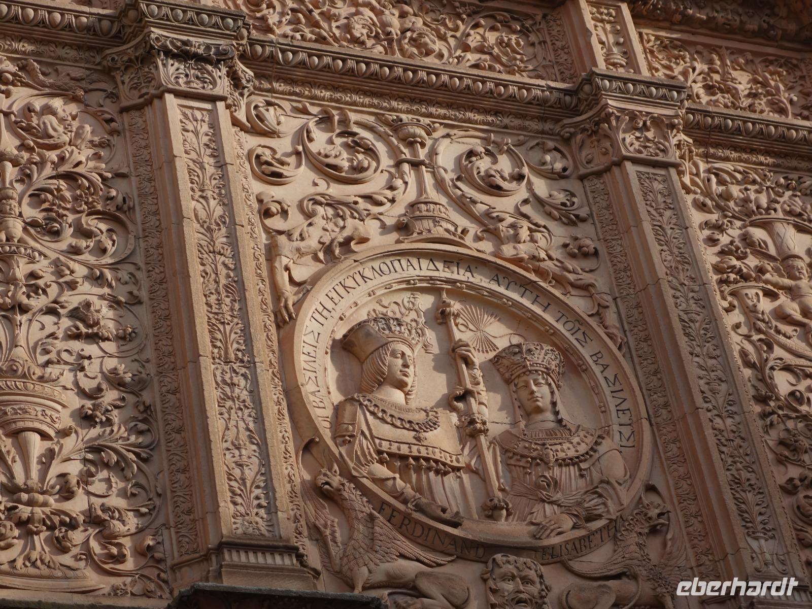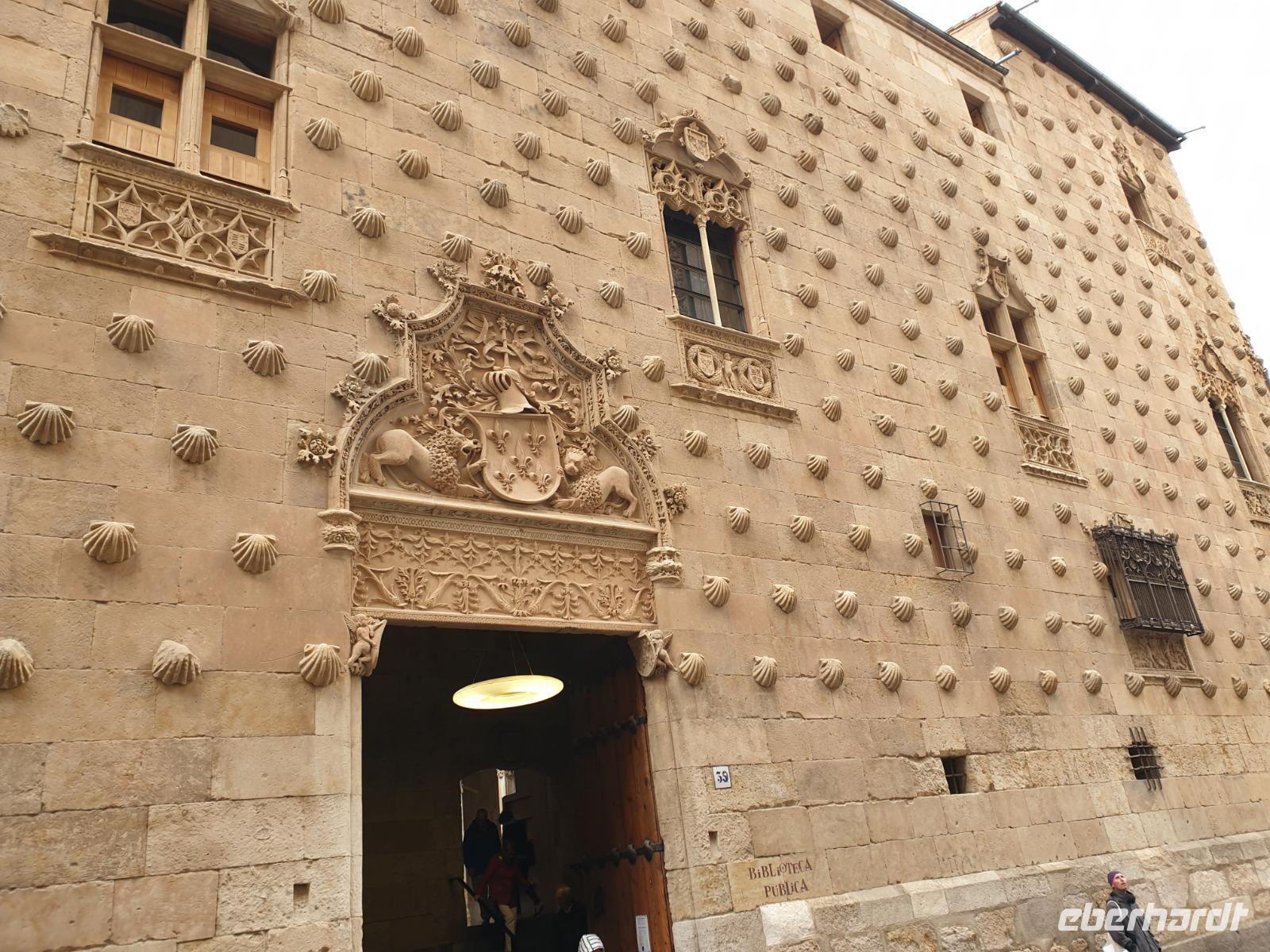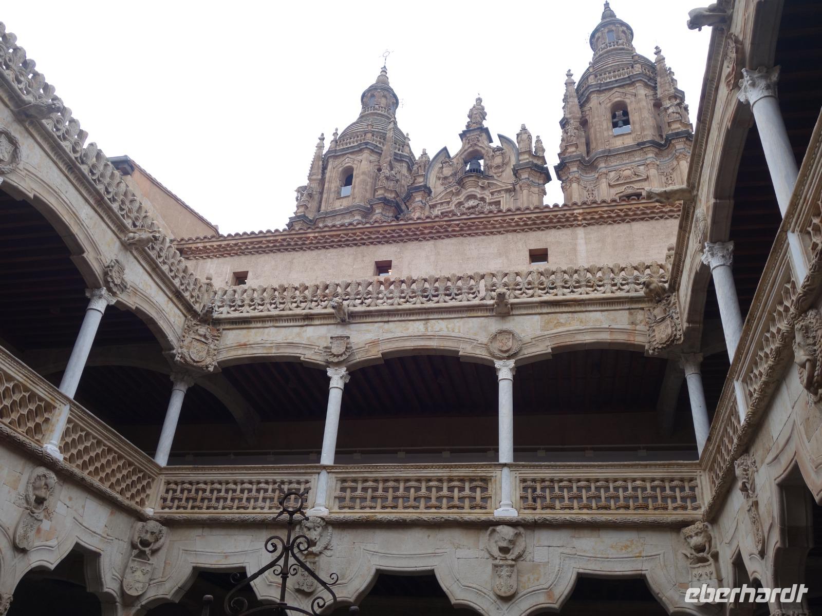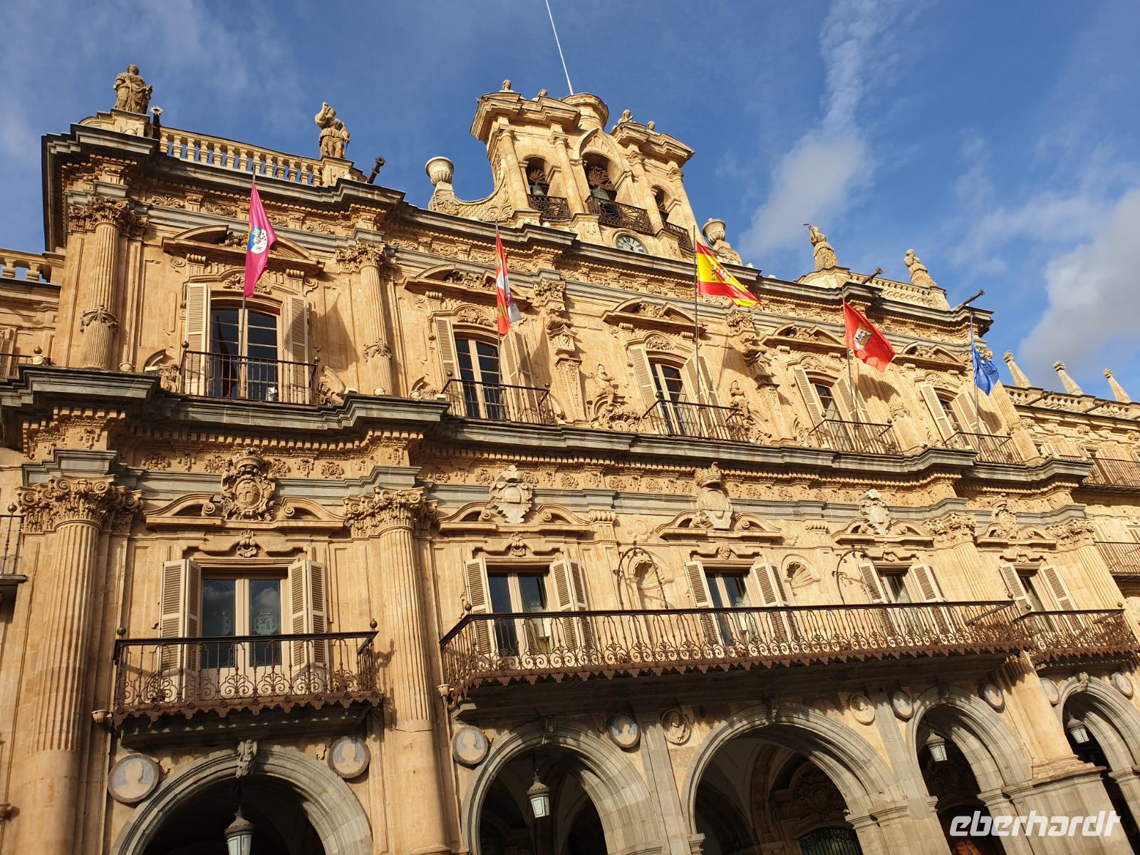 Auf dem Weg nach Salamanca bestaunen wir eine total andere Landschaft mit den grünen Wiesen mit Schafen oder Stieren. Salamanca begrüßt uns mit der römischen Brücke, über die wir morgen den Fluss Tormes überqueren. Die am Fluss Tormes gelegene Stadt galt lange Zeit als maurisches Handelszentrum, ehe sie von den katholischen Herrschern zurückerobert wurde. Die bedeutenden Sehenswürdigkeiten lernten wir bei einem Stadtrundgang kennen. Wir besichtigen auch die bekannte Universität und den Saal, wo die Doctoris Causa heutzutage gefeiert sind. Danach gingen wir unterwegs am Stadtpalast vorbei, und morgen freiwillig besichtigten die neue Kathedrale der Stadt. Auf dem Plaza Mayor gönnten wir Freizeit, um diese Stadt mit mehr als 30.000 Stundenten auf eigene Faust weiter zu erkunden. Einige fanden einen Supermarkt nicht weit von Hotel. Abendessen war heute im Hotel. Wir waren bisschen müde von der langen Reise seit heute morgen früh von zu Hause in Deutschland und freuen uns auf morgen mit Sonne.