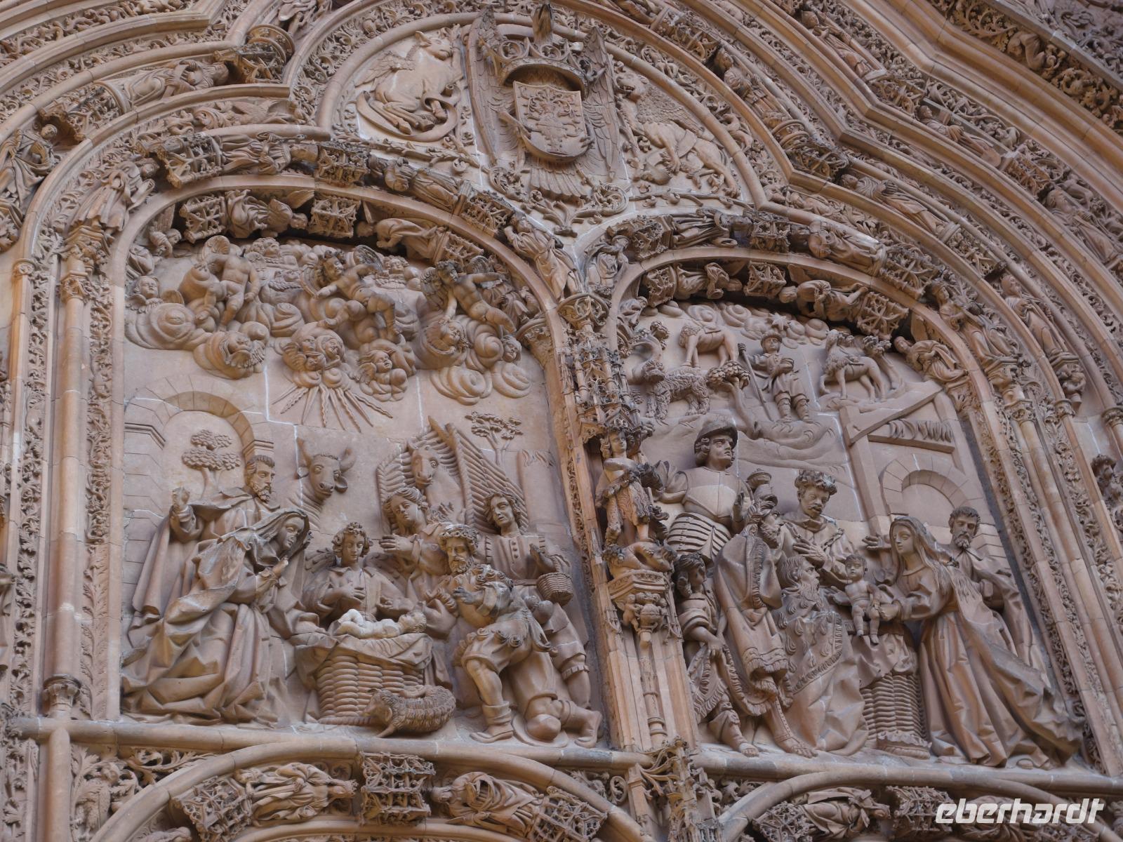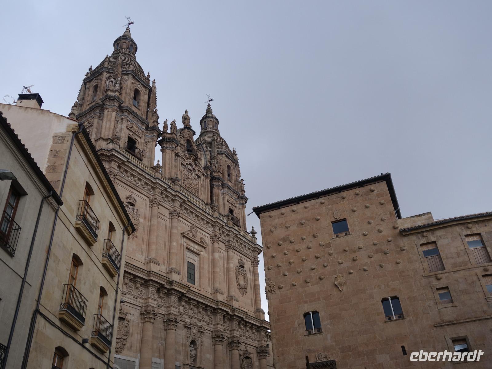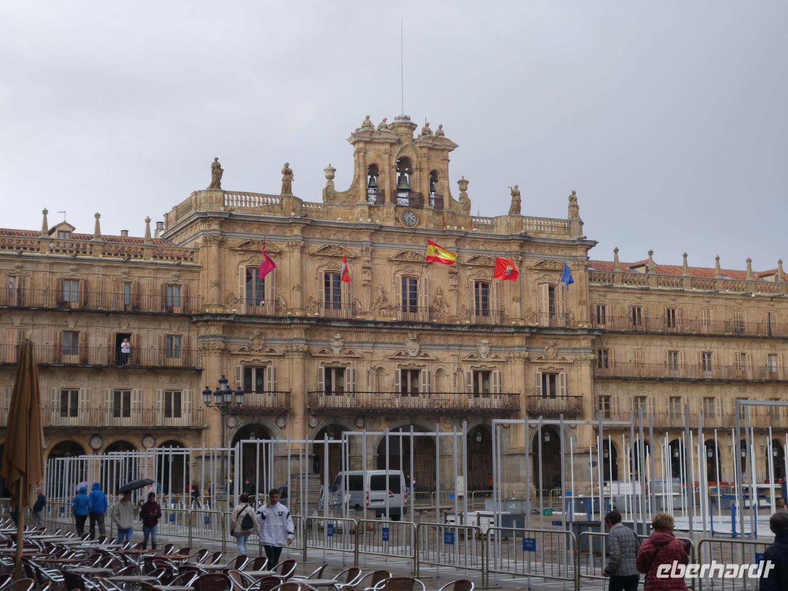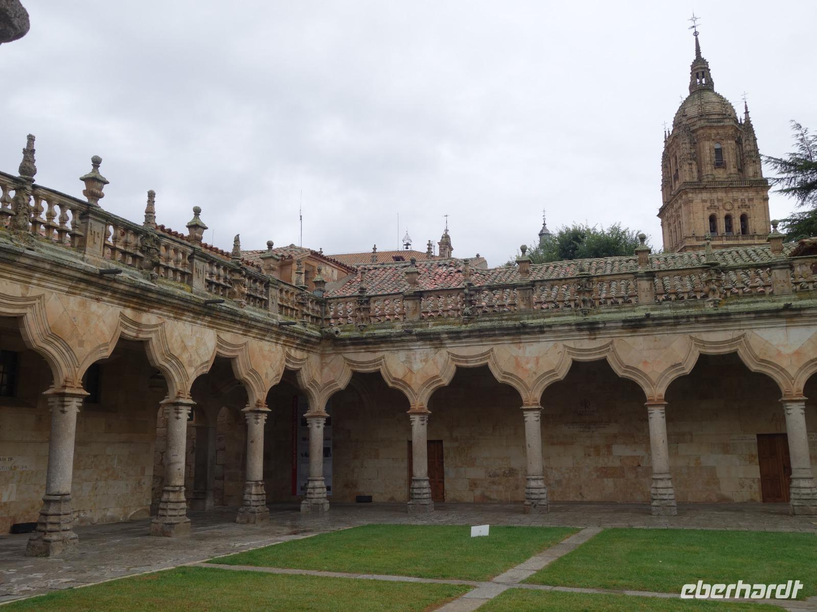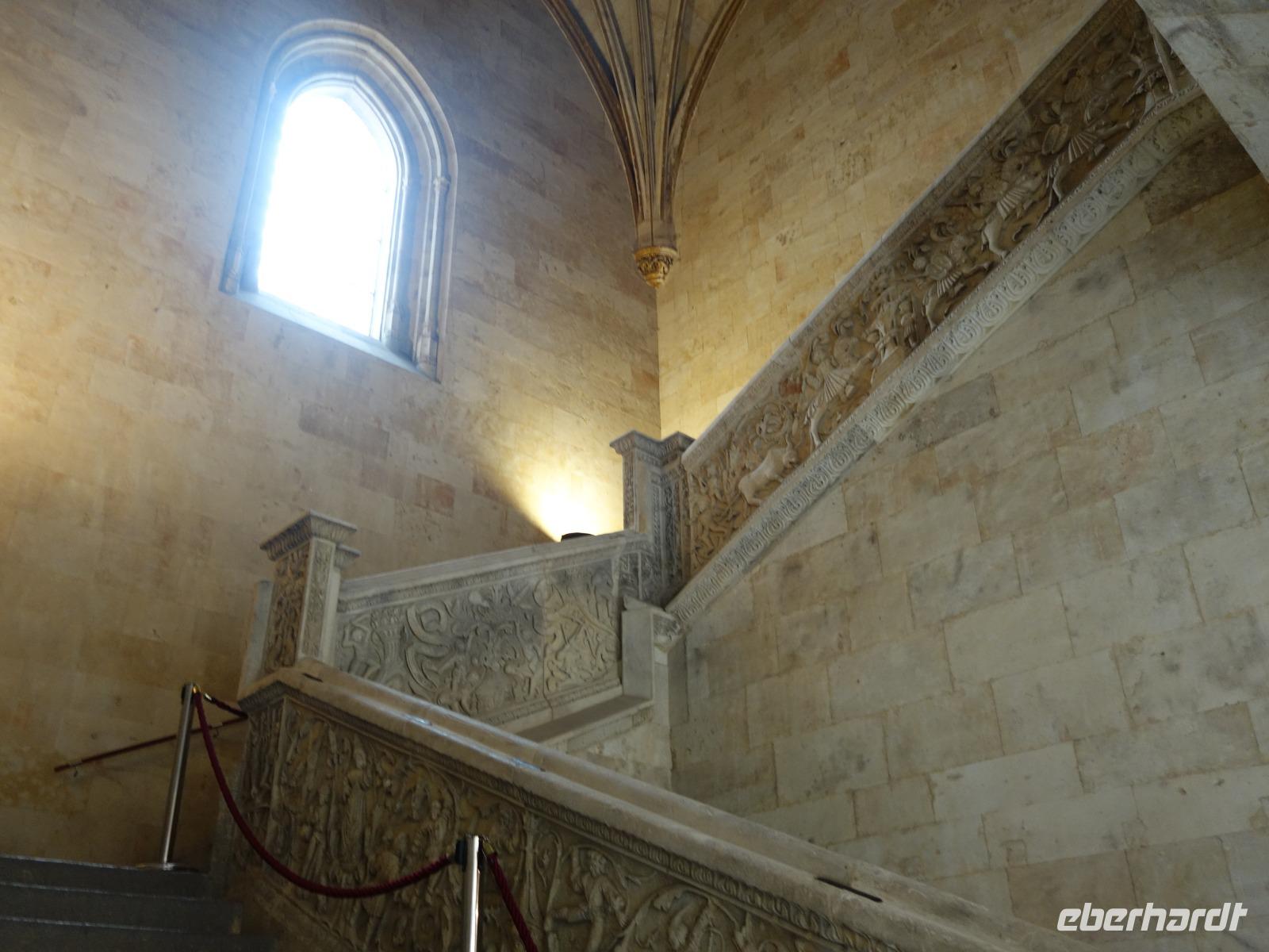 Auf dem Weg nach Salamanca bestaunen wir eine total andere Landschaft mit den grünen Wiesen mit Schafen oder Stieren. Salamanca begrüßt uns mit der römischen Brücke, über die wir morgen den Fluss Tormes überqueren. Die am Fluss Tormes gelegene Stadt galt lange Zeit als maurisches Handelszentrum, ehe sie von den katholischen Herrschern zurückerobert wurde. Die bedeutenden Sehenswürdigkeiten lernten wir bei einem Stadtrundgang kennen. Wir besichtigen auch die bekannte Universität und den Saal, wo die Doctoris Causa heutzutage gefeiert sind. Danach gingen wir unterwegs am Stadtpalast vorbei, und morgen freiwillig besichtigten die neue Kathedrale der Stadt. Auf dem Plaza Mayor gönnten wir Freizeit, um diese Stadt mit mehr als 30.000 Stundenten auf eigene Faust weiter zu erkunden. Einige fanden einen Supermarkt nicht weit von Hotel. Abendessen war heute im Hotel. Wir waren bisschen müde von der langen Reise seit heute morgen früh von zu Hause in Deutschland und freuen uns auf morgen mit Sonne.