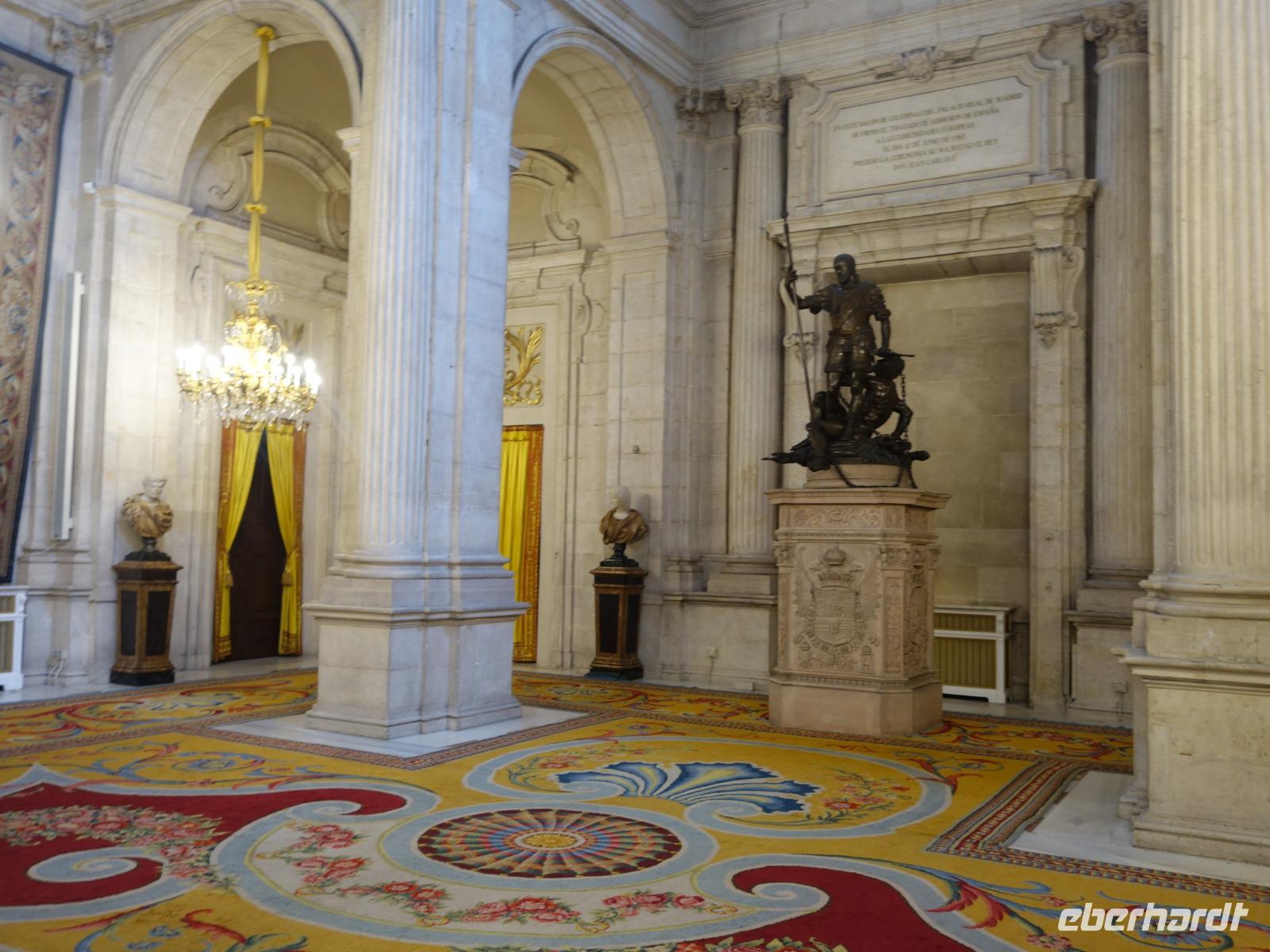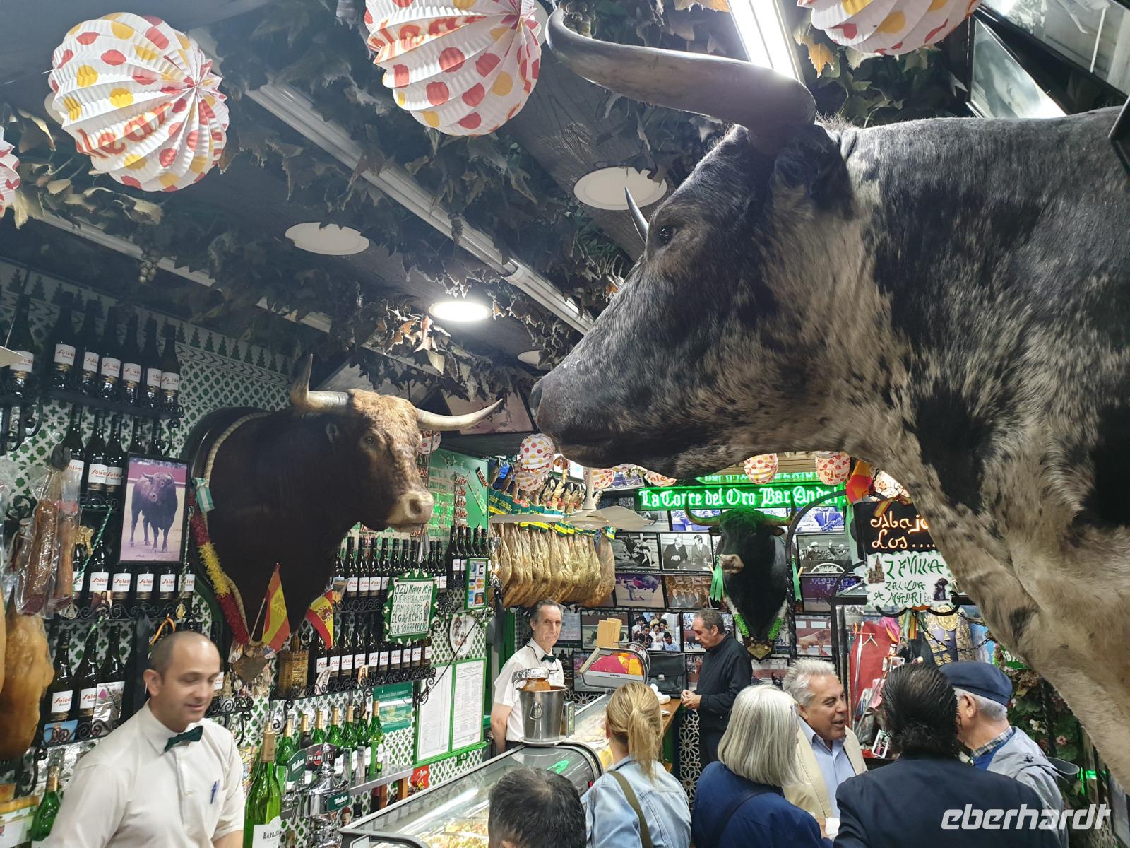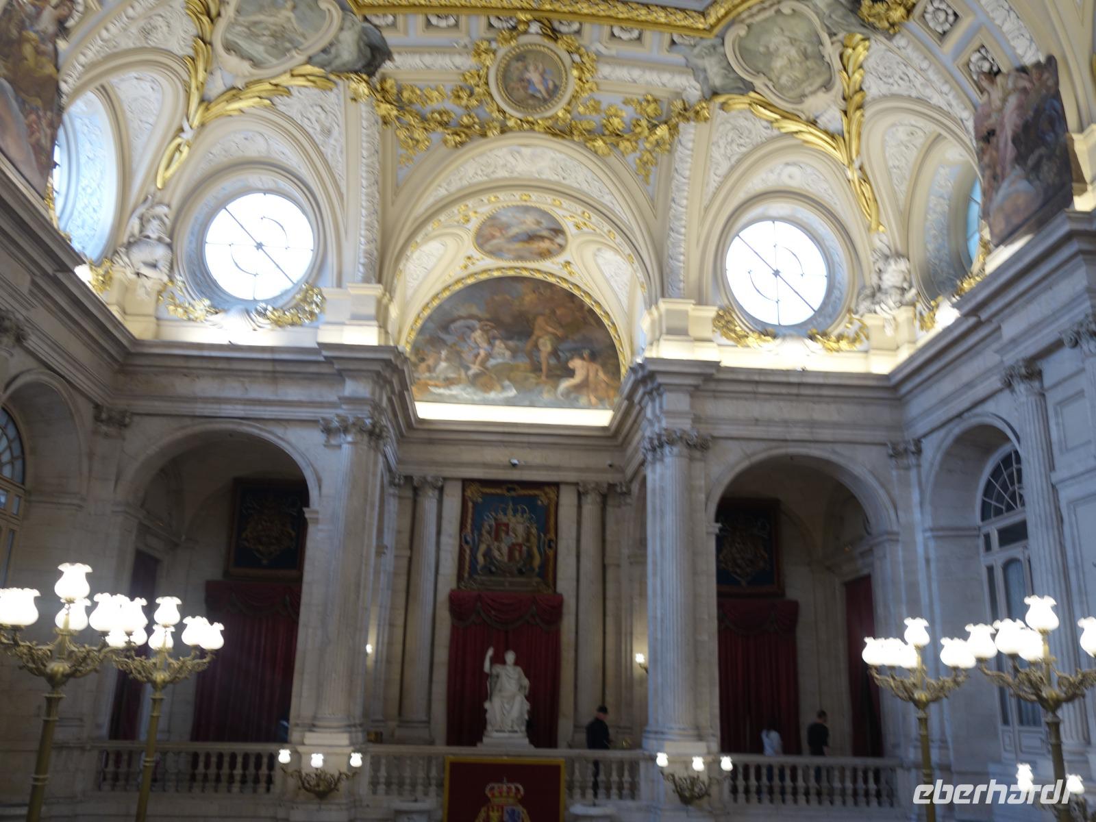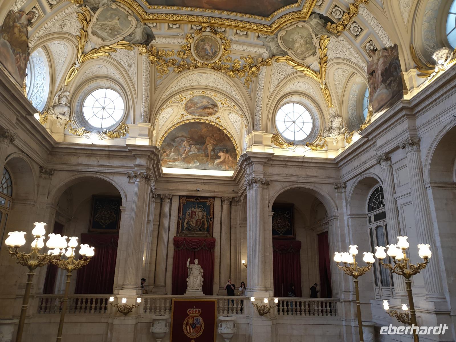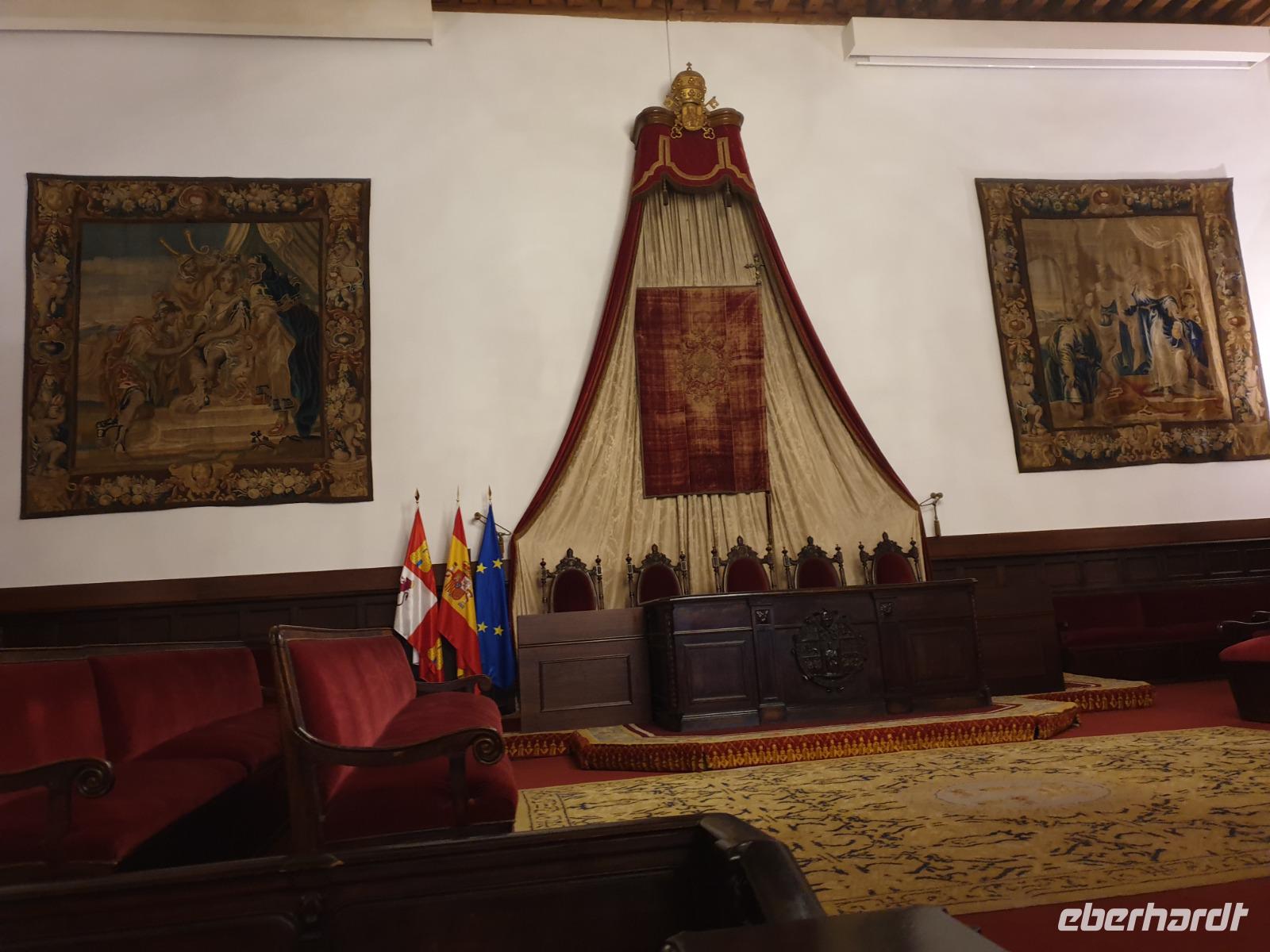 Während des Tages, wenn die Sonne scheint, ist es herrlich in Madrid, aber nachts sinken die Temperaturen. Man darf nicht vergessen, dass sich Madrid in einer Höhe von 665 Metern befindet. Wie gesagt, wenn die Sonne scheint, ist es sehr angenehm, aber am Abend und in der Nacht kann es richtig frisch sein. Heute Morgen entdeckten wir im Hotel den Frühstücksraum und sammelten dort Kraft für den Tag. Um 9 Uhr starteten wir eine Stadtrundfahrt durch Madrid zu den bedeutenstens Sehenwürdigkeiten. Erstmal fuhren wir zu der schönsten und wichtigsten Stierkampf Arena der Welt, im Mudejar-Stil gebaut, die sogennnate Las Ventas. Die Fahrt führte uns über den Retiro Park, die Puerta de Alcala, und das Prado Museum, welches einige heute Nachmittag nochmals individuell besuchen wollten. Wir müssen weiter, da wir einen Termin mit dem König Felipe und Letizia um 11.30 Uhr haben. Die Fahrt führt über Plaza de Cibeles und die schöne 100 Jahre alte Gran Via. Wir verlassen den Bus und fangen einen Stadtrundgang mit Petra durch Madrid an. Auf diese Weise lernten wir die bedeutendsten Sehenswürdigkeiten wie den Königspalast und die Kathedrale La Almudena kennen. Um 11.30 Uhr besuchten wir den imposanten Königspalast, wo wir die verschiedenen Räume und den Thronsaal bestaunen konnten. Gemeinsam mit unserer Reiseleiterin Petra erkundeten wir nun die wunderschöne Altstadt. Wir schlenderten über den weltbekannten Platz, den Plaza de Mayor, wo der San Miguel Markt ist. Unseren Stadtrundgang beendeten wir hier, aber man konnte weiter zum Puerta del Sol oder dem Platz Santa Ana gehen, wo man auf den verschiedenen Terrassen die Sonne geniessen kann.