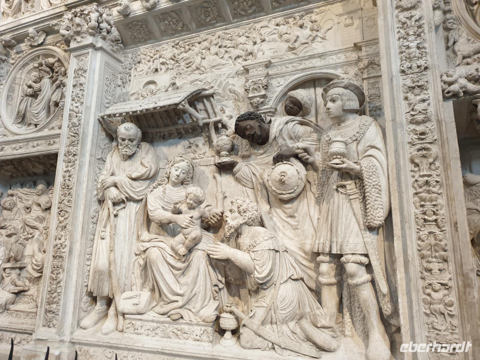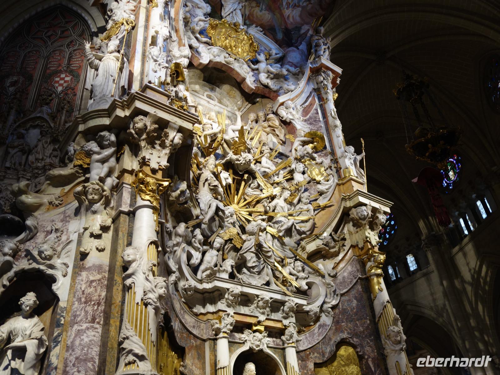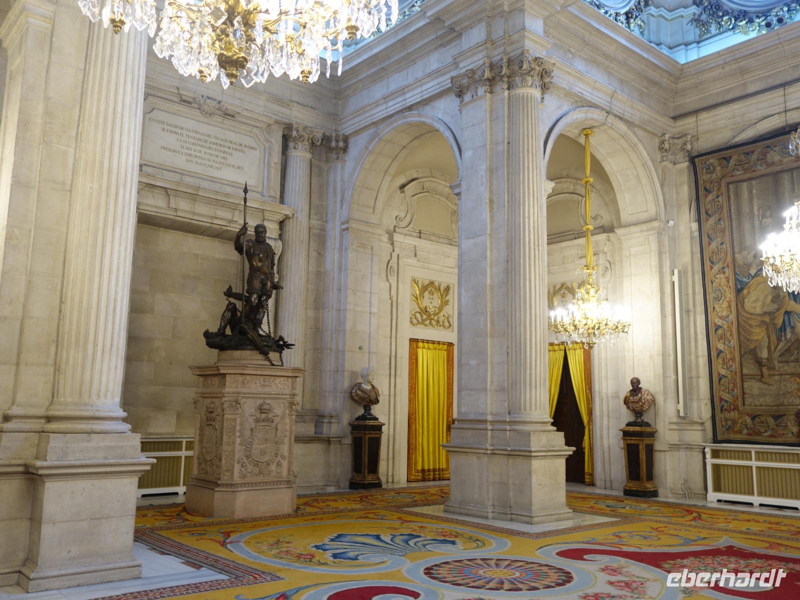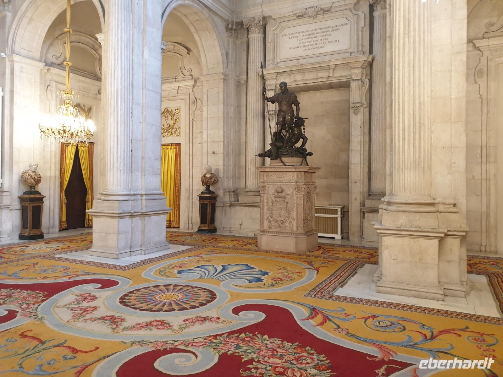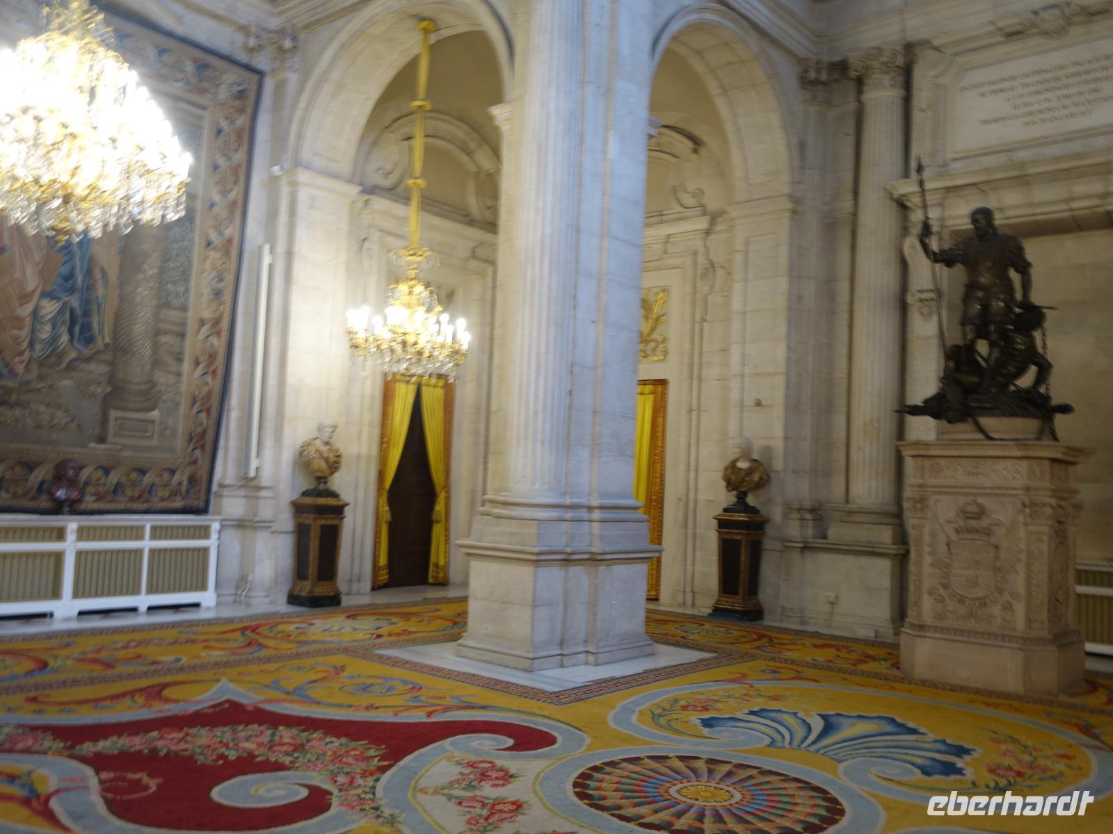 Während des Tages, wenn die Sonne scheint, ist es herrlich in Madrid, aber nachts sinken die Temperaturen. Man darf nicht vergessen, dass sich Madrid in einer Höhe von 665 Metern befindet. Wie gesagt, wenn die Sonne scheint, ist es sehr angenehm, aber am Abend und in der Nacht kann es richtig frisch sein. Heute Morgen entdeckten wir im Hotel den Frühstücksraum und sammelten dort Kraft für den Tag. Um 9 Uhr starteten wir eine Stadtrundfahrt durch Madrid zu den bedeutenstens Sehenwürdigkeiten. Erstmal fuhren wir zu der schönsten und wichtigsten Stierkampf Arena der Welt, im Mudejar-Stil gebaut, die sogennnate Las Ventas. Die Fahrt führte uns über den Retiro Park, die Puerta de Alcala, und das Prado Museum, welches einige heute Nachmittag nochmals individuell besuchen wollten. Wir müssen weiter, da wir einen Termin mit dem König Felipe und Letizia um 11.30 Uhr haben. Die Fahrt führt über Plaza de Cibeles und die schöne 100 Jahre alte Gran Via. Wir verlassen den Bus und fangen einen Stadtrundgang mit Petra durch Madrid an. Auf diese Weise lernten wir die bedeutendsten Sehenswürdigkeiten wie den Königspalast und die Kathedrale La Almudena kennen. Um 11.30 Uhr besuchten wir den imposanten Königspalast, wo wir die verschiedenen Räume und den Thronsaal bestaunen konnten. Gemeinsam mit unserer Reiseleiterin Petra erkundeten wir nun die wunderschöne Altstadt. Wir schlenderten über den weltbekannten Platz, den Plaza de Mayor, wo der San Miguel Markt ist. Unseren Stadtrundgang beendeten wir hier, aber man konnte weiter zum Puerta del Sol oder dem Platz Santa Ana gehen, wo man auf den verschiedenen Terrassen die Sonne geniessen kann.