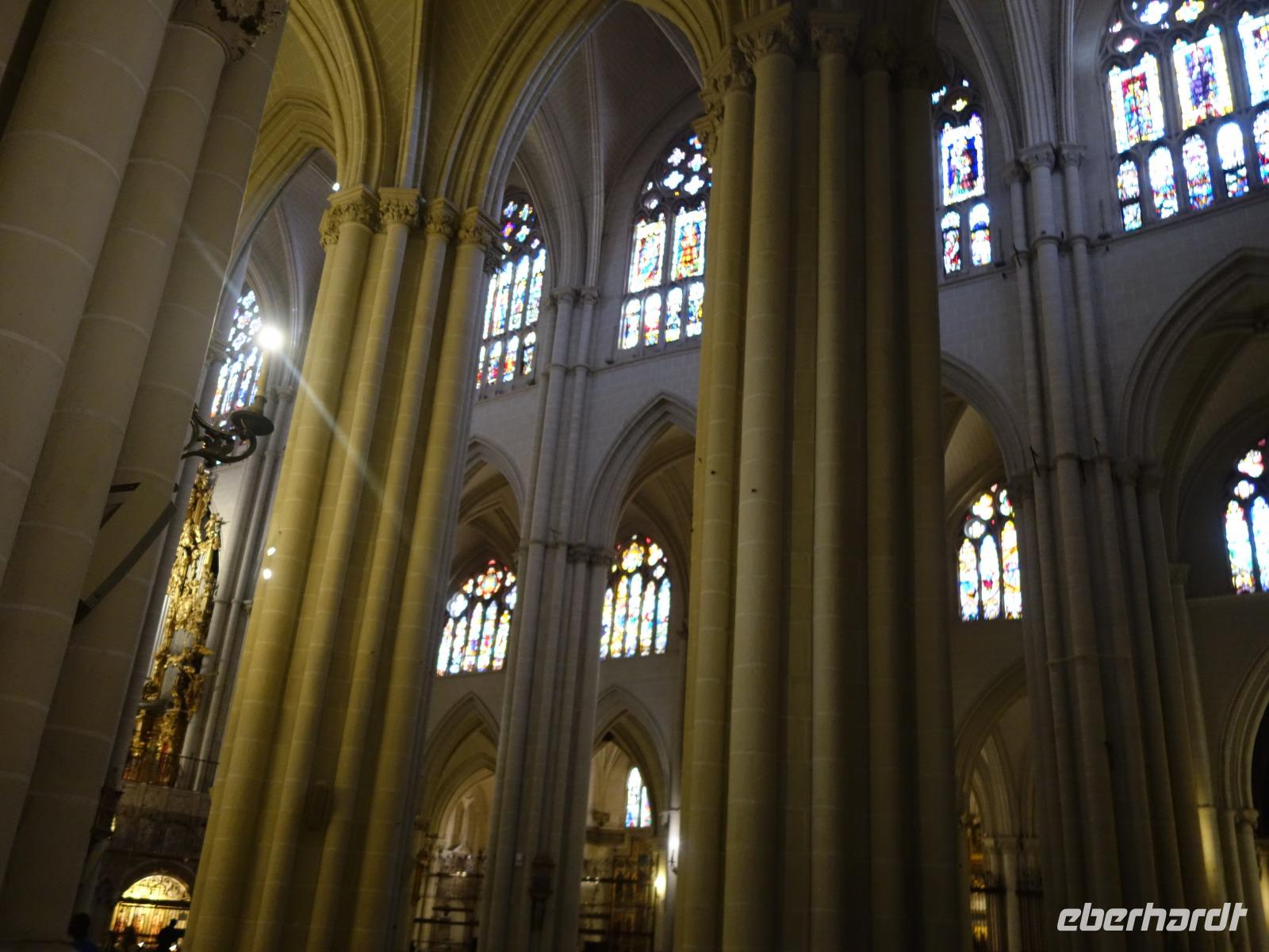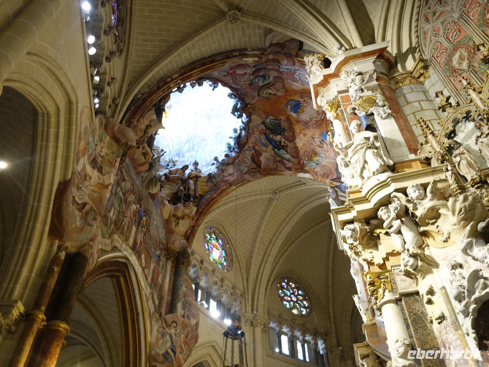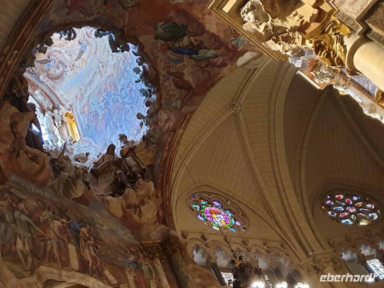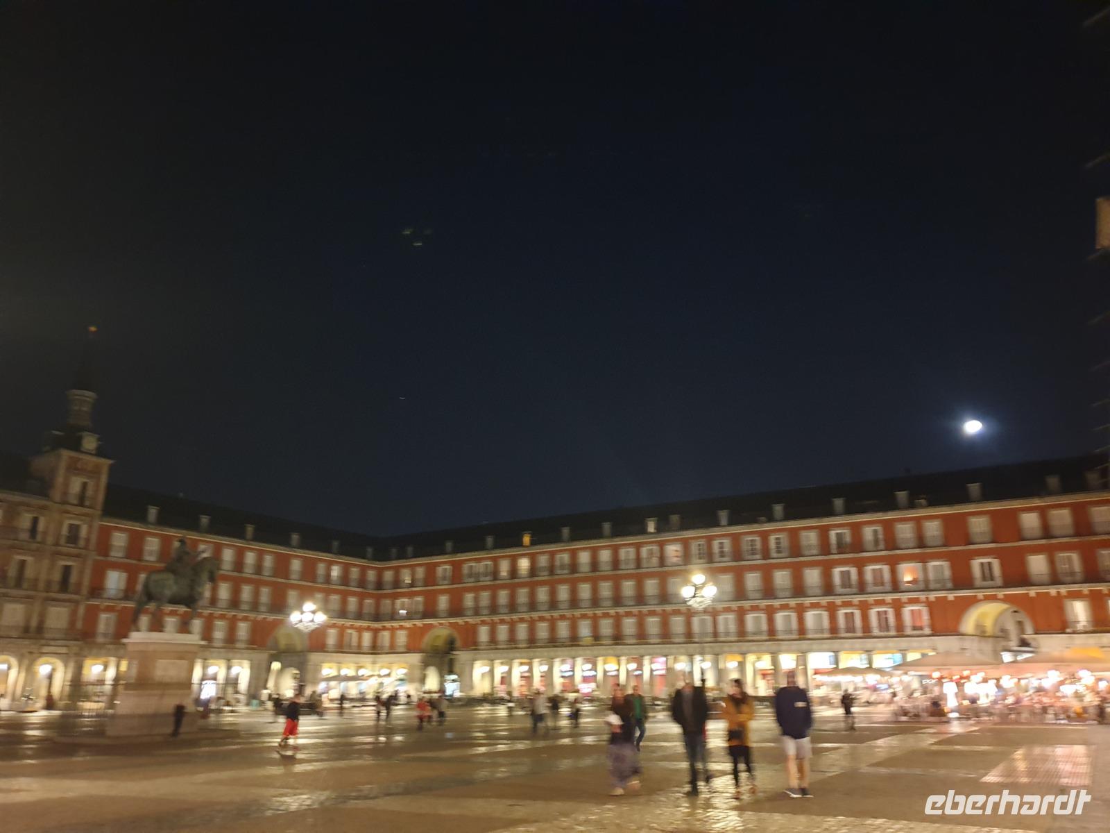 Wir spazierten gemeinsam durch die Straßen von Toledo. Ganz am Ende besuchten wir die imposante Kathedrale. Dieser Dom hat 2 Türme, aber einer war nicht zu Ende gebaut worden, da dann das Geld gefehlt hatte. Von innen erinnerte uns dieser Dom an den von Sevilla oder Malaga. Erstmals machten wir eine kleine Mittagspause an der Sonne. Weiter ging zu der jüdischen Synagoge „Santa Maria La Blanca". Toledo ist ein einzigartiges und gutes Beispiel, wie damals Christen, Juden und Muslime in Friede zusammenleben konnten. Unseren letzten Besuch machten wir bei der San Juan de Los Reyes Kirche. Nach dem Stadtbummel fuhren wir zurück zu unserem Hotel in Madrid, wo viele von uns in einer typischen Tapas-Bar den Tag in spanischem Ambiente ausklingen ließen. Wir hatten wieder Tapas heute. Wir wurden satt davon... und wie. Aber wir hatten noch Platz für Nachtisch. Einige von uns wollten noch richtig Madrid in die Nacht erleben und besuchten die Terrasse oben von Melia ME Hotel am Santa Ana Platz. Von hier oben hat man einen schönen Blick über die Stadt. Heute mit Vollmond. Zurück im Hotel mit sehr gute Stimmung und Laune wünschten wir uns alle eine gute Nacht.