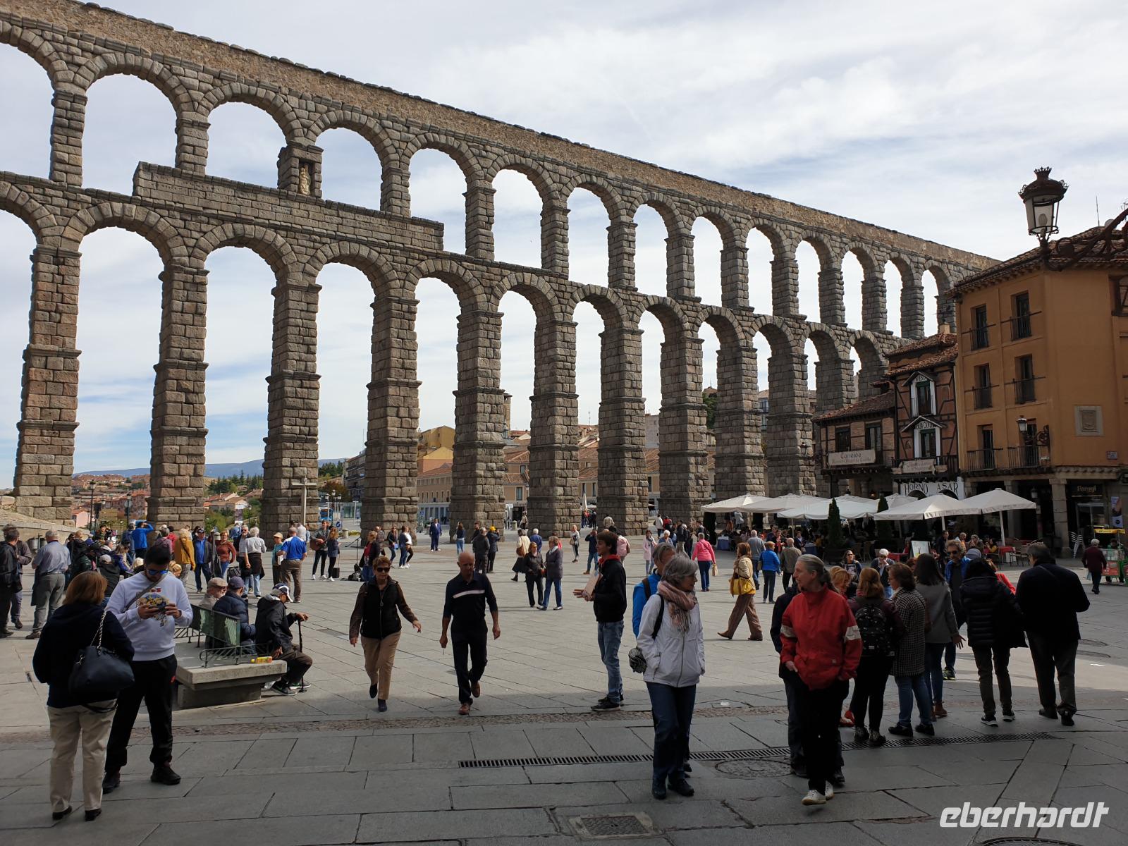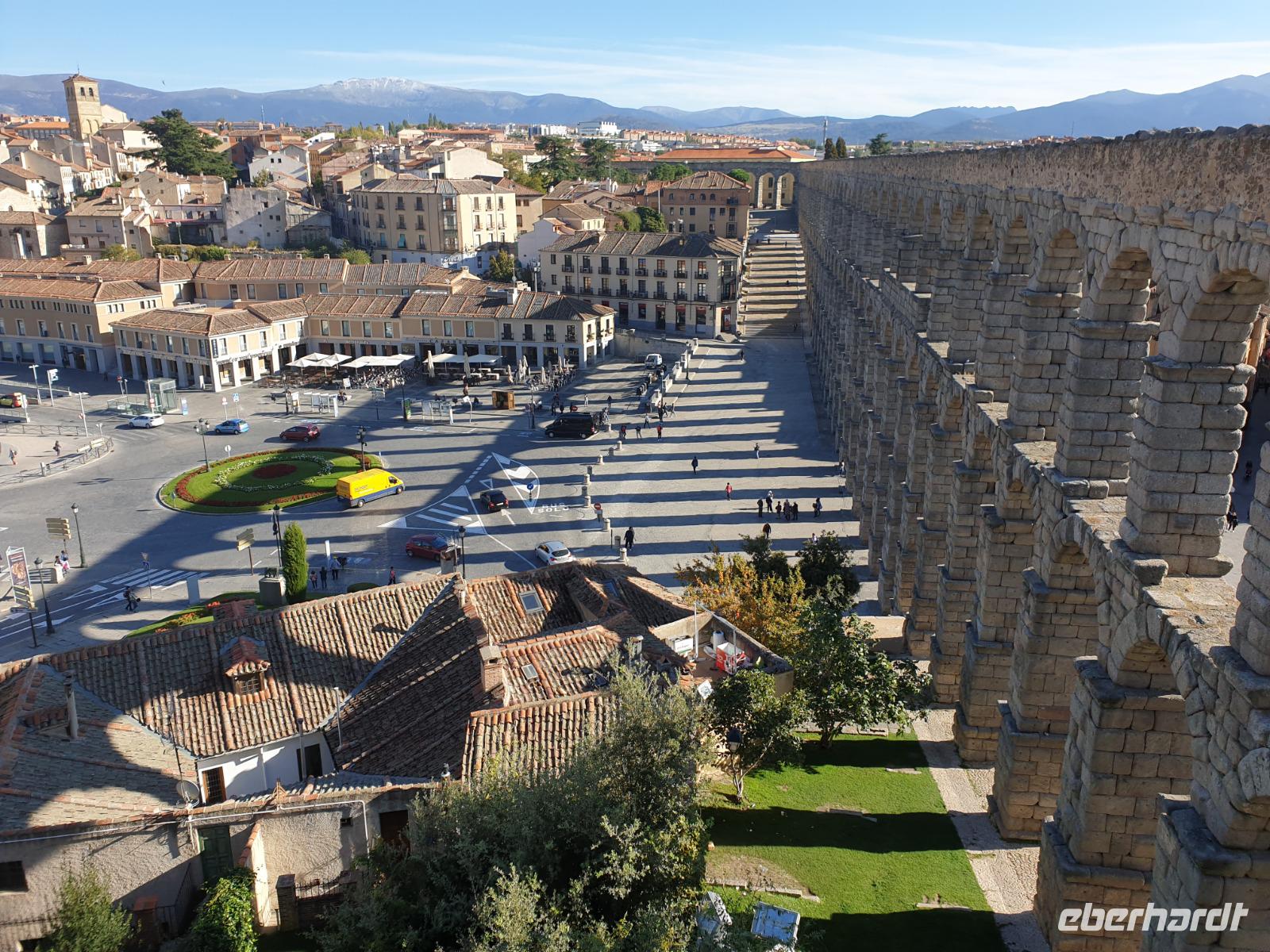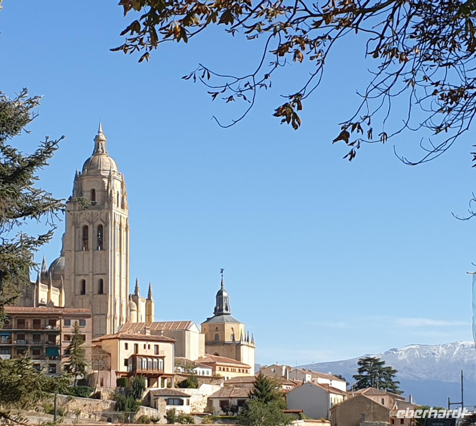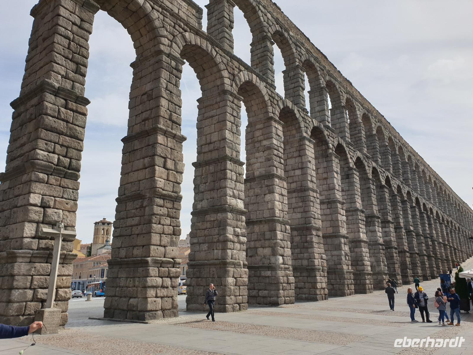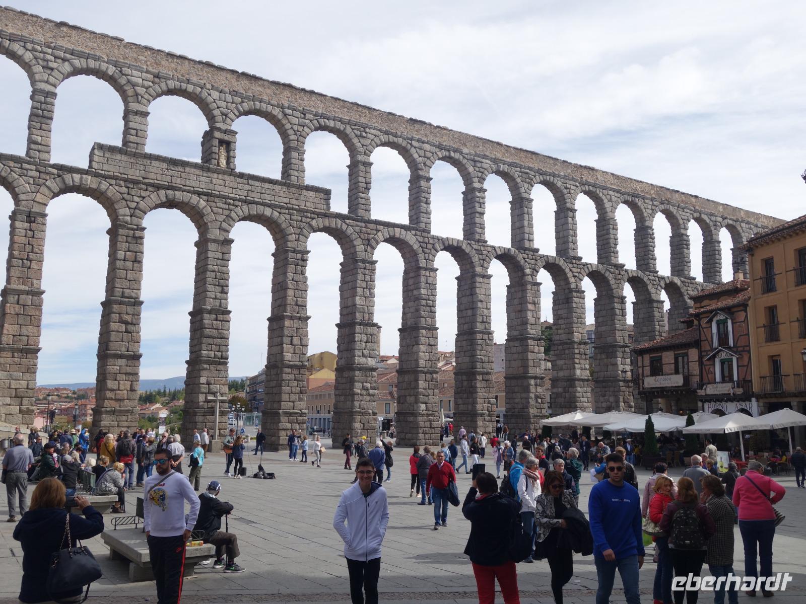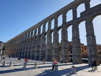 Mittags fahren Sie weiter in die Stadt Segovia, die insbesondere für ihre zahlreichen Kirchen aus romanischer Zeit Berühmtheit genießt. Wir spazieren durch Segovia mit den Bergen im Hintergrund. Wir besuchen die Alcazar oder Befestigung. Zu Beginn eines jeden Walt-Disney-Films ist am Anfang ein Schloss zu sehen. Walt Disney hat sich dafür von zwei Schlössern auf der Welt inspirieren lassen - dem bayrischen Schloss Neunschwanstein und dem Alcazar von Segovia, welche uns sehr gut gefallen hat mit ihren Türmen und verschieden Räumen und Dächern. Vorhin haben wir auch die Kathedrale gesehen, die nicht so groß ist wie die von Toledo, aber auch wunderschön. Die Sonne scheint und ist herrlich, aber in der Kathedrale und ihrem Kloster ist angenehmen kühl. Segovia gefällt uns sehr, aber als besonderer Höhepunkt gilt das über 28 Meter hohe antike römische Aquädukt. Majestätisch erhebt sich dieser eindrucksvolle Bau inmitten der Stadt und durchläuft diese auf 700 Meter Länge. Zum Mittagessen konnte man die berühmte Spezialität Cochinillo (Ferkel) essen. Andere von uns aßen ein Menü mit Vorspeise, Hauptspeise, Brot, Wein, Nachtisch und Kaffee... für nur 11 Euro! Und es hat gut geschmeckt. Am Nachmittag kehrten wir zurück nach Madrid und genossen auf der Rückfahrt den Blick auf die frische schneebedeckten Berge. Zurück nach Madrid fuhren wir über die Berge und checkten in unserem, am Rand des Zentrums von Madrid gelegenen, 4-Sterne-Hotel Ganivet in Puerta de Toledo ein, wo wir die nächsten 4 Nächte schlafen werden.