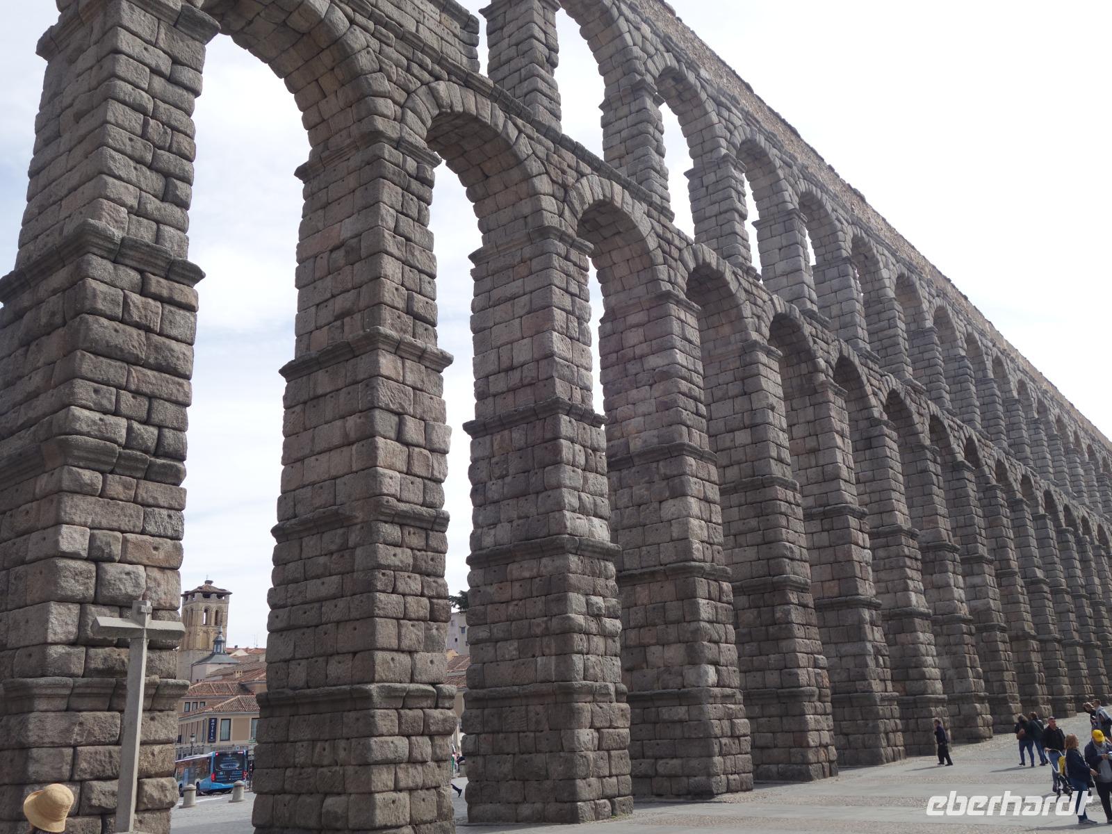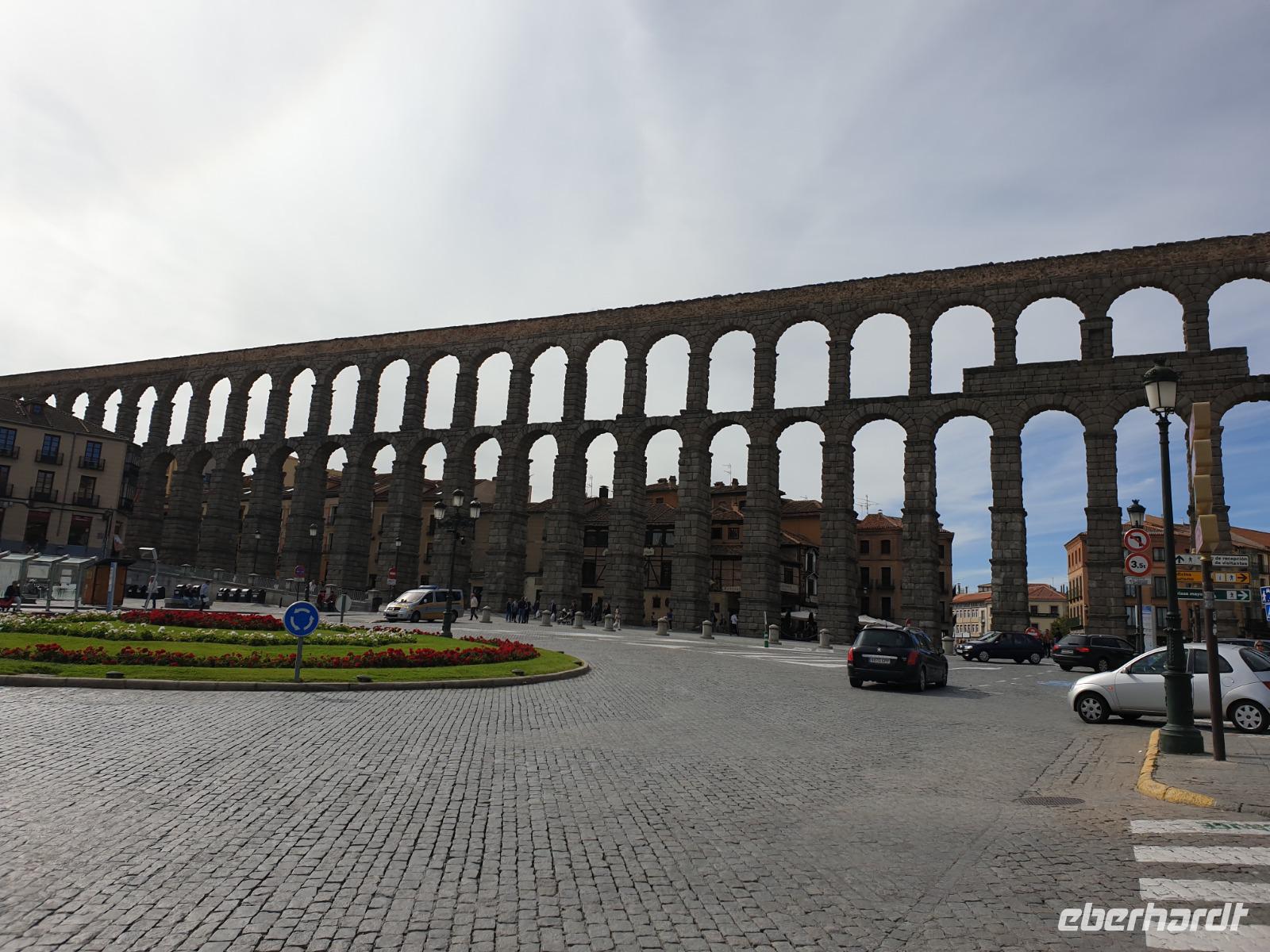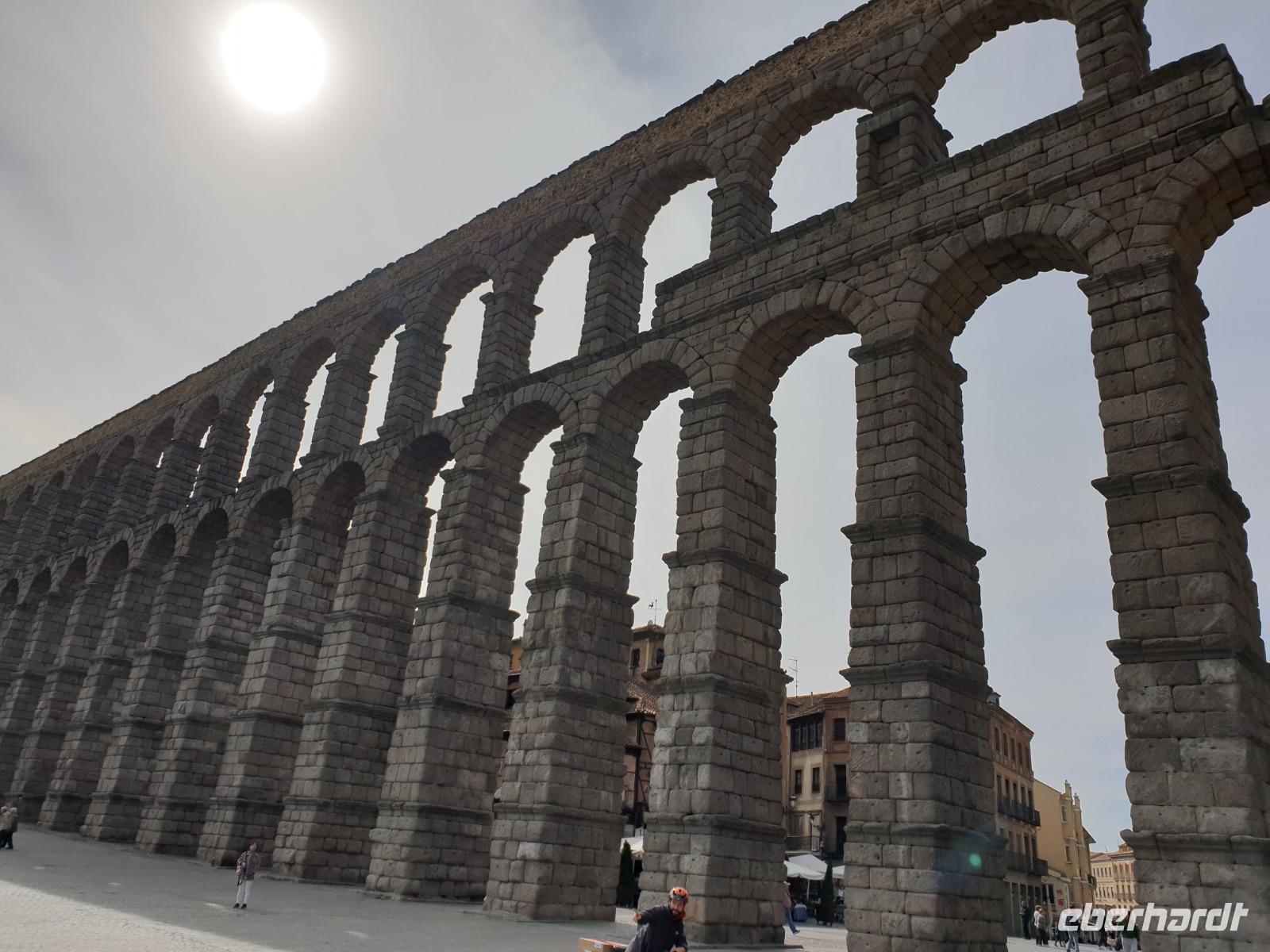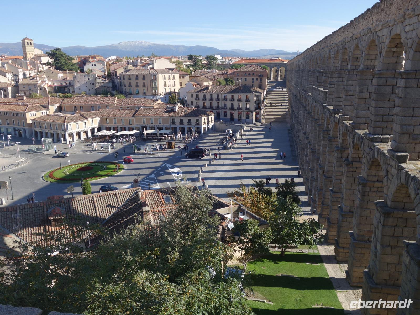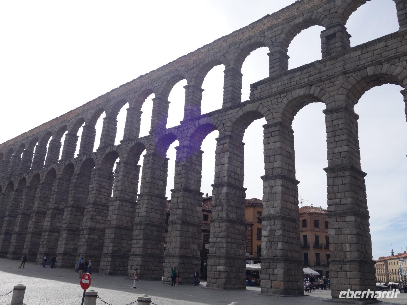 Mittags fahren Sie weiter in die Stadt Segovia, die insbesondere für ihre zahlreichen Kirchen aus romanischer Zeit Berühmtheit genießt. Wir spazieren durch Segovia mit den Bergen im Hintergrund. Wir besuchen die Alcazar oder Befestigung. Zu Beginn eines jeden Walt-Disney-Films ist am Anfang ein Schloss zu sehen. Walt Disney hat sich dafür von zwei Schlössern auf der Welt inspirieren lassen - dem bayrischen Schloss Neunschwanstein und dem Alcazar von Segovia, welche uns sehr gut gefallen hat mit ihren Türmen und verschieden Räumen und Dächern. Vorhin haben wir auch die Kathedrale gesehen, die nicht so groß ist wie die von Toledo, aber auch wunderschön. Die Sonne scheint und ist herrlich, aber in der Kathedrale und ihrem Kloster ist angenehmen kühl. Segovia gefällt uns sehr, aber als besonderer Höhepunkt gilt das über 28 Meter hohe antike römische Aquädukt. Majestätisch erhebt sich dieser eindrucksvolle Bau inmitten der Stadt und durchläuft diese auf 700 Meter Länge. Zum Mittagessen konnte man die berühmte Spezialität Cochinillo (Ferkel) essen. Andere von uns aßen ein Menü mit Vorspeise, Hauptspeise, Brot, Wein, Nachtisch und Kaffee... für nur 11 Euro! Und es hat gut geschmeckt. Am Nachmittag kehrten wir zurück nach Madrid und genossen auf der Rückfahrt den Blick auf die frische schneebedeckten Berge. Zurück nach Madrid fuhren wir über die Berge und checkten in unserem, am Rand des Zentrums von Madrid gelegenen, 4-Sterne-Hotel Ganivet in Puerta de Toledo ein, wo wir die nächsten 4 Nächte schlafen werden.